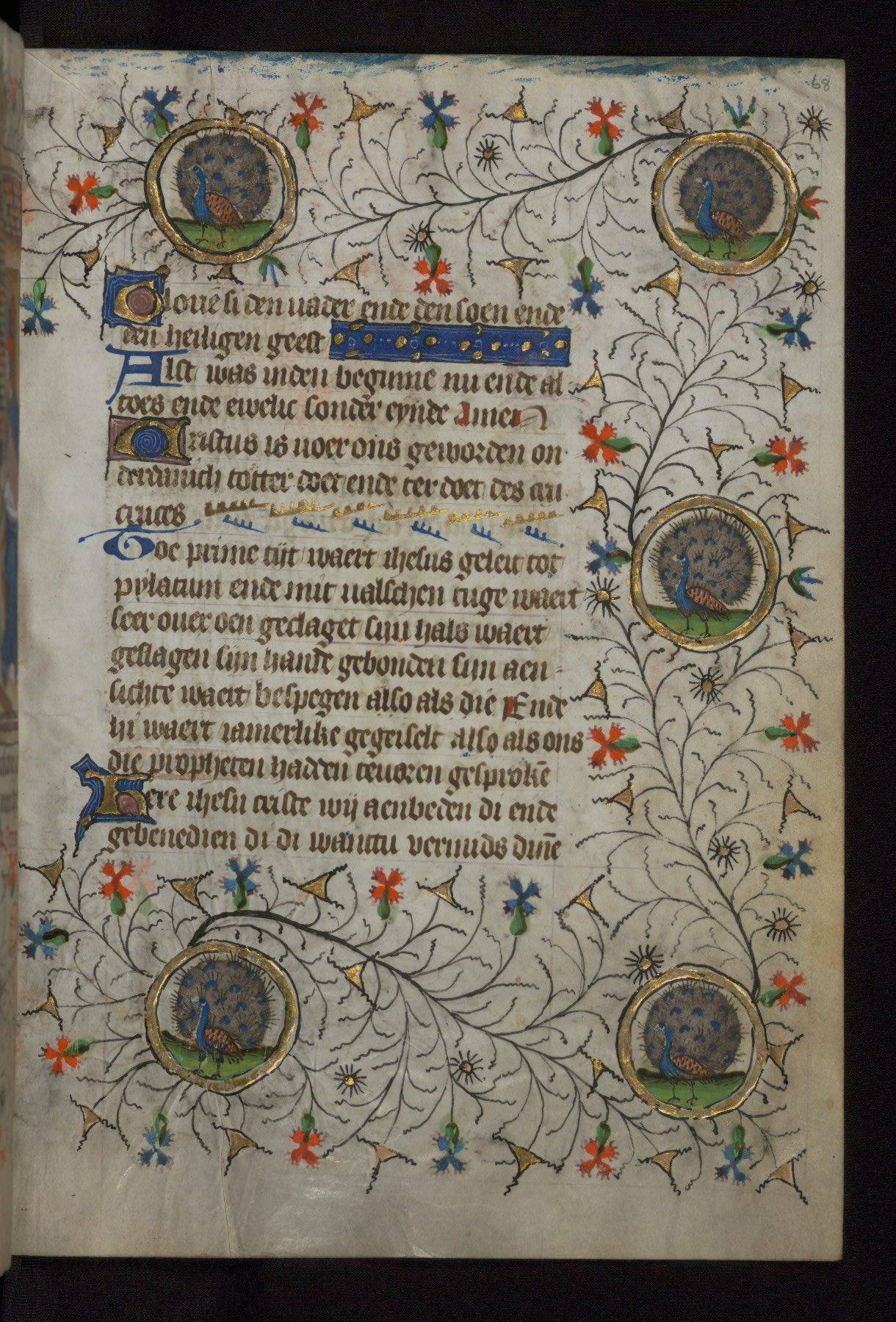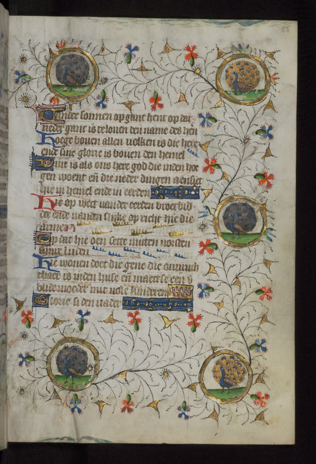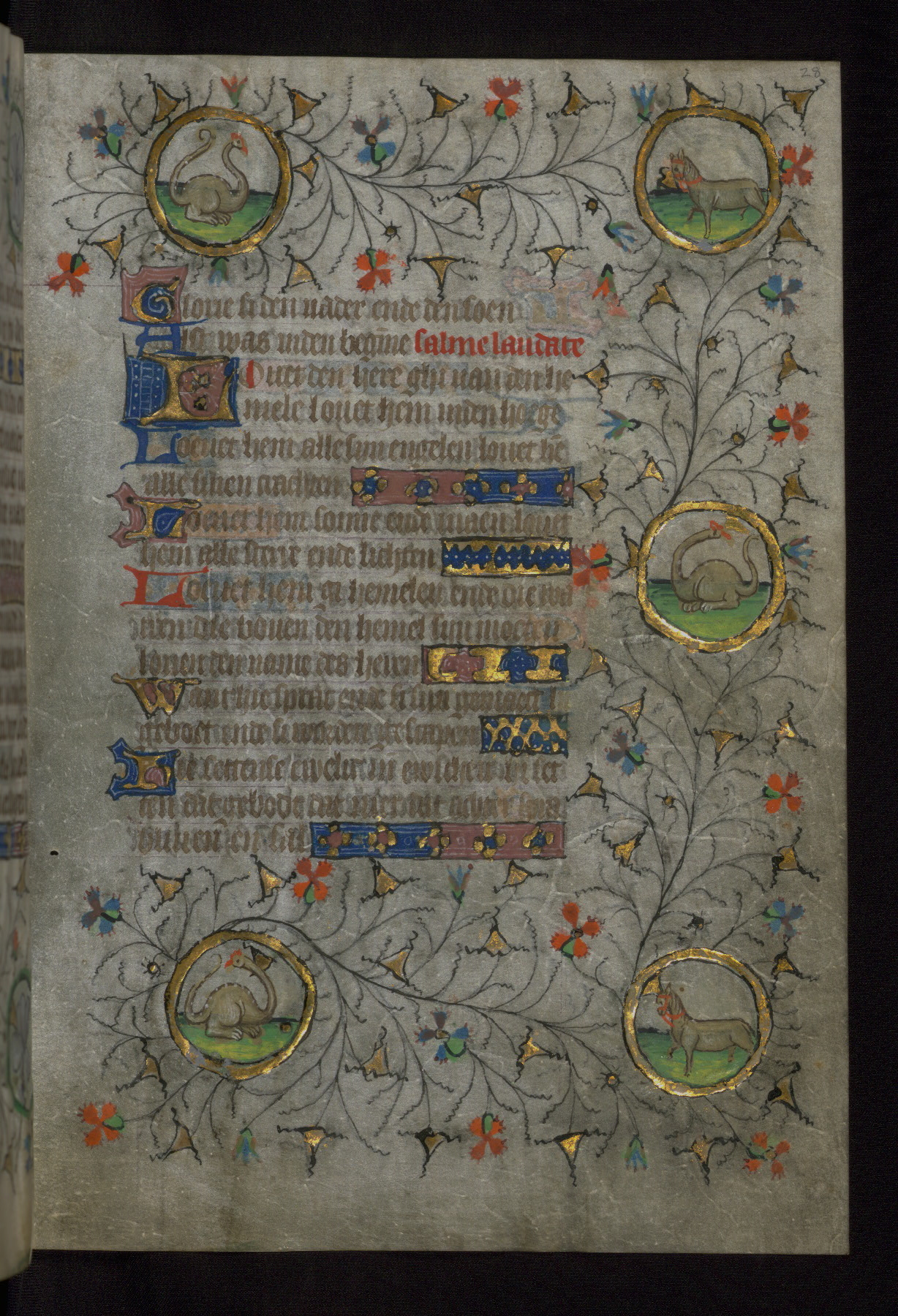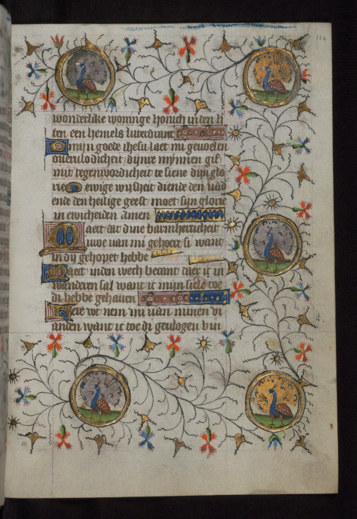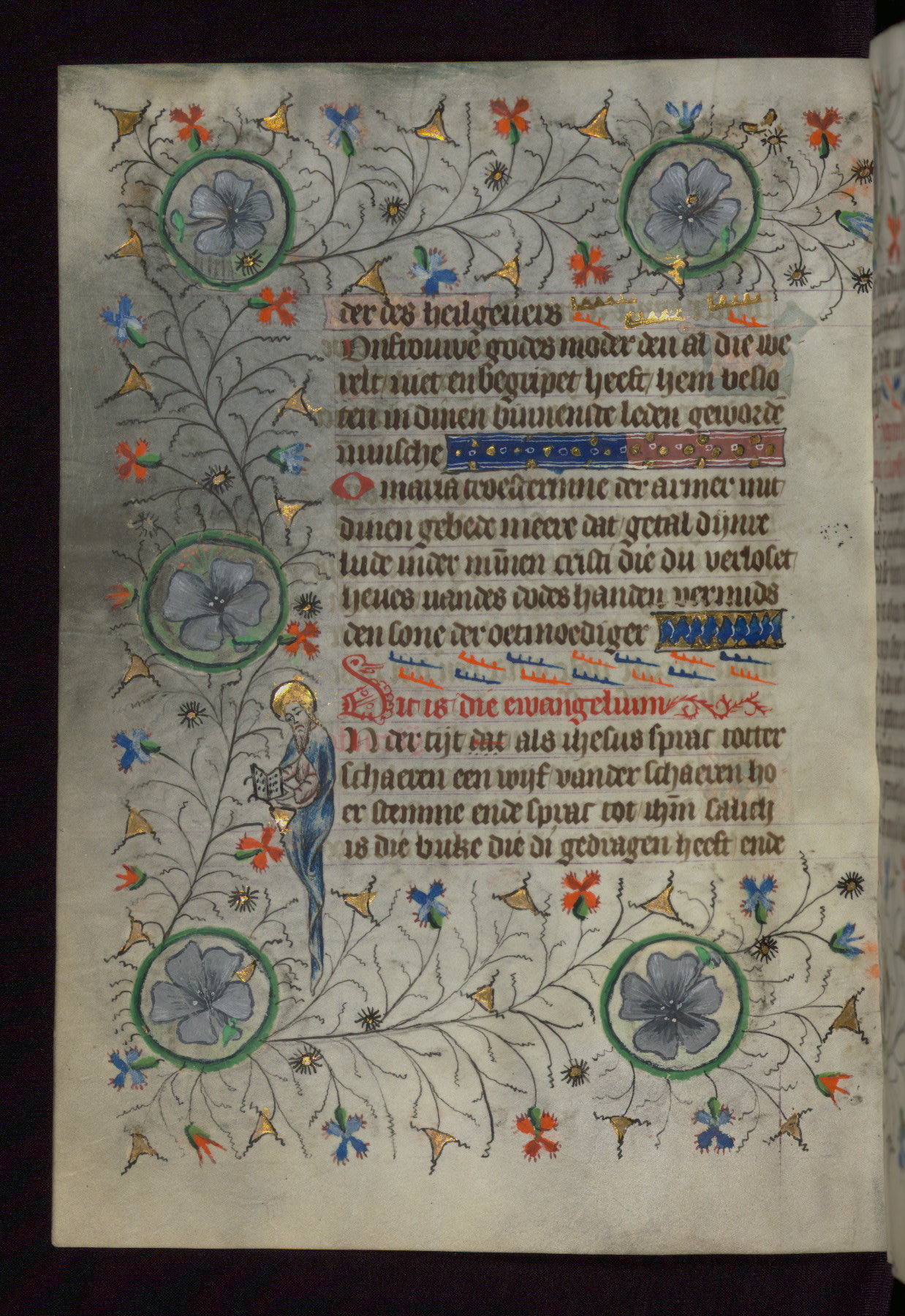 This book of hours was written in Dutch in the fifteenth century for the use of Utrecht. The Hours of the Virgin and of the Cross are accompanied here by the Dutch translation of Henry Suso's "Cursus aeternae sapientiae," a text that was particularly popular for private devotion in the Netherlands. Once owned by the English collector Lord Amherst, the manuscript is exceptional for its extensive illumination. Webs of foliage cover every margin, most sprouting medallions containing flora and fauna. The divisions in the text are marked by twenty richly painted full-page miniatures, often accompanied by related marginalia. Further illumination in the form of historiated and foliate initials marks minor breaks in the text, and the overall effect is a visual feast for the reader.