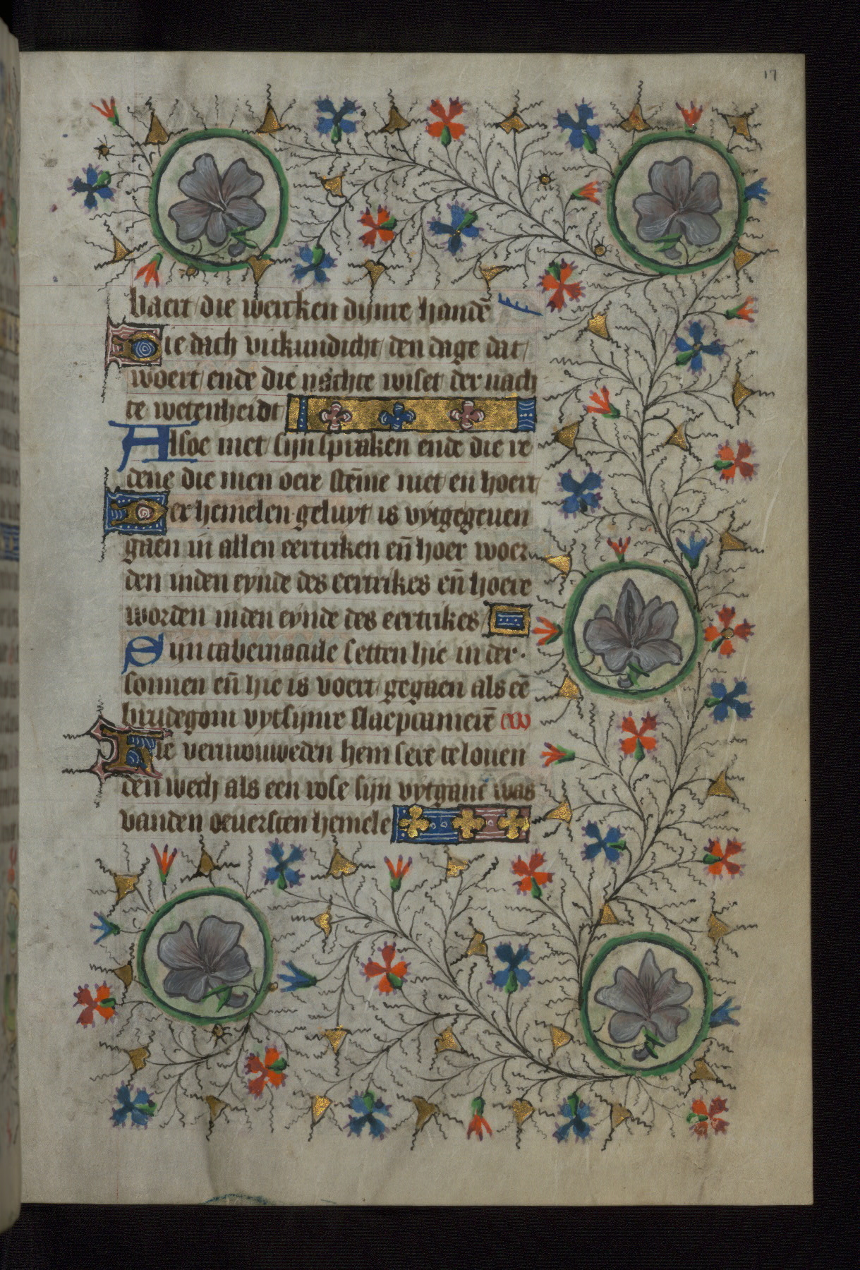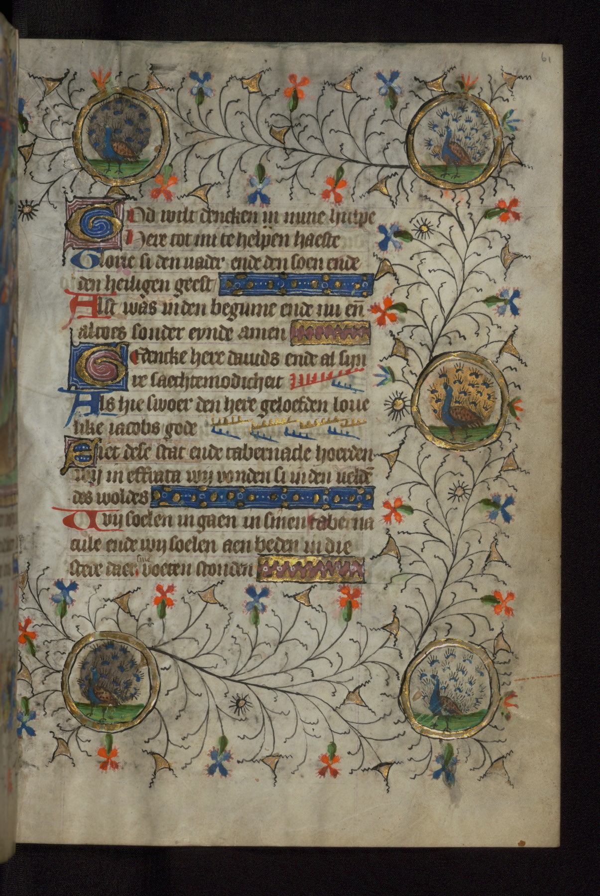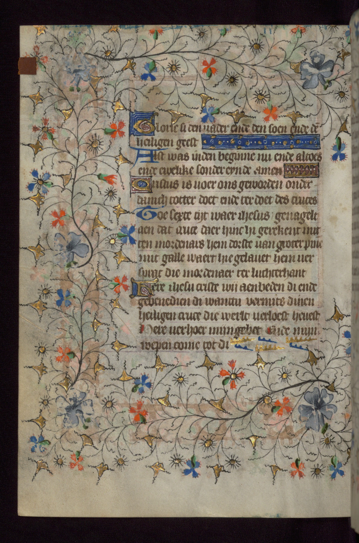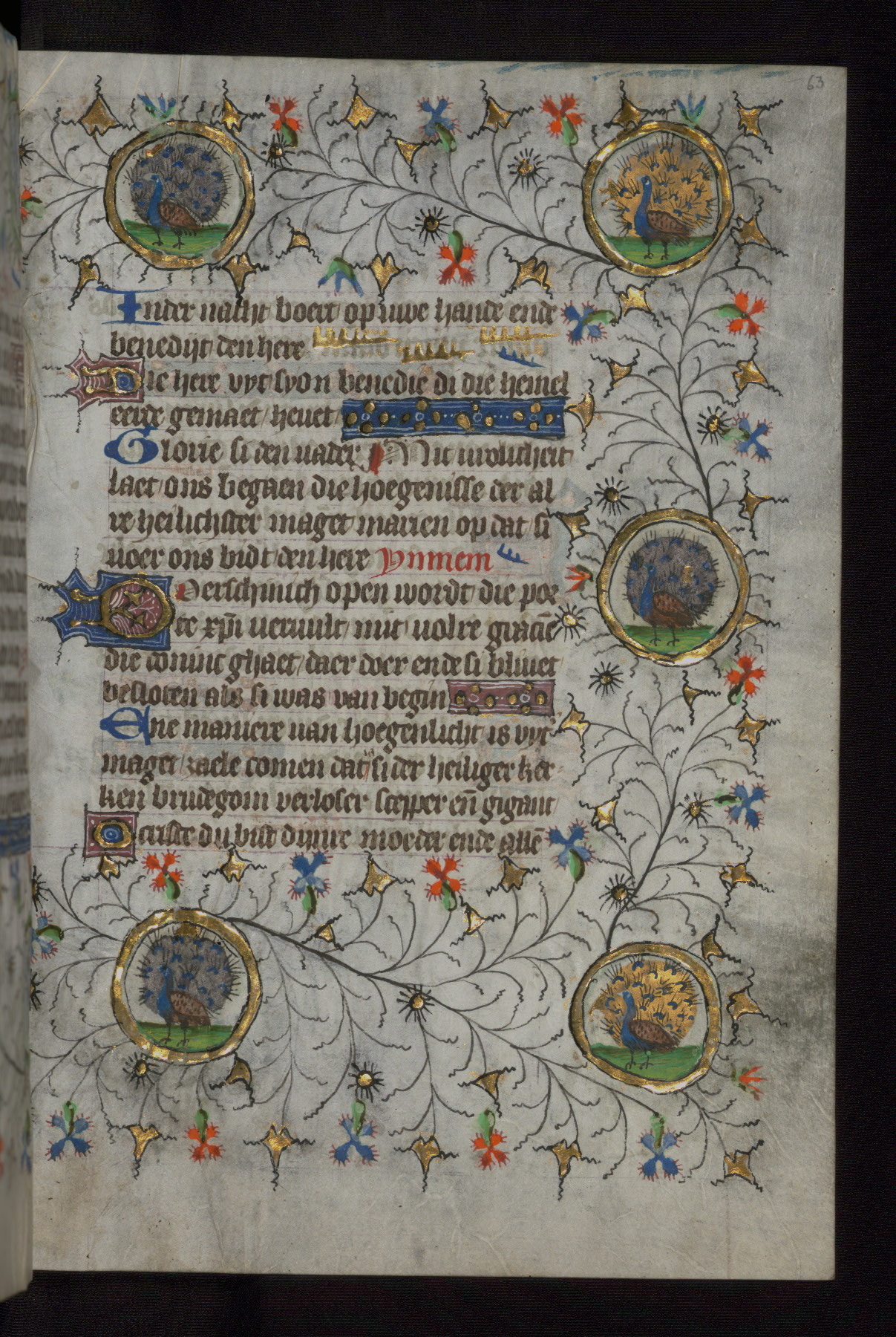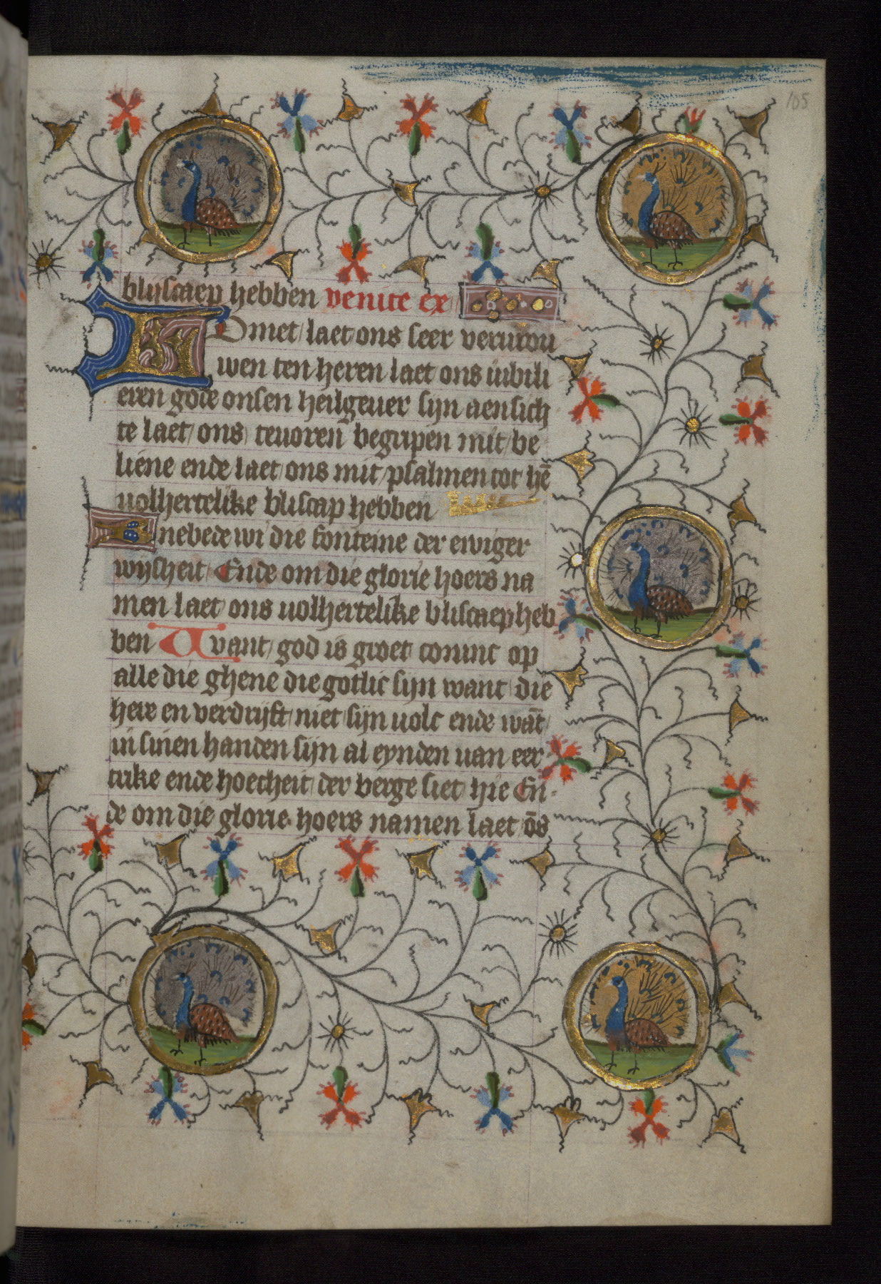 This book of hours was written in Dutch in the fifteenth century for the use of Utrecht. The Hours of the Virgin and of the Cross are accompanied here by the Dutch translation of Henry Suso's "Cursus aeternae sapientiae," a text that was particularly popular for private devotion in the Netherlands. Once owned by the English collector Lord Amherst, the manuscript is exceptional for its extensive illumination. Webs of foliage cover every margin, most sprouting medallions containing flora and fauna. The divisions in the text are marked by twenty richly painted full-page miniatures, often accompanied by related marginalia. Further illumination in the form of historiated and foliate initials marks minor breaks in the text, and the overall effect is a visual feast for the reader.