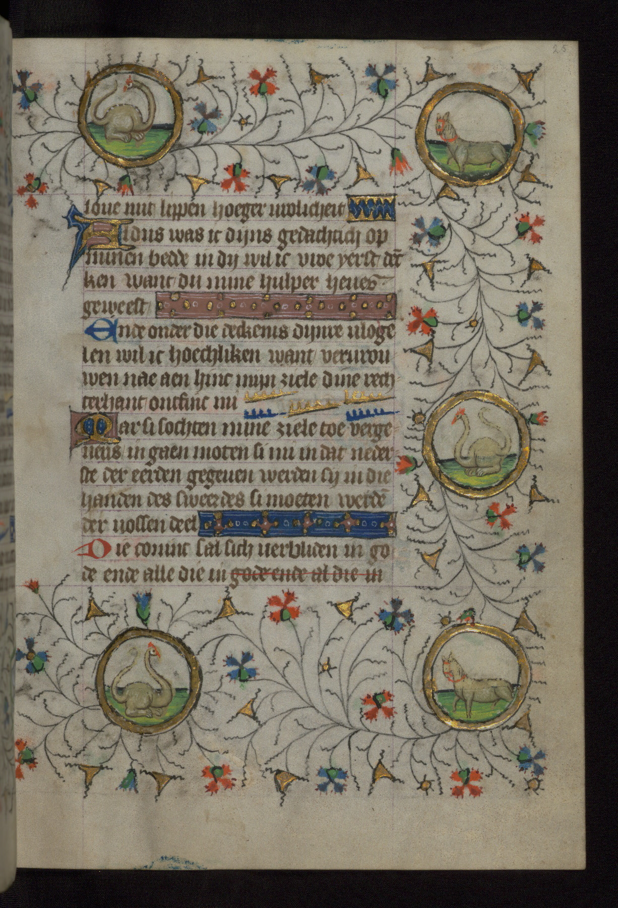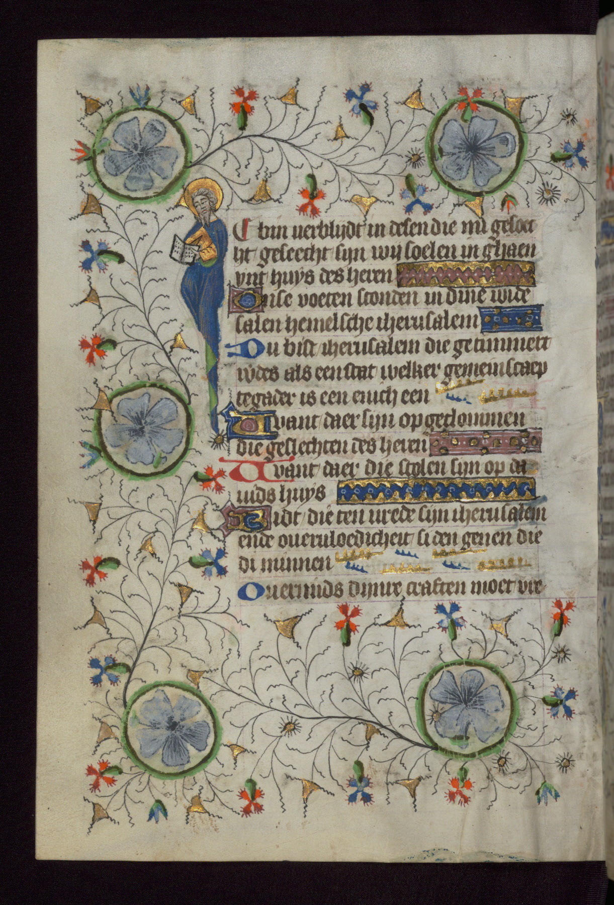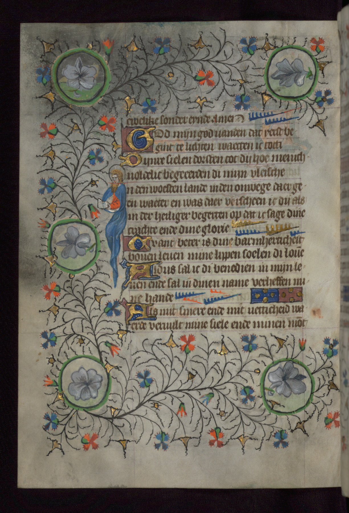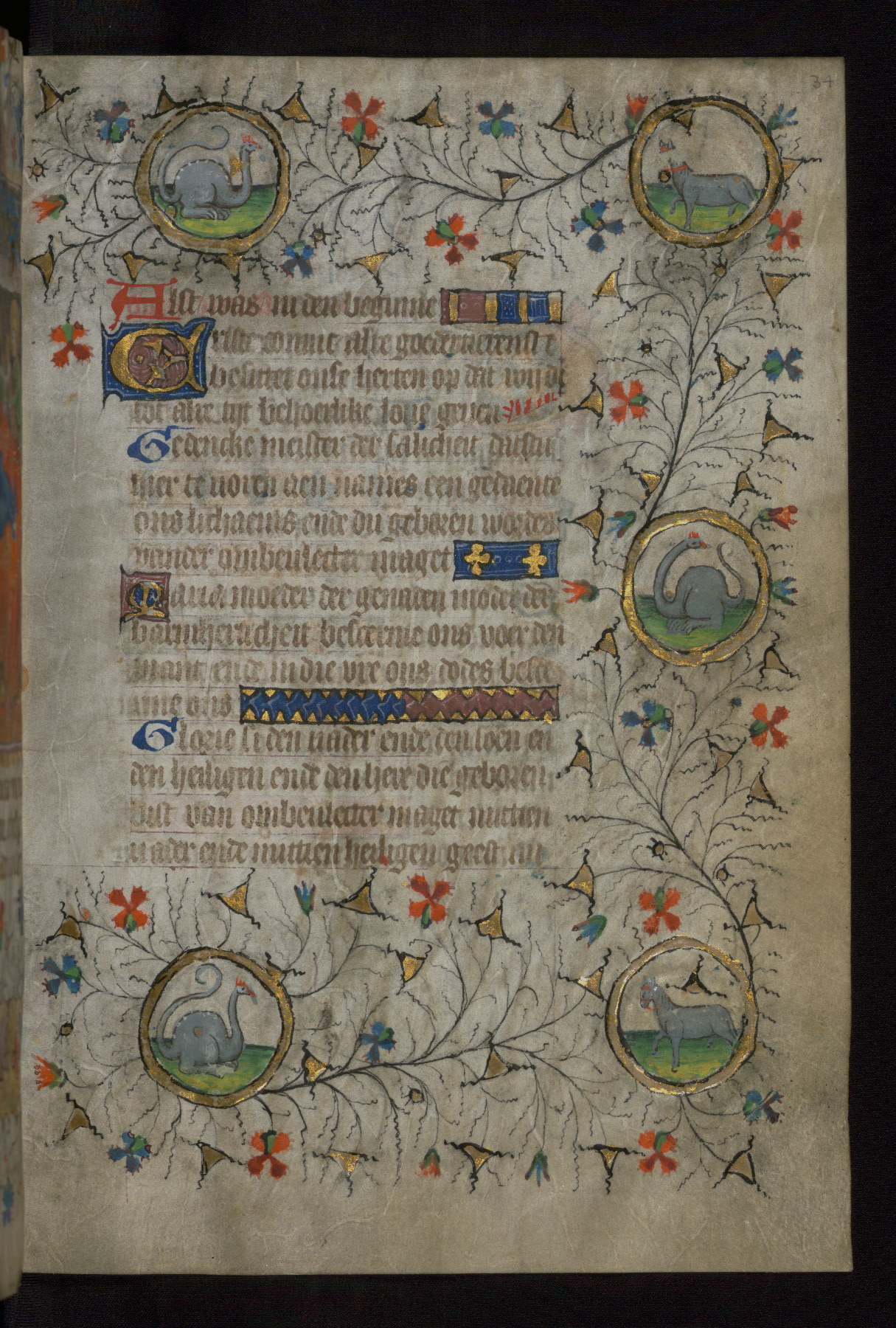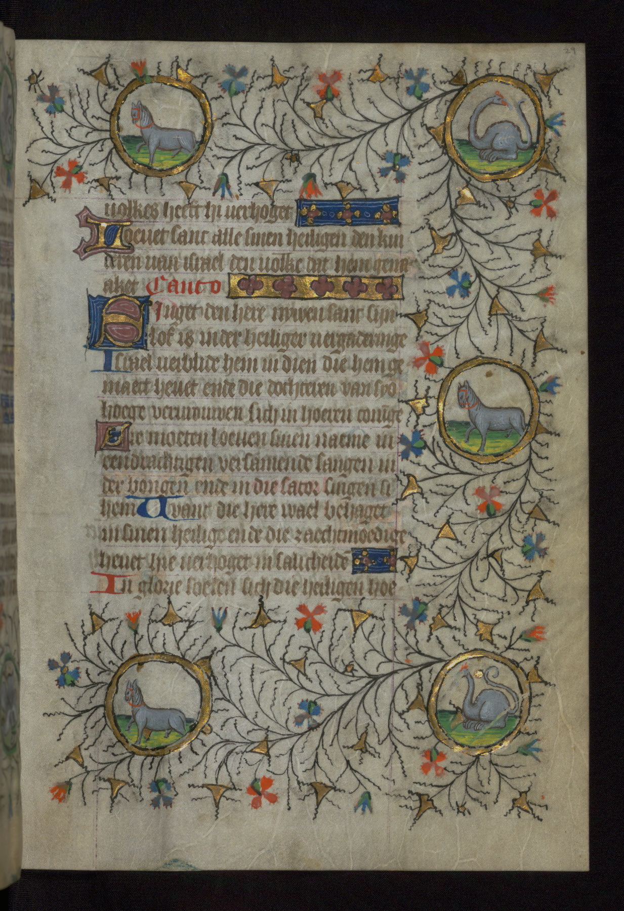 This book of hours was written in Dutch in the fifteenth century for the use of Utrecht. The Hours of the Virgin and of the Cross are accompanied here by the Dutch translation of Henry Suso's "Cursus aeternae sapientiae," a text that was particularly popular for private devotion in the Netherlands. Once owned by the English collector Lord Amherst, the manuscript is exceptional for its extensive illumination. Webs of foliage cover every margin, most sprouting medallions containing flora and fauna. The divisions in the text are marked by twenty richly painted full-page miniatures, often accompanied by related marginalia. Further illumination in the form of historiated and foliate initials marks minor breaks in the text, and the overall effect is a visual feast for the reader.