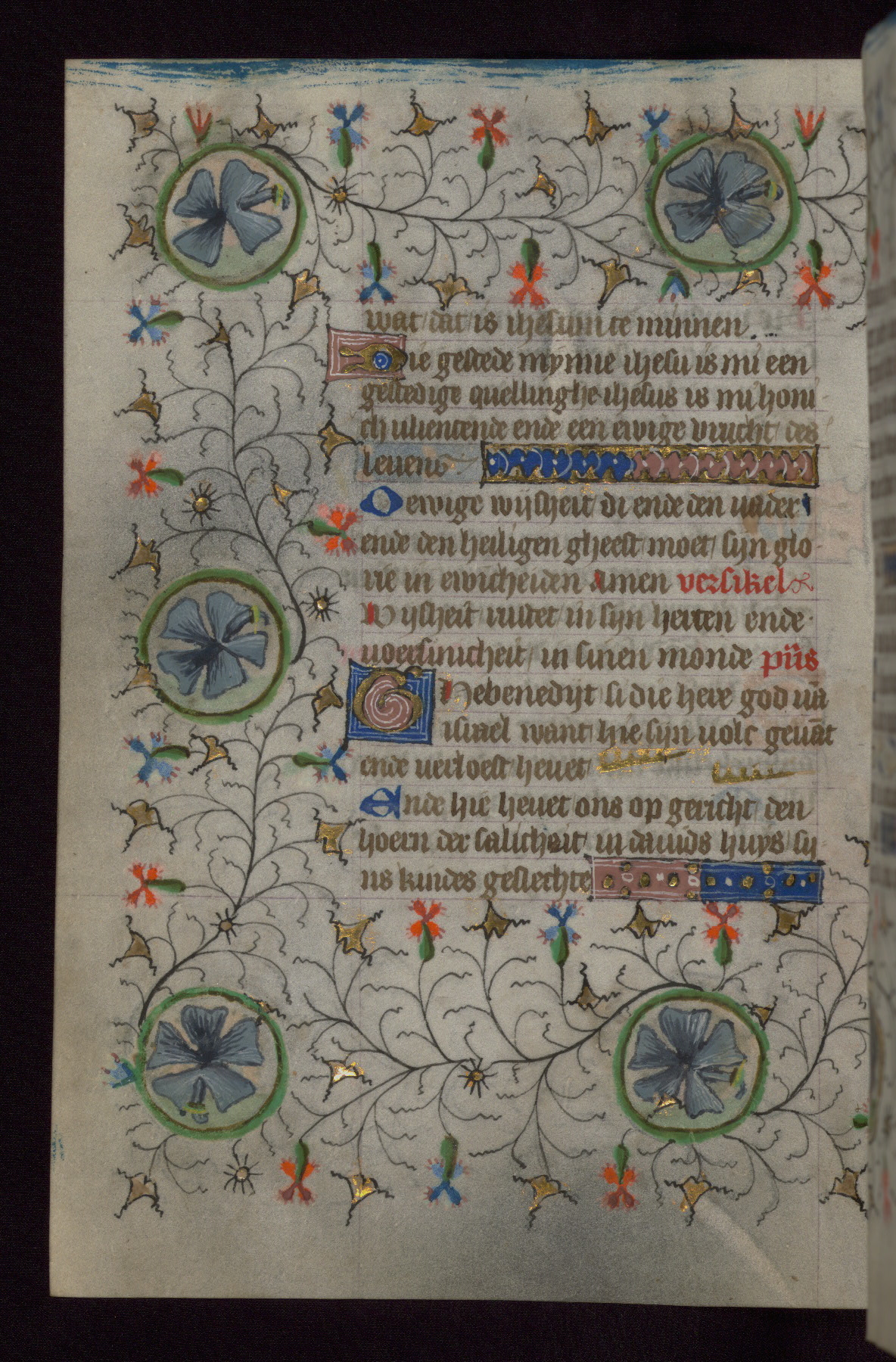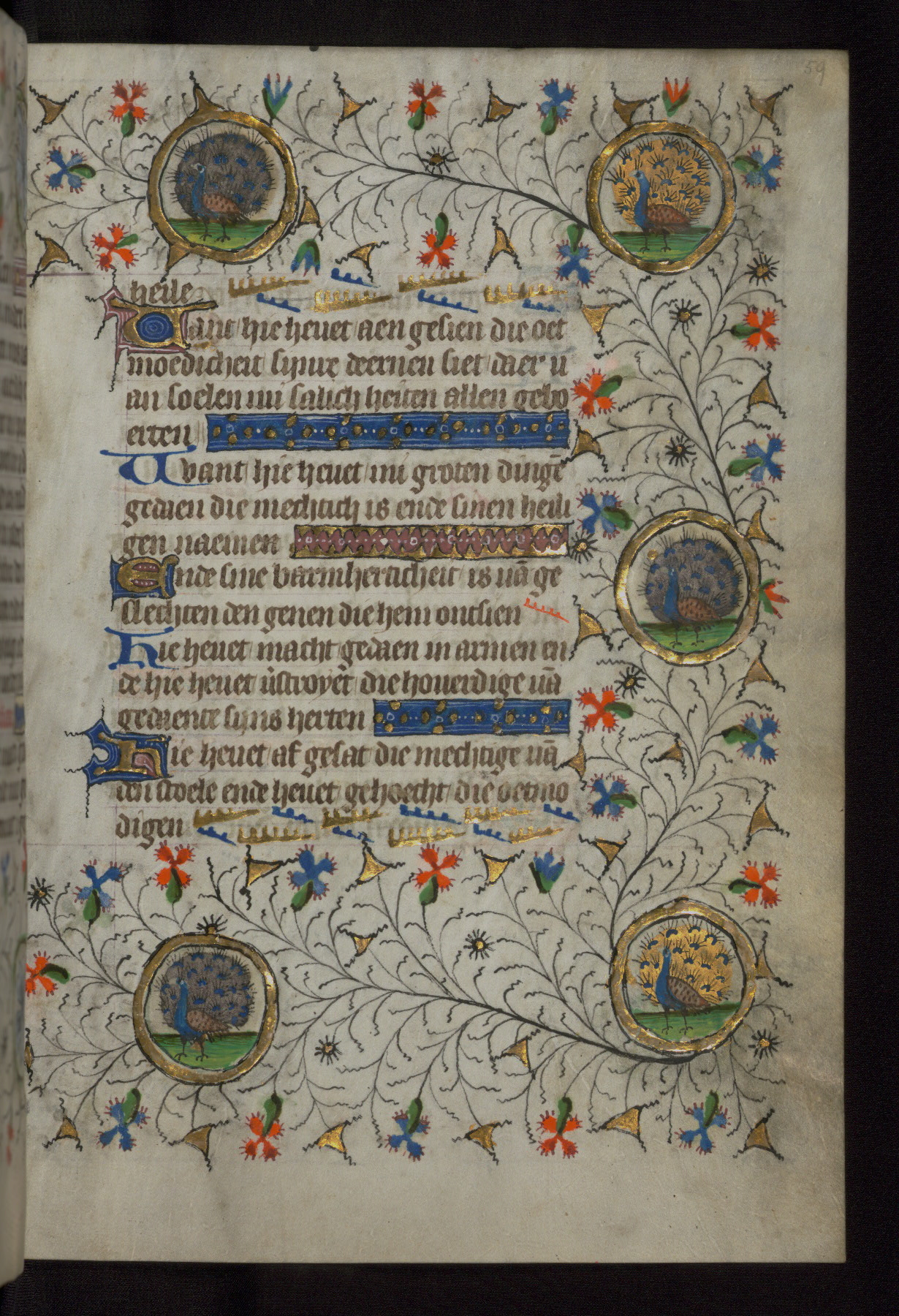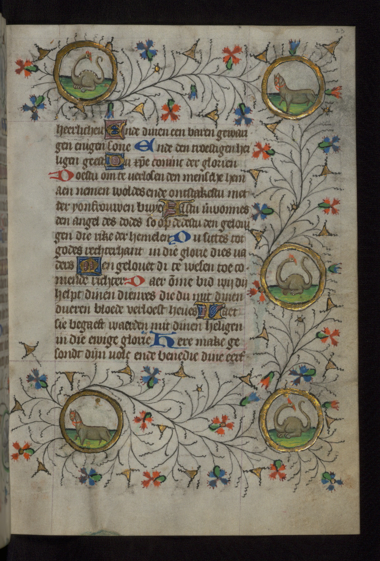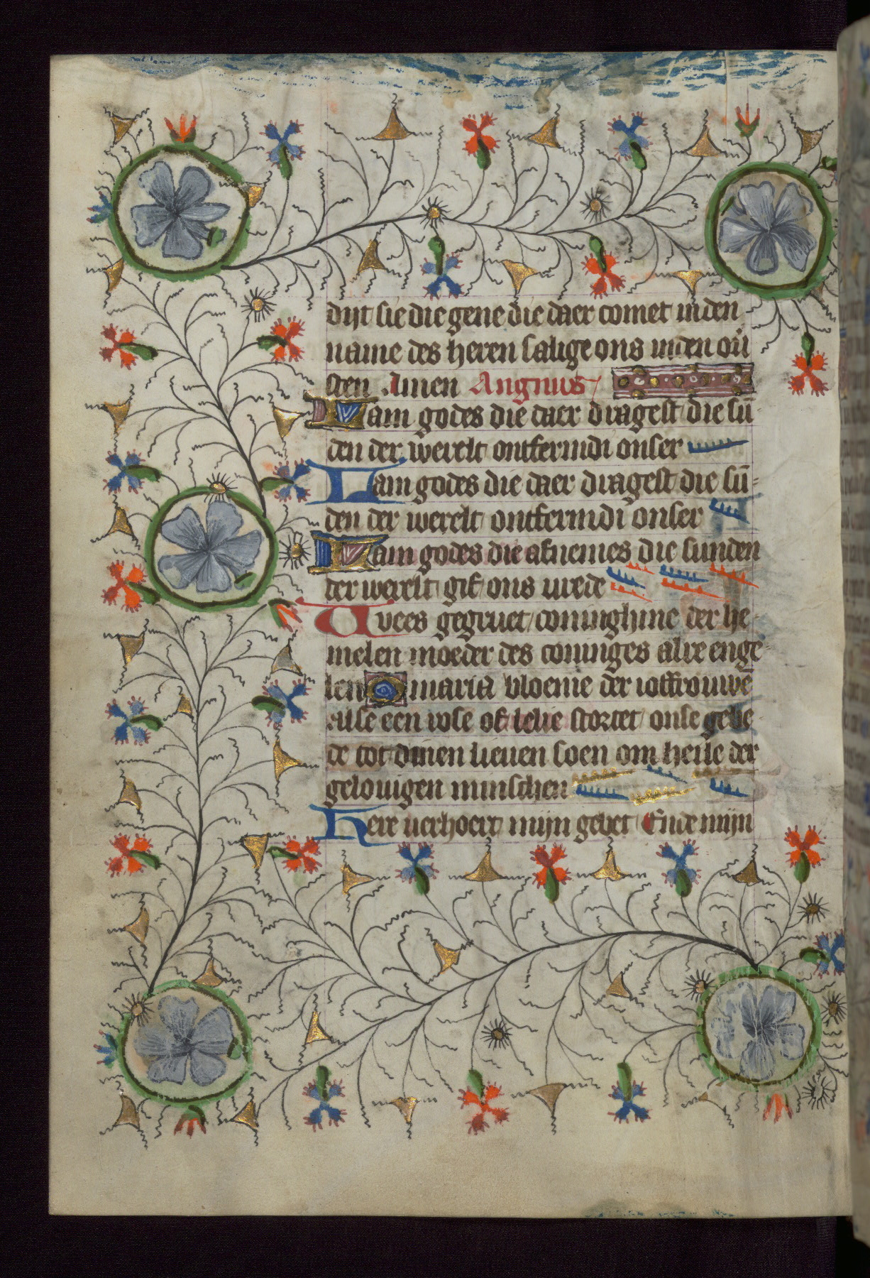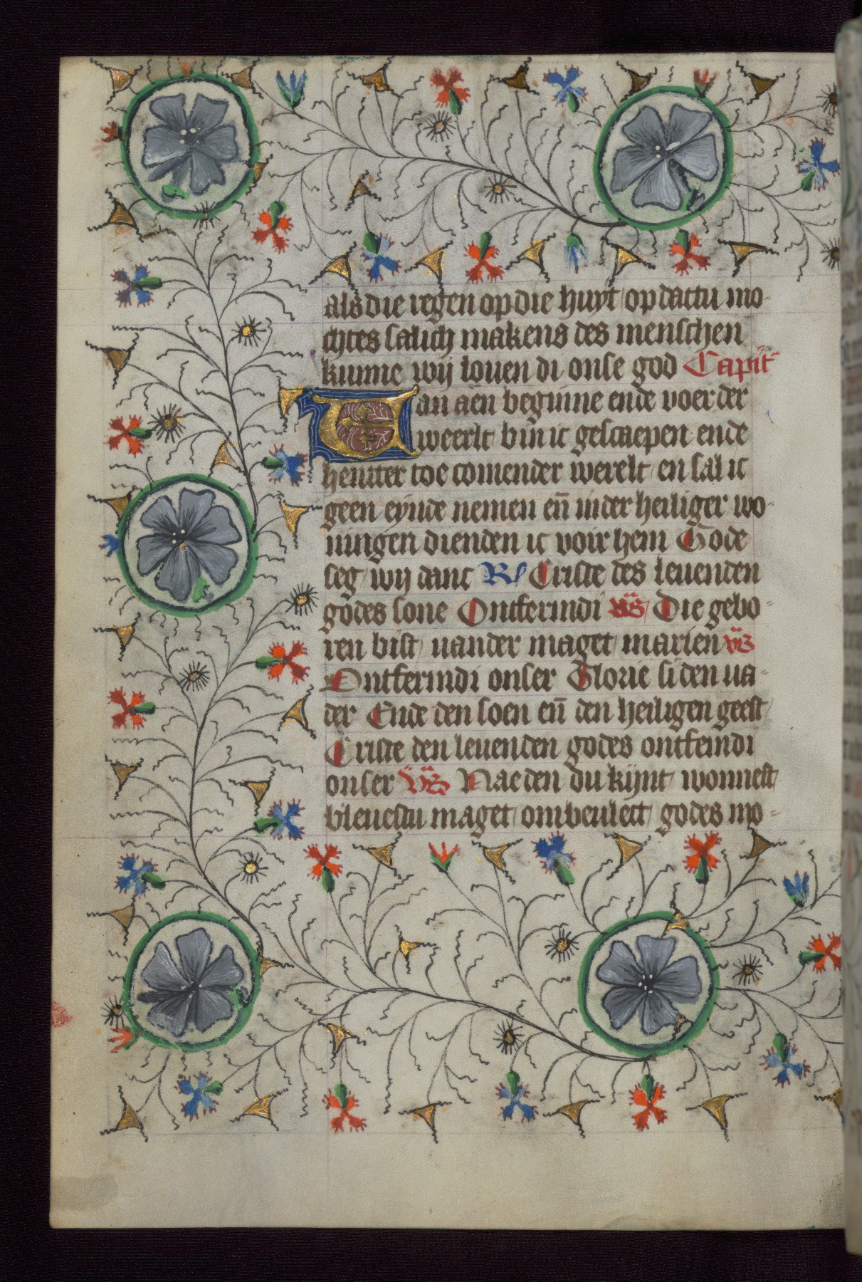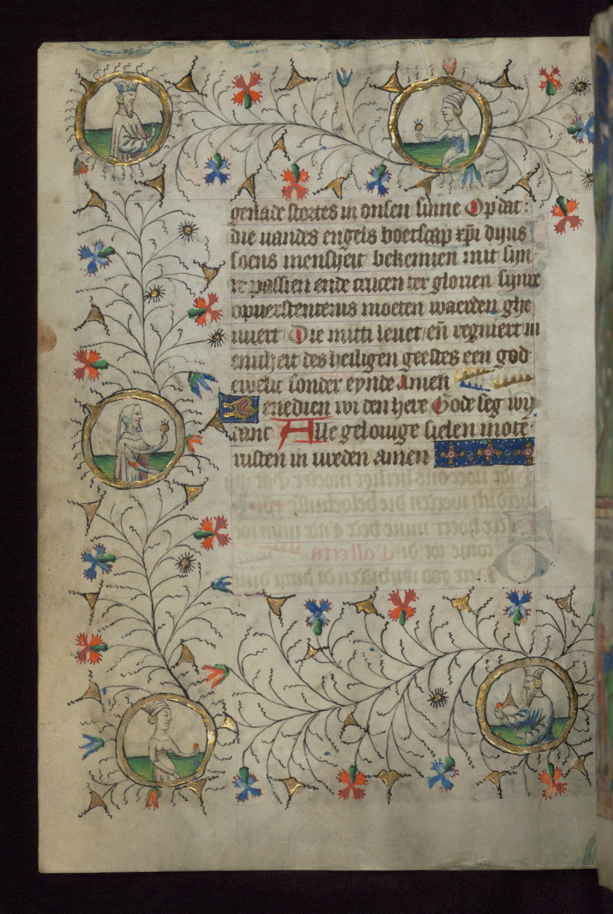 This book of hours was written in Dutch in the fifteenth century for the use of Utrecht. The Hours of the Virgin and of the Cross are accompanied here by the Dutch translation of Henry Suso's "Cursus aeternae sapientiae," a text that was particularly popular for private devotion in the Netherlands. Once owned by the English collector Lord Amherst, the manuscript is exceptional for its extensive illumination. Webs of foliage cover every margin, most sprouting medallions containing flora and fauna. The divisions in the text are marked by twenty richly painted full-page miniatures, often accompanied by related marginalia. Further illumination in the form of historiated and foliate initials marks minor breaks in the text, and the overall effect is a visual feast for the reader.