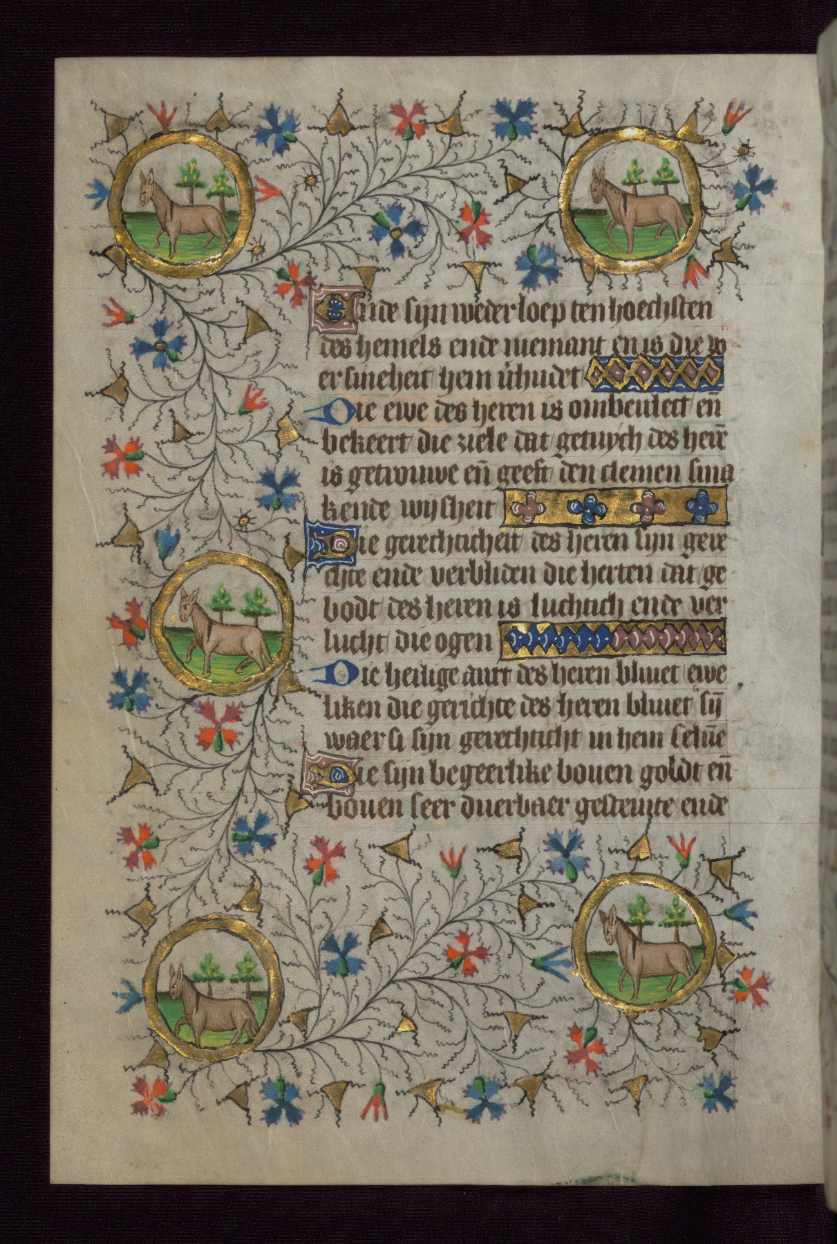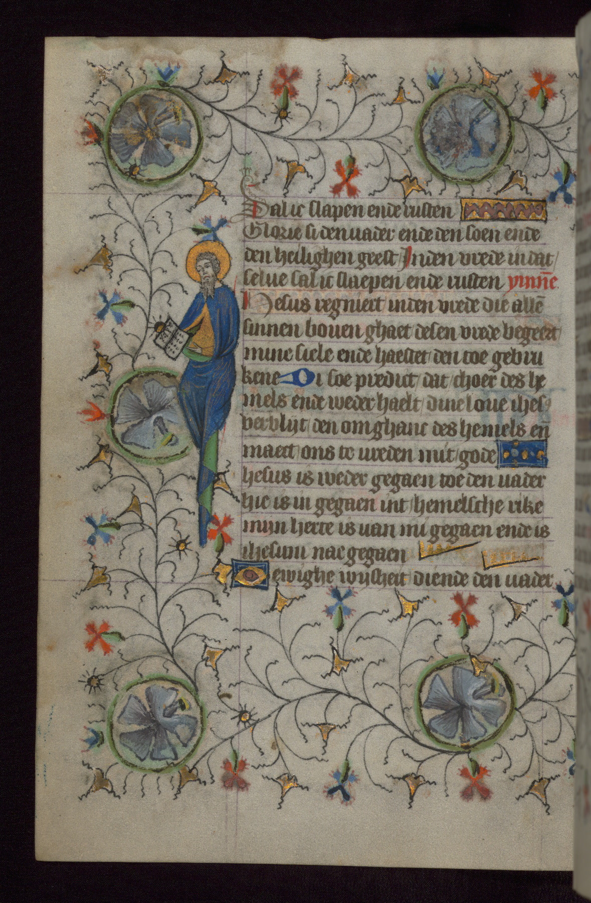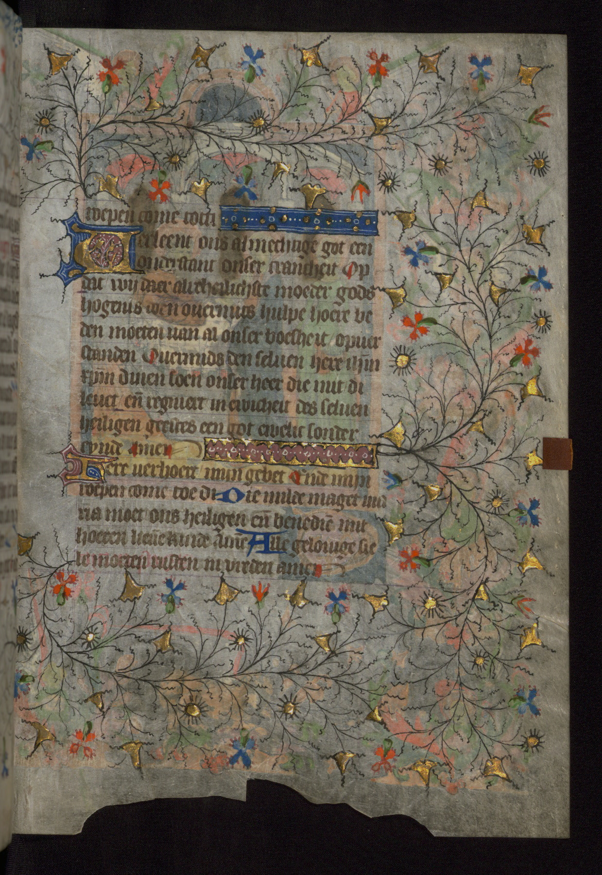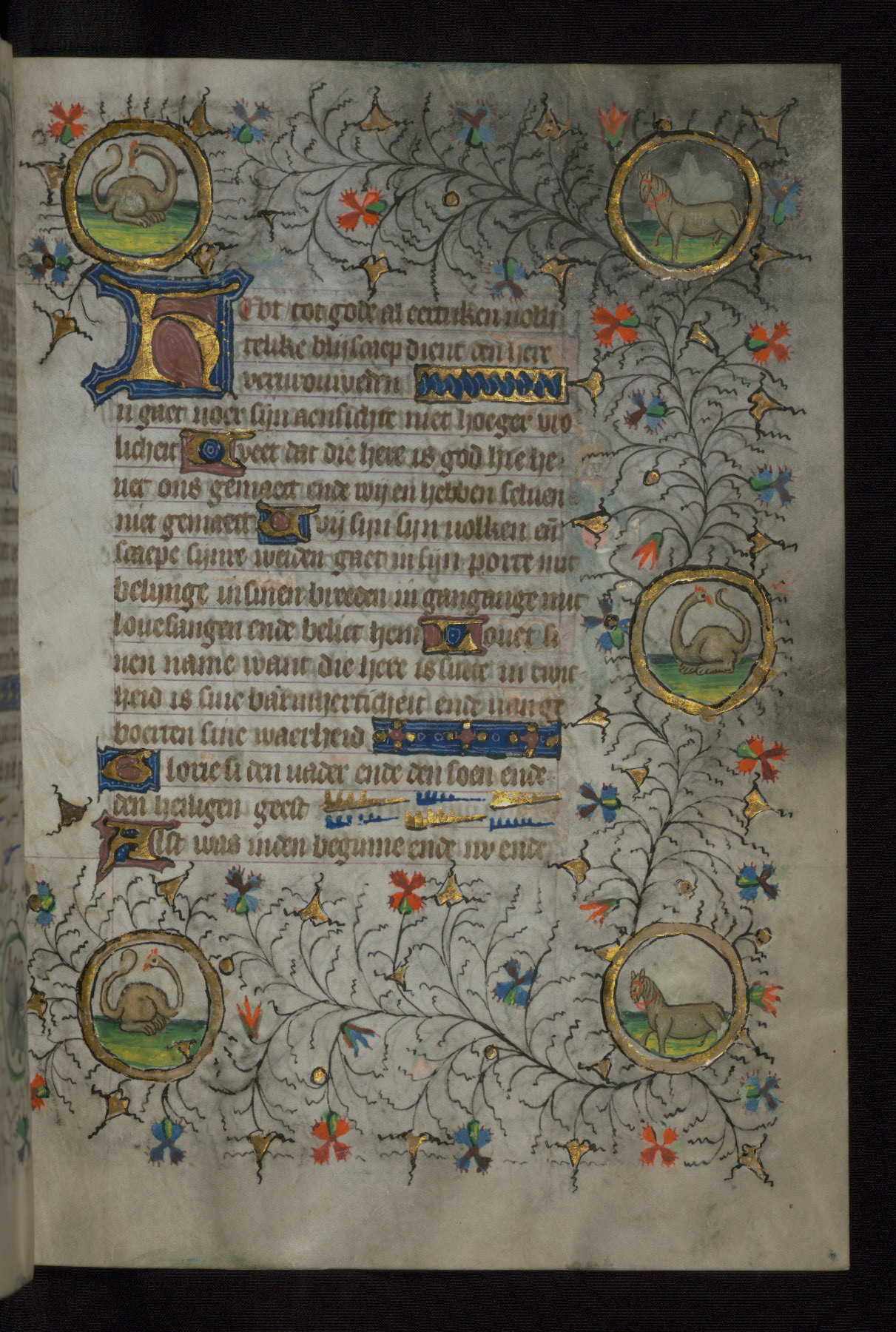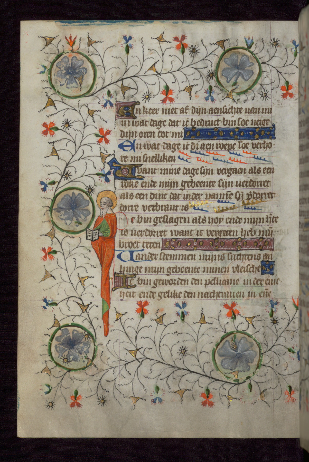 This book of hours was written in Dutch in the fifteenth century for the use of Utrecht. The Hours of the Virgin and of the Cross are accompanied here by the Dutch translation of Henry Suso's "Cursus aeternae sapientiae," a text that was particularly popular for private devotion in the Netherlands. Once owned by the English collector Lord Amherst, the manuscript is exceptional for its extensive illumination. Webs of foliage cover every margin, most sprouting medallions containing flora and fauna. The divisions in the text are marked by twenty richly painted full-page miniatures, often accompanied by related marginalia. Further illumination in the form of historiated and foliate initials marks minor breaks in the text, and the overall effect is a visual feast for the reader.