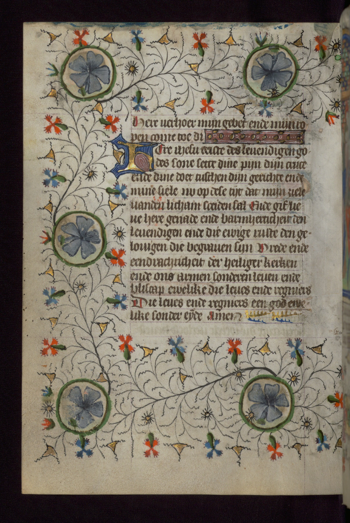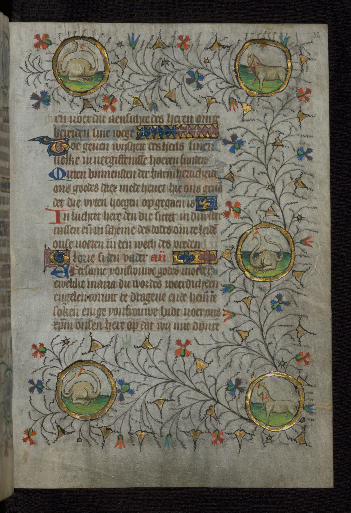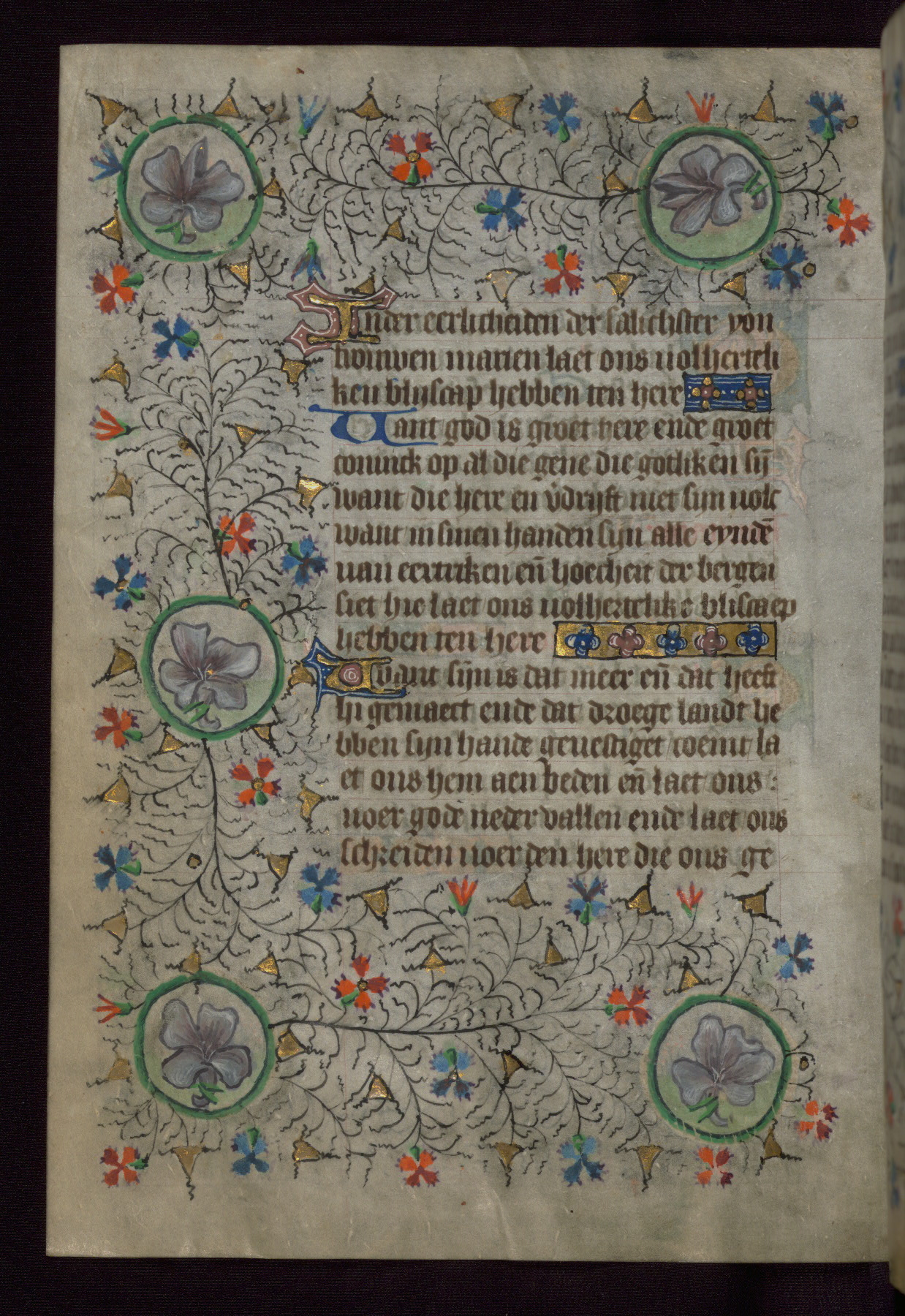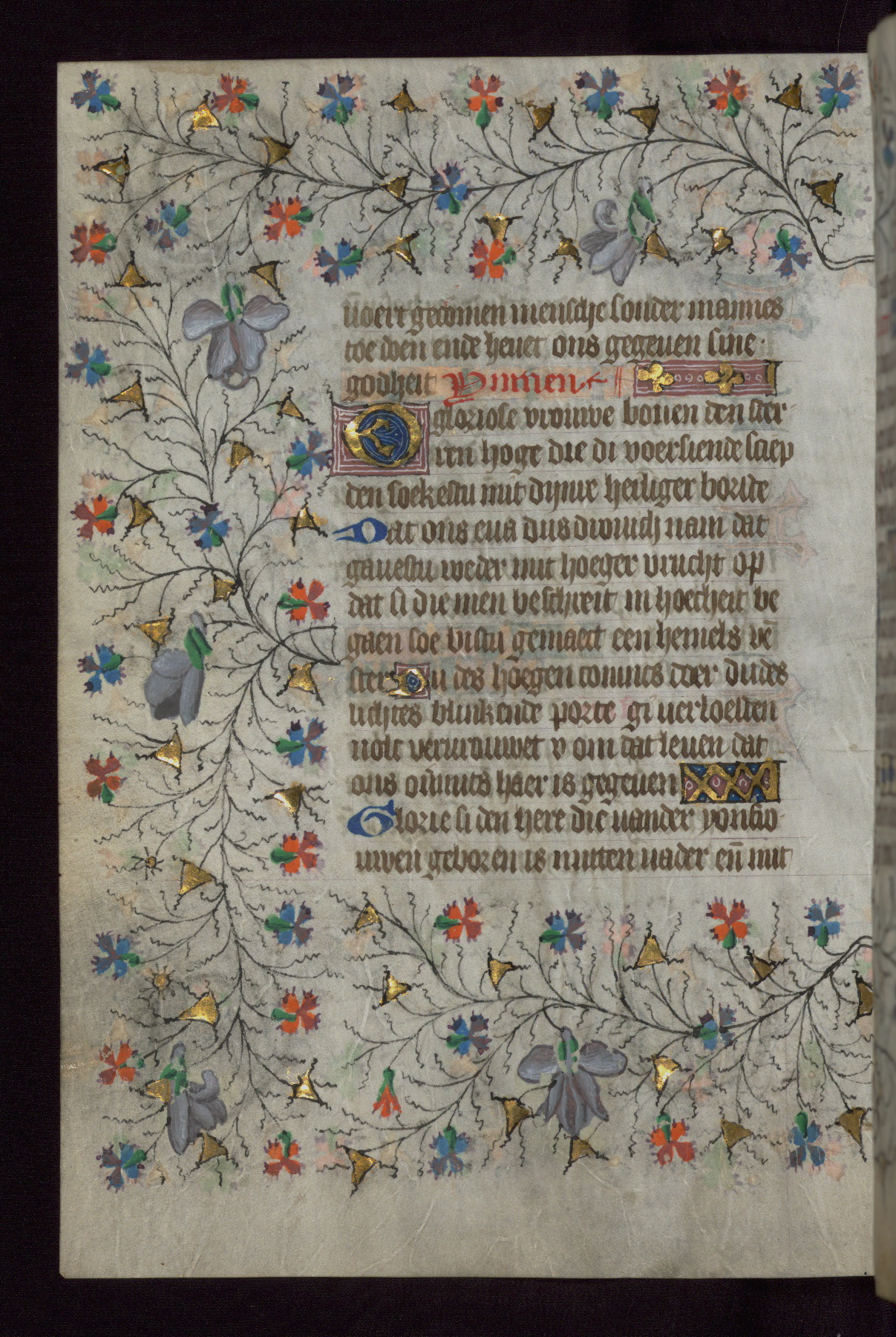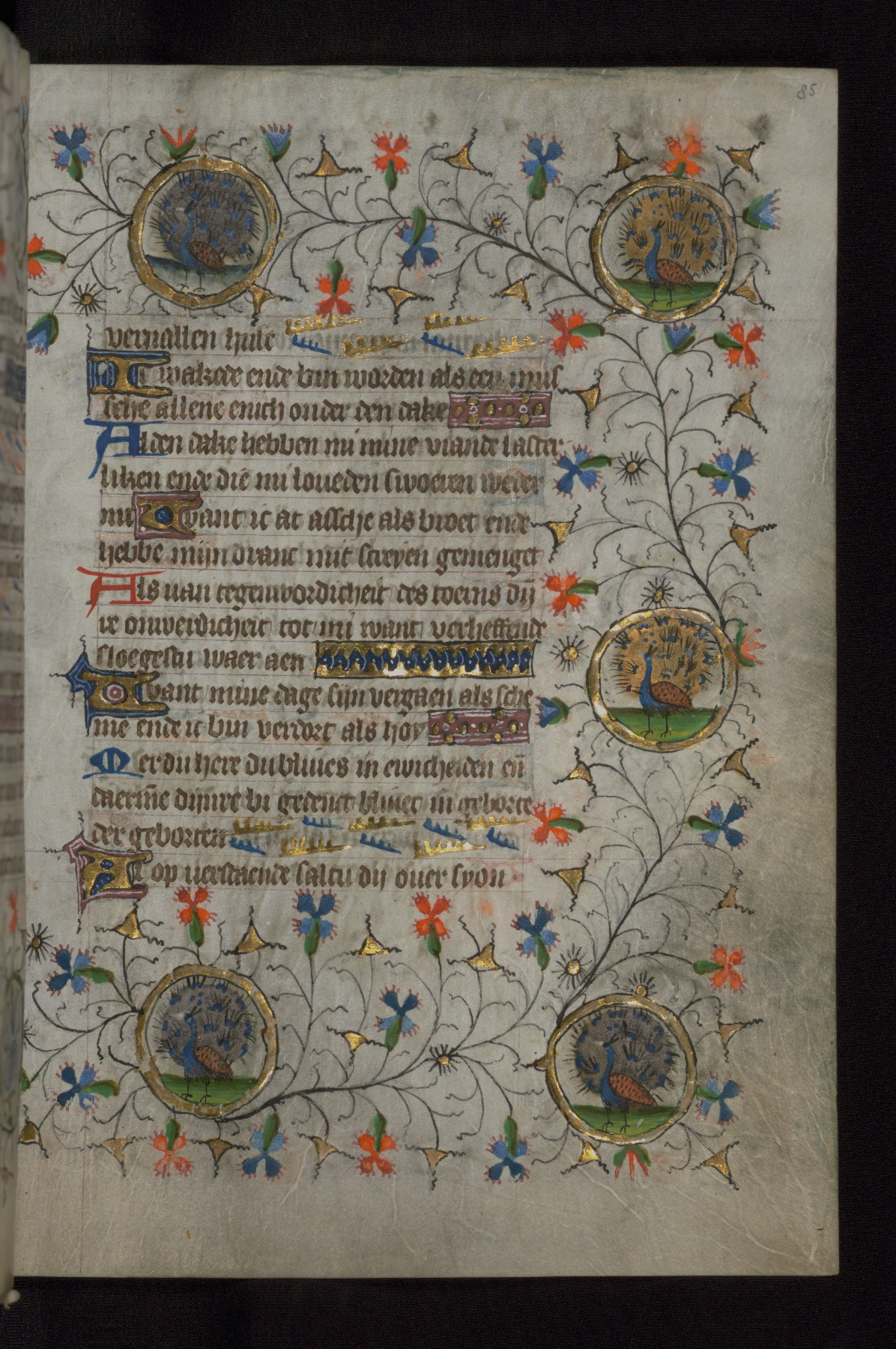 This book of hours was written in Dutch in the fifteenth century for the use of Utrecht. The Hours of the Virgin and of the Cross are accompanied here by the Dutch translation of Henry Suso's "Cursus aeternae sapientiae," a text that was particularly popular for private devotion in the Netherlands. Once owned by the English collector Lord Amherst, the manuscript is exceptional for its extensive illumination. Webs of foliage cover every margin, most sprouting medallions containing flora and fauna. The divisions in the text are marked by twenty richly painted full-page miniatures, often accompanied by related marginalia. Further illumination in the form of historiated and foliate initials marks minor breaks in the text, and the overall effect is a visual feast for the reader.