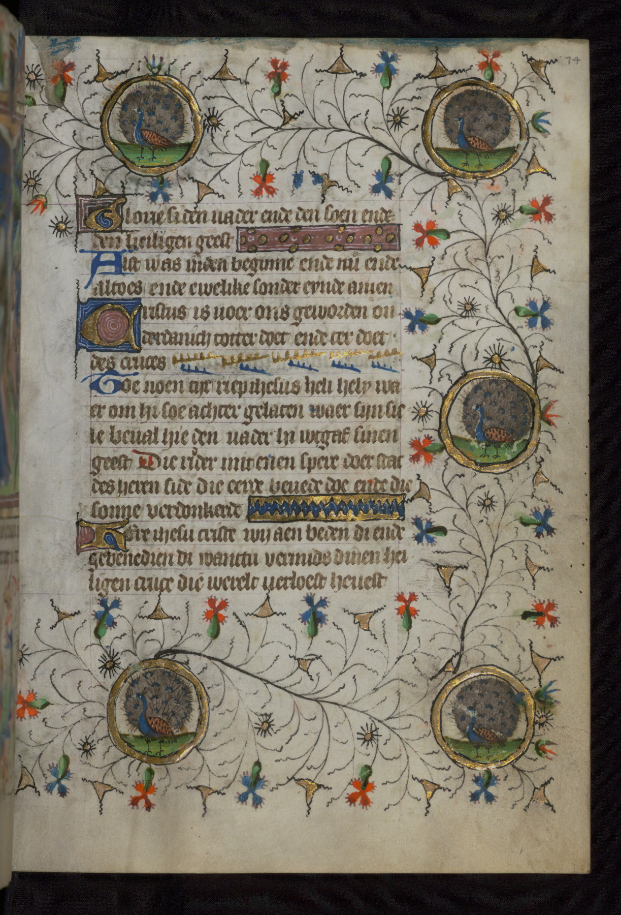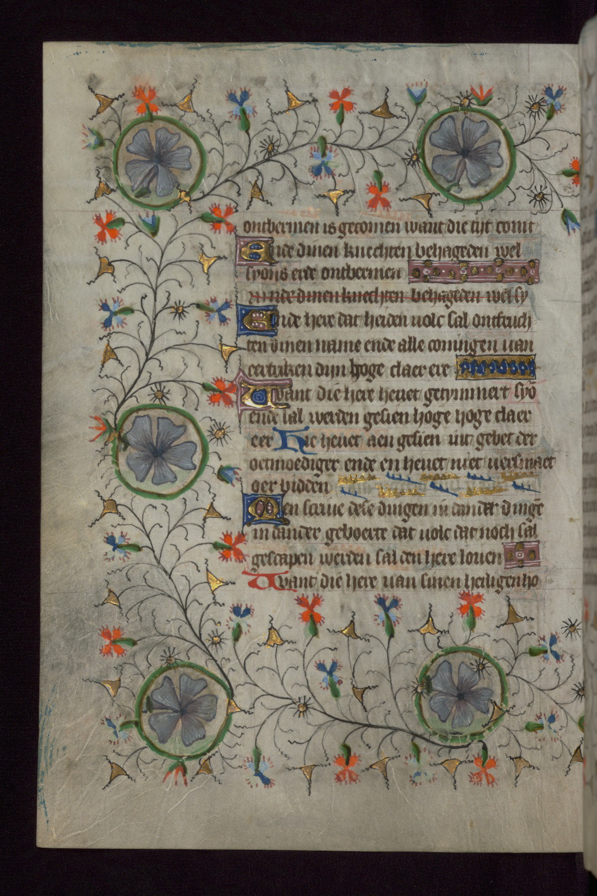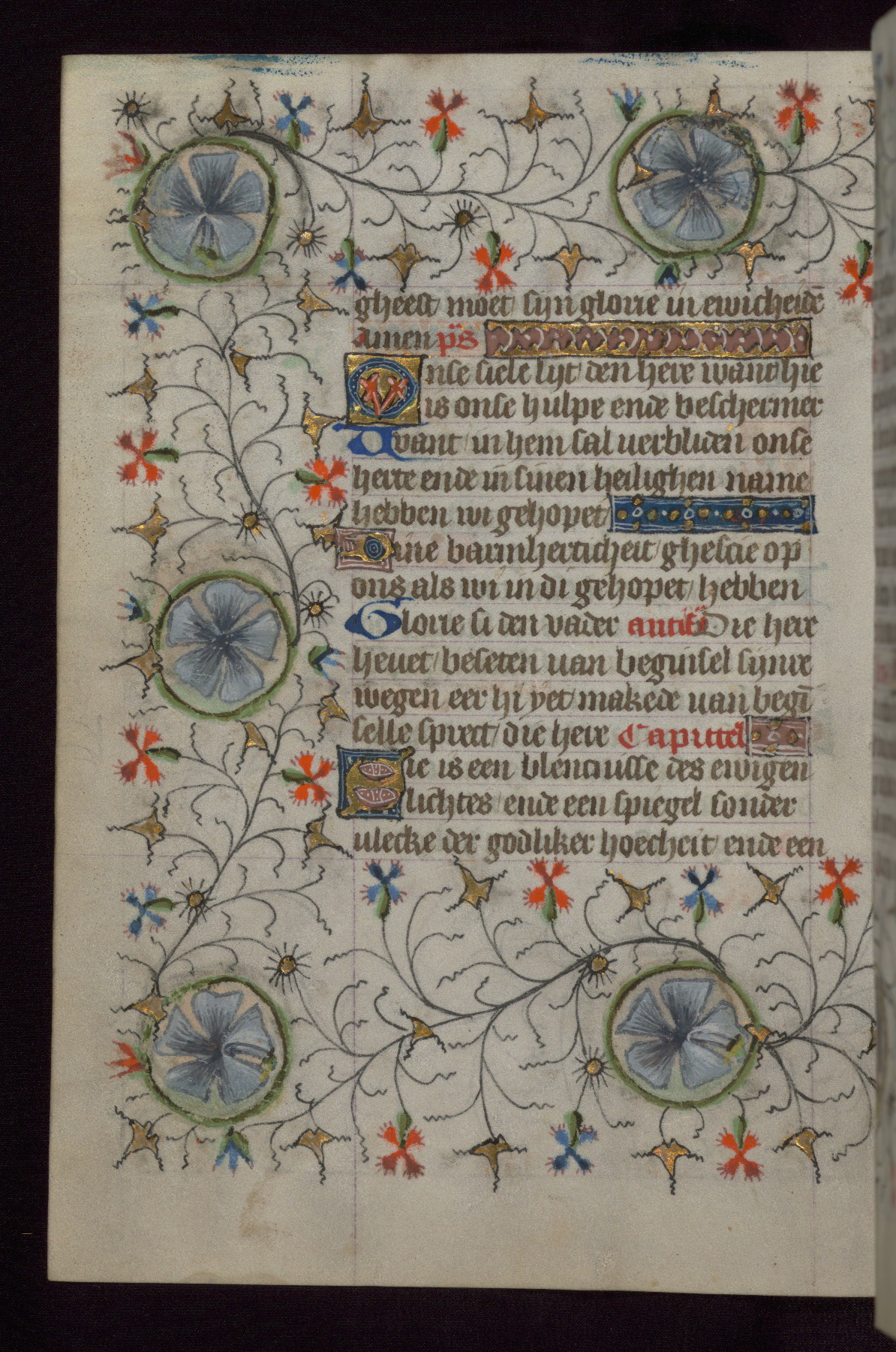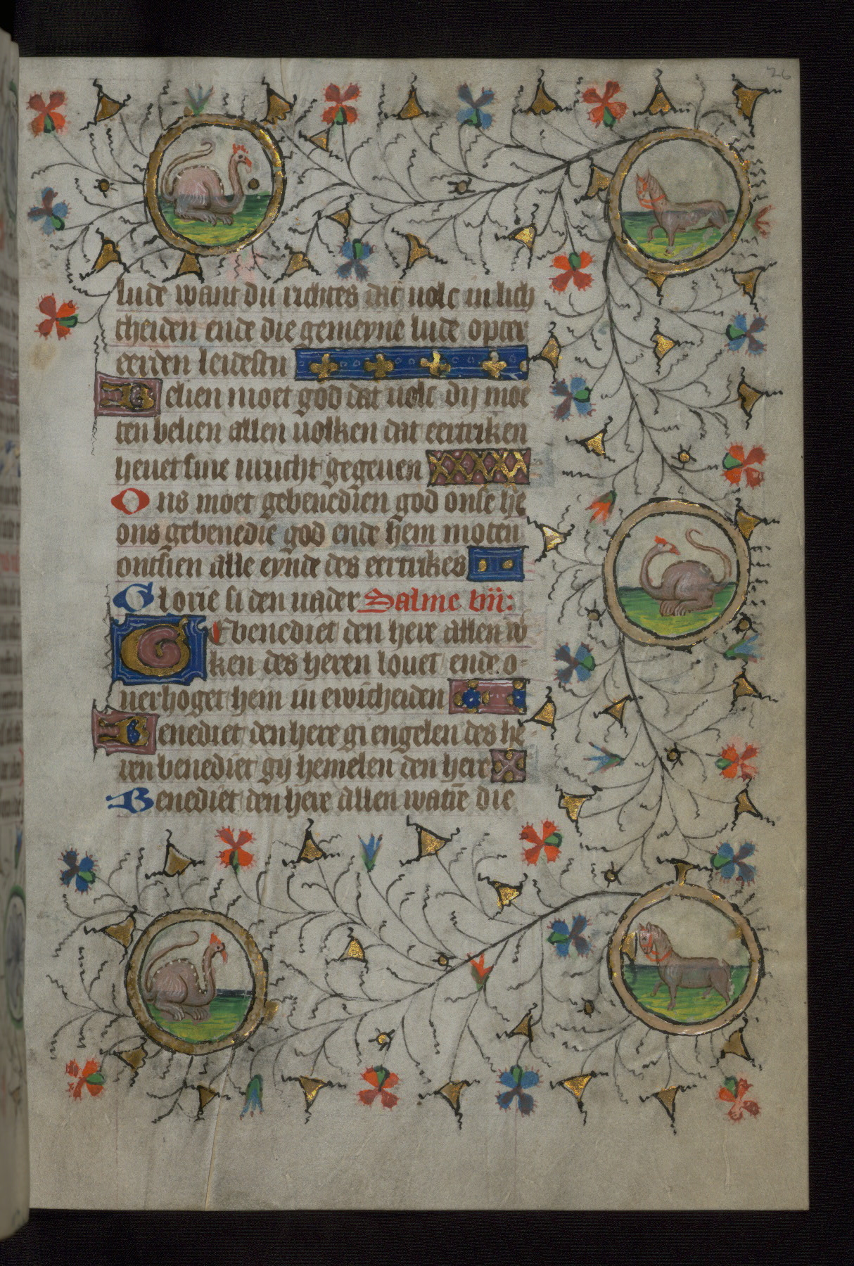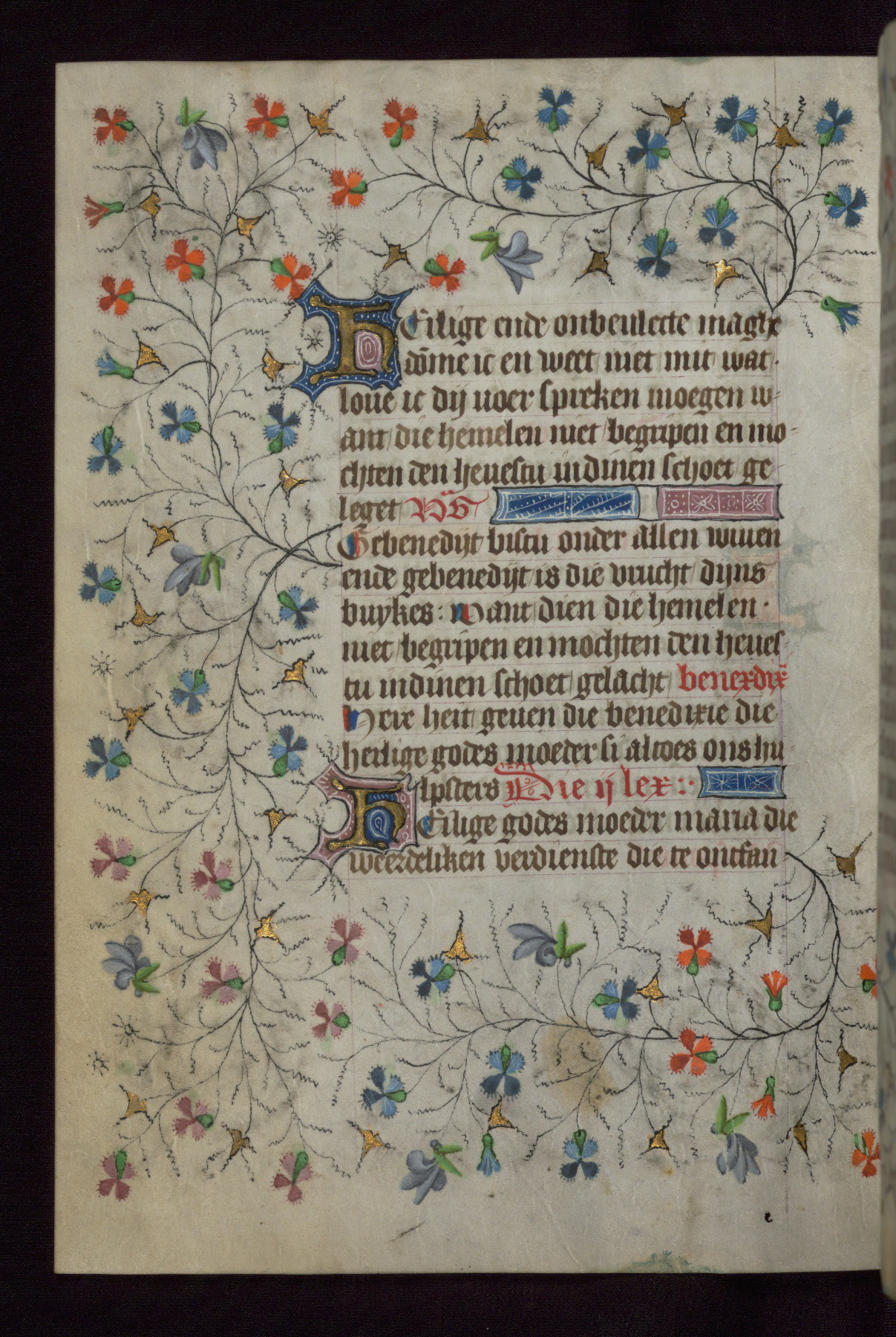 This book of hours was written in Dutch in the fifteenth century for the use of Utrecht. The Hours of the Virgin and of the Cross are accompanied here by the Dutch translation of Henry Suso's "Cursus aeternae sapientiae," a text that was particularly popular for private devotion in the Netherlands. Once owned by the English collector Lord Amherst, the manuscript is exceptional for its extensive illumination. Webs of foliage cover every margin, most sprouting medallions containing flora and fauna. The divisions in the text are marked by twenty richly painted full-page miniatures, often accompanied by related marginalia. Further illumination in the form of historiated and foliate initials marks minor breaks in the text, and the overall effect is a visual feast for the reader.