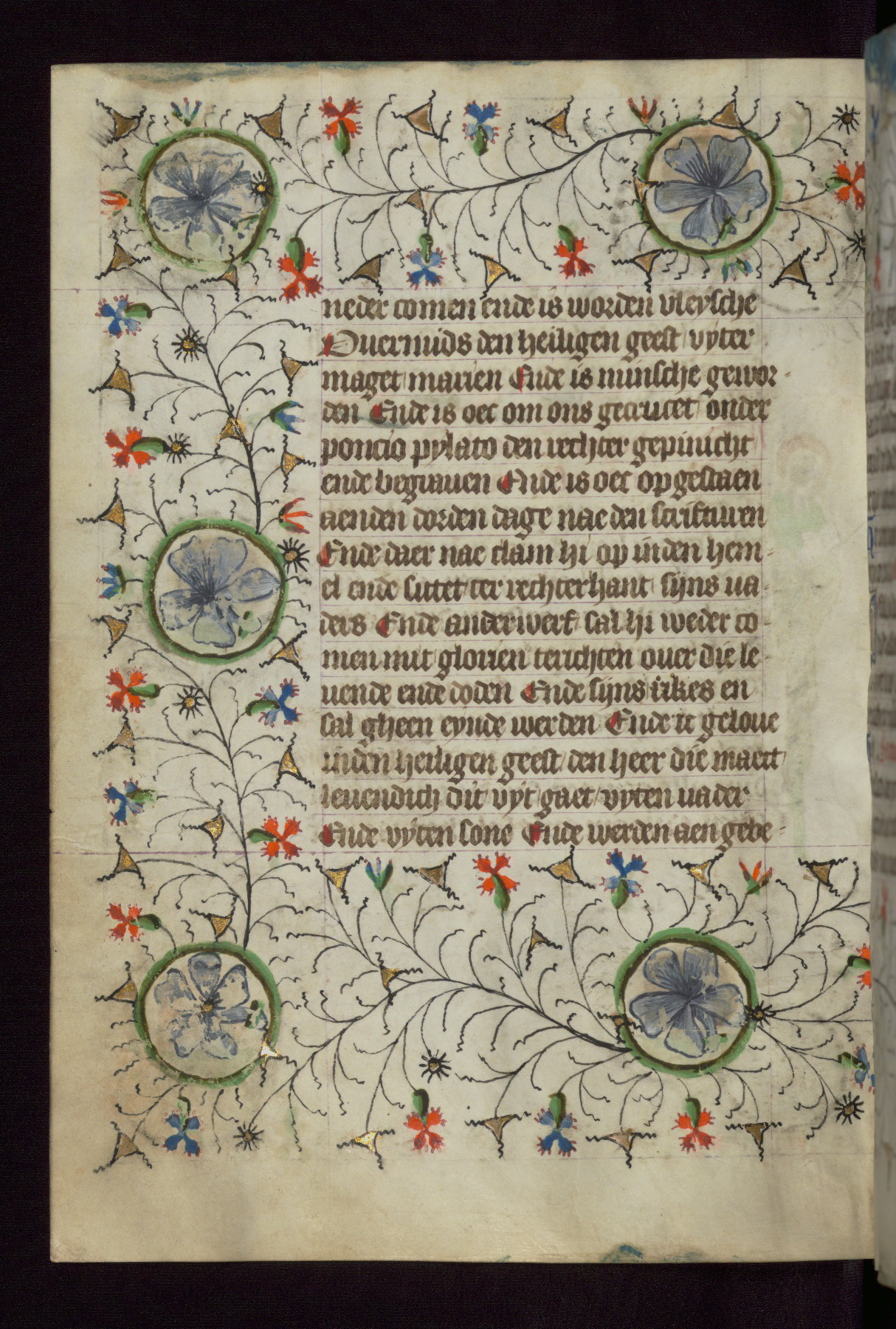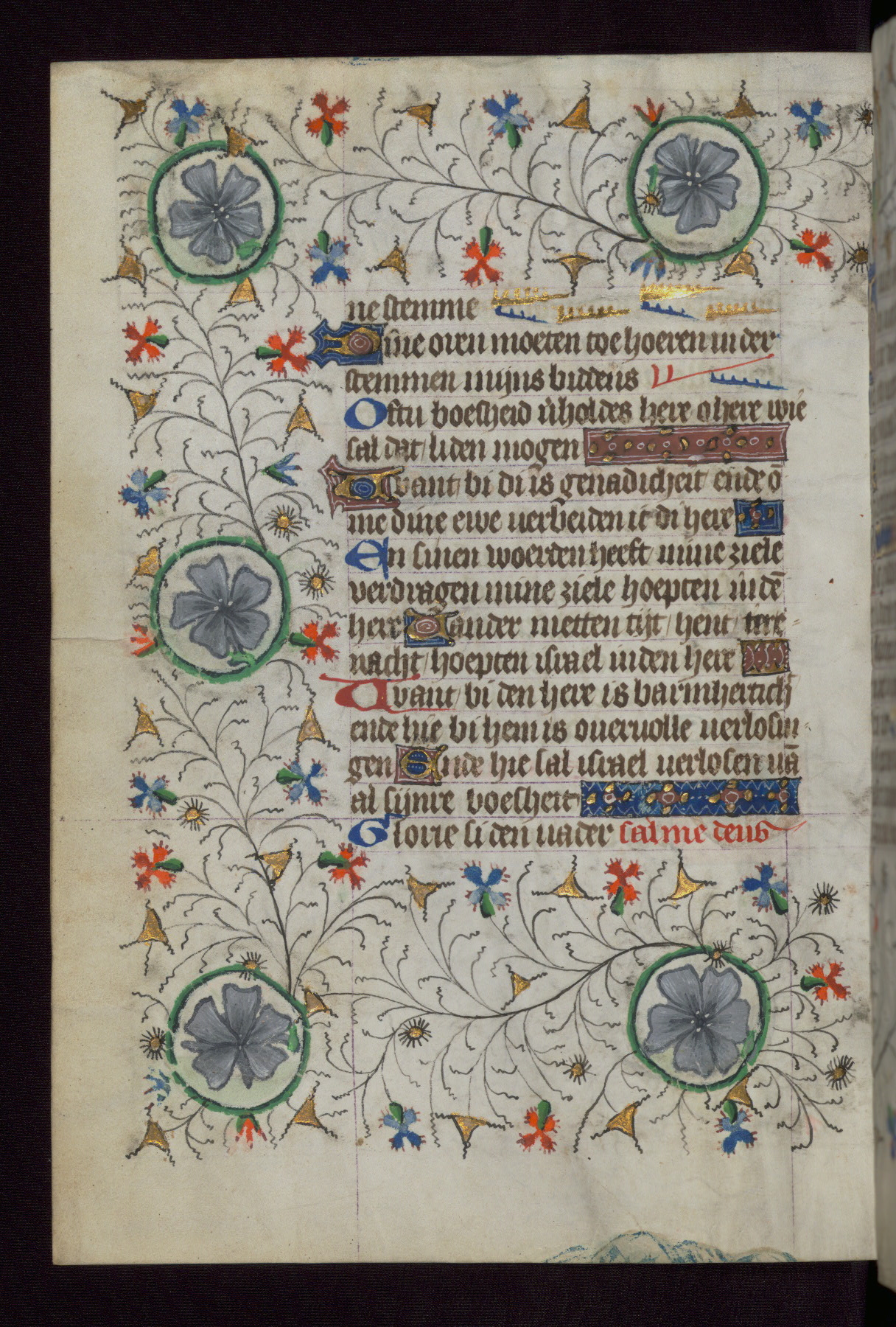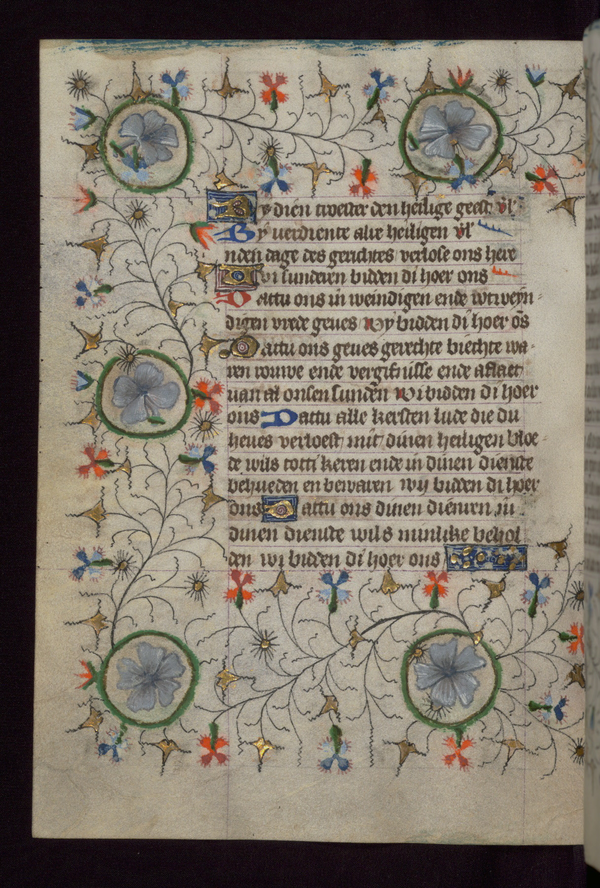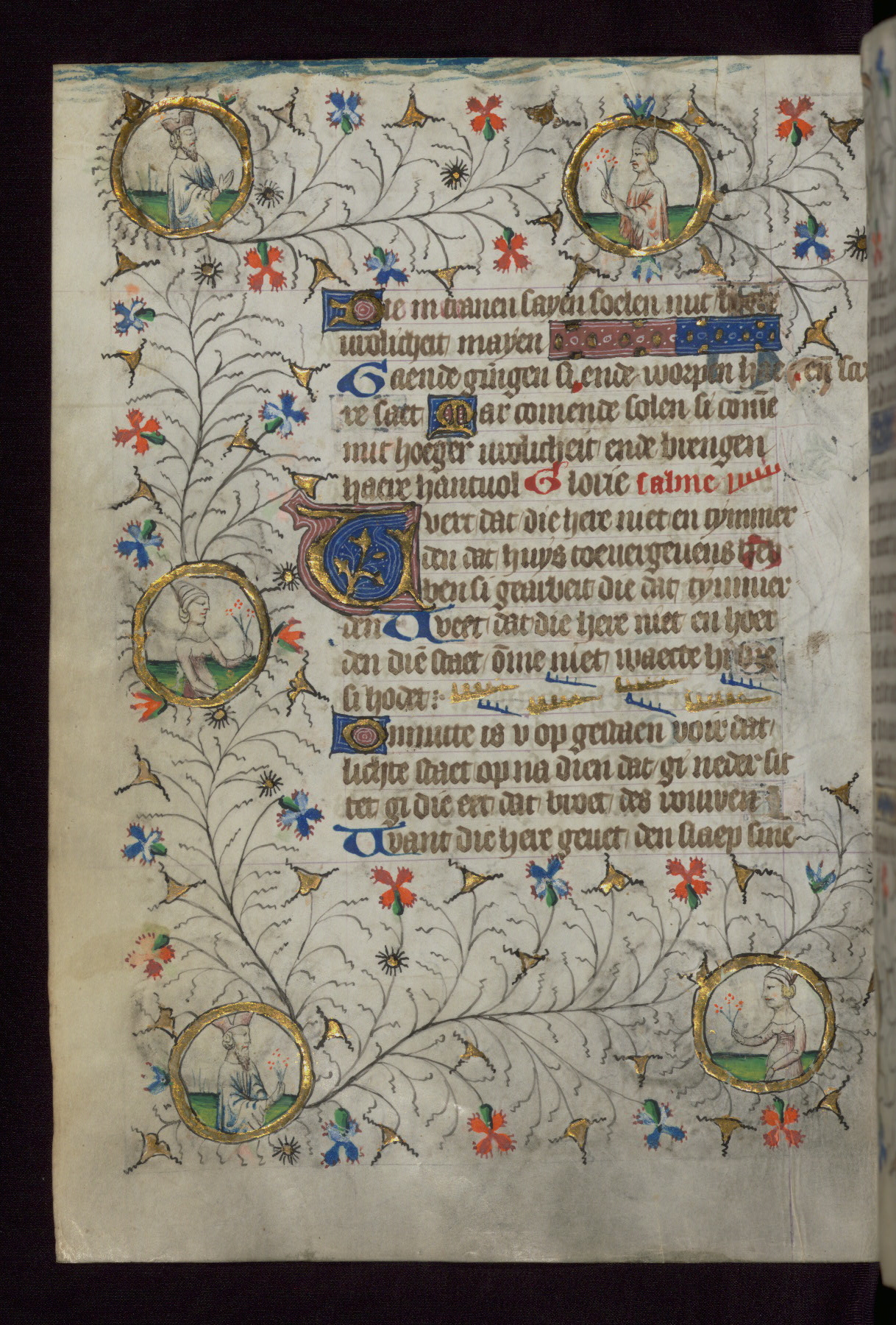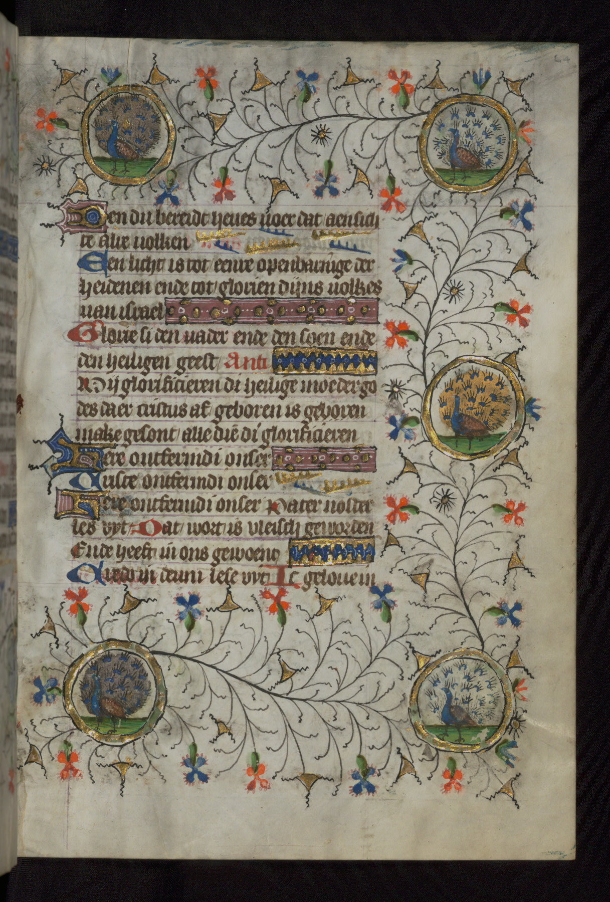 This book of hours was written in Dutch in the fifteenth century for the use of Utrecht. The Hours of the Virgin and of the Cross are accompanied here by the Dutch translation of Henry Suso's "Cursus aeternae sapientiae," a text that was particularly popular for private devotion in the Netherlands. Once owned by the English collector Lord Amherst, the manuscript is exceptional for its extensive illumination. Webs of foliage cover every margin, most sprouting medallions containing flora and fauna. The divisions in the text are marked by twenty richly painted full-page miniatures, often accompanied by related marginalia. Further illumination in the form of historiated and foliate initials marks minor breaks in the text, and the overall effect is a visual feast for the reader.