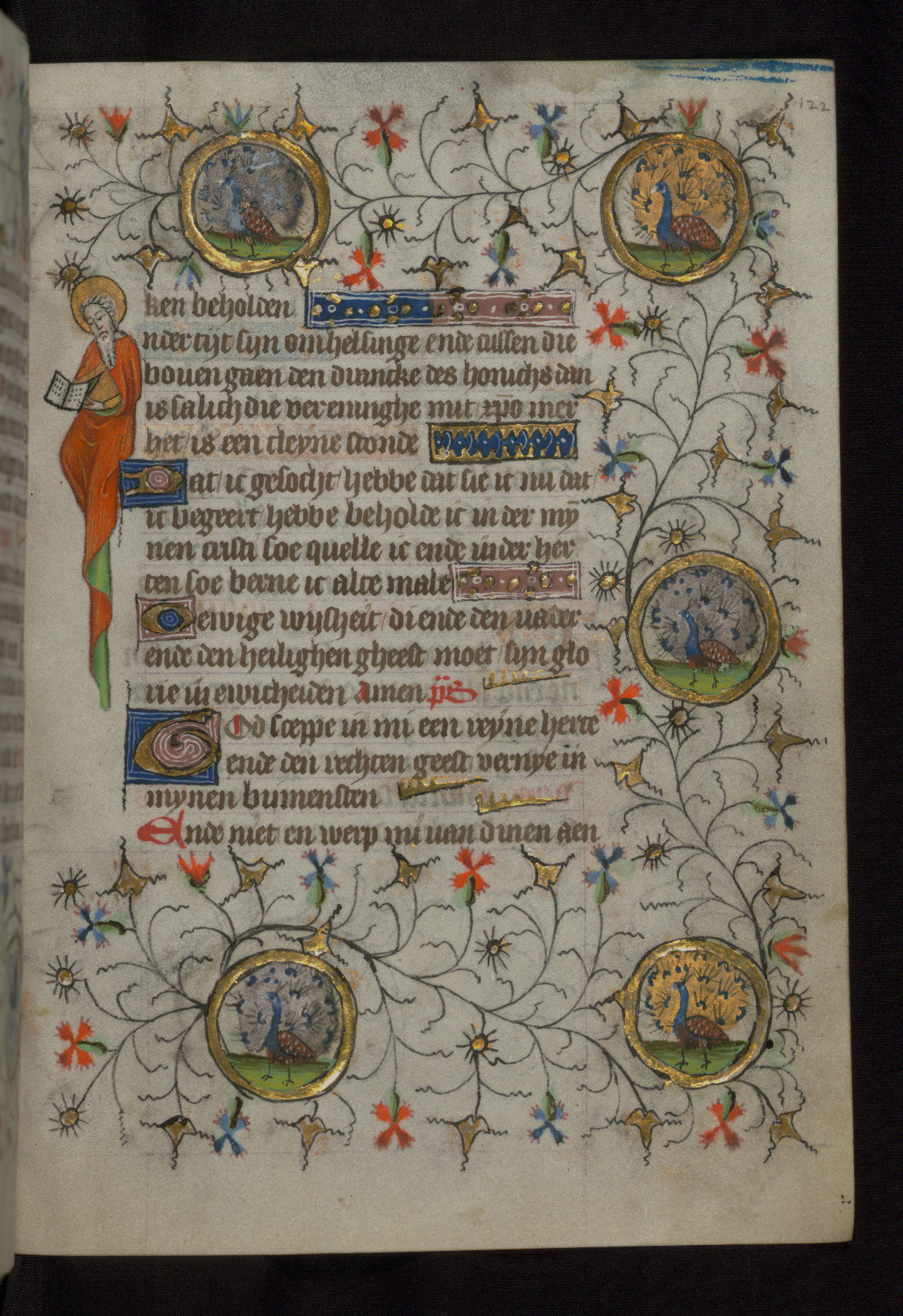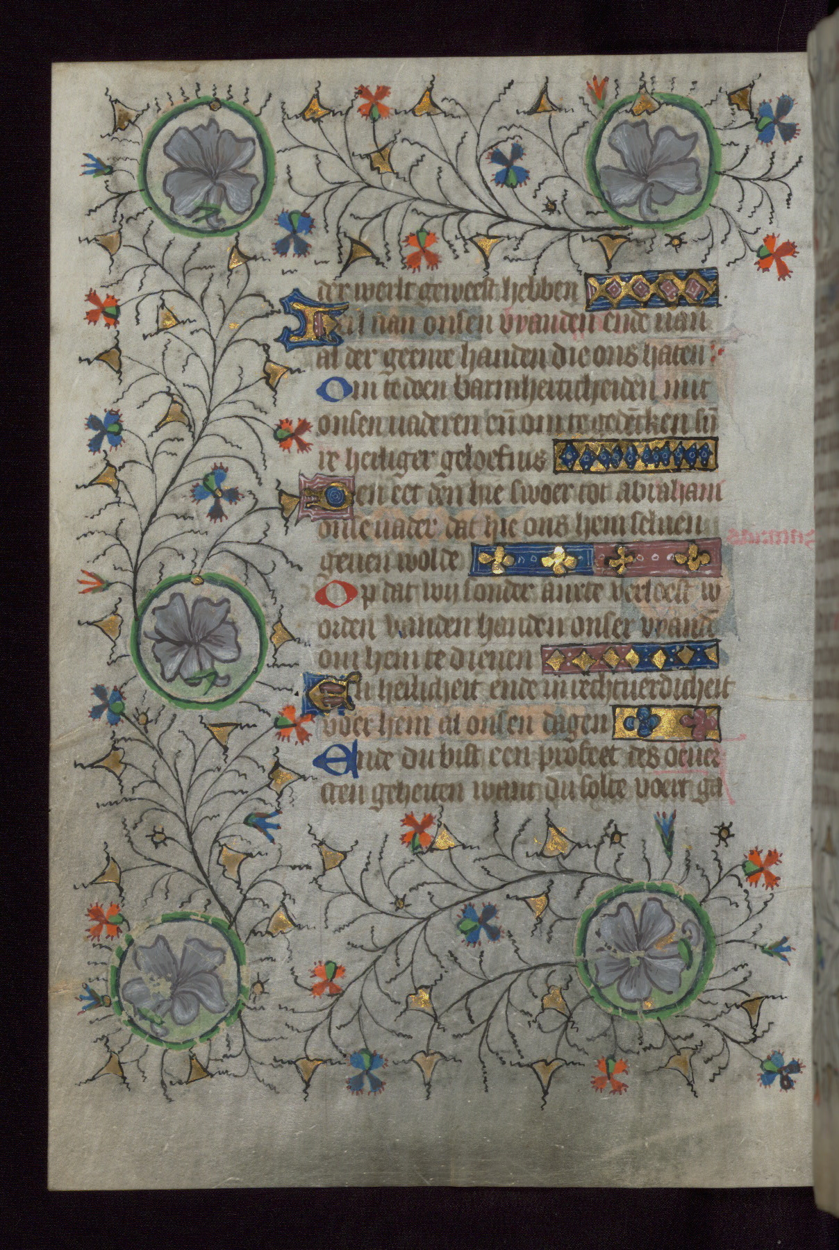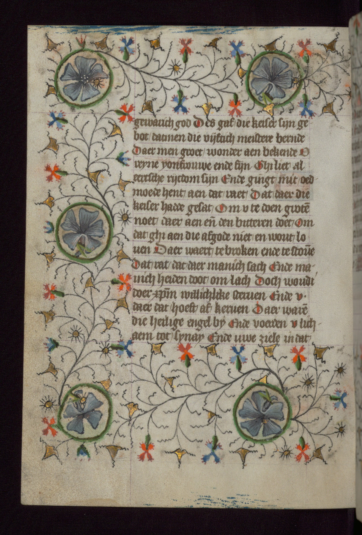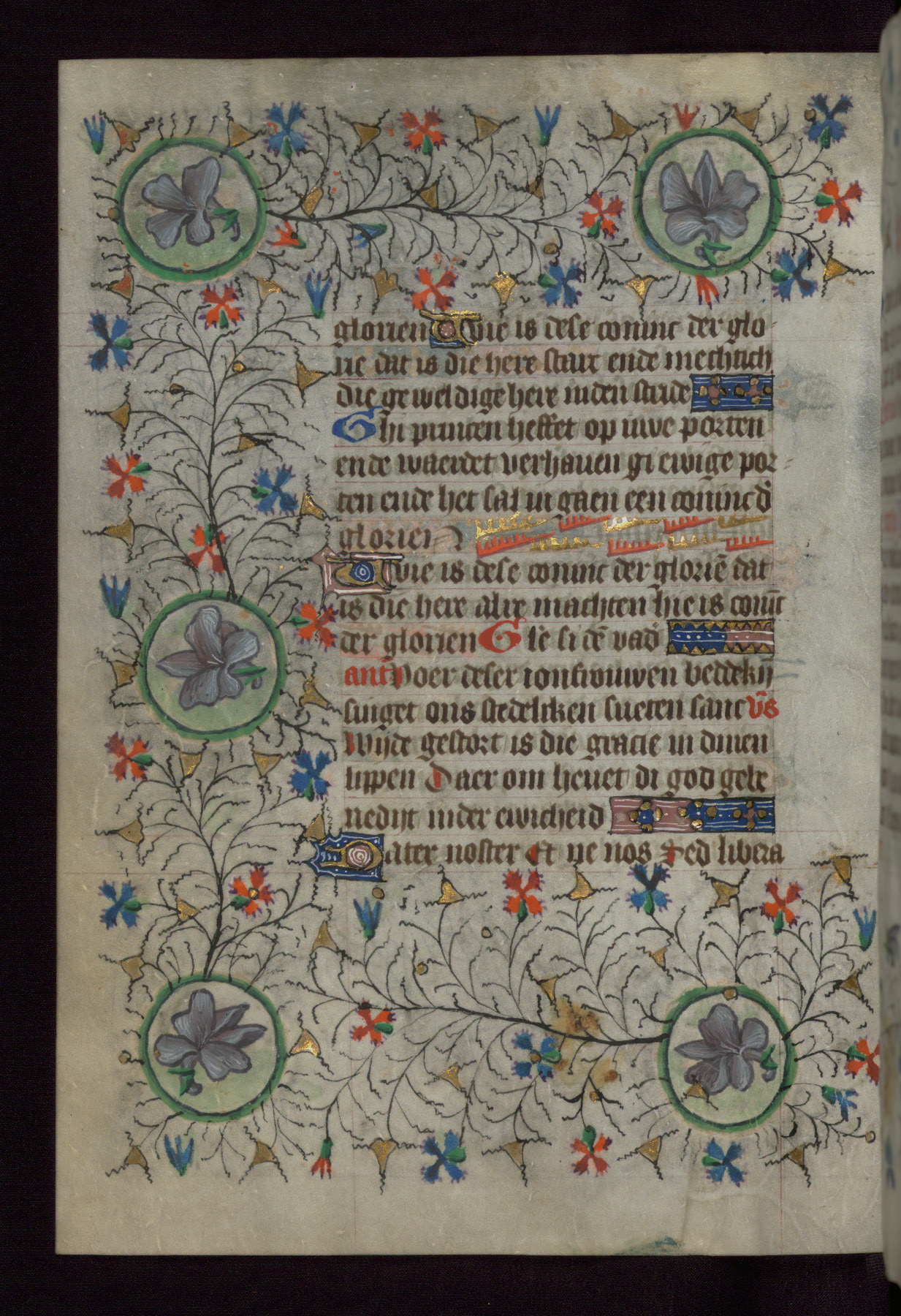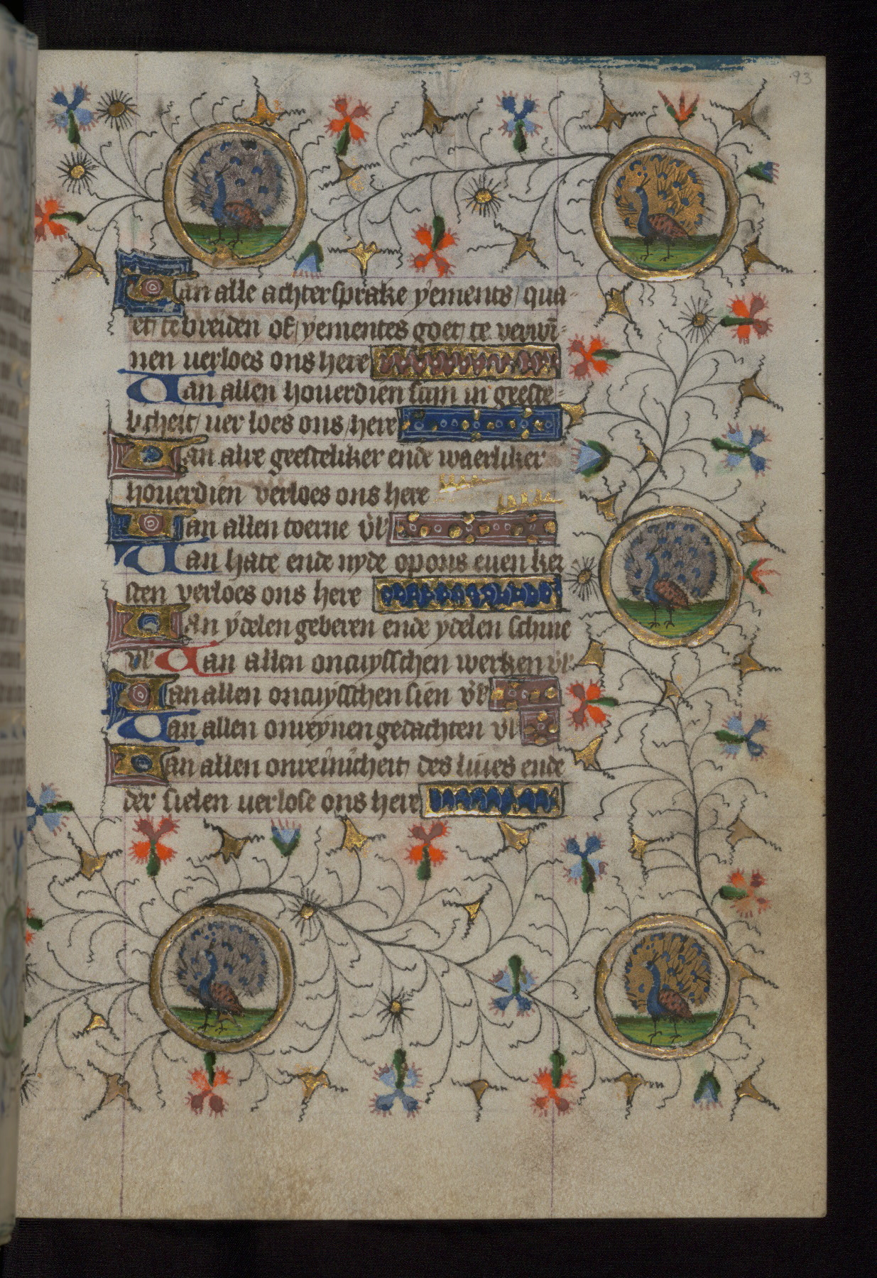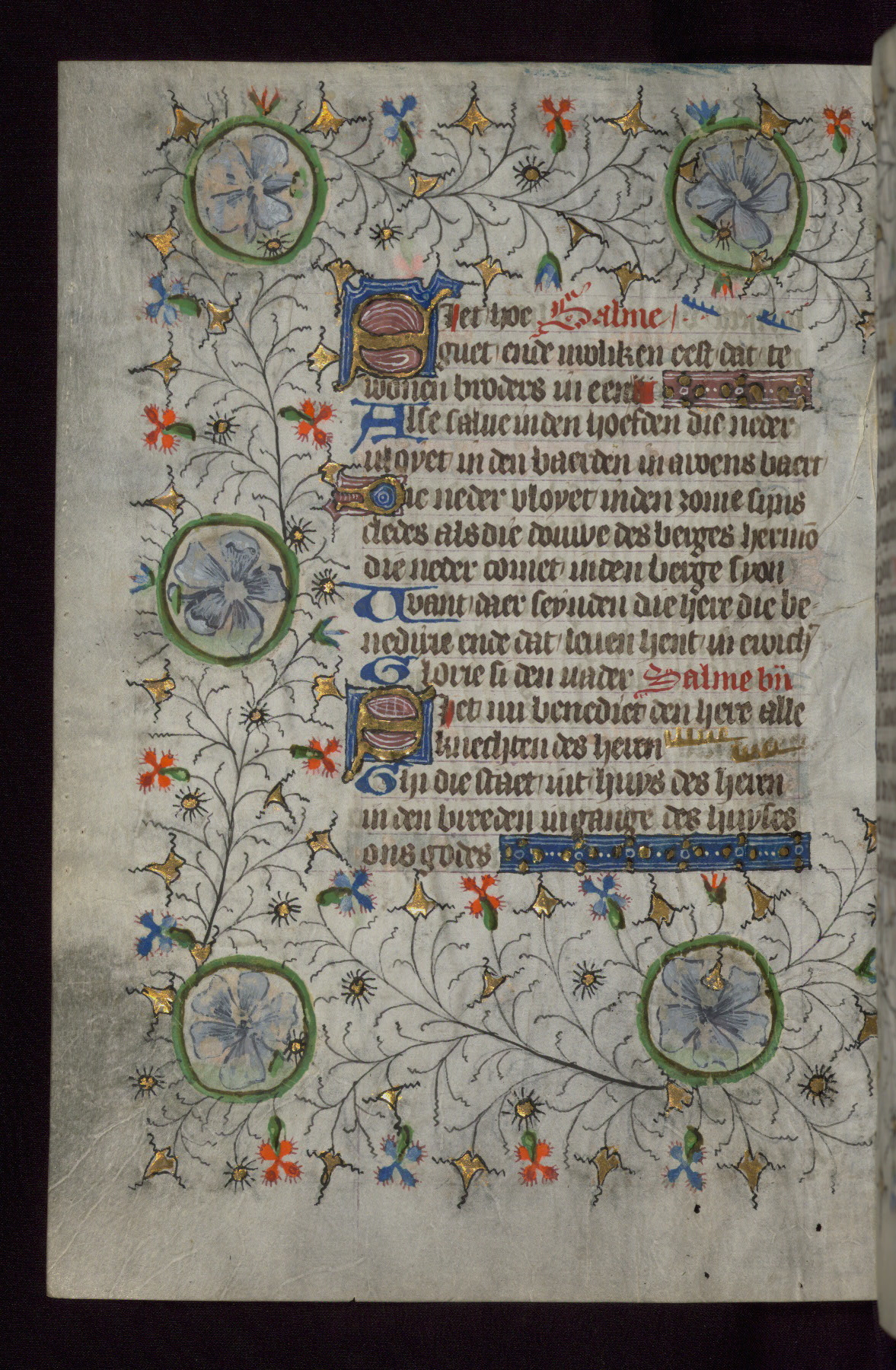 This book of hours was written in Dutch in the fifteenth century for the use of Utrecht. The Hours of the Virgin and of the Cross are accompanied here by the Dutch translation of Henry Suso's "Cursus aeternae sapientiae," a text that was particularly popular for private devotion in the Netherlands. Once owned by the English collector Lord Amherst, the manuscript is exceptional for its extensive illumination. Webs of foliage cover every margin, most sprouting medallions containing flora and fauna. The divisions in the text are marked by twenty richly painted full-page miniatures, often accompanied by related marginalia. Further illumination in the form of historiated and foliate initials marks minor breaks in the text, and the overall effect is a visual feast for the reader.
