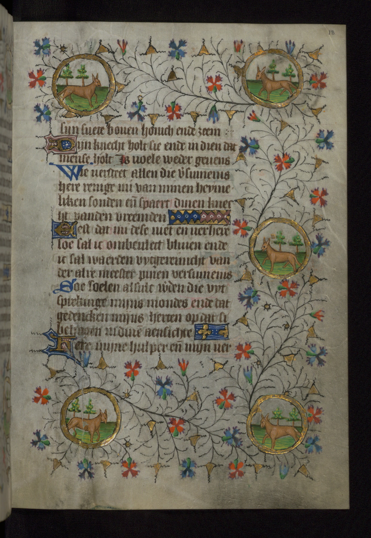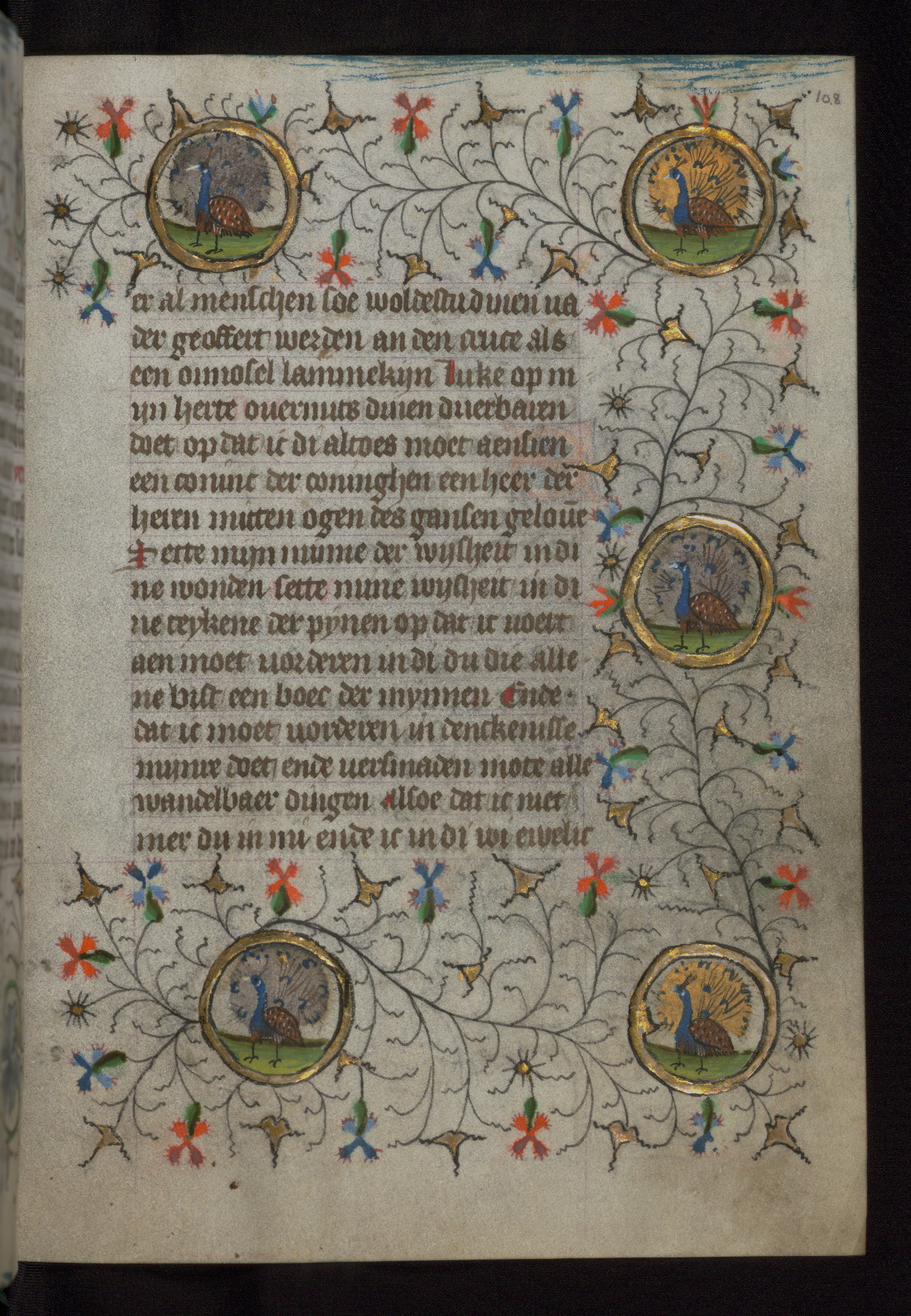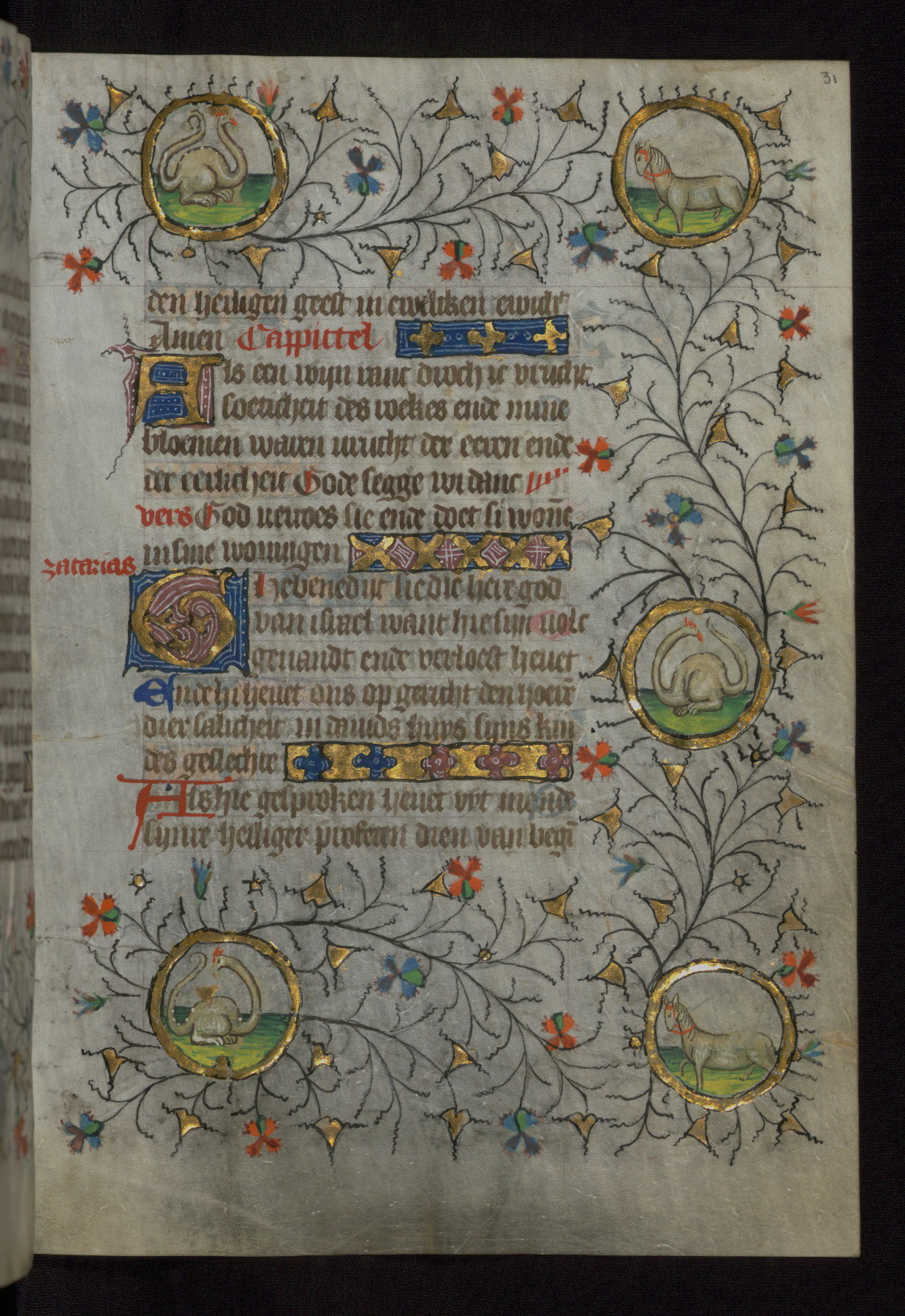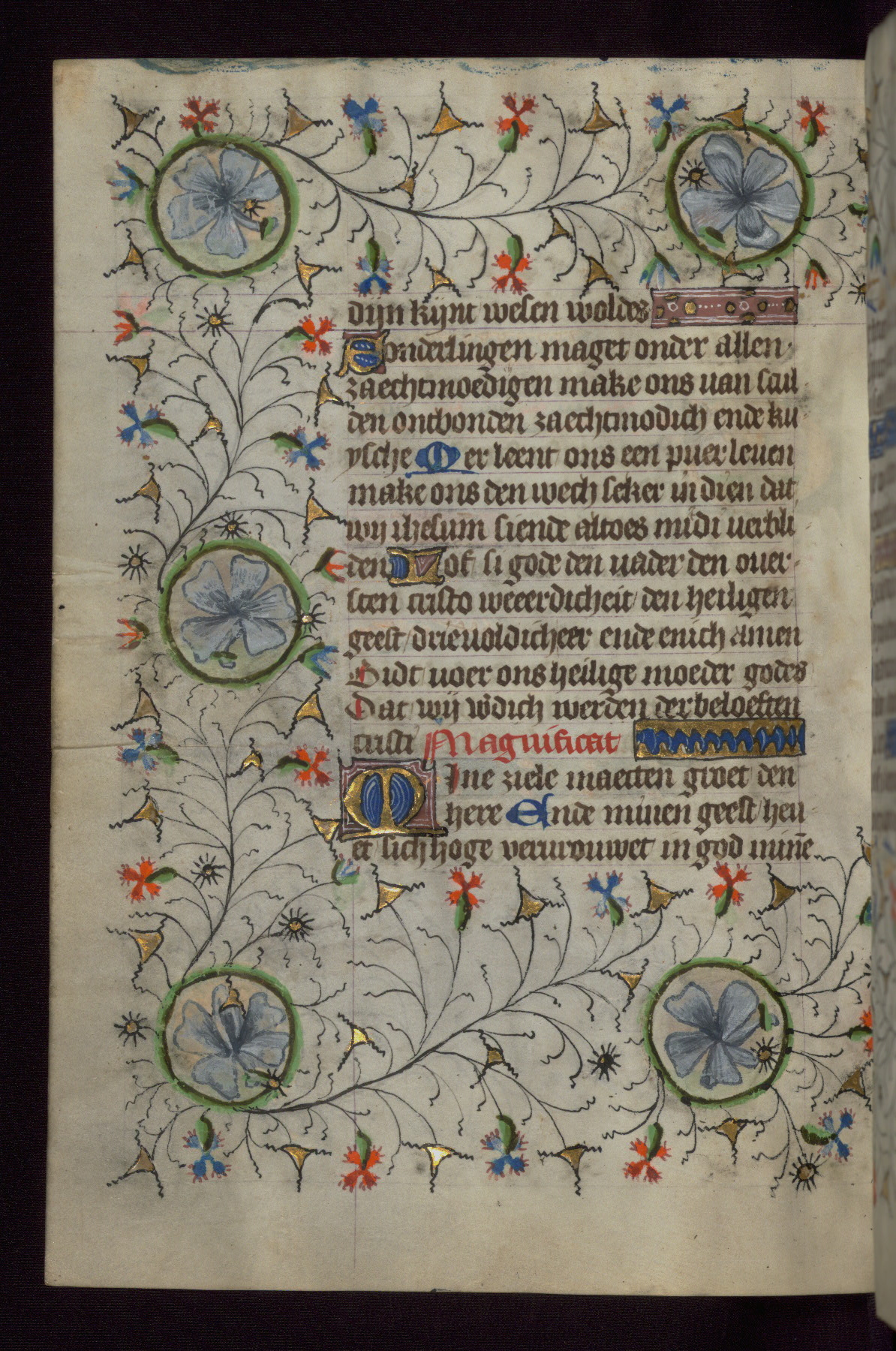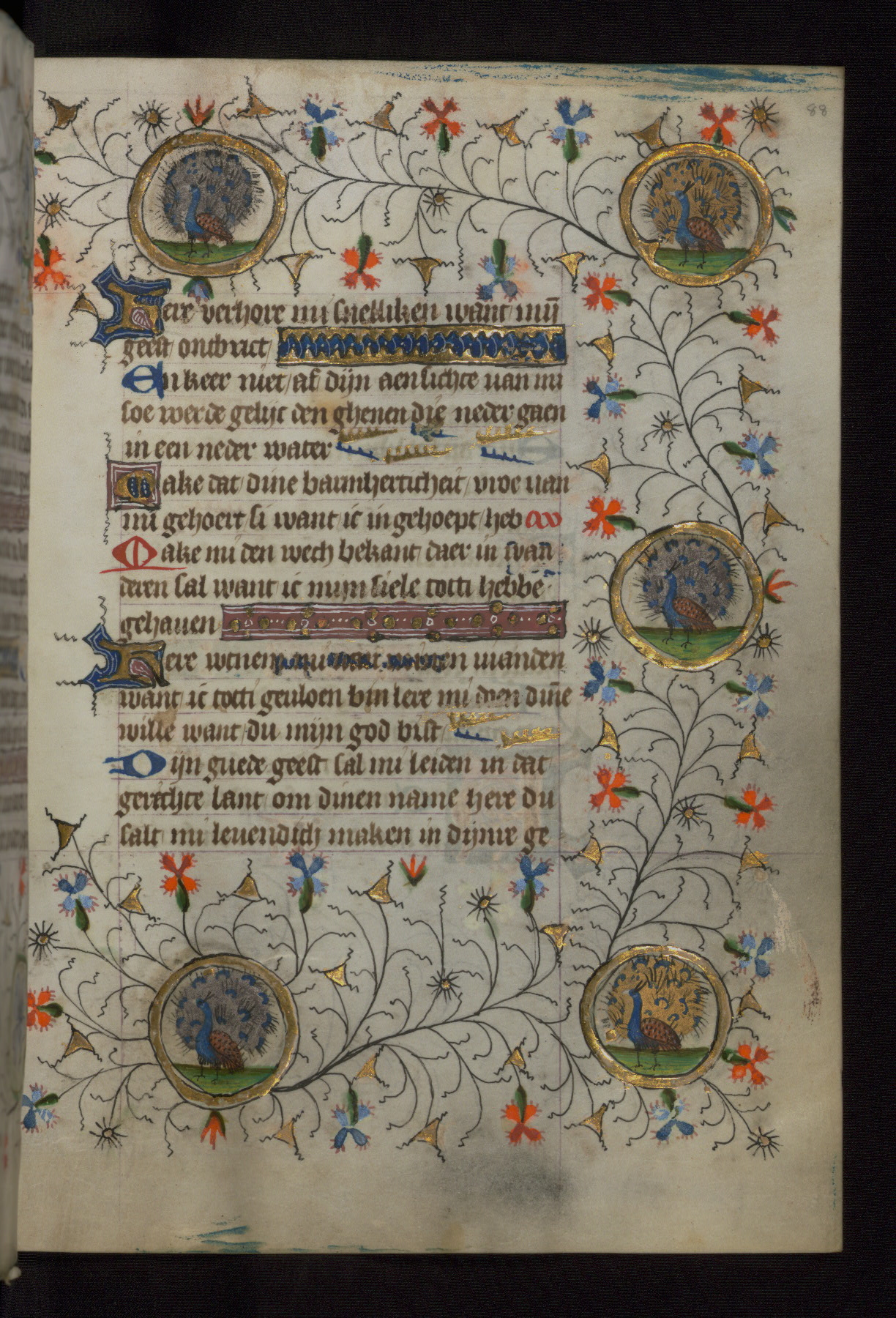 This book of hours was written in Dutch in the fifteenth century for the use of Utrecht. The Hours of the Virgin and of the Cross are accompanied here by the Dutch translation of Henry Suso's "Cursus aeternae sapientiae," a text that was particularly popular for private devotion in the Netherlands. Once owned by the English collector Lord Amherst, the manuscript is exceptional for its extensive illumination. Webs of foliage cover every margin, most sprouting medallions containing flora and fauna. The divisions in the text are marked by twenty richly painted full-page miniatures, often accompanied by related marginalia. Further illumination in the form of historiated and foliate initials marks minor breaks in the text, and the overall effect is a visual feast for the reader.
