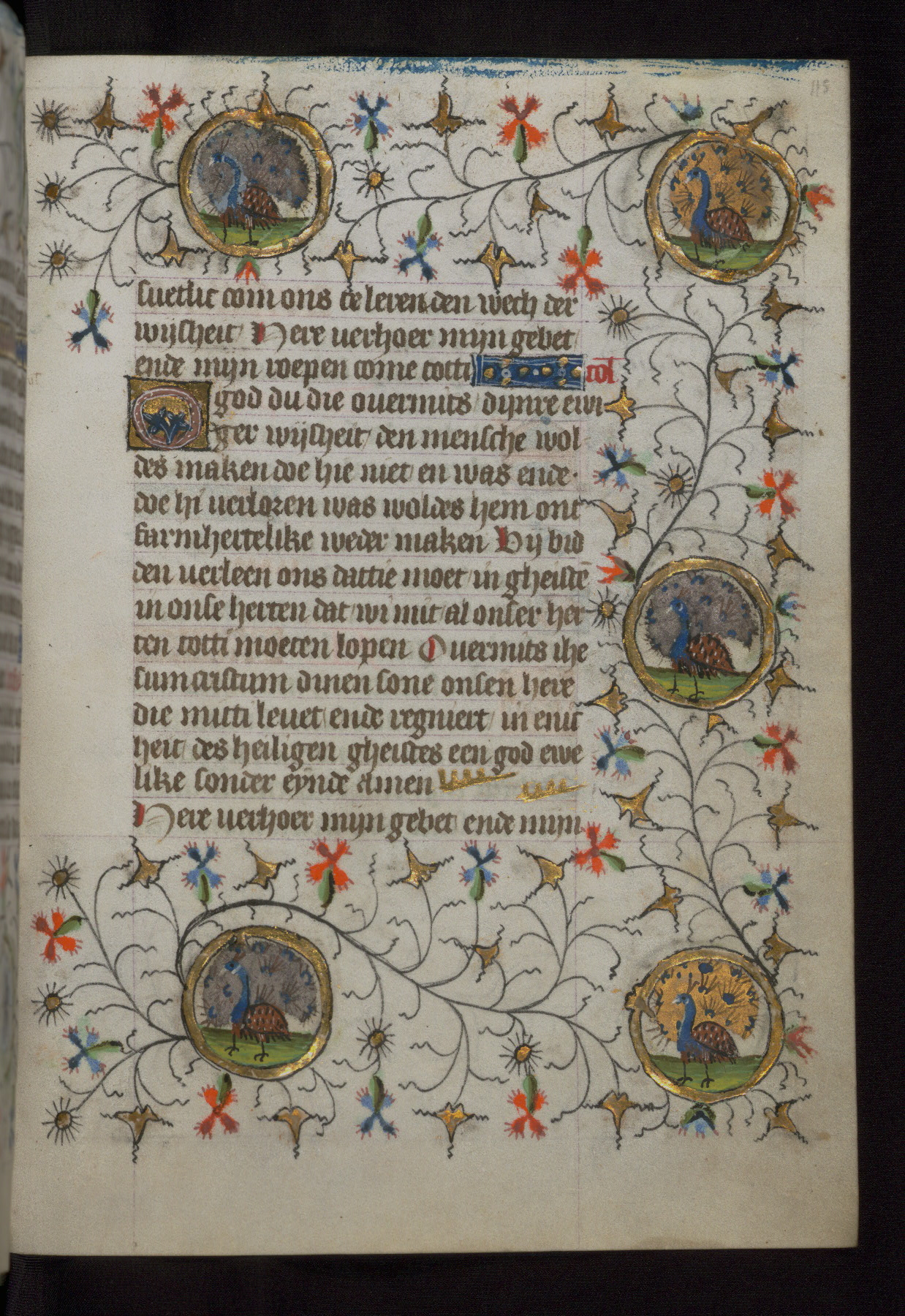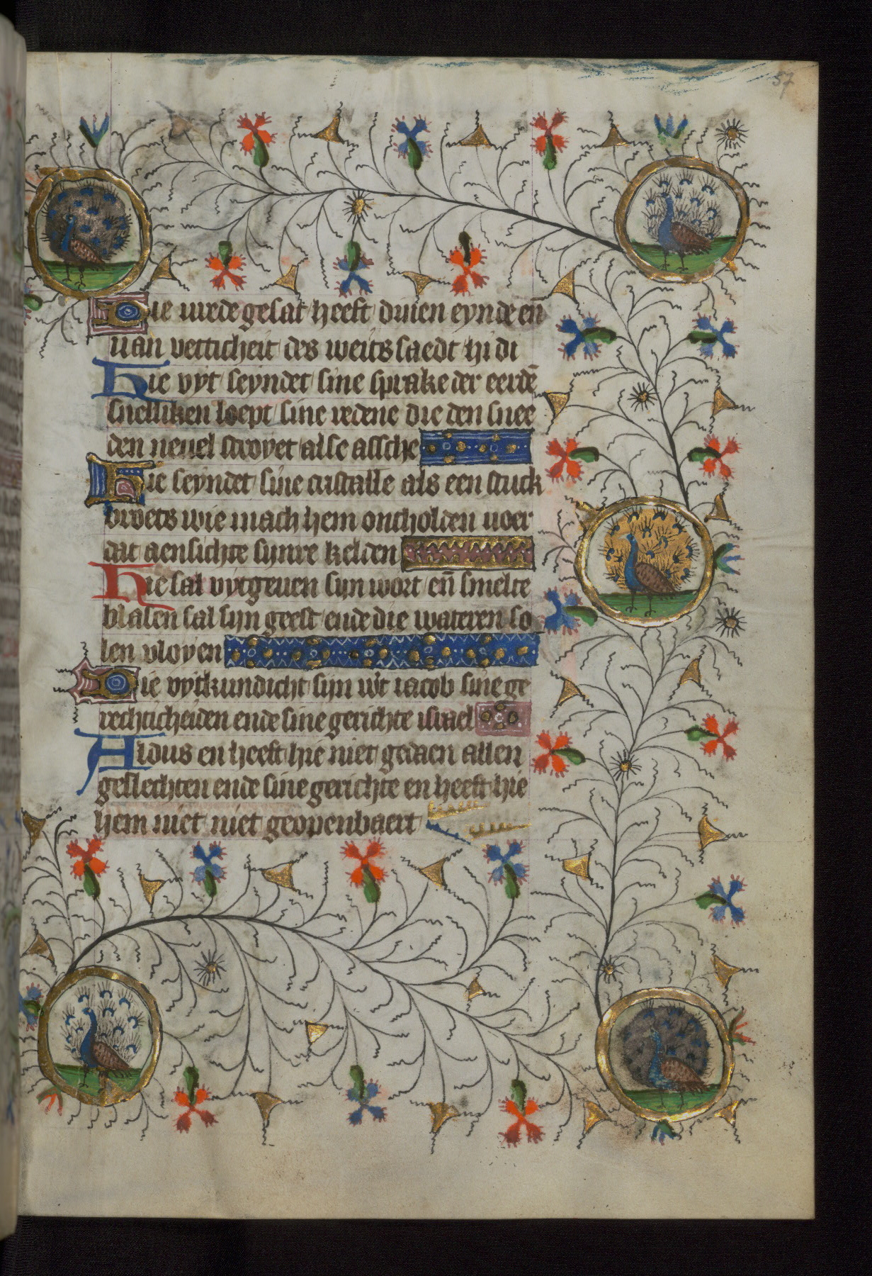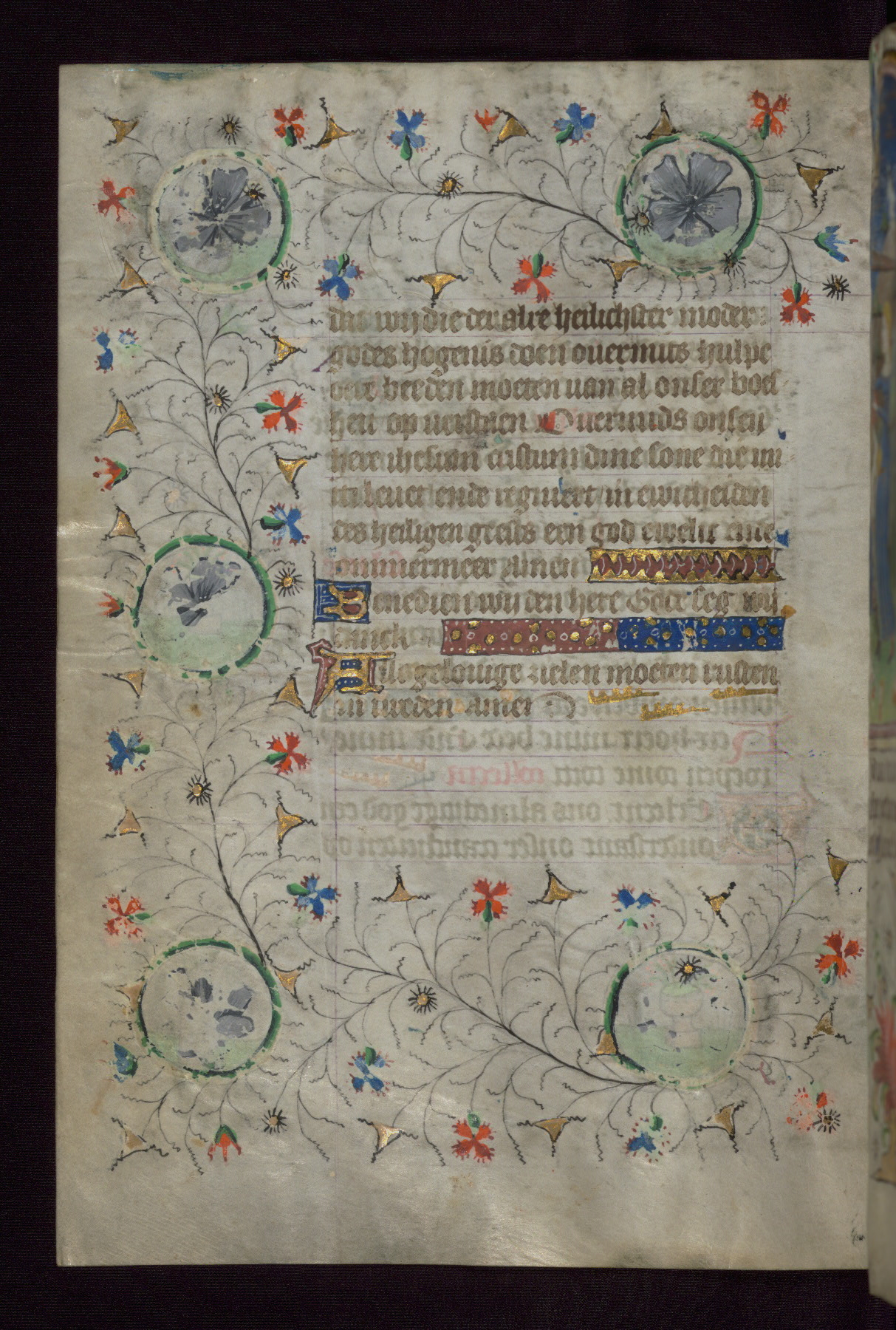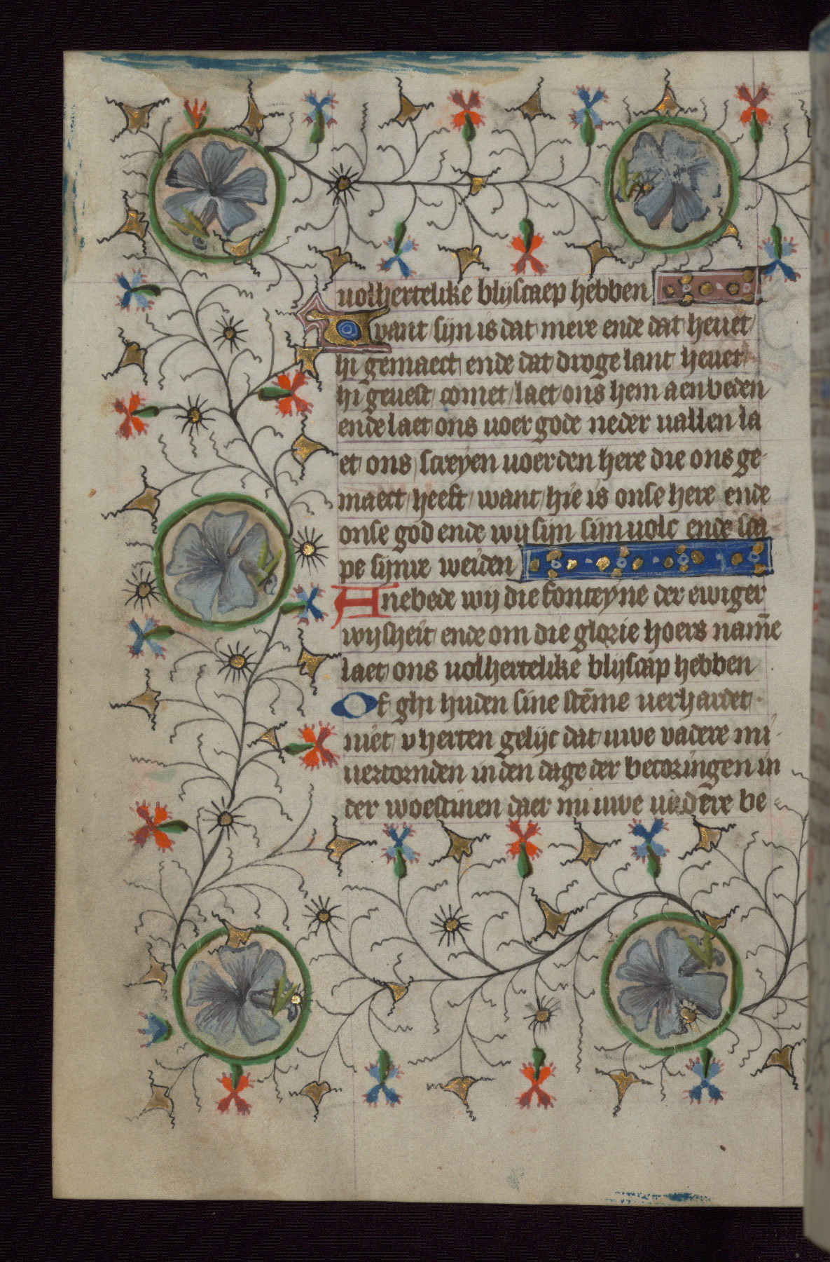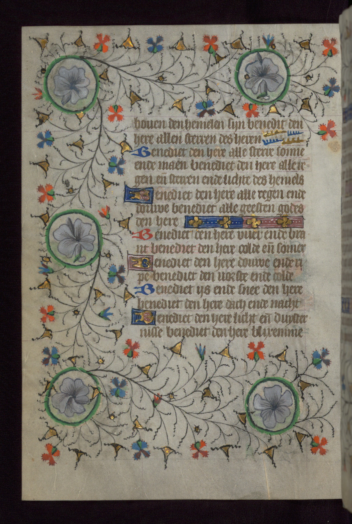 This book of hours was written in Dutch in the fifteenth century for the use of Utrecht. The Hours of the Virgin and of the Cross are accompanied here by the Dutch translation of Henry Suso's "Cursus aeternae sapientiae," a text that was particularly popular for private devotion in the Netherlands. Once owned by the English collector Lord Amherst, the manuscript is exceptional for its extensive illumination. Webs of foliage cover every margin, most sprouting medallions containing flora and fauna. The divisions in the text are marked by twenty richly painted full-page miniatures, often accompanied by related marginalia. Further illumination in the form of historiated and foliate initials marks minor breaks in the text, and the overall effect is a visual feast for the reader.