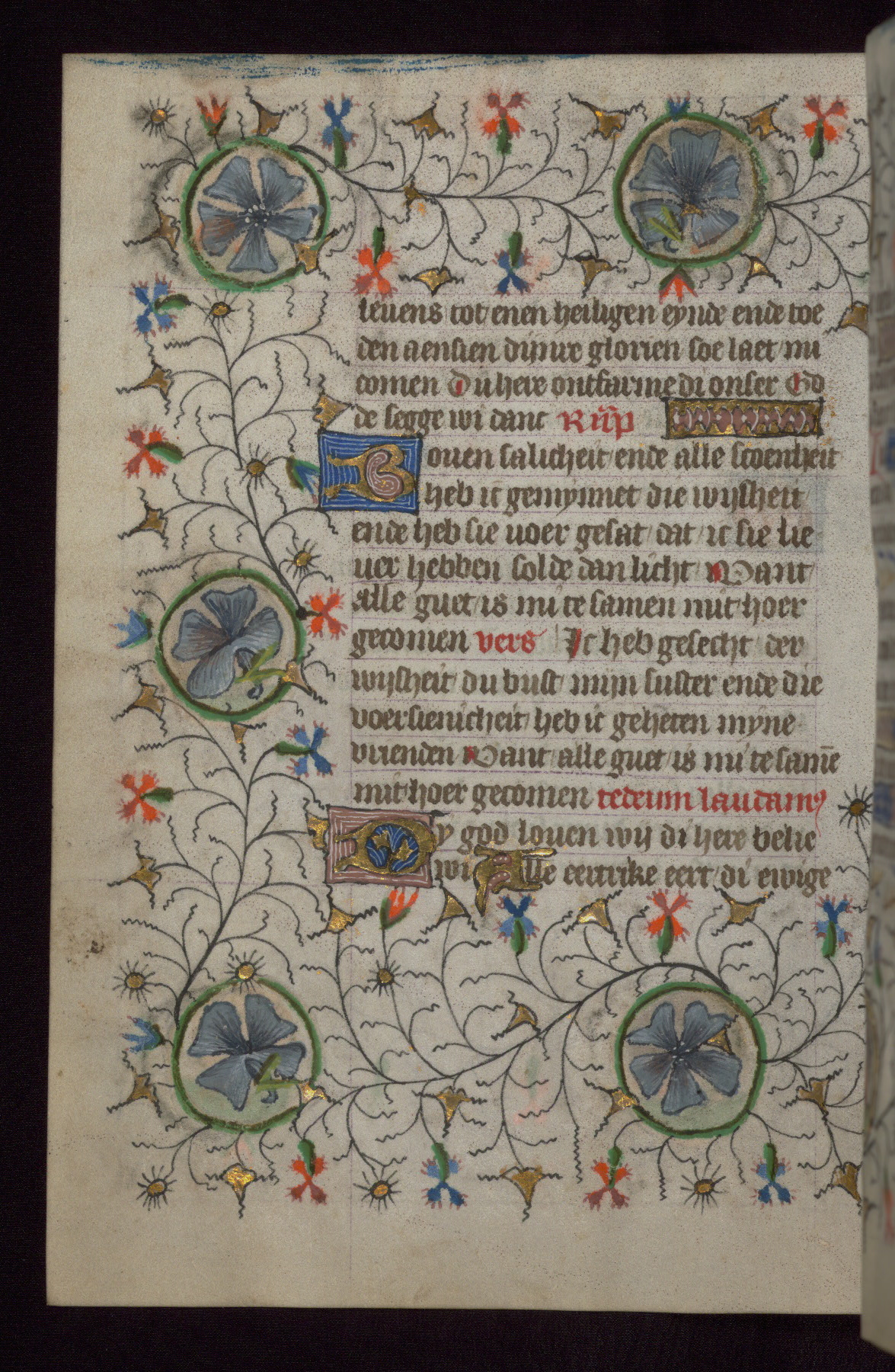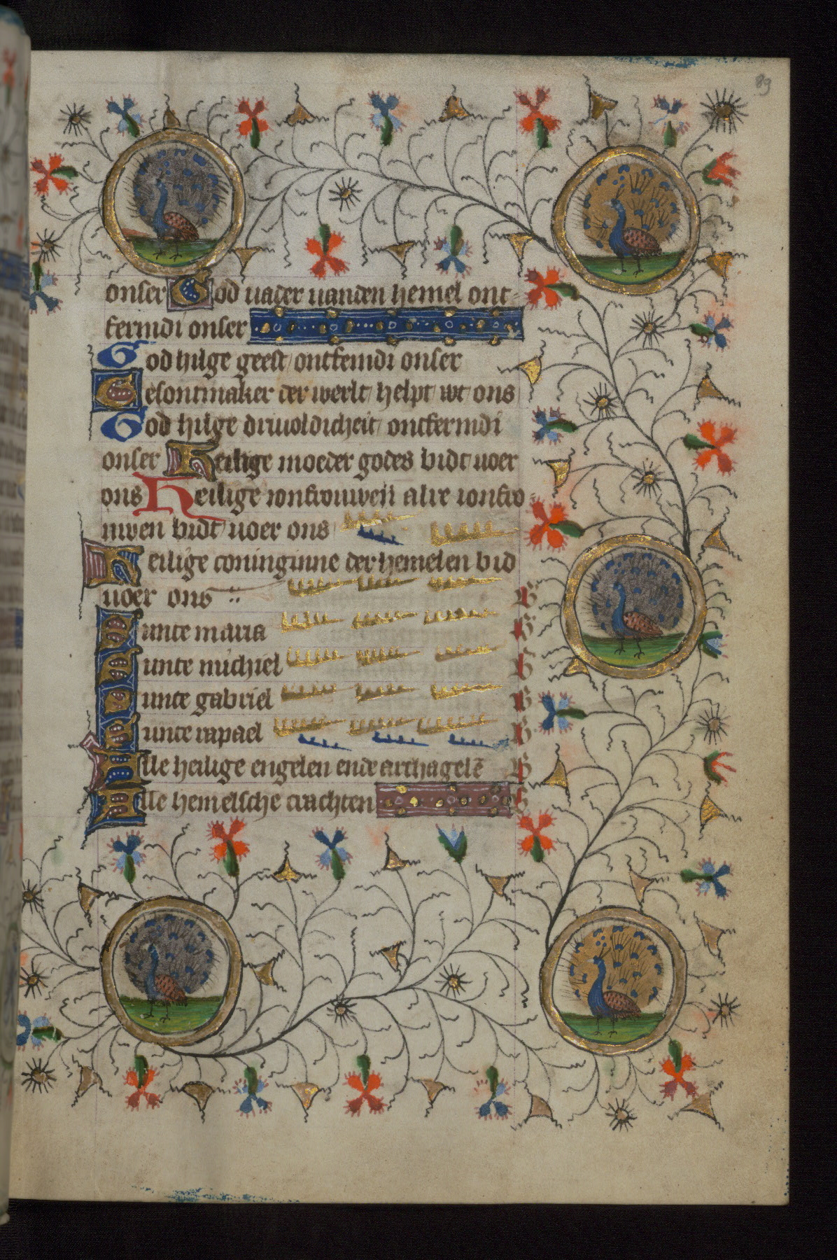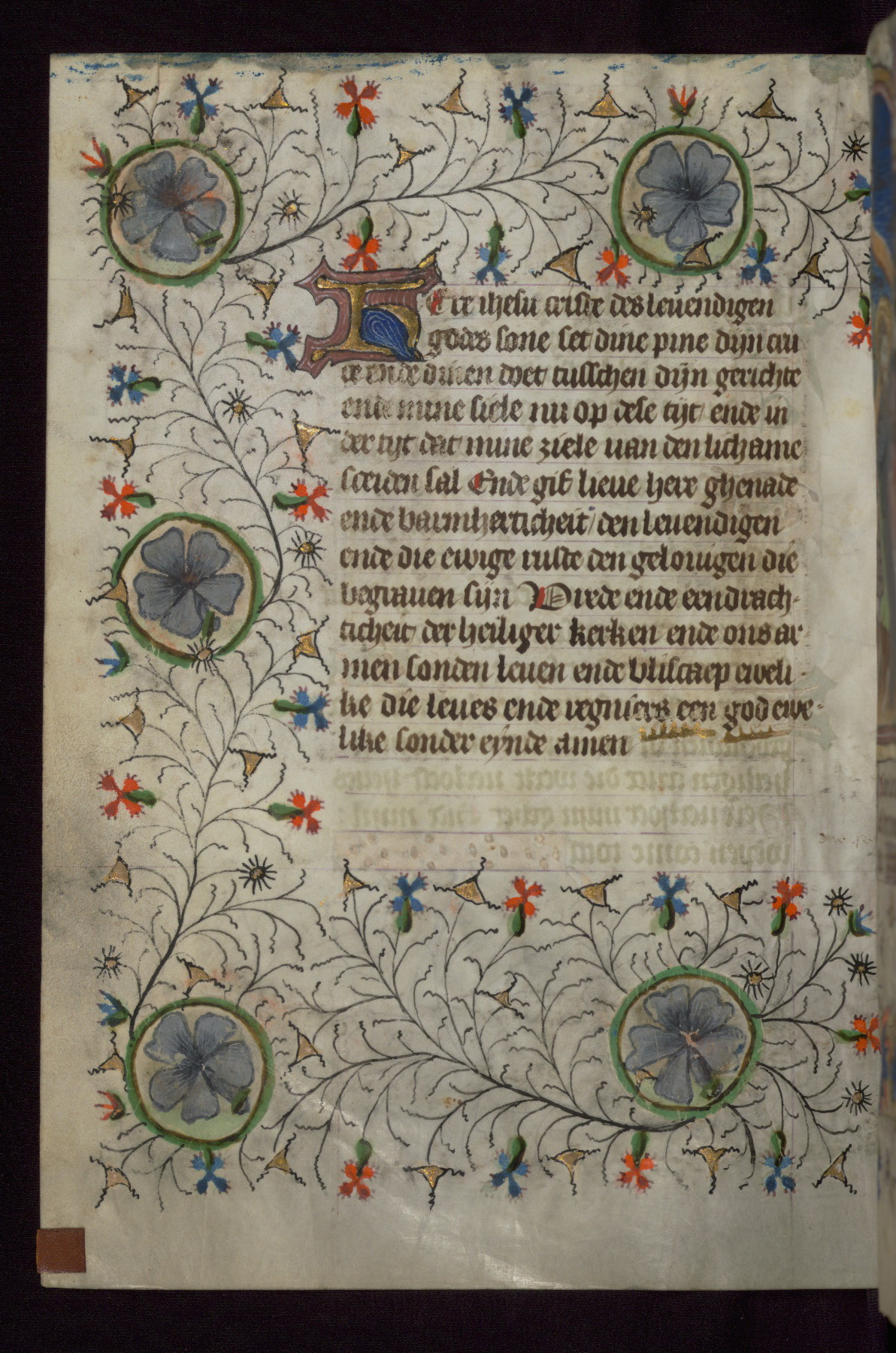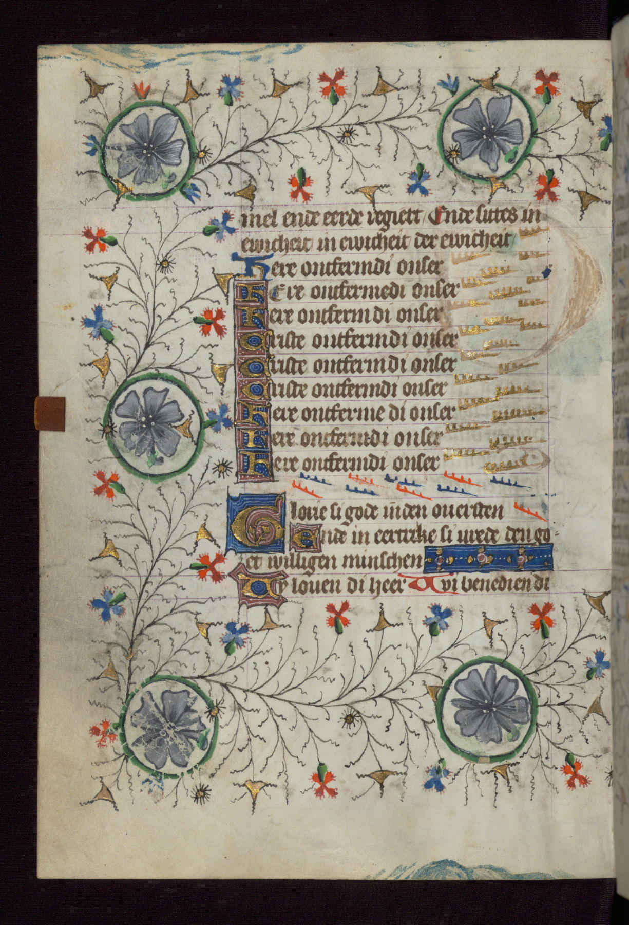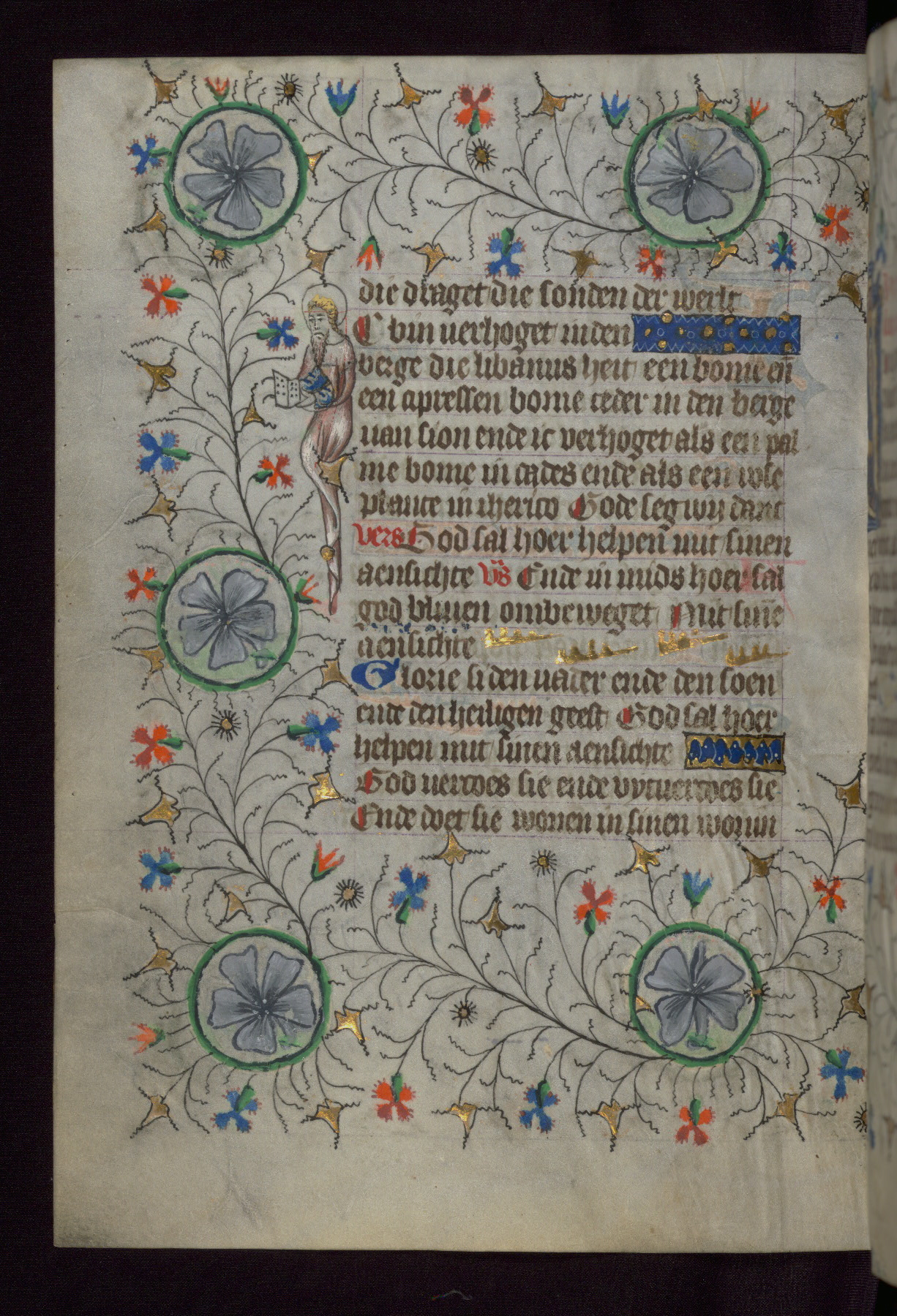 This book of hours was written in Dutch in the fifteenth century for the use of Utrecht. The Hours of the Virgin and of the Cross are accompanied here by the Dutch translation of Henry Suso's "Cursus aeternae sapientiae," a text that was particularly popular for private devotion in the Netherlands. Once owned by the English collector Lord Amherst, the manuscript is exceptional for its extensive illumination. Webs of foliage cover every margin, most sprouting medallions containing flora and fauna. The divisions in the text are marked by twenty richly painted full-page miniatures, often accompanied by related marginalia. Further illumination in the form of historiated and foliate initials marks minor breaks in the text, and the overall effect is a visual feast for the reader.
