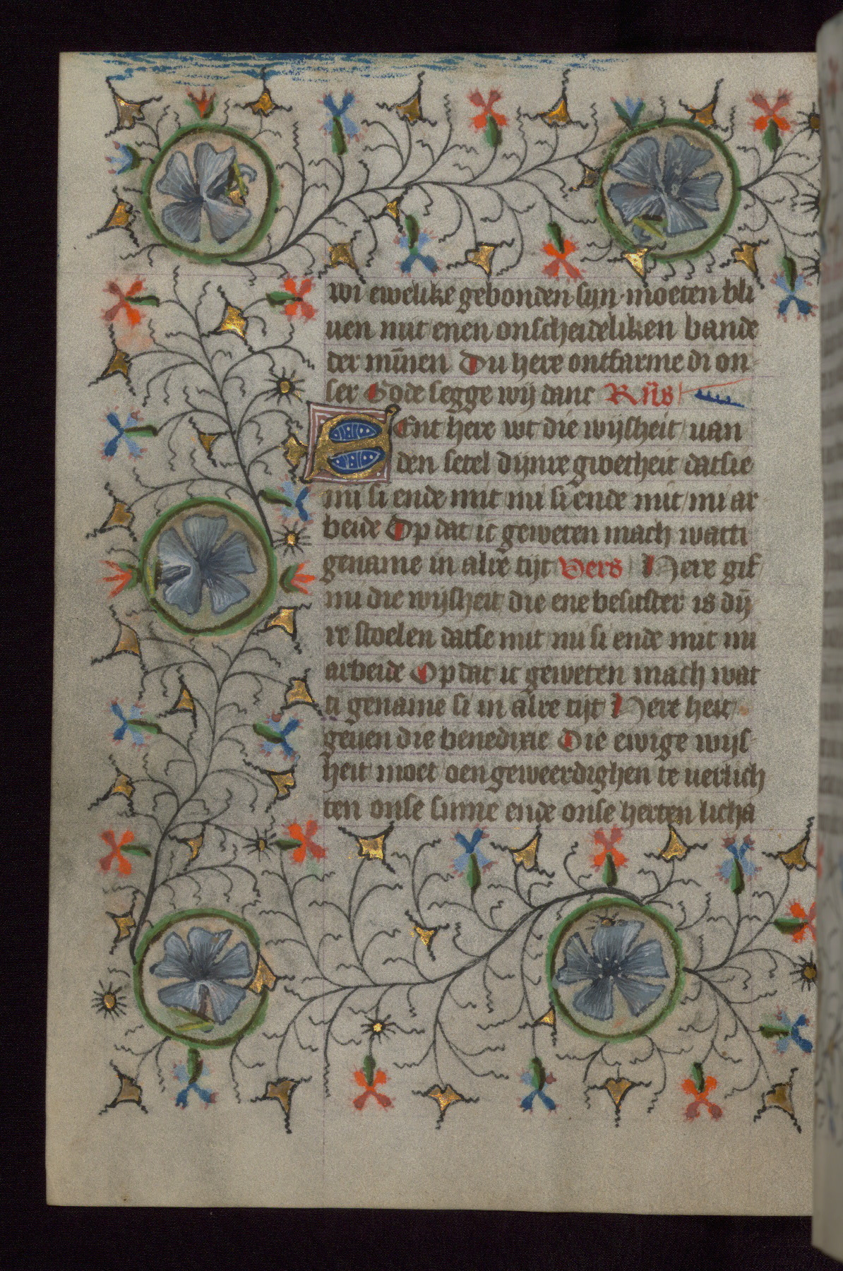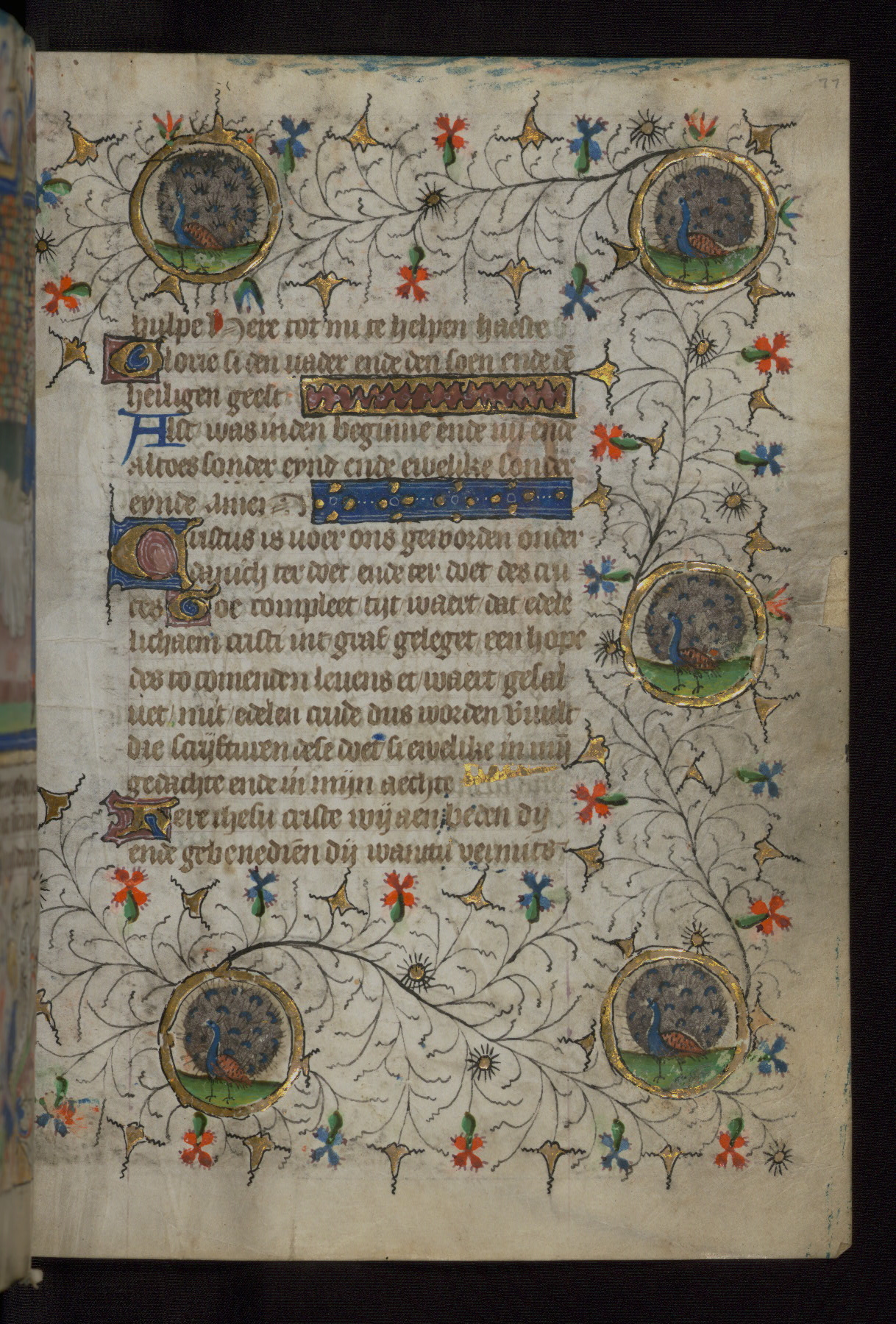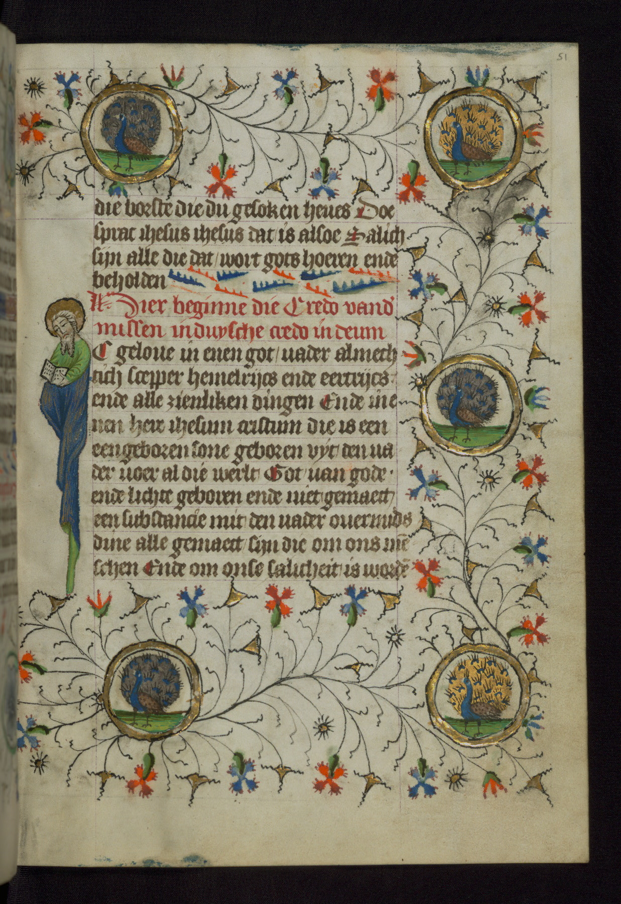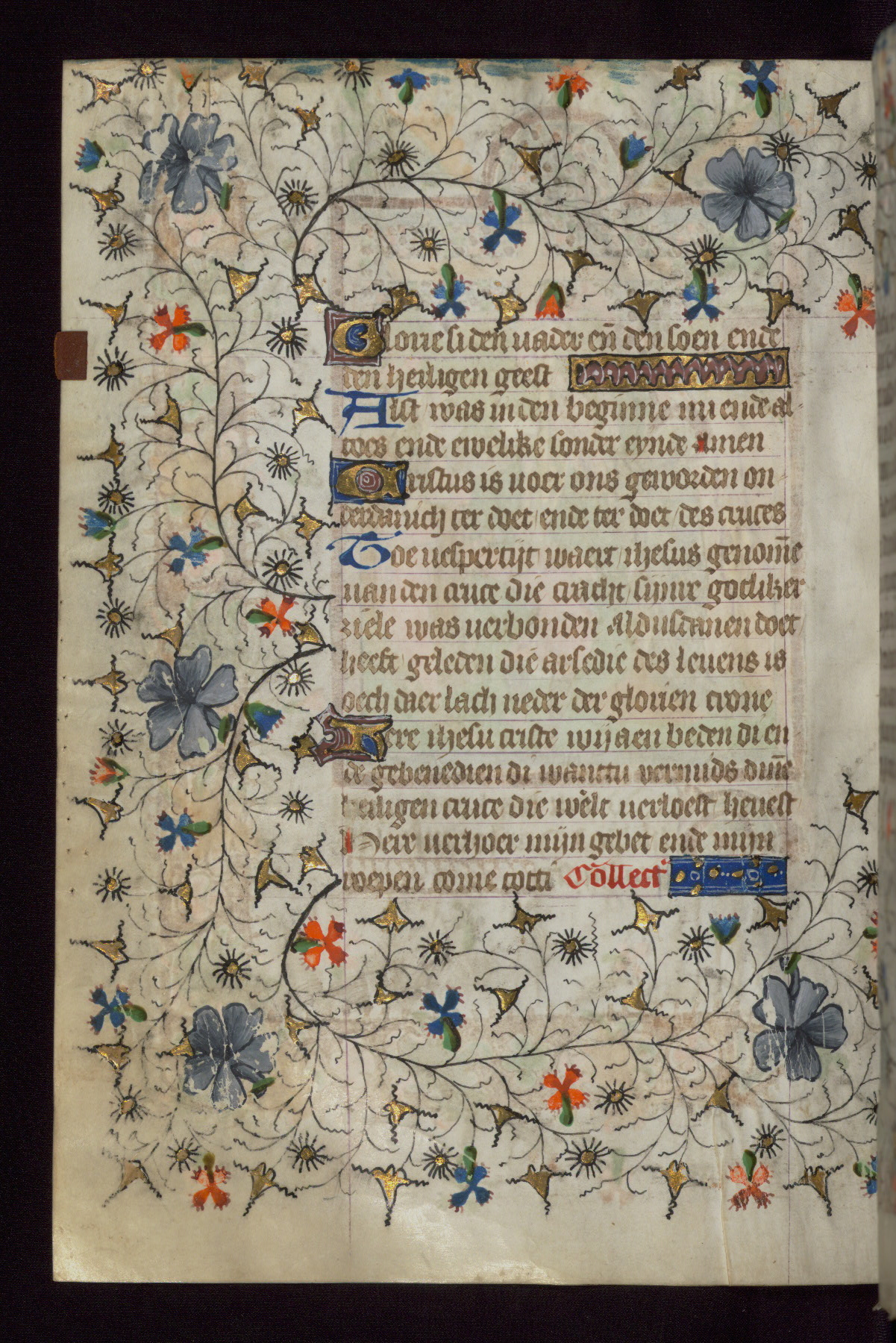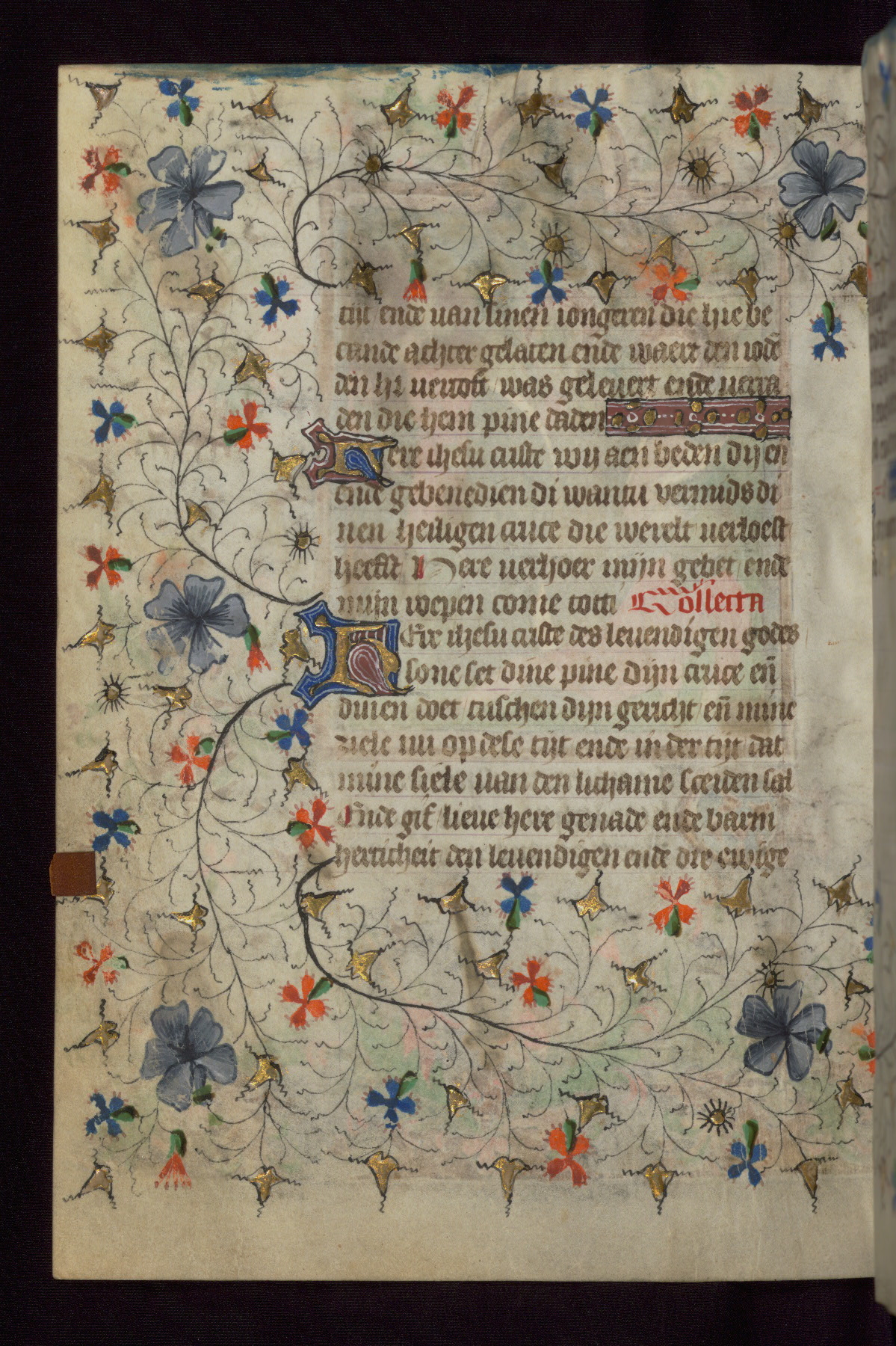 This book of hours was written in Dutch in the fifteenth century for the use of Utrecht. The Hours of the Virgin and of the Cross are accompanied here by the Dutch translation of Henry Suso's "Cursus aeternae sapientiae," a text that was particularly popular for private devotion in the Netherlands. Once owned by the English collector Lord Amherst, the manuscript is exceptional for its extensive illumination. Webs of foliage cover every margin, most sprouting medallions containing flora and fauna. The divisions in the text are marked by twenty richly painted full-page miniatures, often accompanied by related marginalia. Further illumination in the form of historiated and foliate initials marks minor breaks in the text, and the overall effect is a visual feast for the reader.