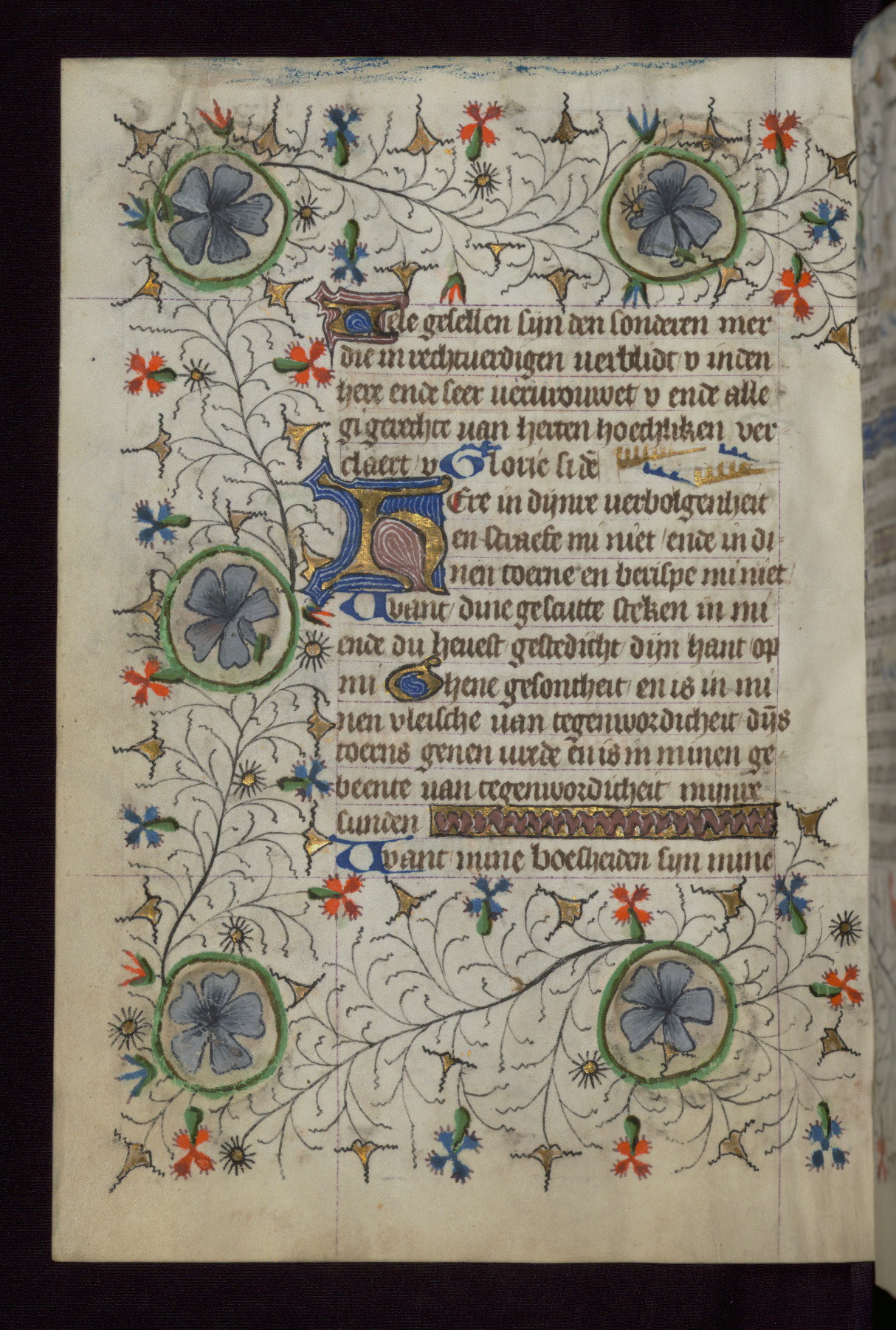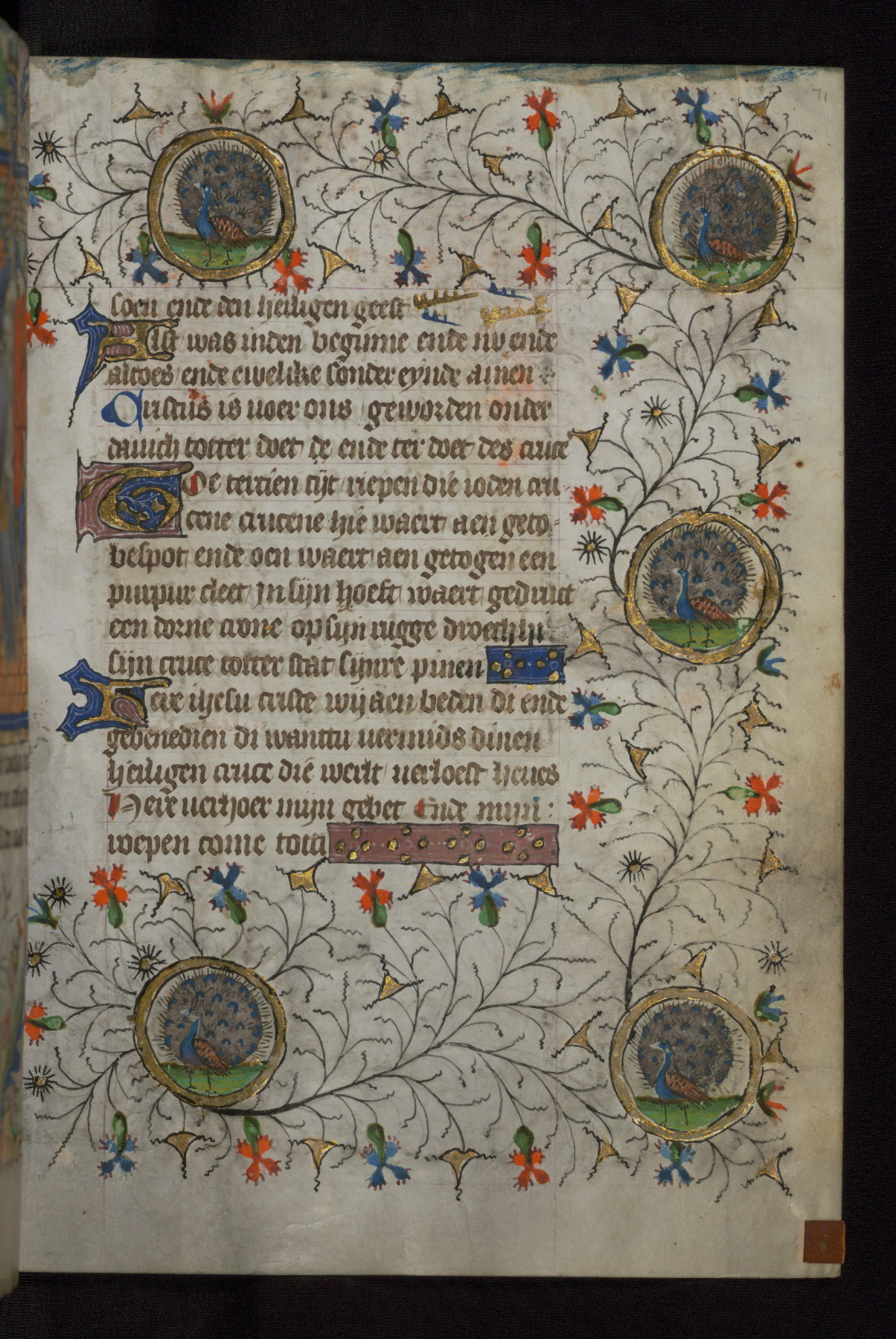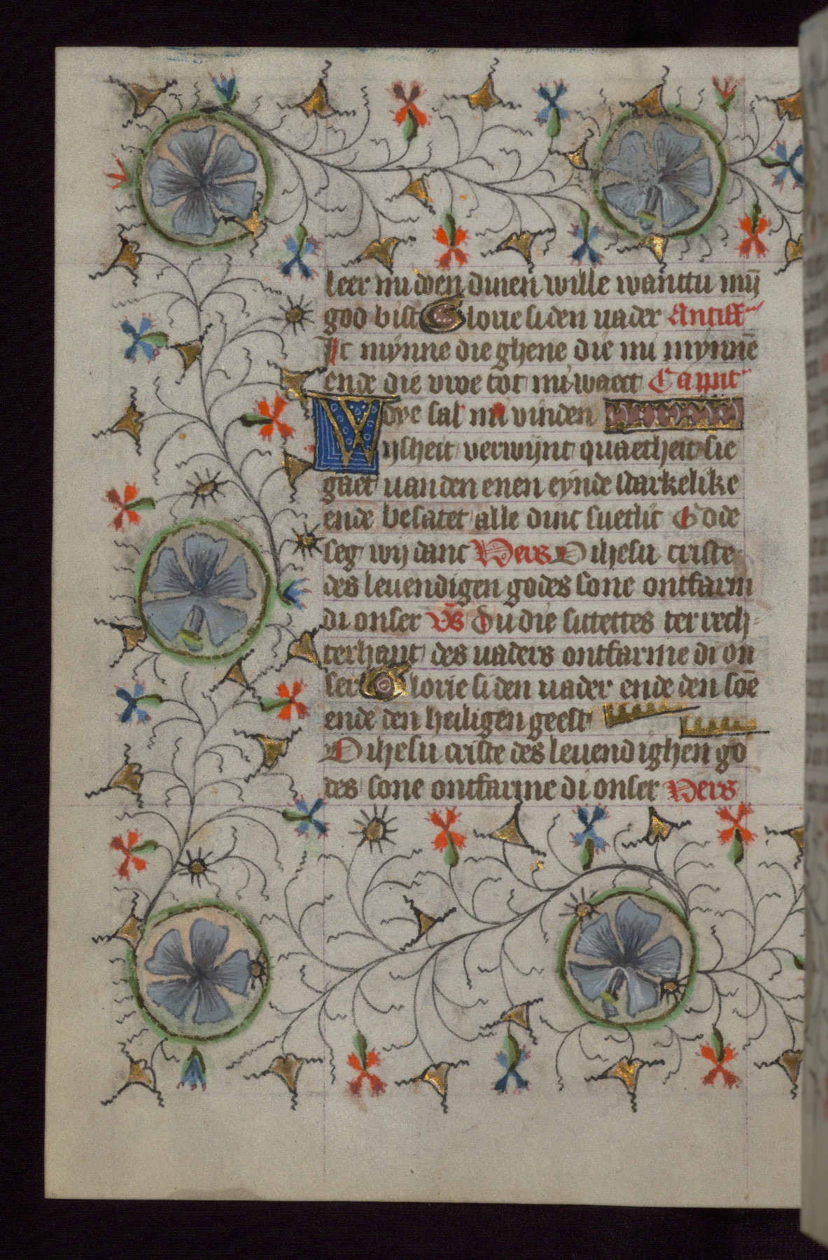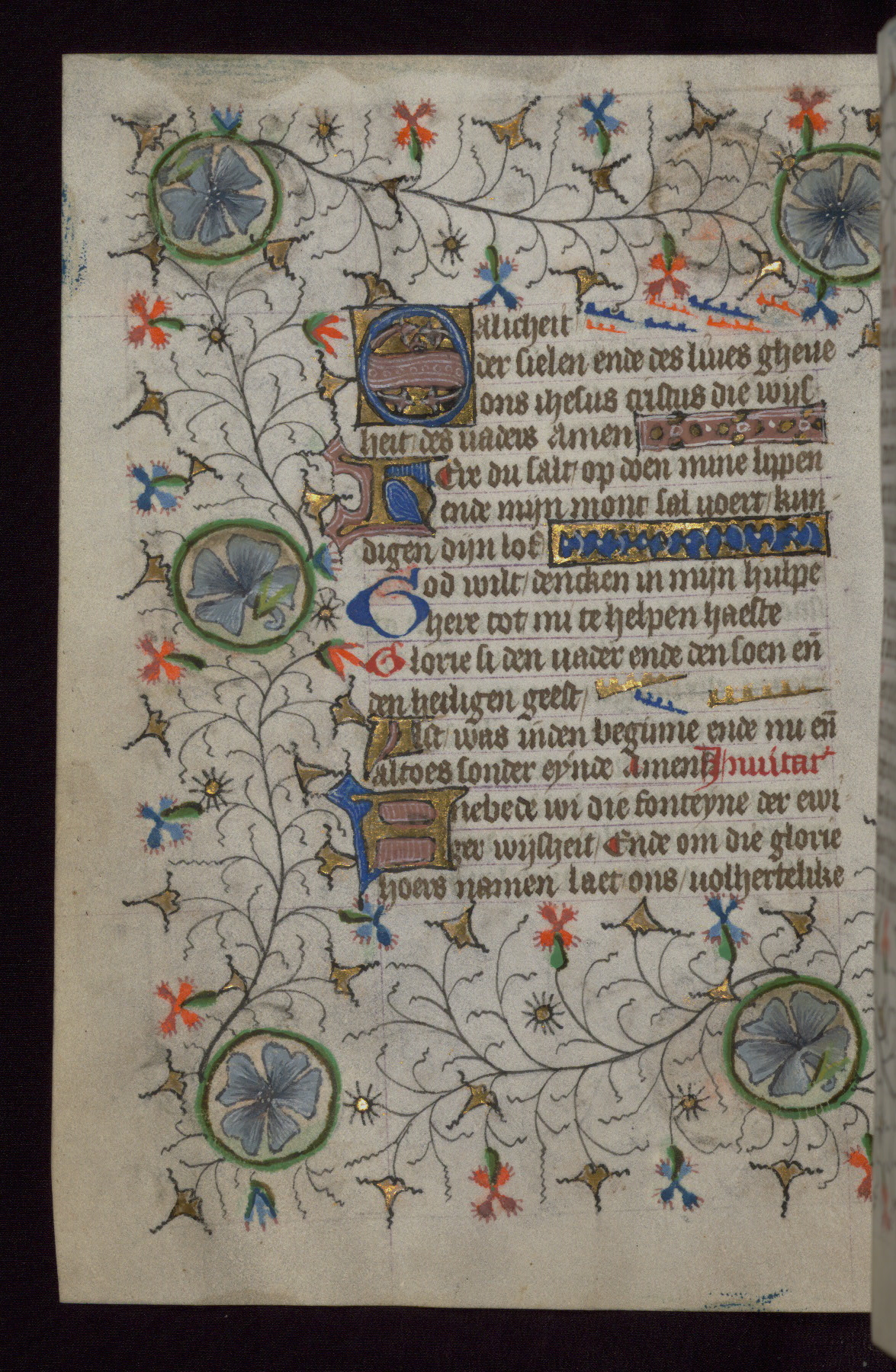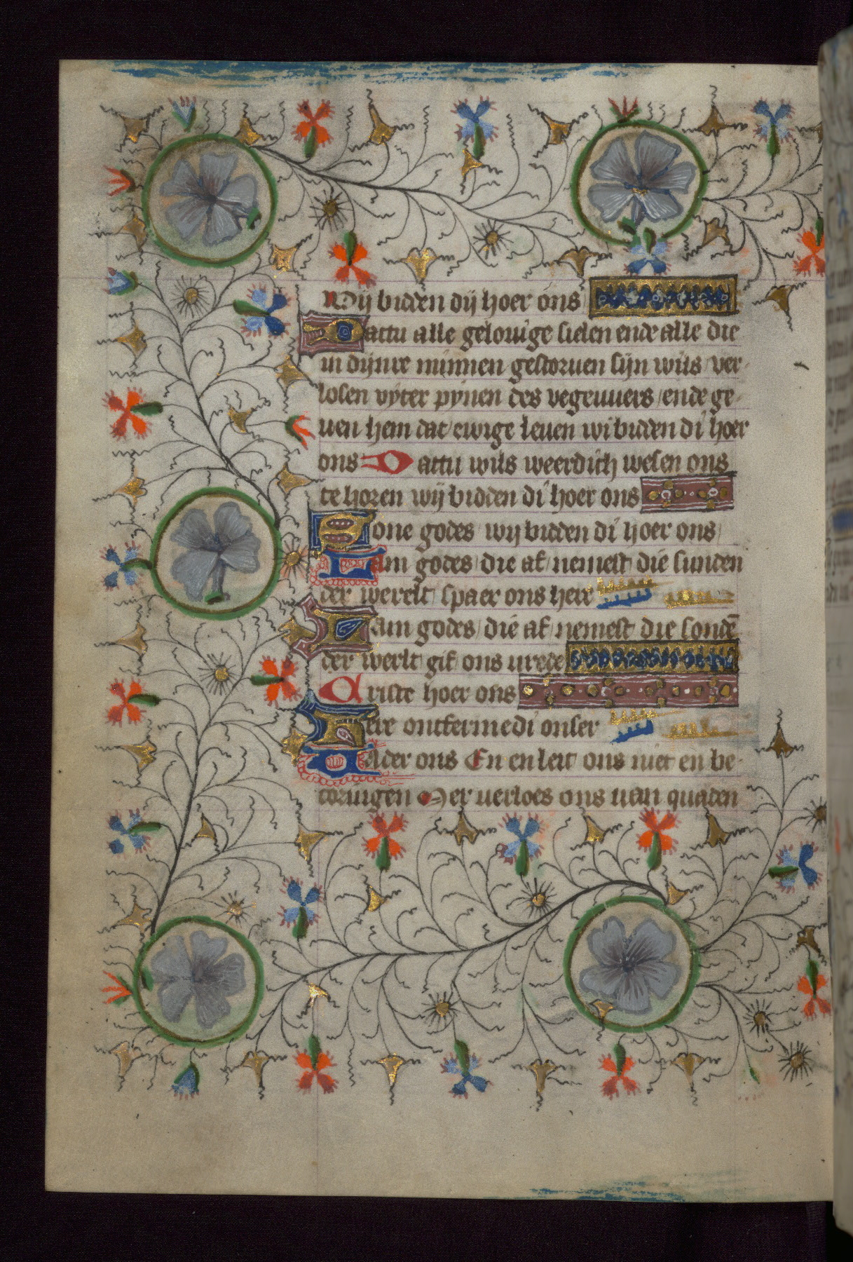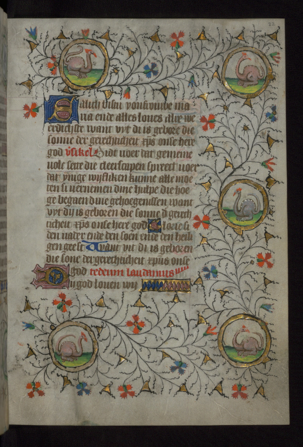 This book of hours was written in Dutch in the fifteenth century for the use of Utrecht. The Hours of the Virgin and of the Cross are accompanied here by the Dutch translation of Henry Suso's "Cursus aeternae sapientiae," a text that was particularly popular for private devotion in the Netherlands. Once owned by the English collector Lord Amherst, the manuscript is exceptional for its extensive illumination. Webs of foliage cover every margin, most sprouting medallions containing flora and fauna. The divisions in the text are marked by twenty richly painted full-page miniatures, often accompanied by related marginalia. Further illumination in the form of historiated and foliate initials marks minor breaks in the text, and the overall effect is a visual feast for the reader.