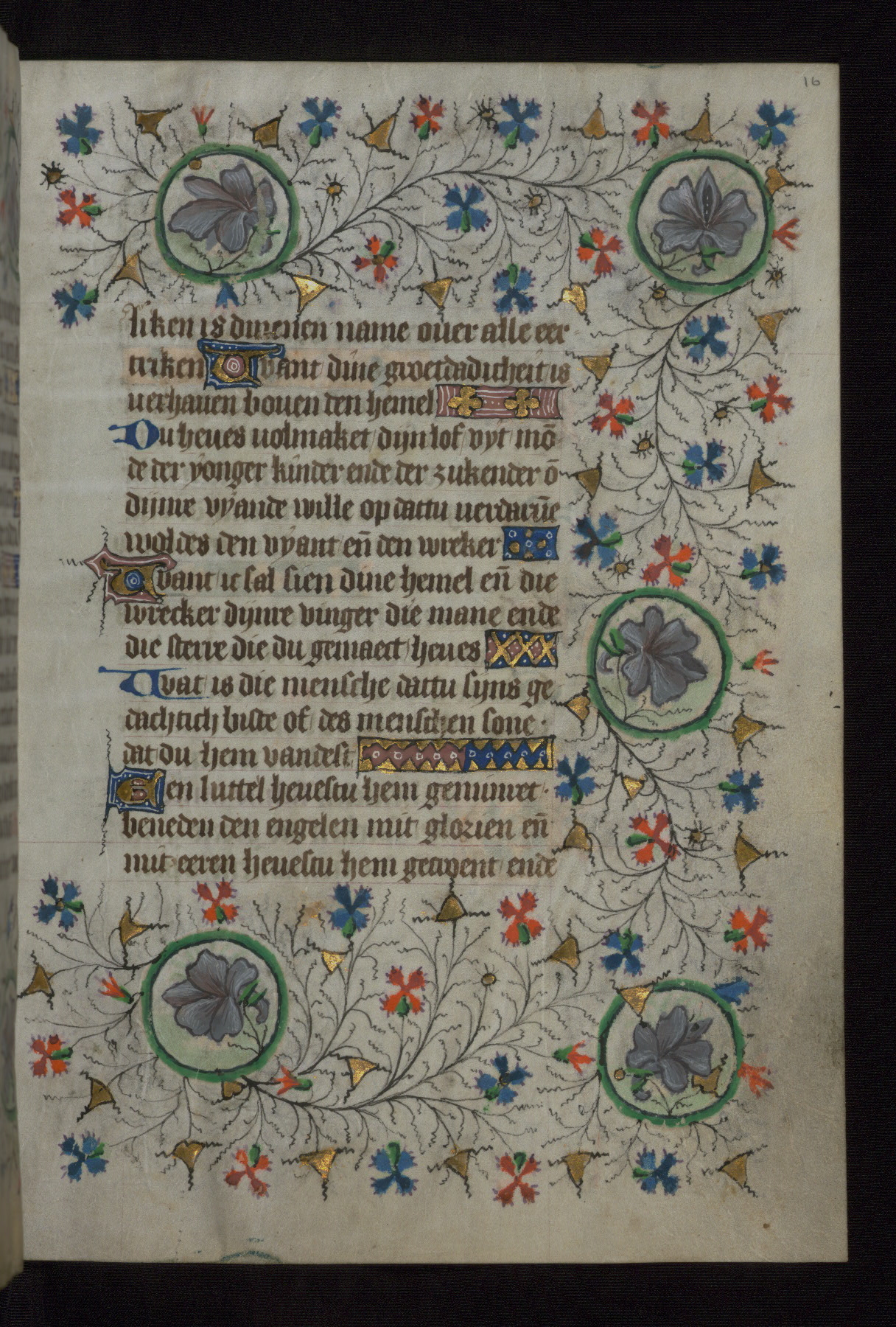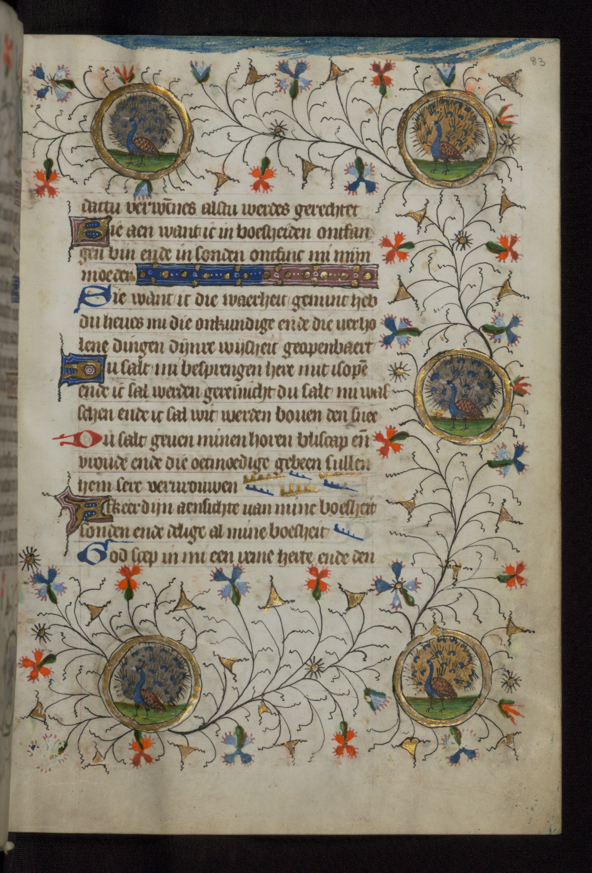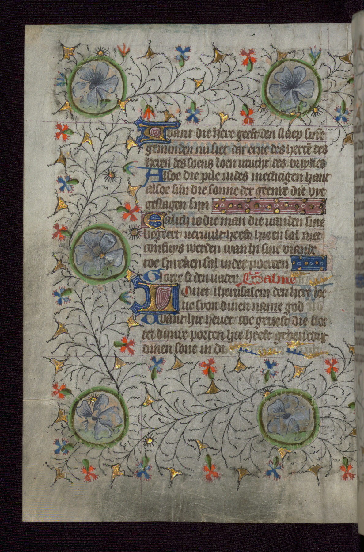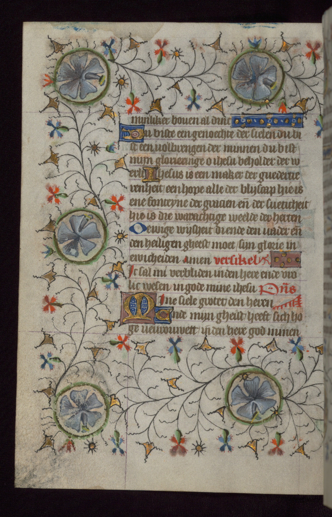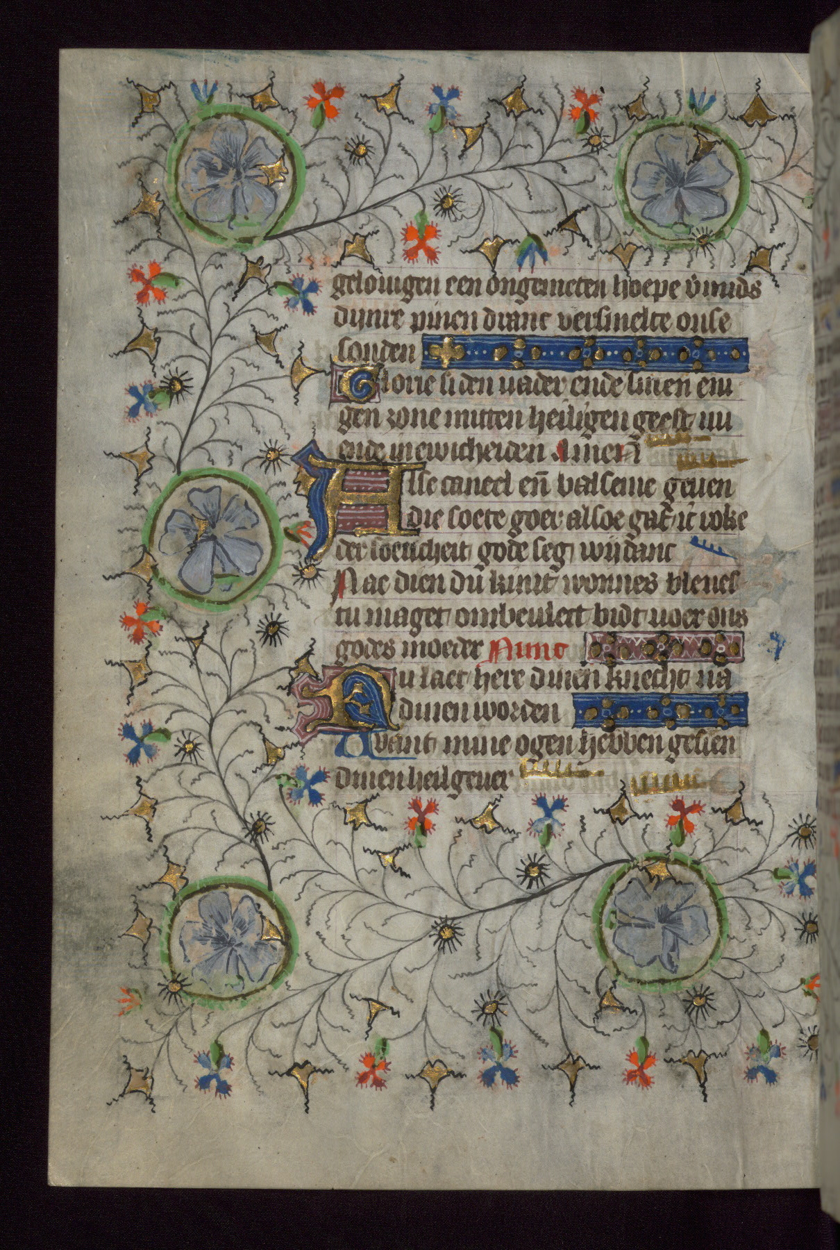 This book of hours was written in Dutch in the fifteenth century for the use of Utrecht. The Hours of the Virgin and of the Cross are accompanied here by the Dutch translation of Henry Suso's "Cursus aeternae sapientiae," a text that was particularly popular for private devotion in the Netherlands. Once owned by the English collector Lord Amherst, the manuscript is exceptional for its extensive illumination. Webs of foliage cover every margin, most sprouting medallions containing flora and fauna. The divisions in the text are marked by twenty richly painted full-page miniatures, often accompanied by related marginalia. Further illumination in the form of historiated and foliate initials marks minor breaks in the text, and the overall effect is a visual feast for the reader.