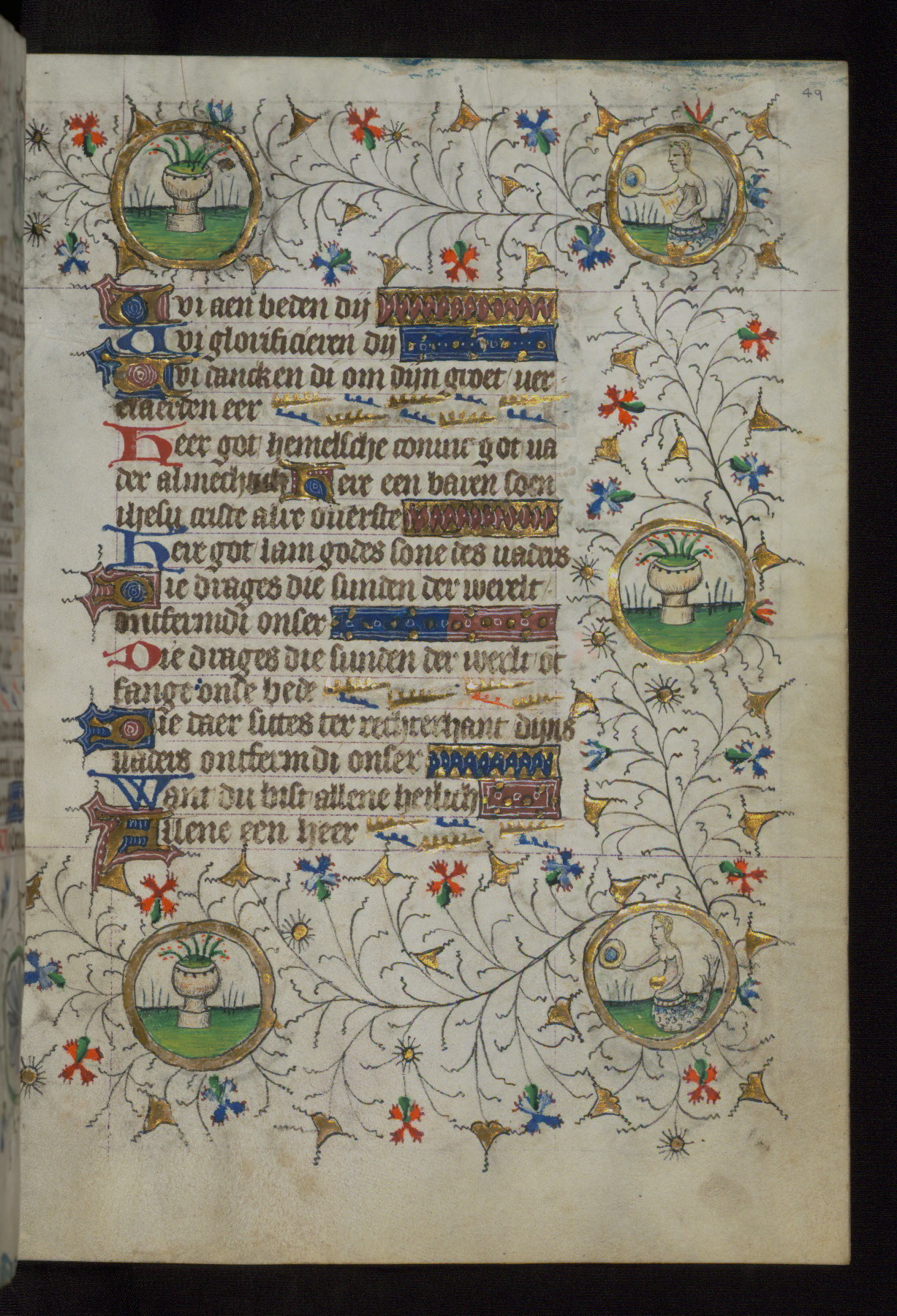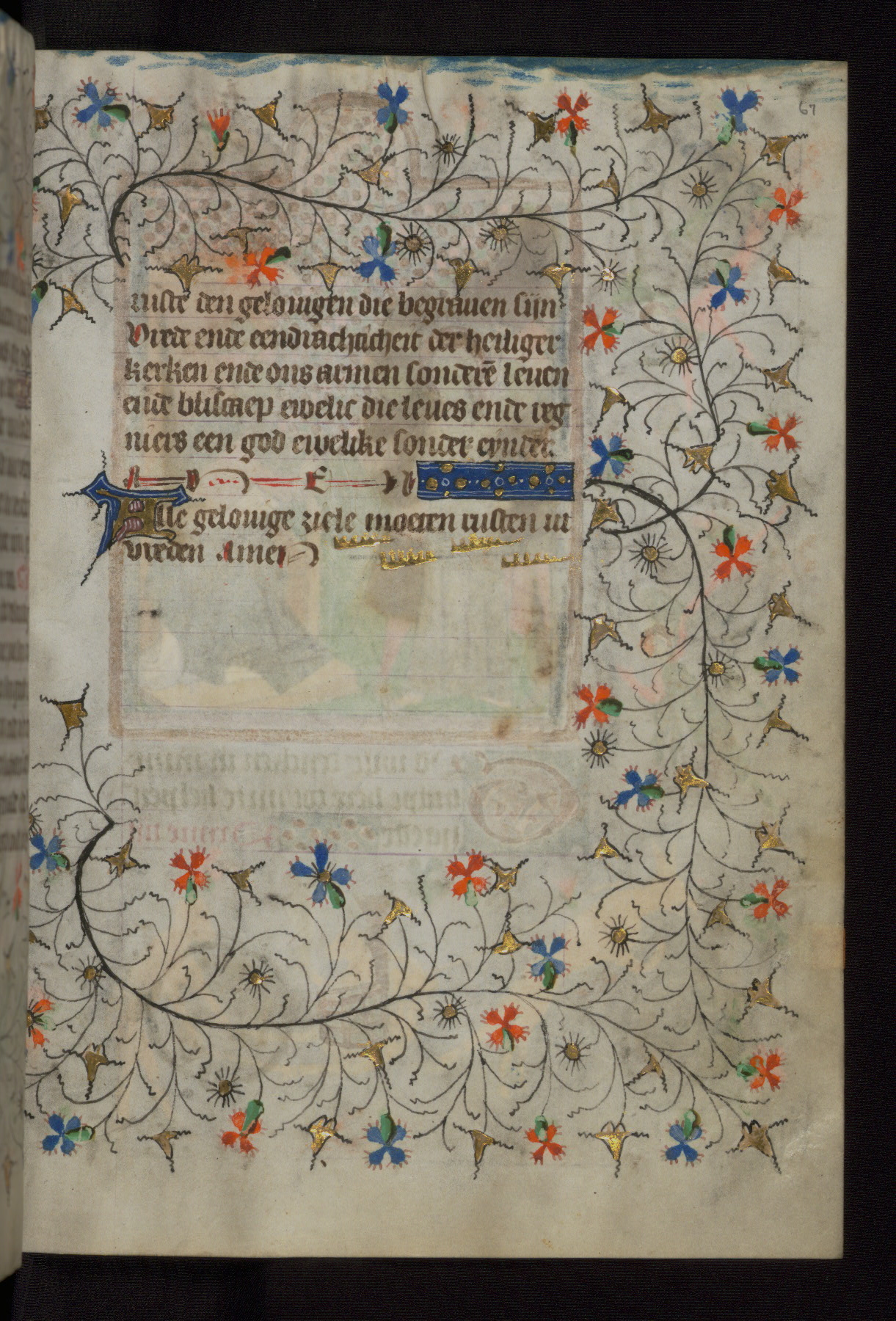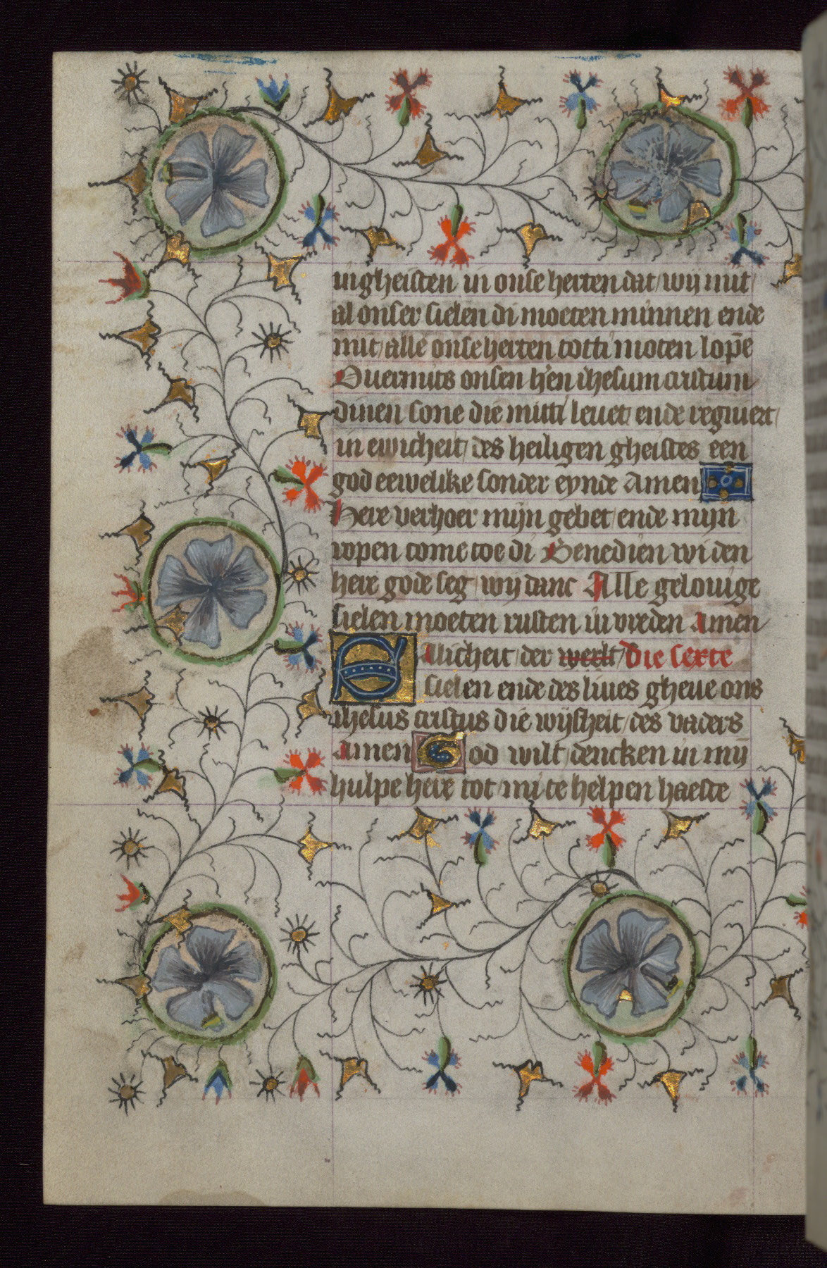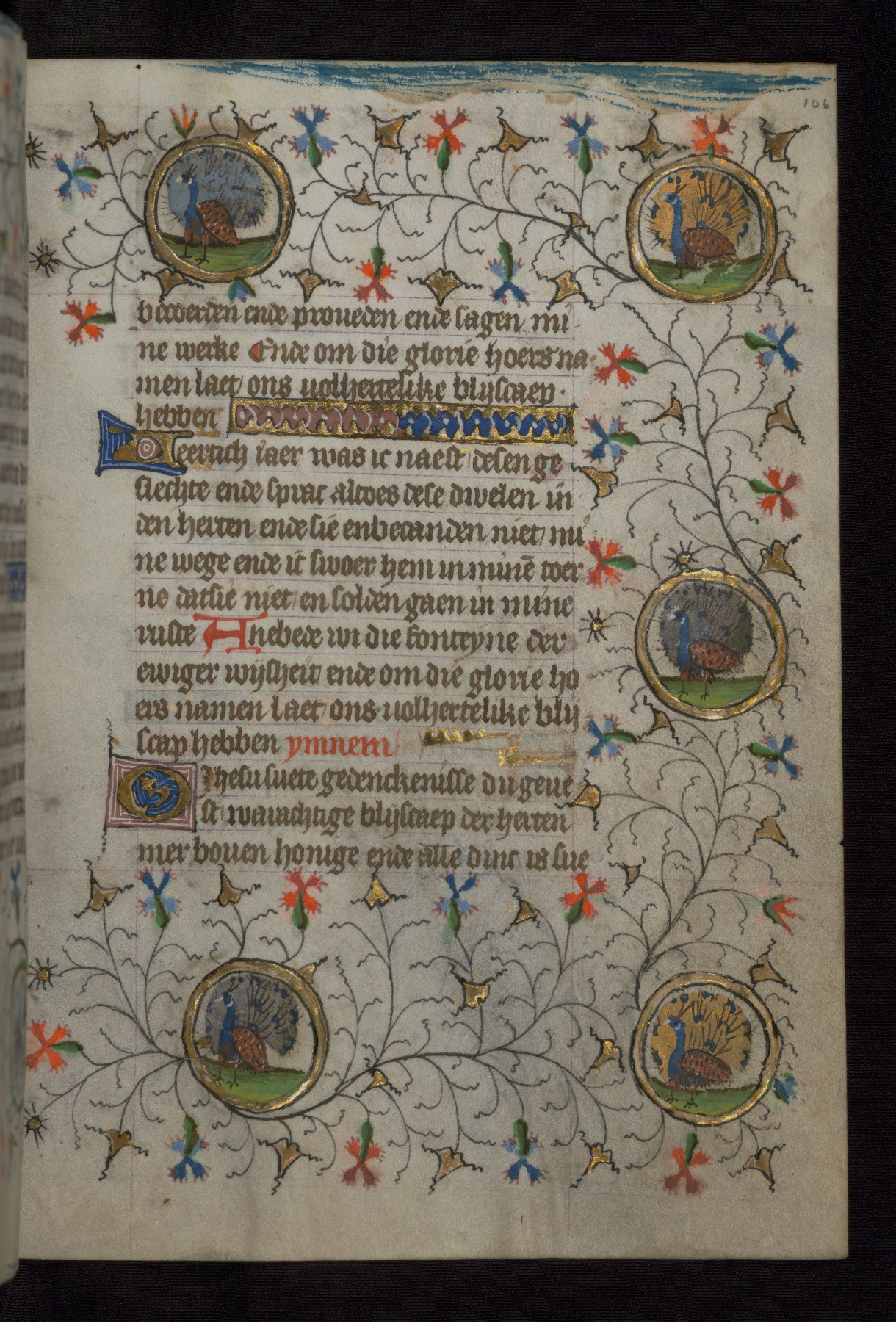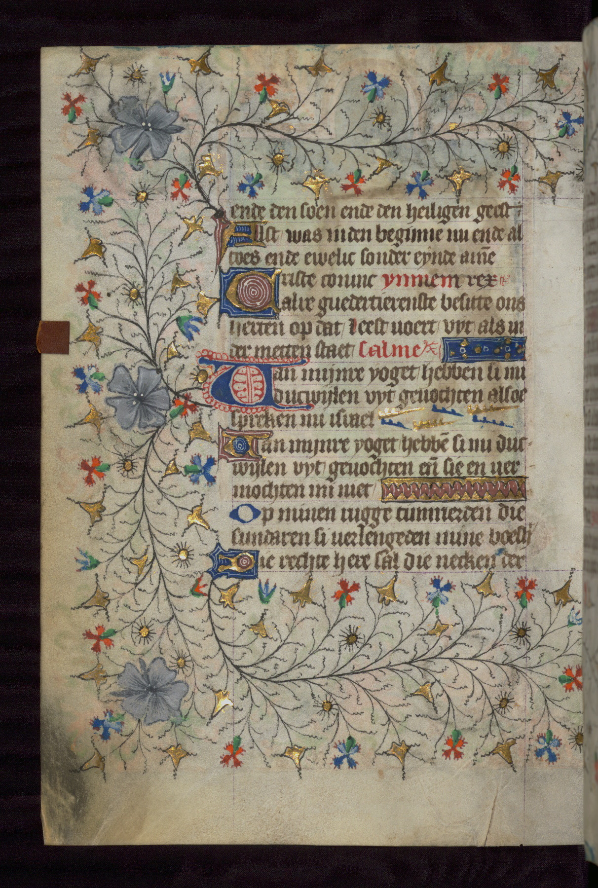 This book of hours was written in Dutch in the fifteenth century for the use of Utrecht. The Hours of the Virgin and of the Cross are accompanied here by the Dutch translation of Henry Suso's "Cursus aeternae sapientiae," a text that was particularly popular for private devotion in the Netherlands. Once owned by the English collector Lord Amherst, the manuscript is exceptional for its extensive illumination. Webs of foliage cover every margin, most sprouting medallions containing flora and fauna. The divisions in the text are marked by twenty richly painted full-page miniatures, often accompanied by related marginalia. Further illumination in the form of historiated and foliate initials marks minor breaks in the text, and the overall effect is a visual feast for the reader.