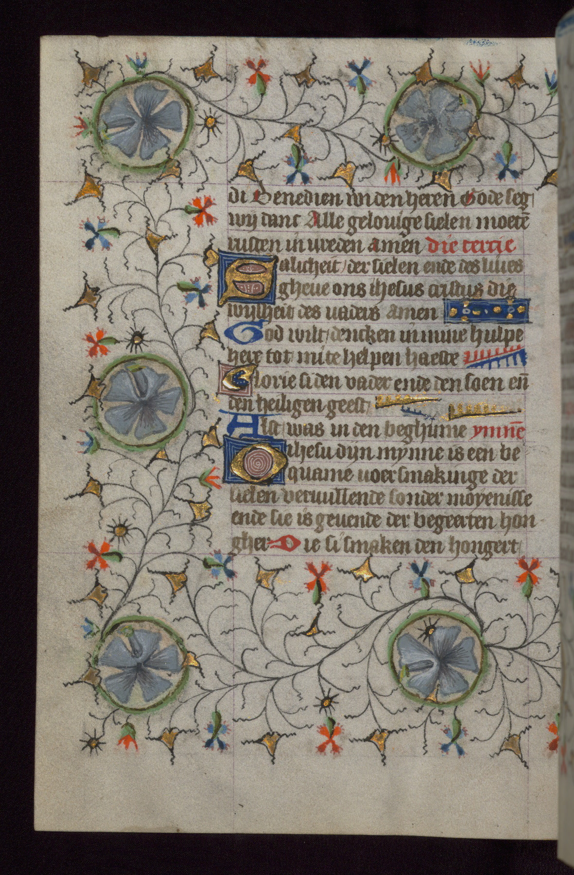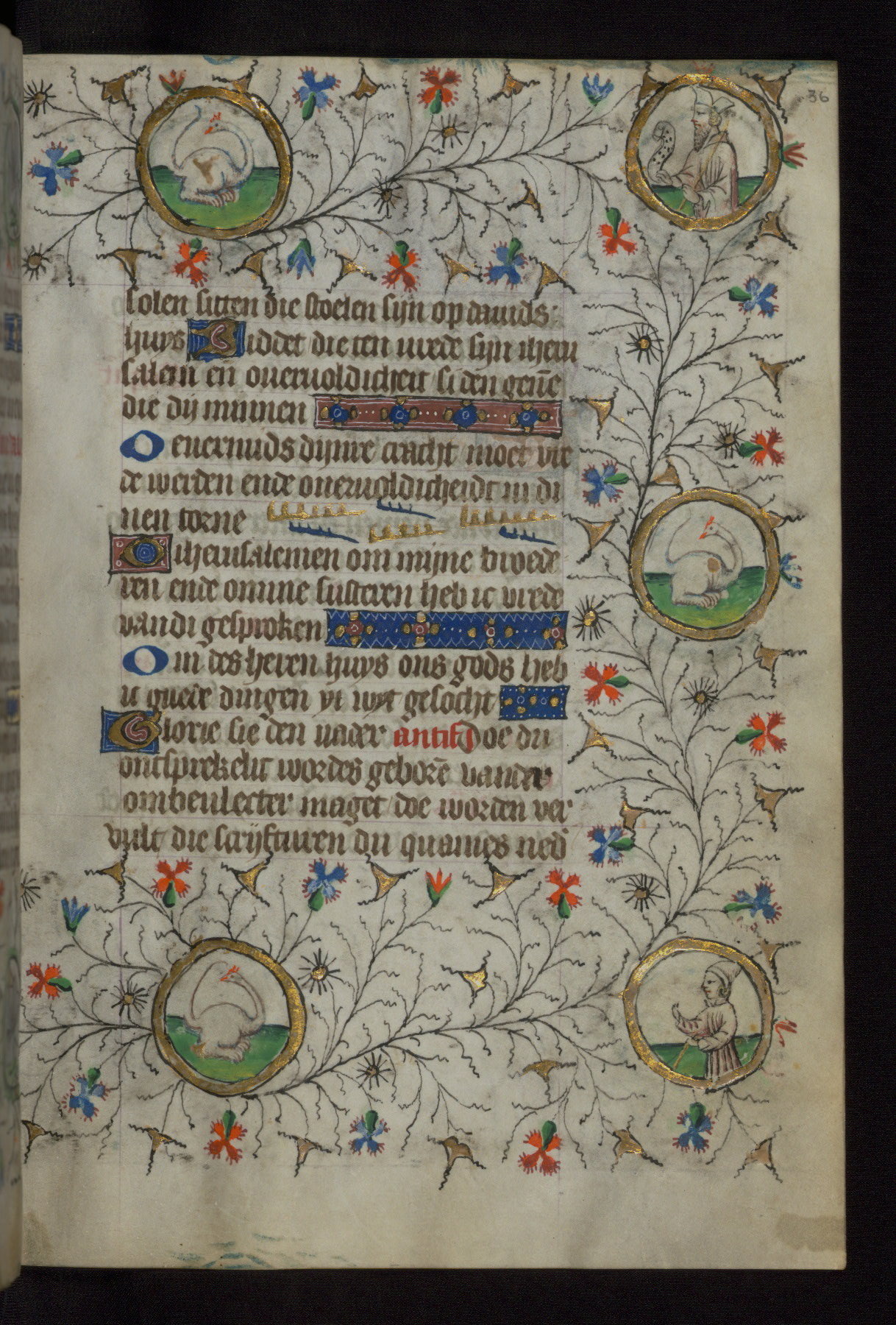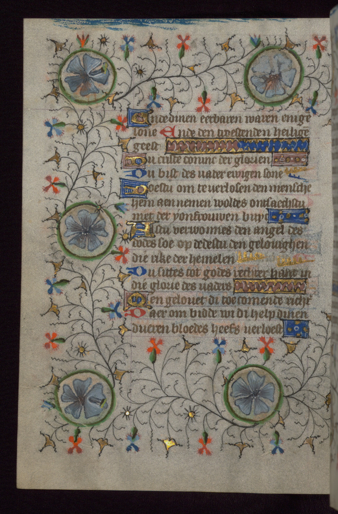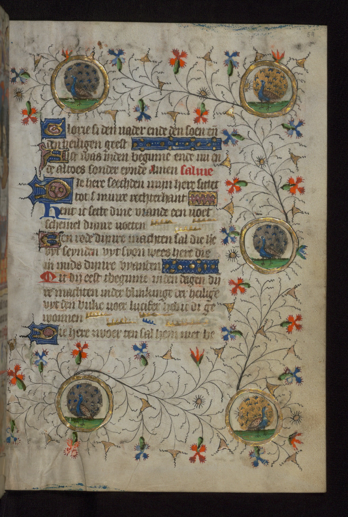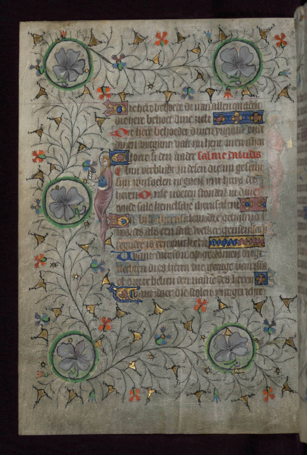 This book of hours was written in Dutch in the fifteenth century for the use of Utrecht. The Hours of the Virgin and of the Cross are accompanied here by the Dutch translation of Henry Suso's "Cursus aeternae sapientiae," a text that was particularly popular for private devotion in the Netherlands. Once owned by the English collector Lord Amherst, the manuscript is exceptional for its extensive illumination. Webs of foliage cover every margin, most sprouting medallions containing flora and fauna. The divisions in the text are marked by twenty richly painted full-page miniatures, often accompanied by related marginalia. Further illumination in the form of historiated and foliate initials marks minor breaks in the text, and the overall effect is a visual feast for the reader.