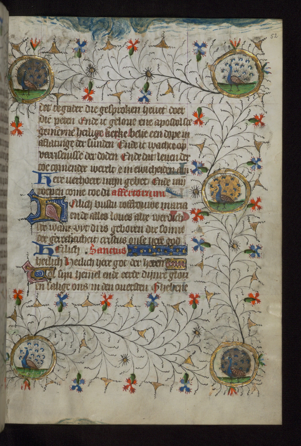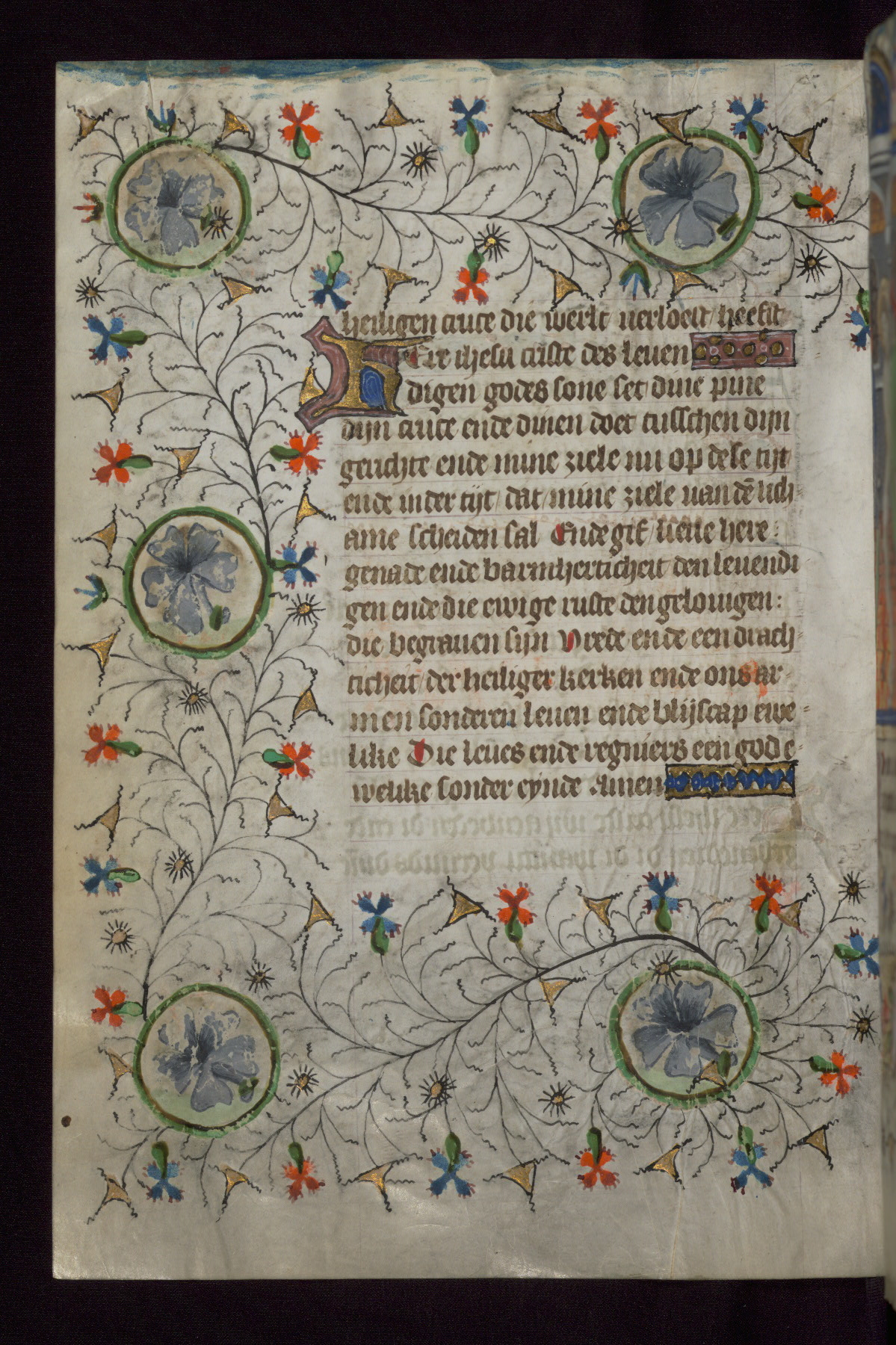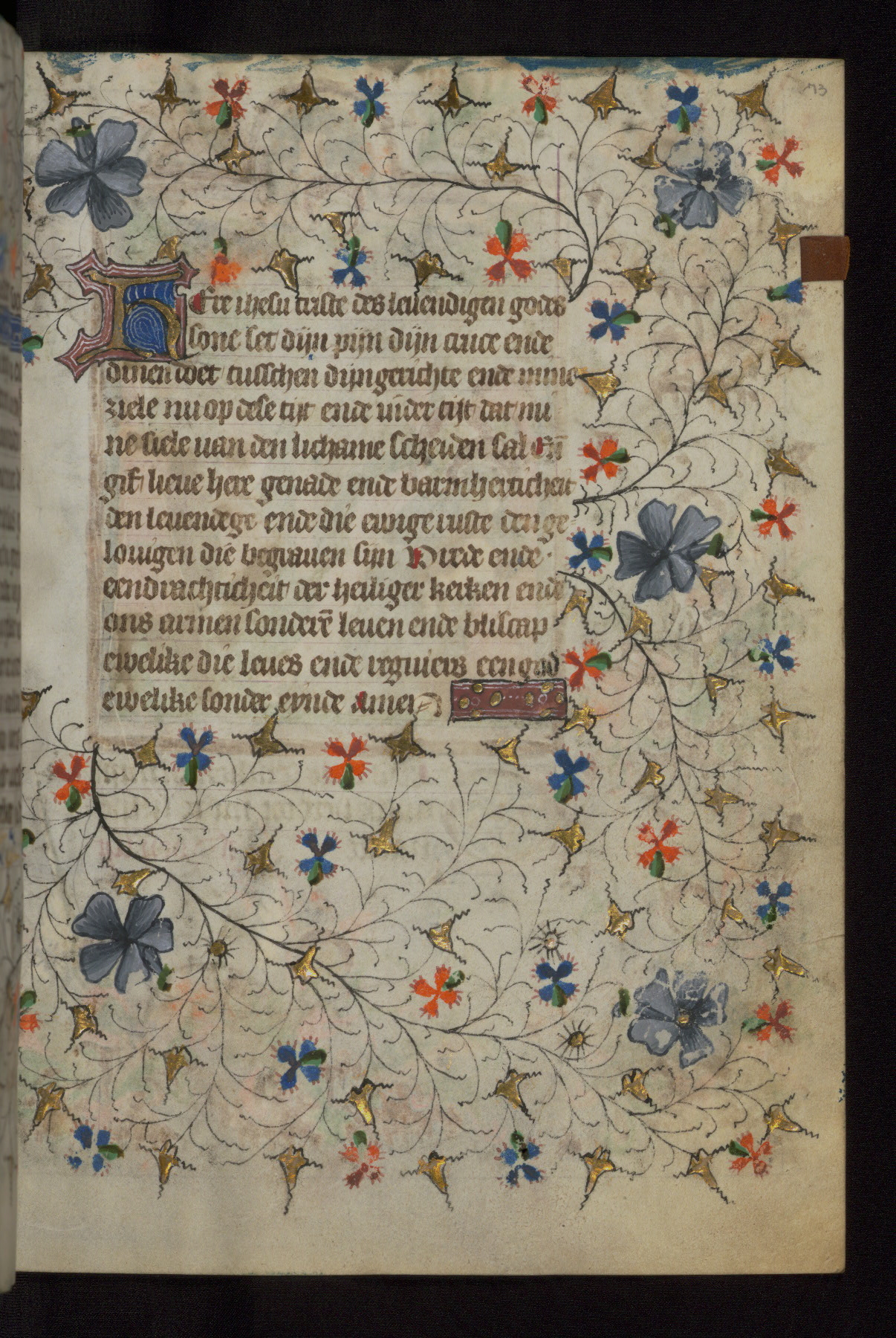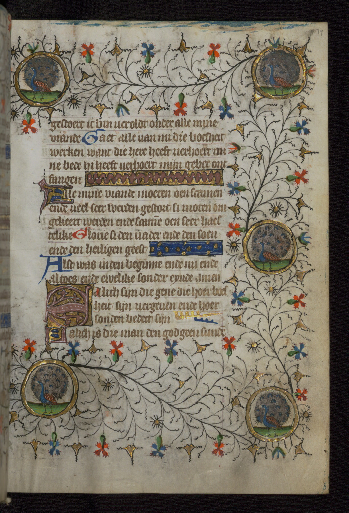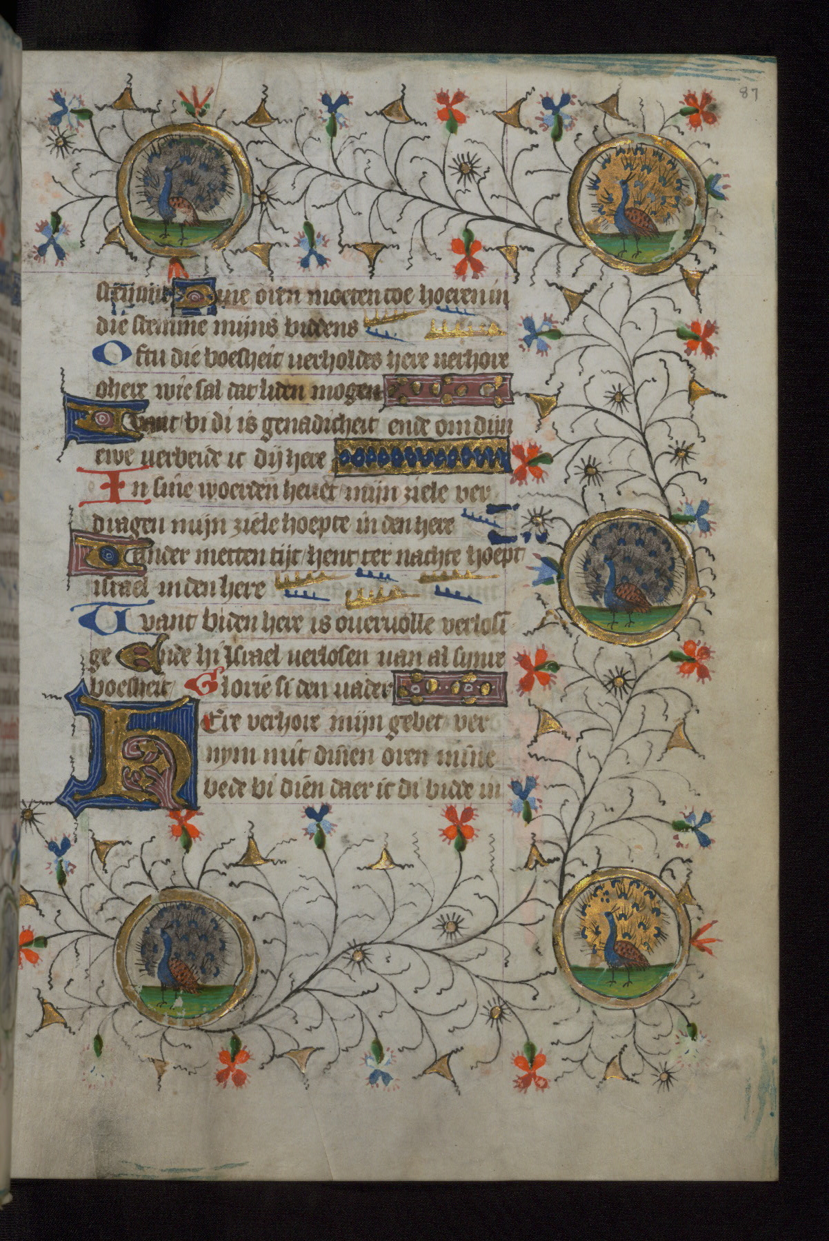 This book of hours was written in Dutch in the fifteenth century for the use of Utrecht. The Hours of the Virgin and of the Cross are accompanied here by the Dutch translation of Henry Suso's "Cursus aeternae sapientiae," a text that was particularly popular for private devotion in the Netherlands. Once owned by the English collector Lord Amherst, the manuscript is exceptional for its extensive illumination. Webs of foliage cover every margin, most sprouting medallions containing flora and fauna. The divisions in the text are marked by twenty richly painted full-page miniatures, often accompanied by related marginalia. Further illumination in the form of historiated and foliate initials marks minor breaks in the text, and the overall effect is a visual feast for the reader.