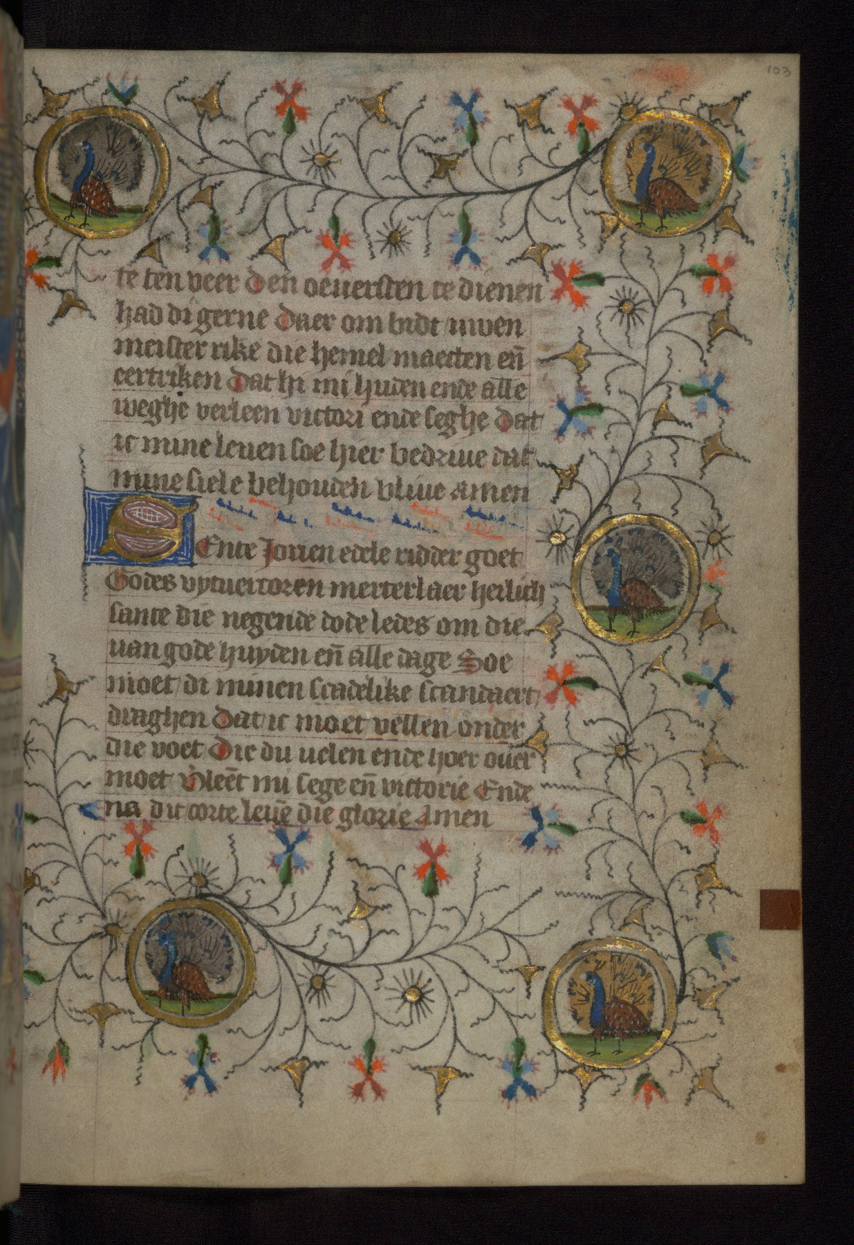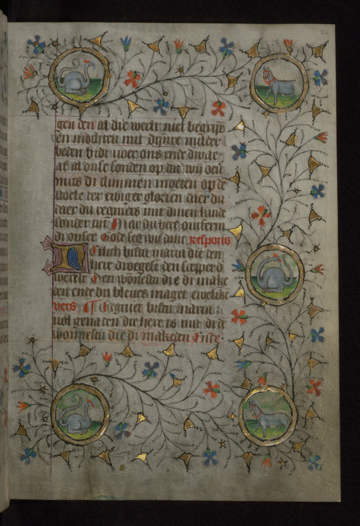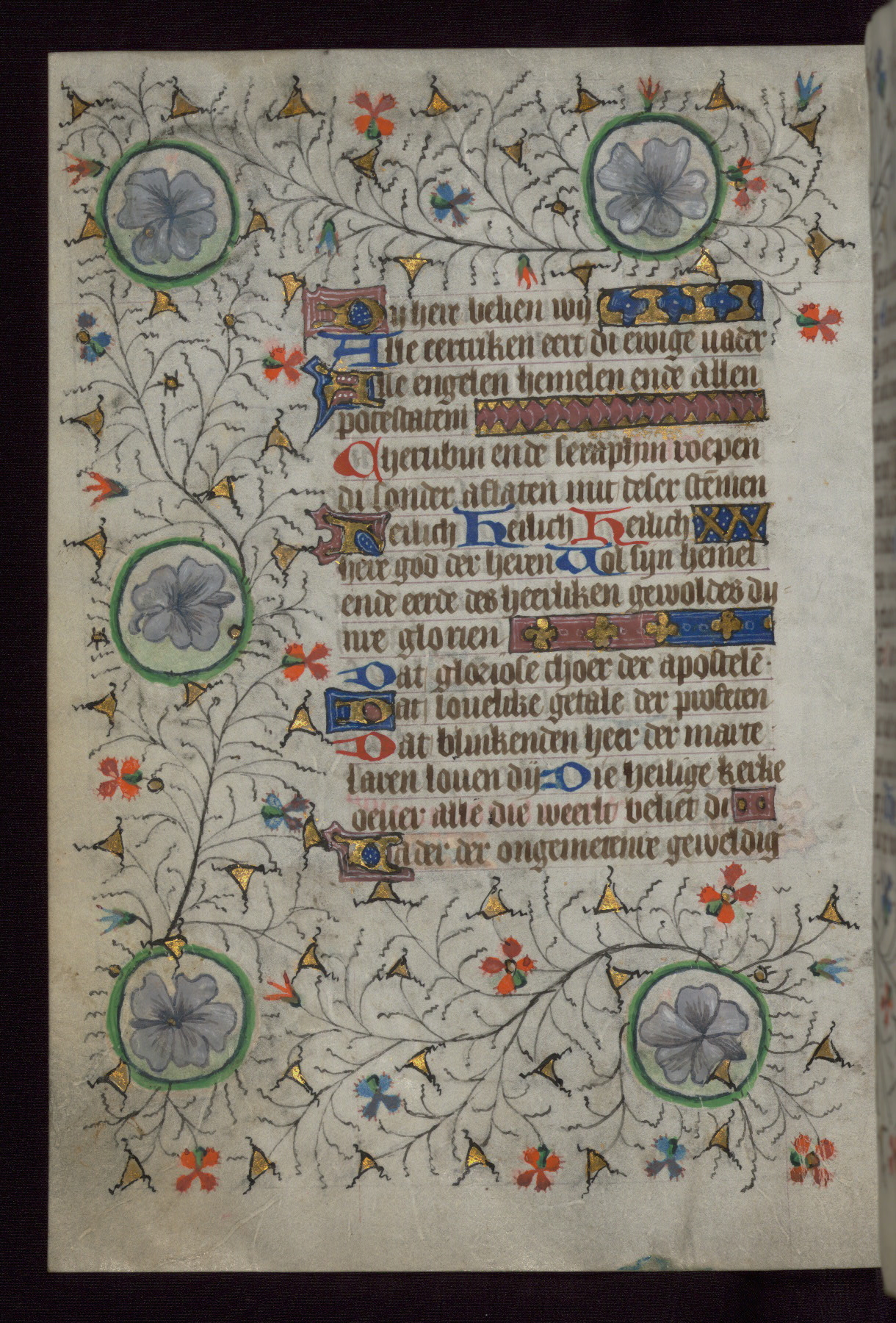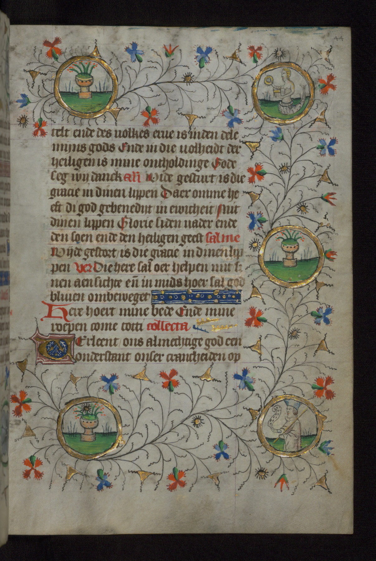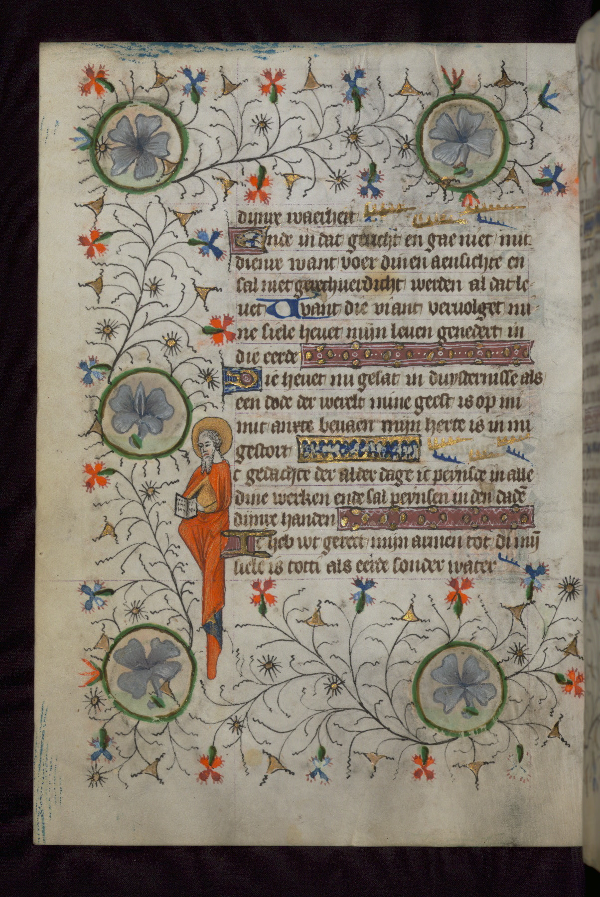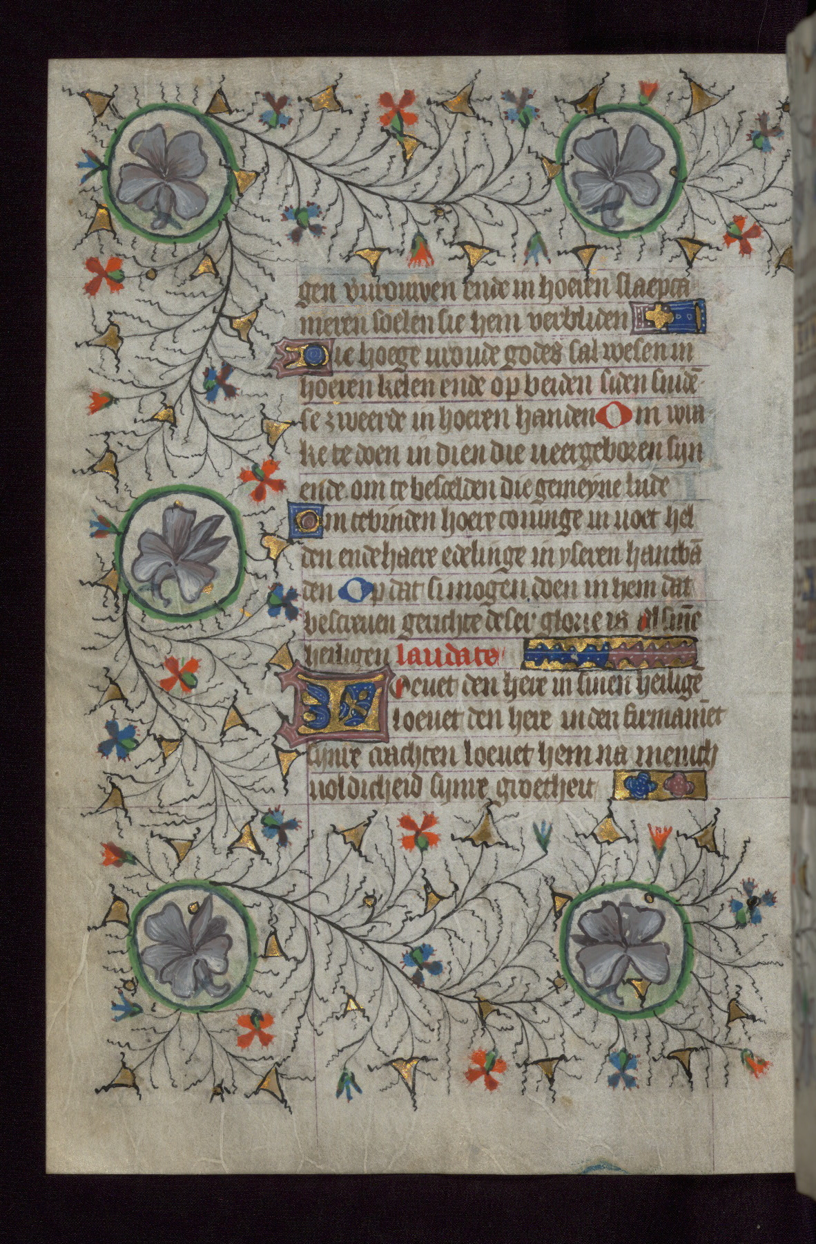 This book of hours was written in Dutch in the fifteenth century for the use of Utrecht. The Hours of the Virgin and of the Cross are accompanied here by the Dutch translation of Henry Suso's "Cursus aeternae sapientiae," a text that was particularly popular for private devotion in the Netherlands. Once owned by the English collector Lord Amherst, the manuscript is exceptional for its extensive illumination. Webs of foliage cover every margin, most sprouting medallions containing flora and fauna. The divisions in the text are marked by twenty richly painted full-page miniatures, often accompanied by related marginalia. Further illumination in the form of historiated and foliate initials marks minor breaks in the text, and the overall effect is a visual feast for the reader.