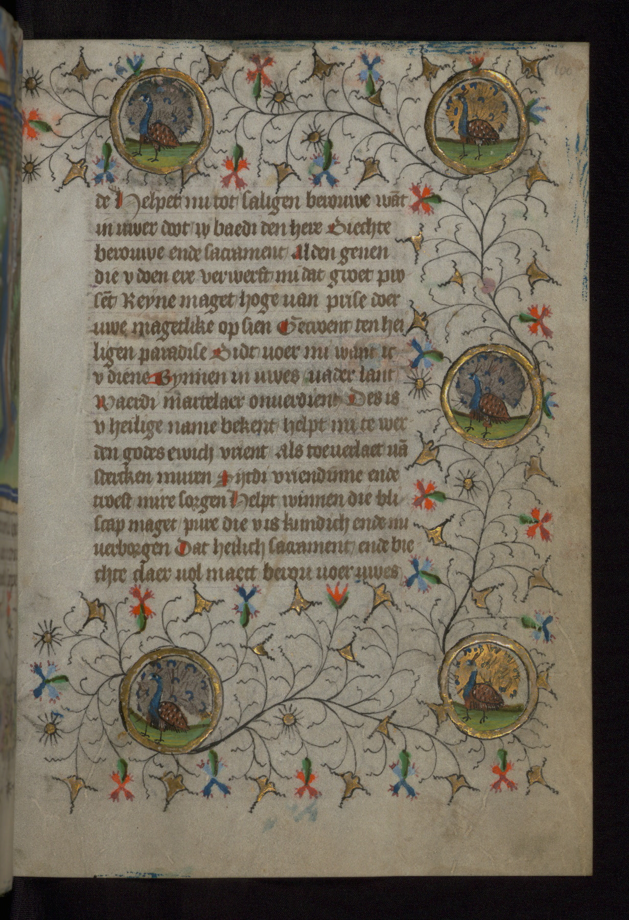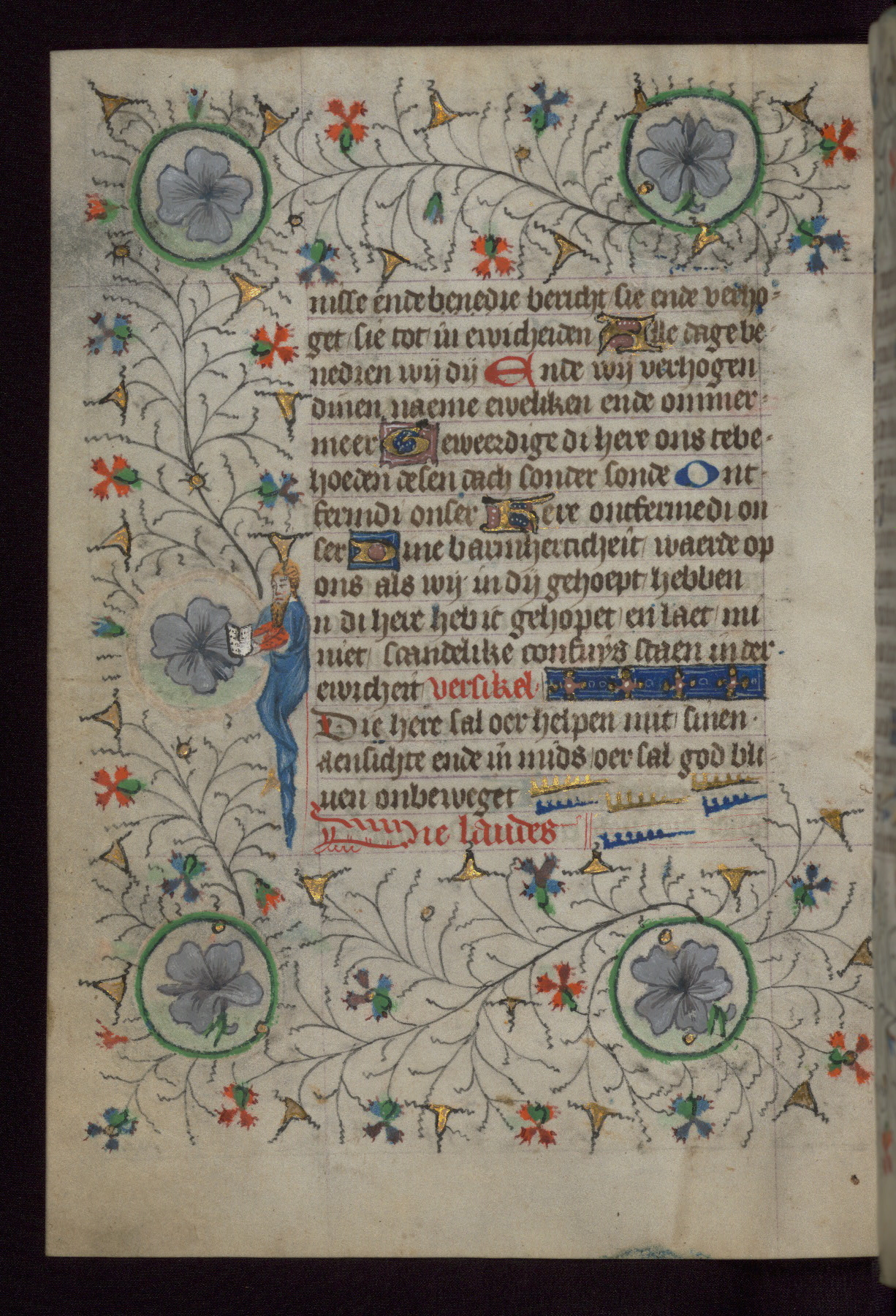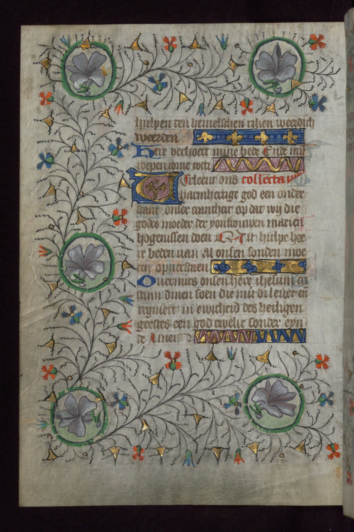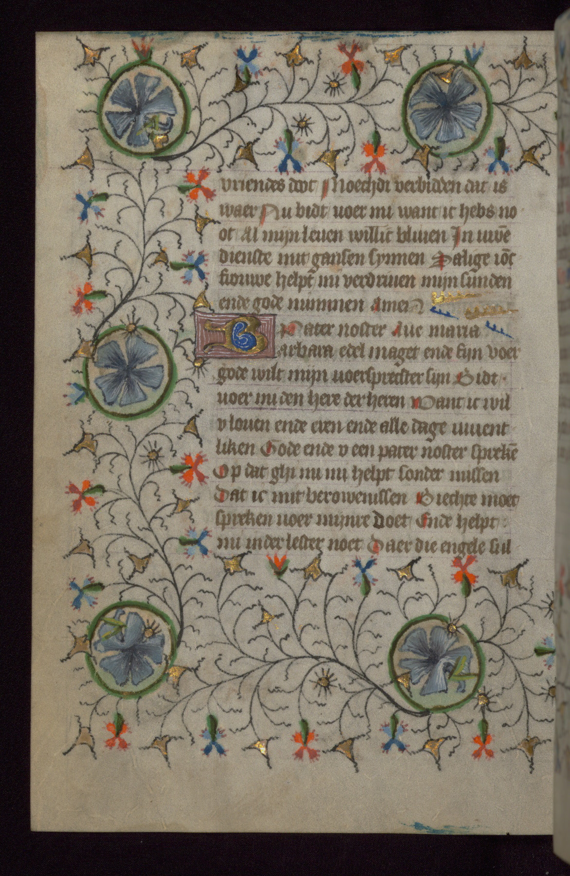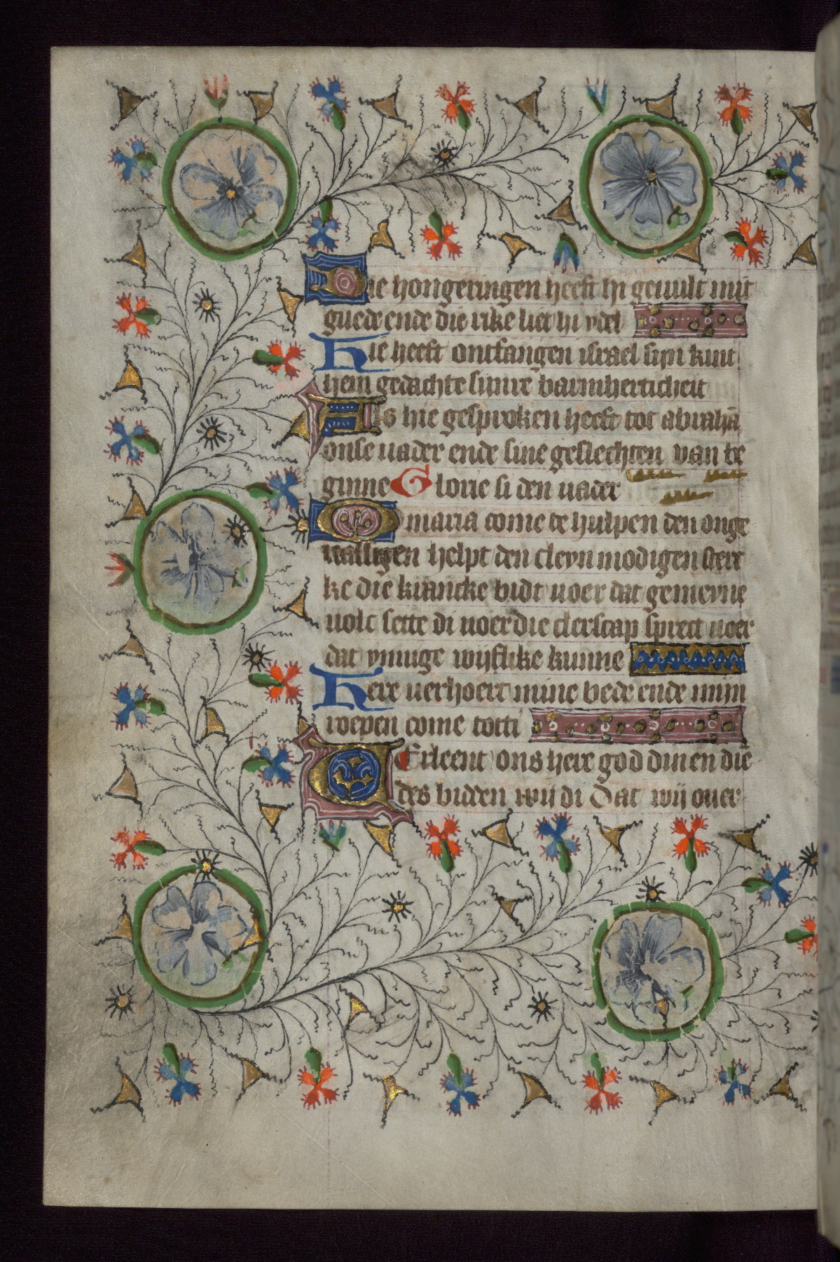 This book of hours was written in Dutch in the fifteenth century for the use of Utrecht. The Hours of the Virgin and of the Cross are accompanied here by the Dutch translation of Henry Suso's "Cursus aeternae sapientiae," a text that was particularly popular for private devotion in the Netherlands. Once owned by the English collector Lord Amherst, the manuscript is exceptional for its extensive illumination. Webs of foliage cover every margin, most sprouting medallions containing flora and fauna. The divisions in the text are marked by twenty richly painted full-page miniatures, often accompanied by related marginalia. Further illumination in the form of historiated and foliate initials marks minor breaks in the text, and the overall effect is a visual feast for the reader.