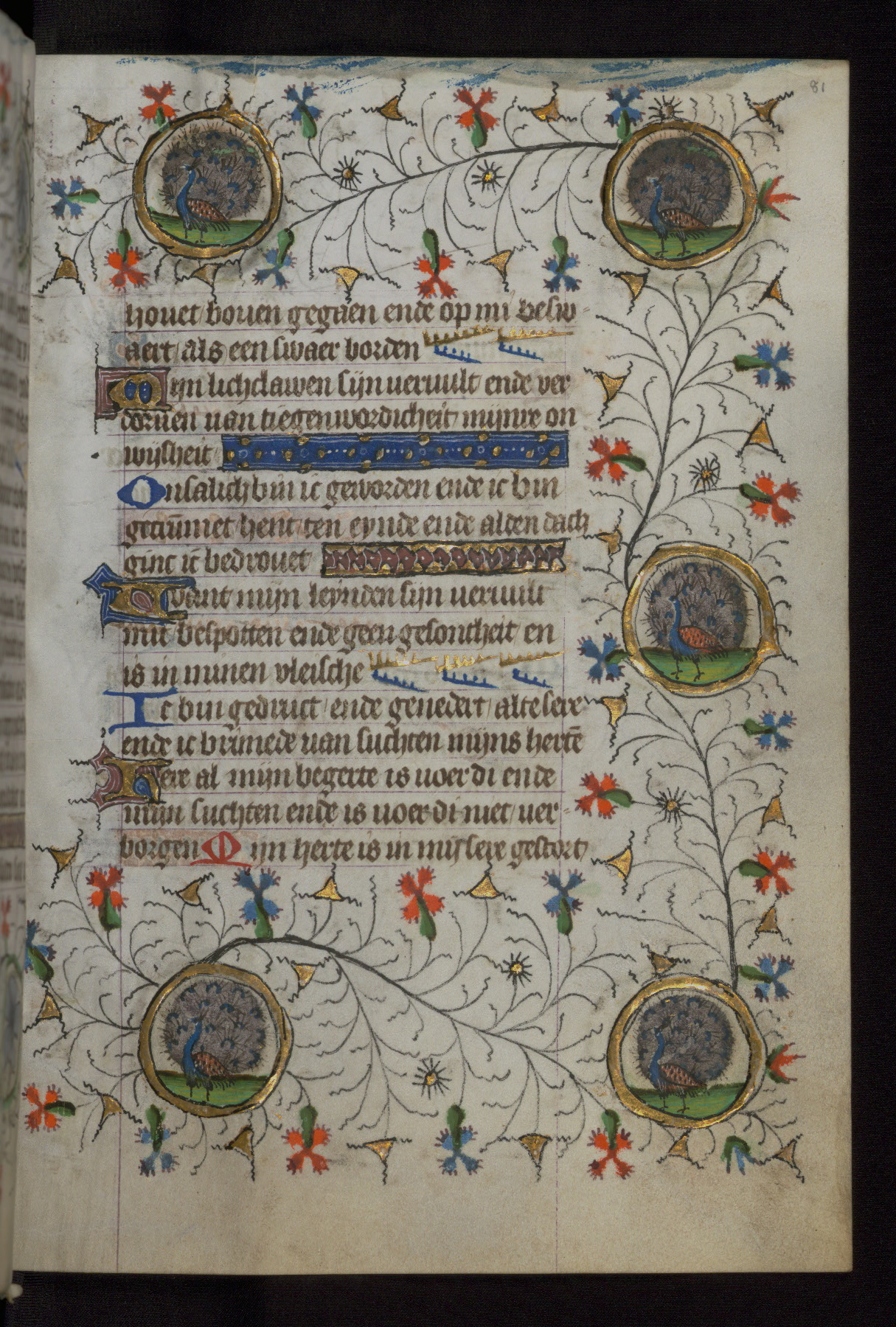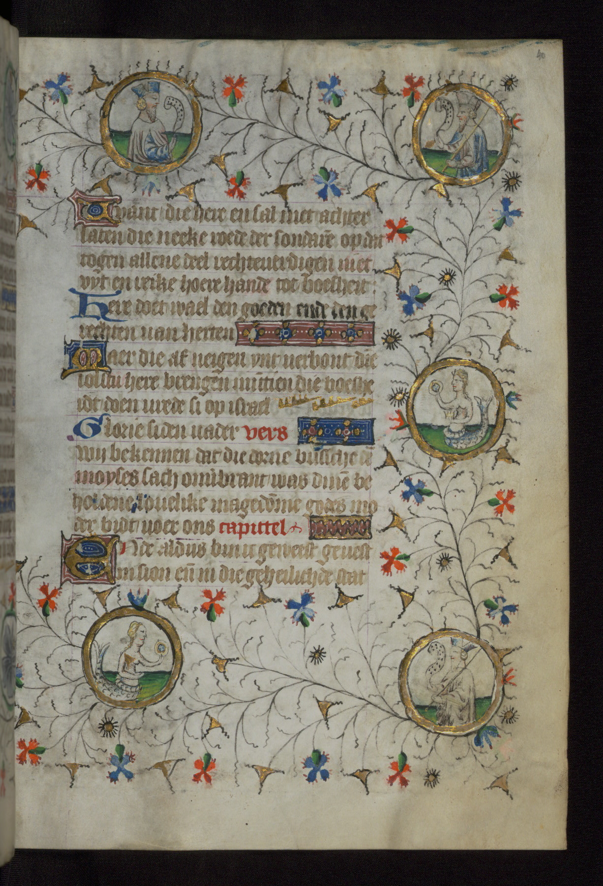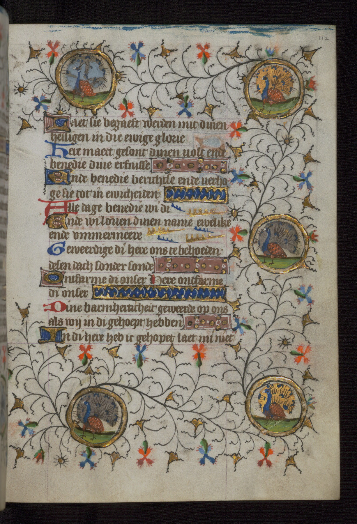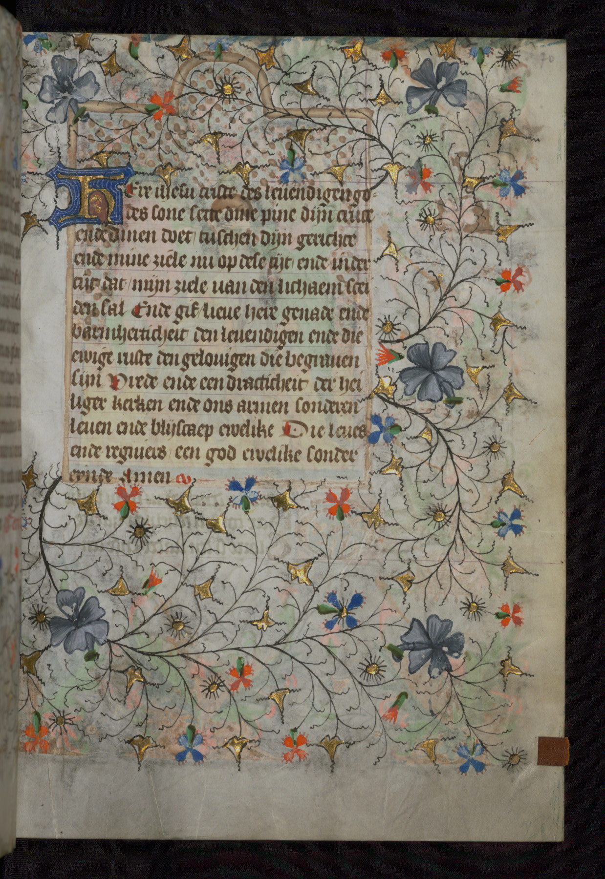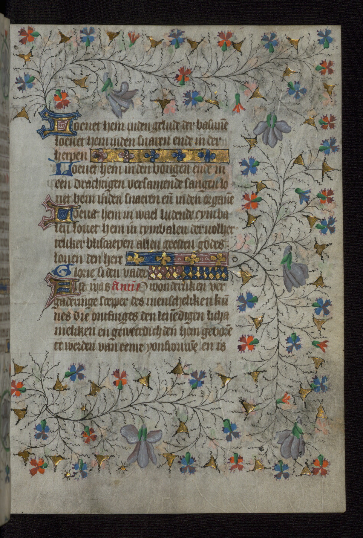 This book of hours was written in Dutch in the fifteenth century for the use of Utrecht. The Hours of the Virgin and of the Cross are accompanied here by the Dutch translation of Henry Suso's "Cursus aeternae sapientiae," a text that was particularly popular for private devotion in the Netherlands. Once owned by the English collector Lord Amherst, the manuscript is exceptional for its extensive illumination. Webs of foliage cover every margin, most sprouting medallions containing flora and fauna. The divisions in the text are marked by twenty richly painted full-page miniatures, often accompanied by related marginalia. Further illumination in the form of historiated and foliate initials marks minor breaks in the text, and the overall effect is a visual feast for the reader.