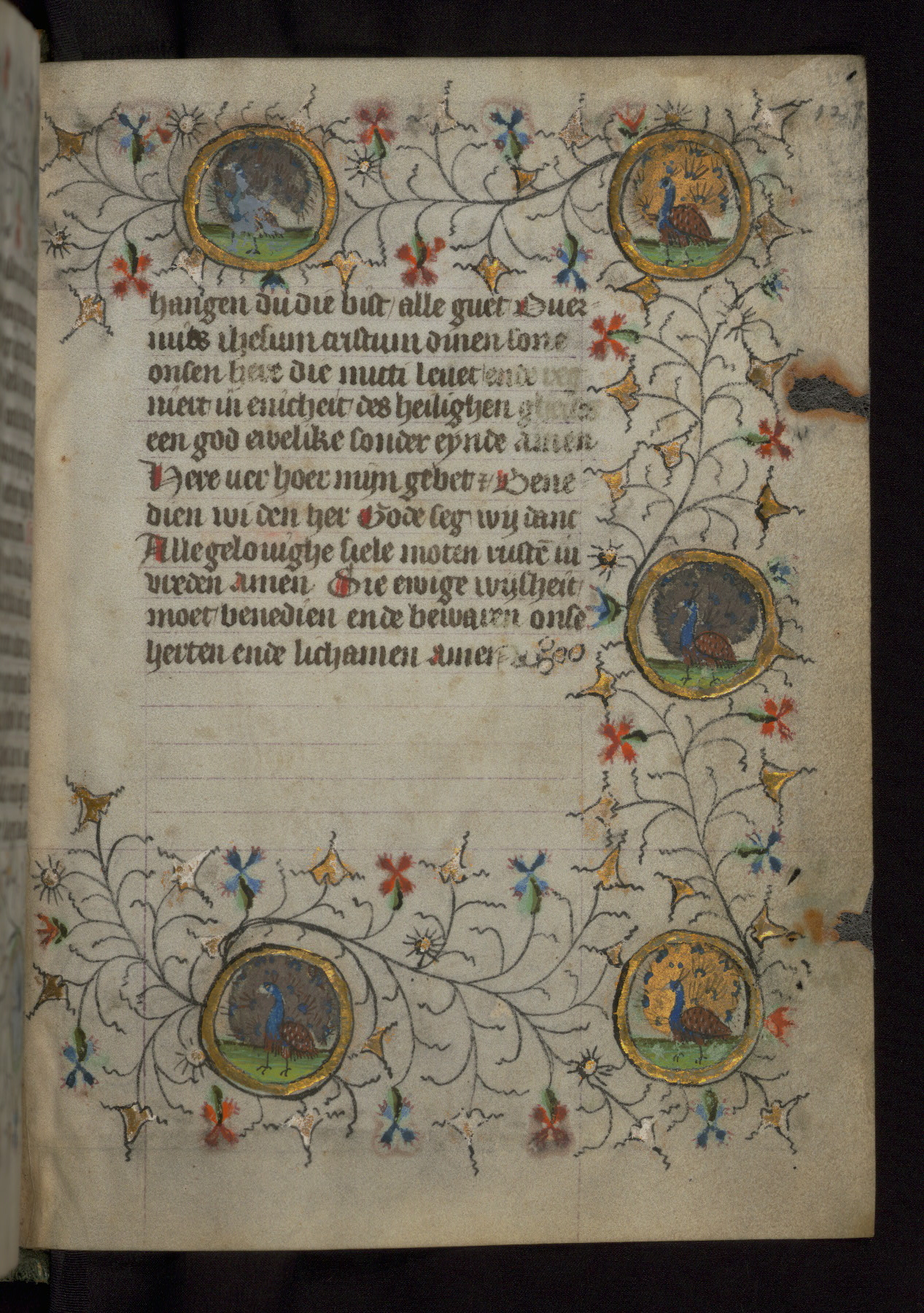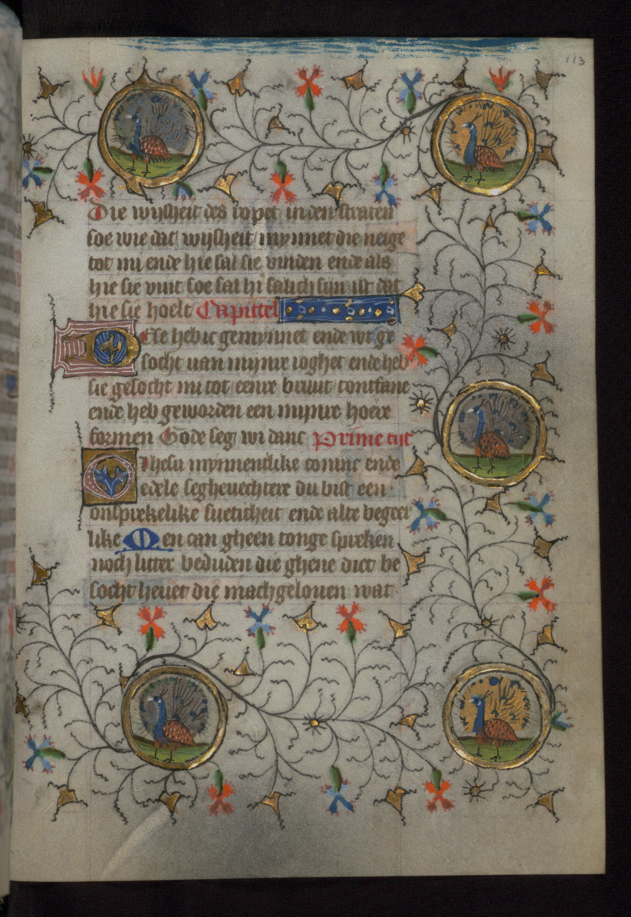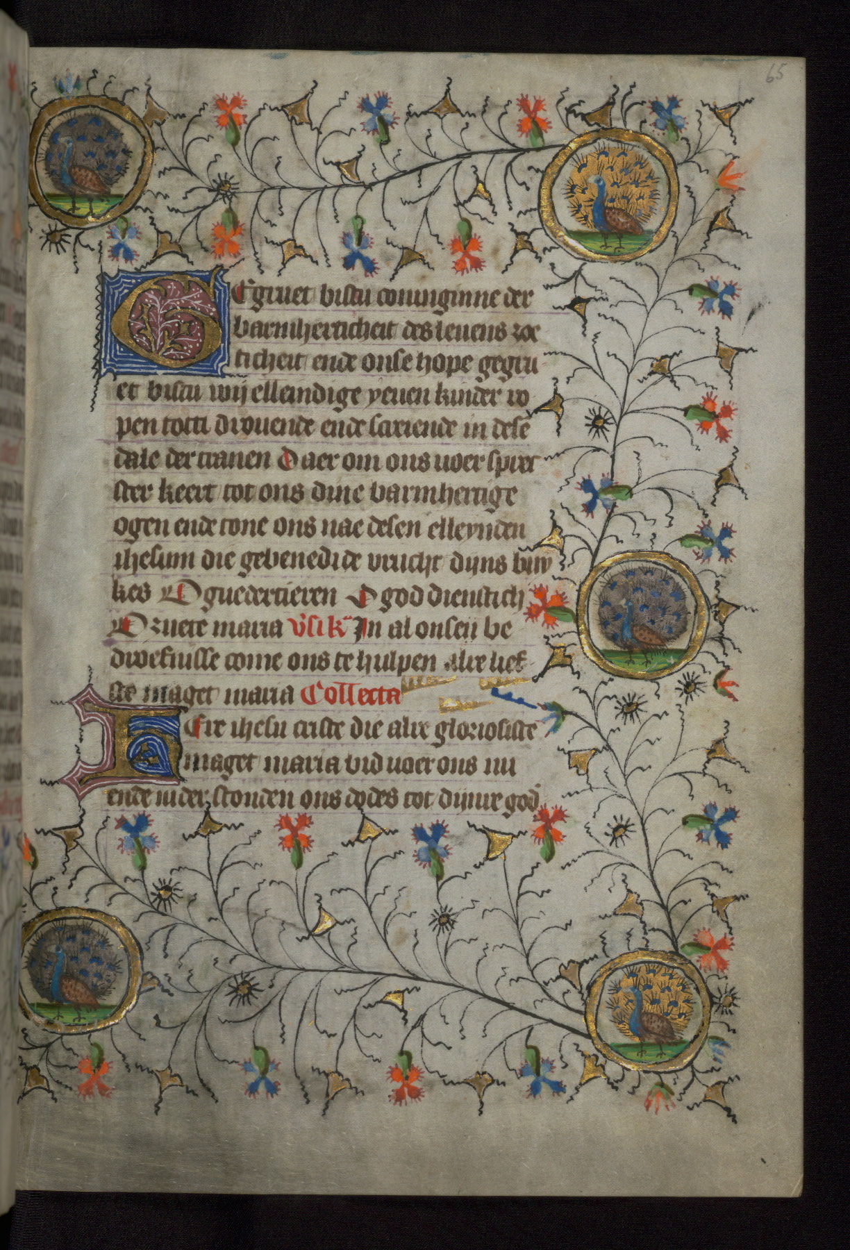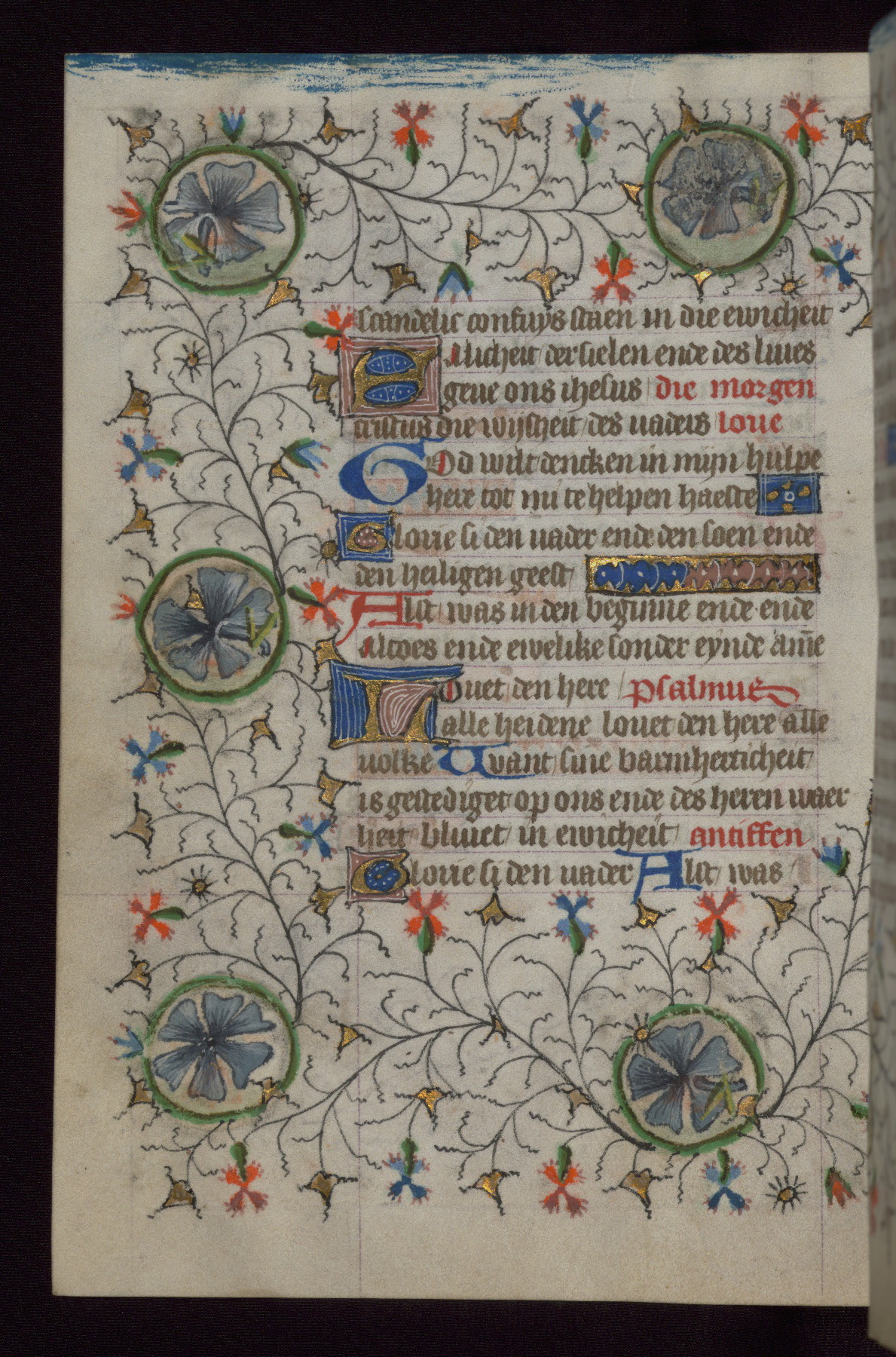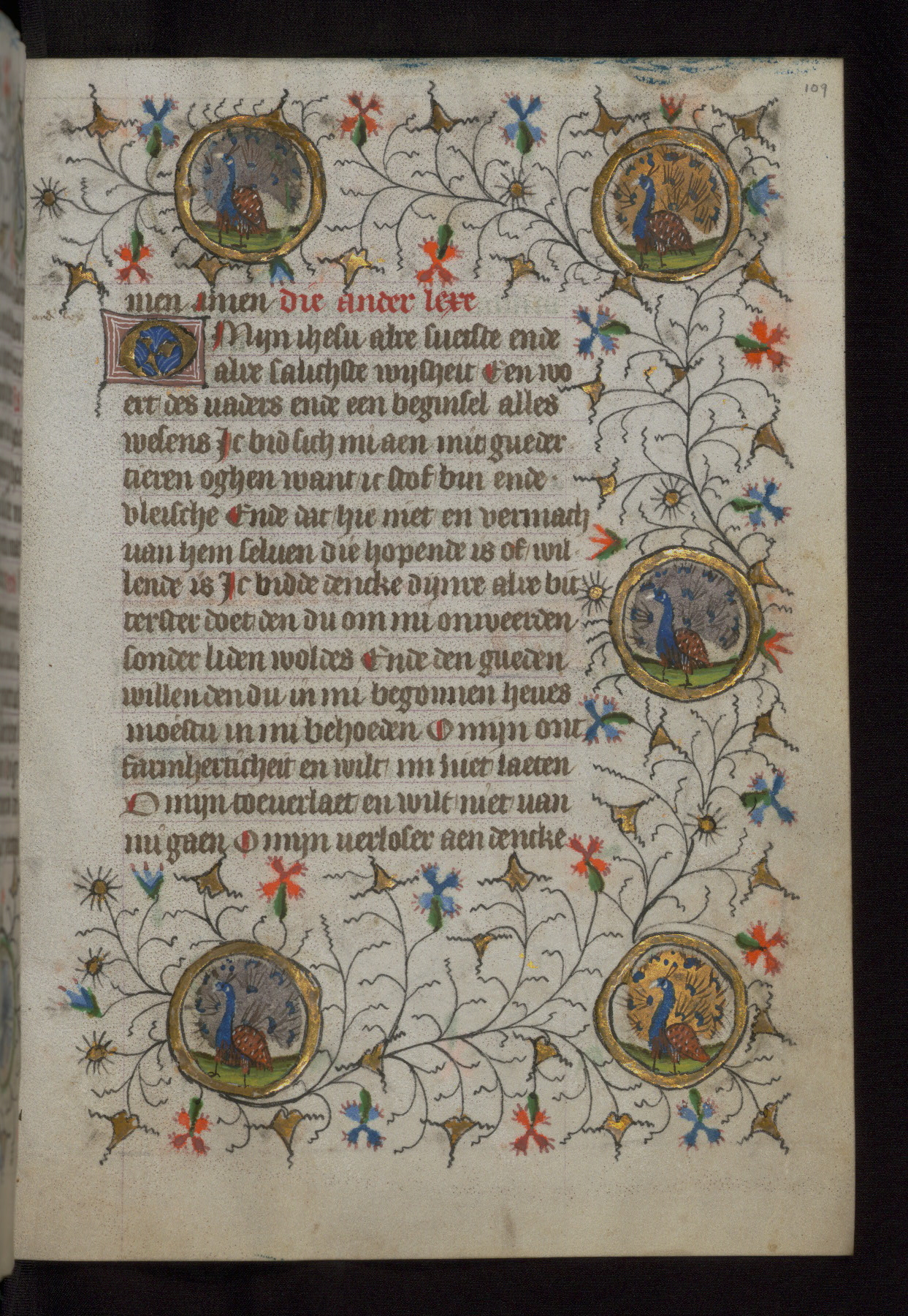 This book of hours was written in Dutch in the fifteenth century for the use of Utrecht. The Hours of the Virgin and of the Cross are accompanied here by the Dutch translation of Henry Suso's "Cursus aeternae sapientiae," a text that was particularly popular for private devotion in the Netherlands. Once owned by the English collector Lord Amherst, the manuscript is exceptional for its extensive illumination. Webs of foliage cover every margin, most sprouting medallions containing flora and fauna. The divisions in the text are marked by twenty richly painted full-page miniatures, often accompanied by related marginalia. Further illumination in the form of historiated and foliate initials marks minor breaks in the text, and the overall effect is a visual feast for the reader.