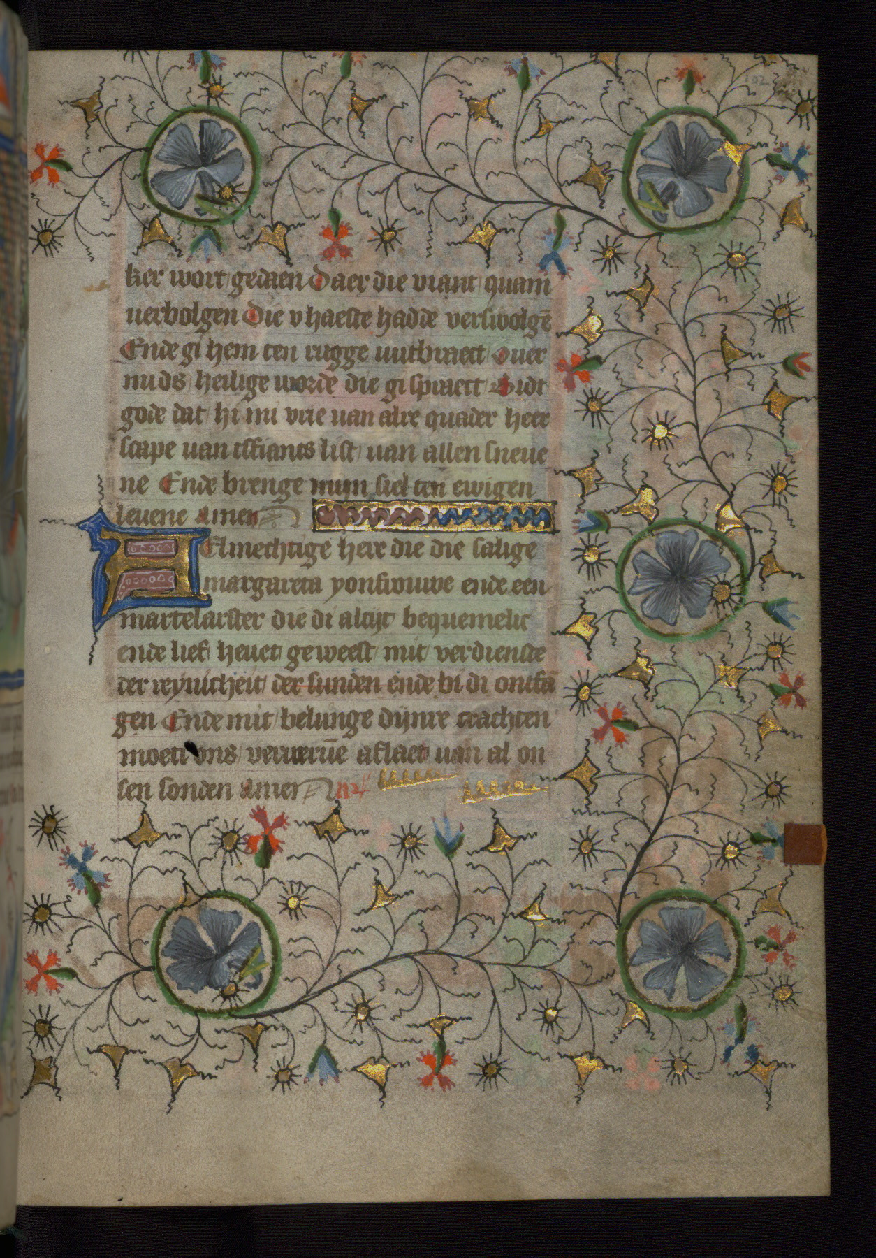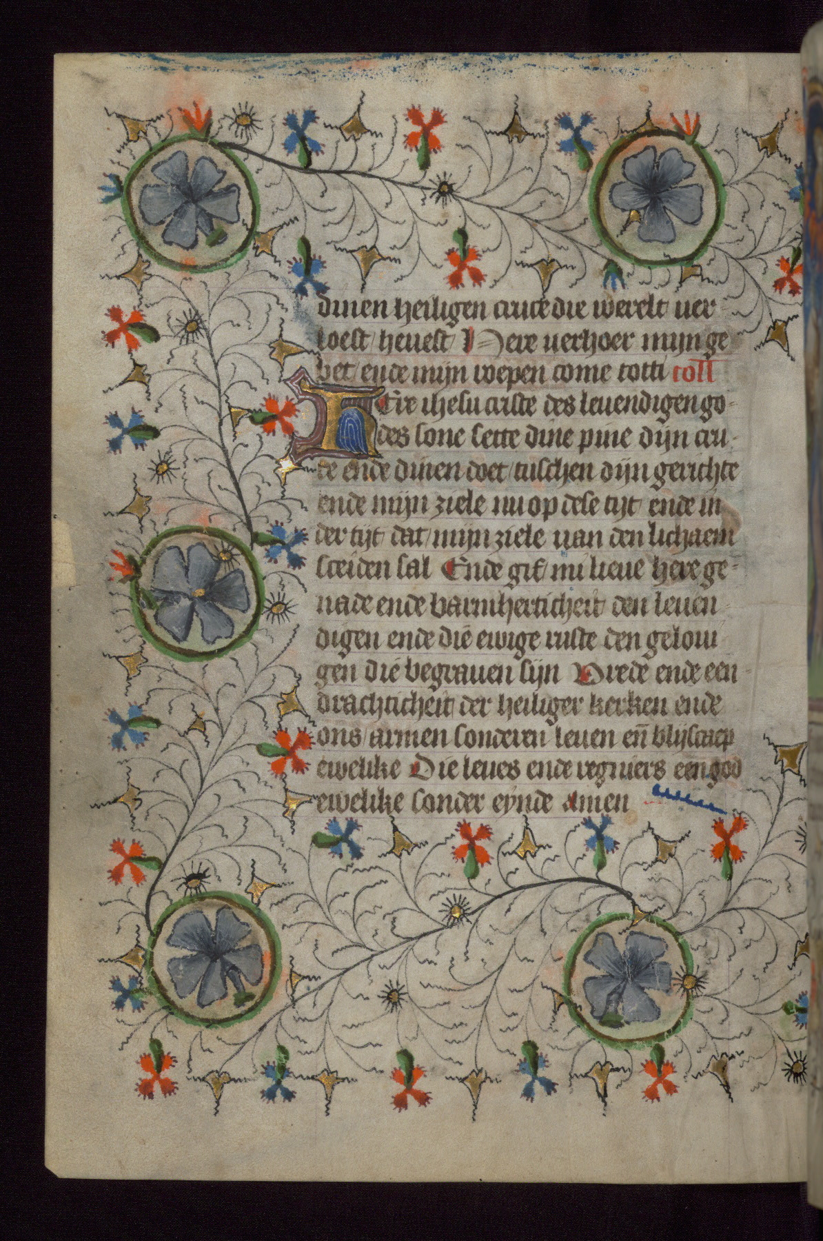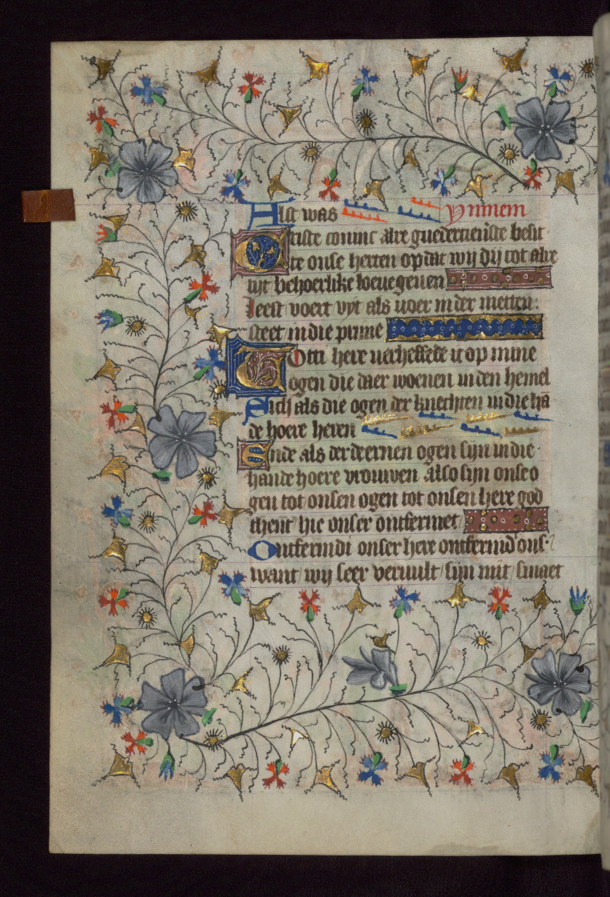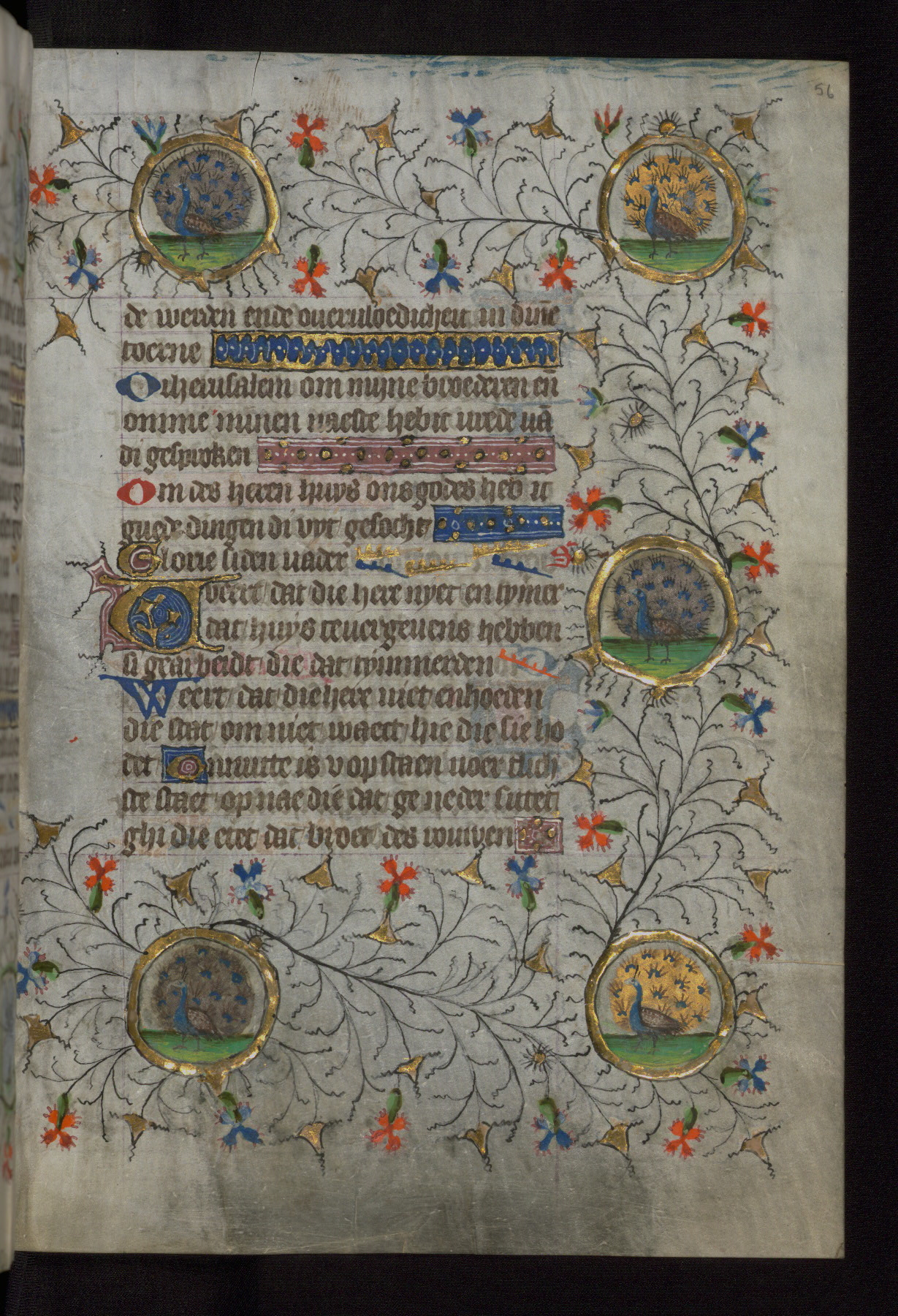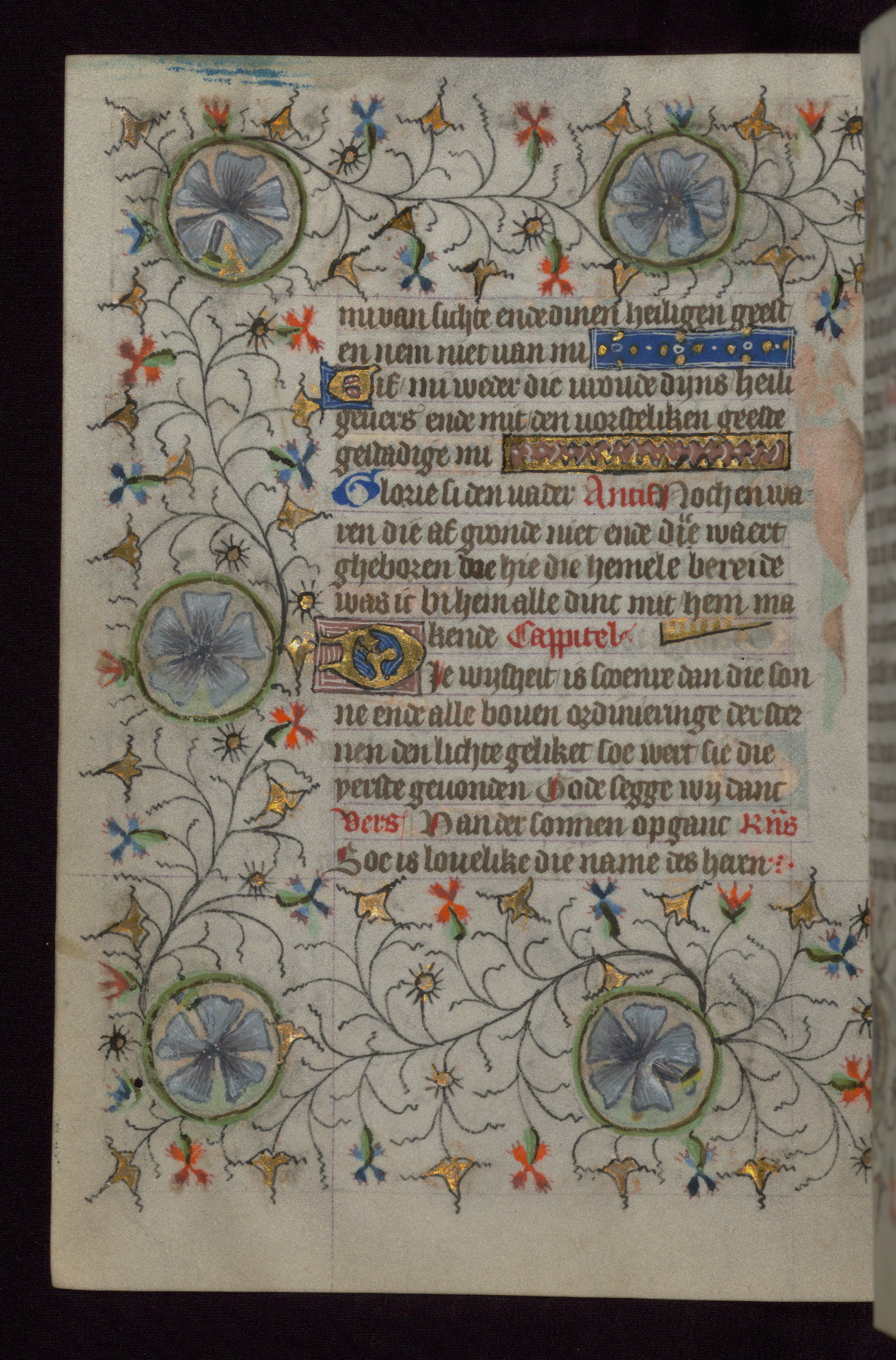 This book of hours was written in Dutch in the fifteenth century for the use of Utrecht. The Hours of the Virgin and of the Cross are accompanied here by the Dutch translation of Henry Suso's "Cursus aeternae sapientiae," a text that was particularly popular for private devotion in the Netherlands. Once owned by the English collector Lord Amherst, the manuscript is exceptional for its extensive illumination. Webs of foliage cover every margin, most sprouting medallions containing flora and fauna. The divisions in the text are marked by twenty richly painted full-page miniatures, often accompanied by related marginalia. Further illumination in the form of historiated and foliate initials marks minor breaks in the text, and the overall effect is a visual feast for the reader.