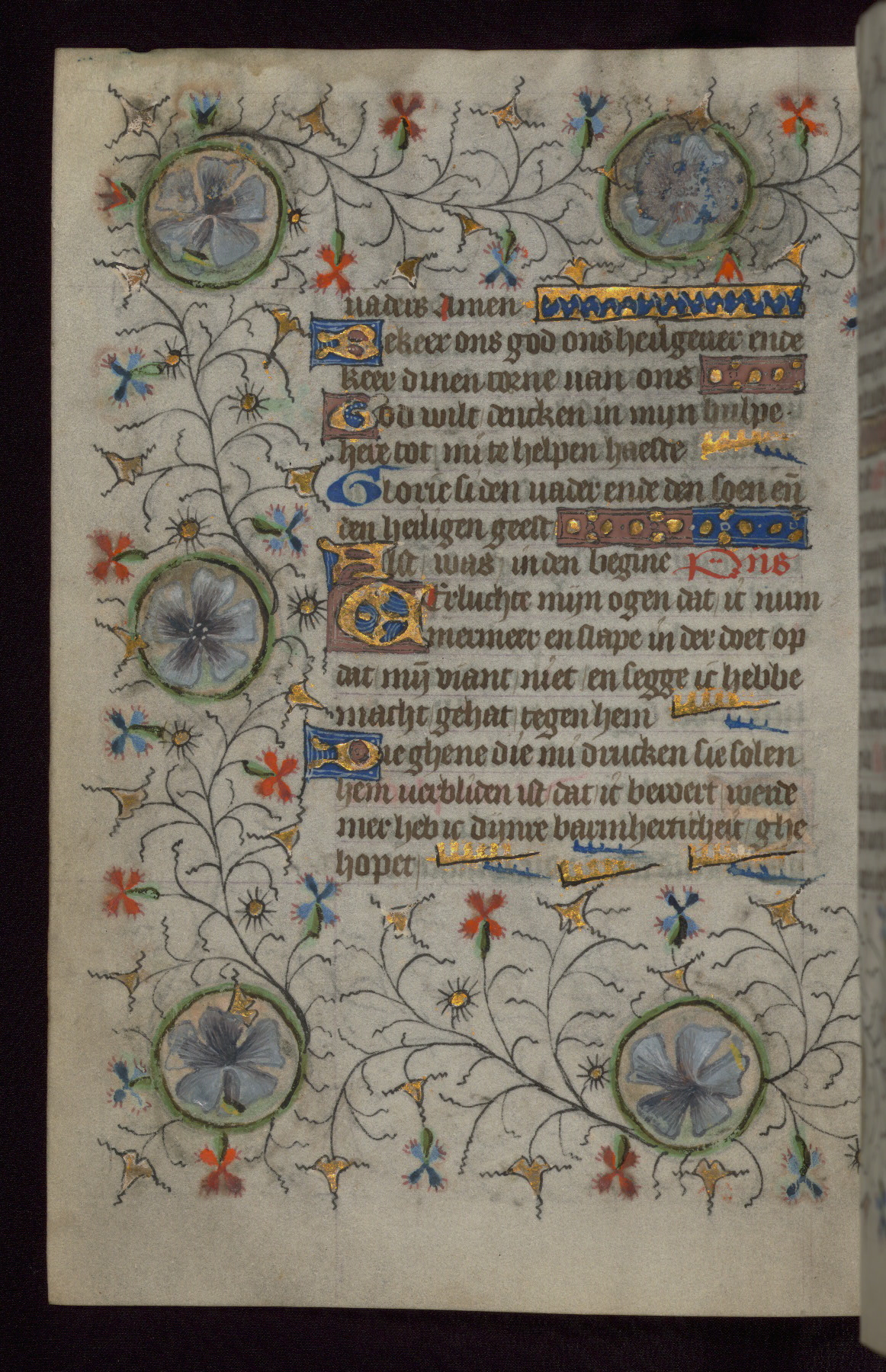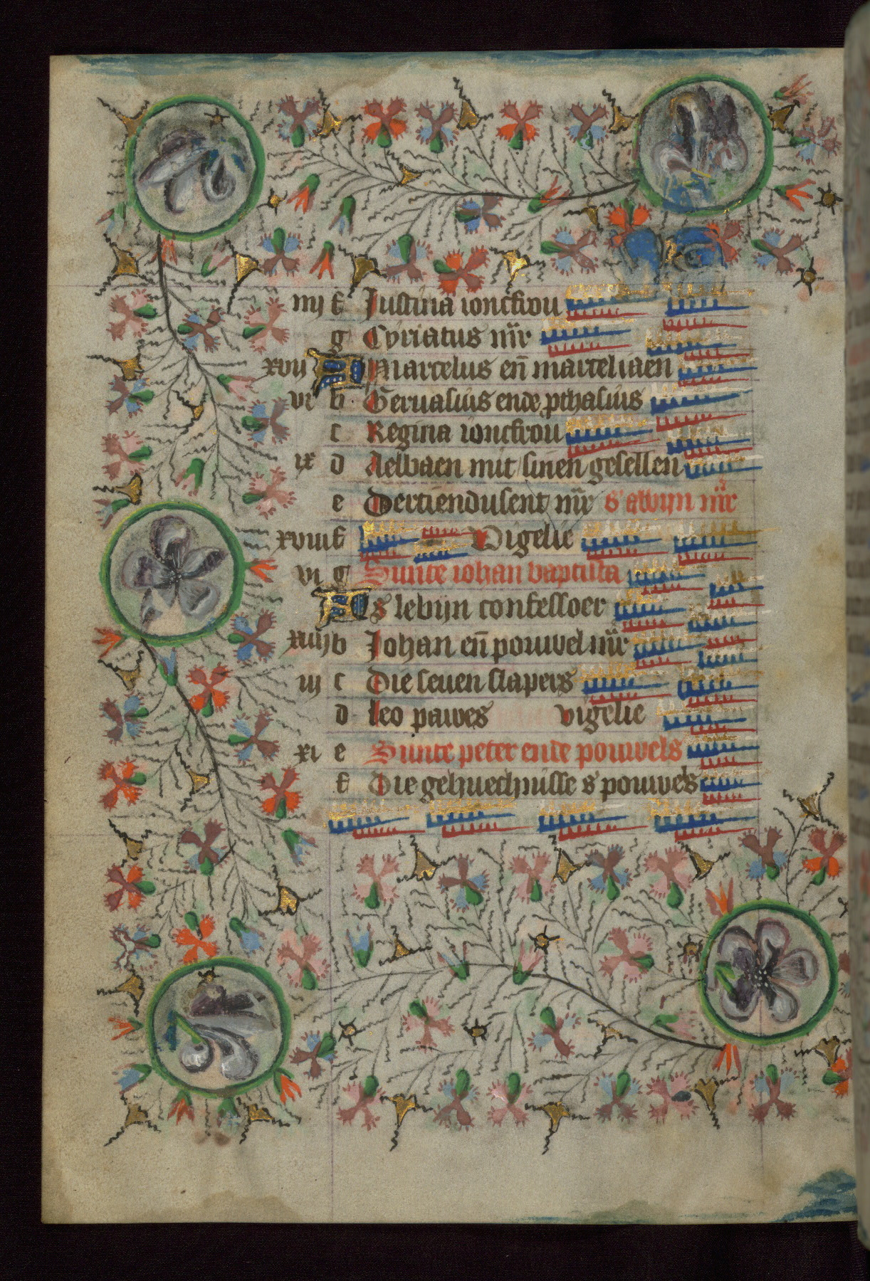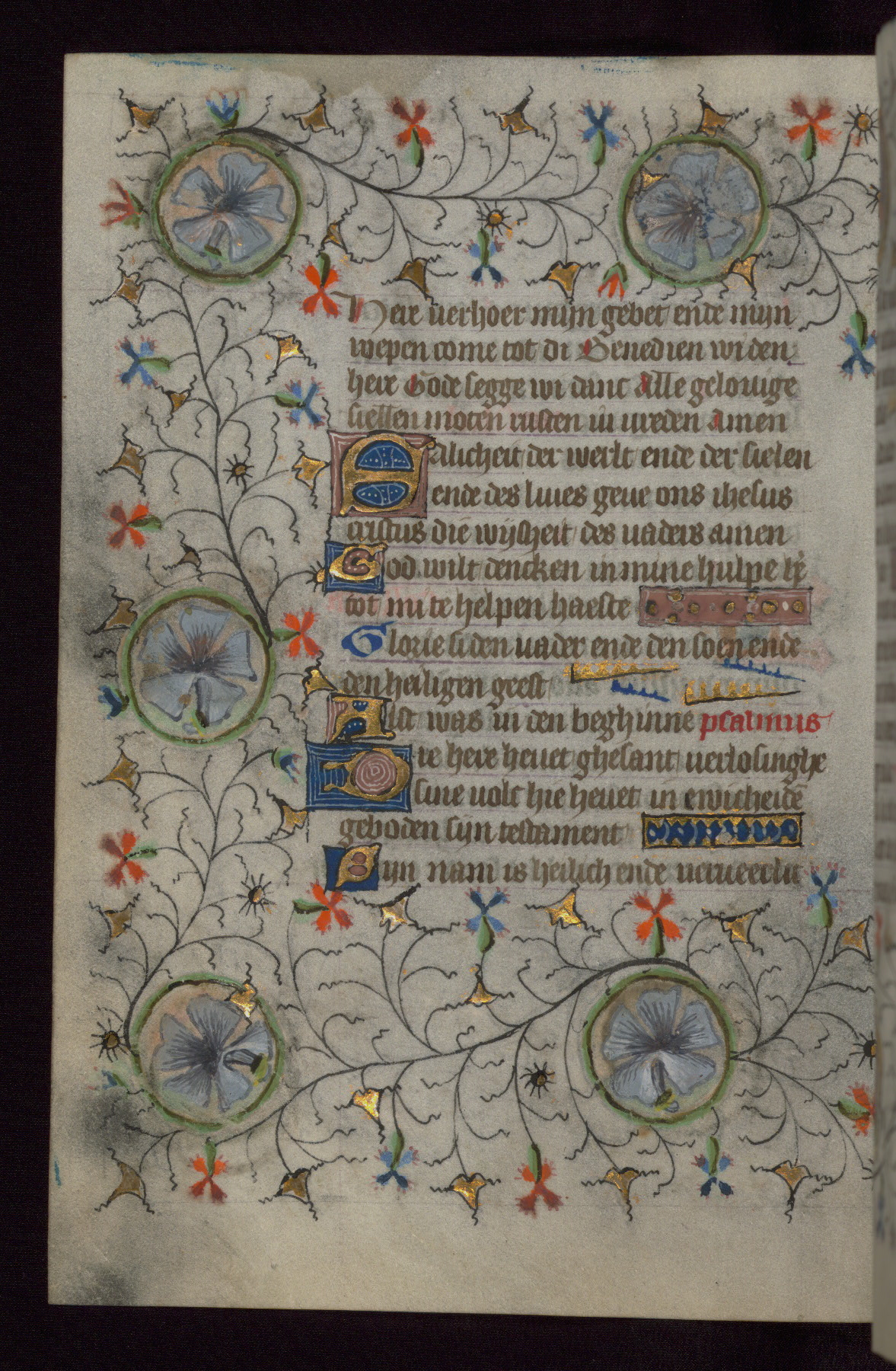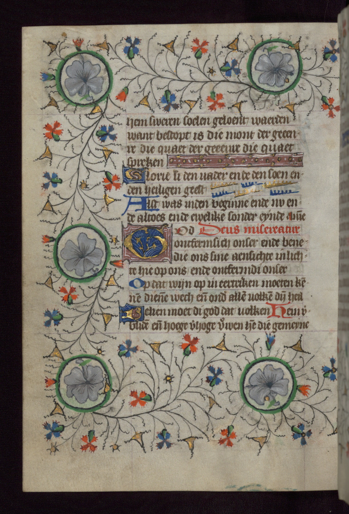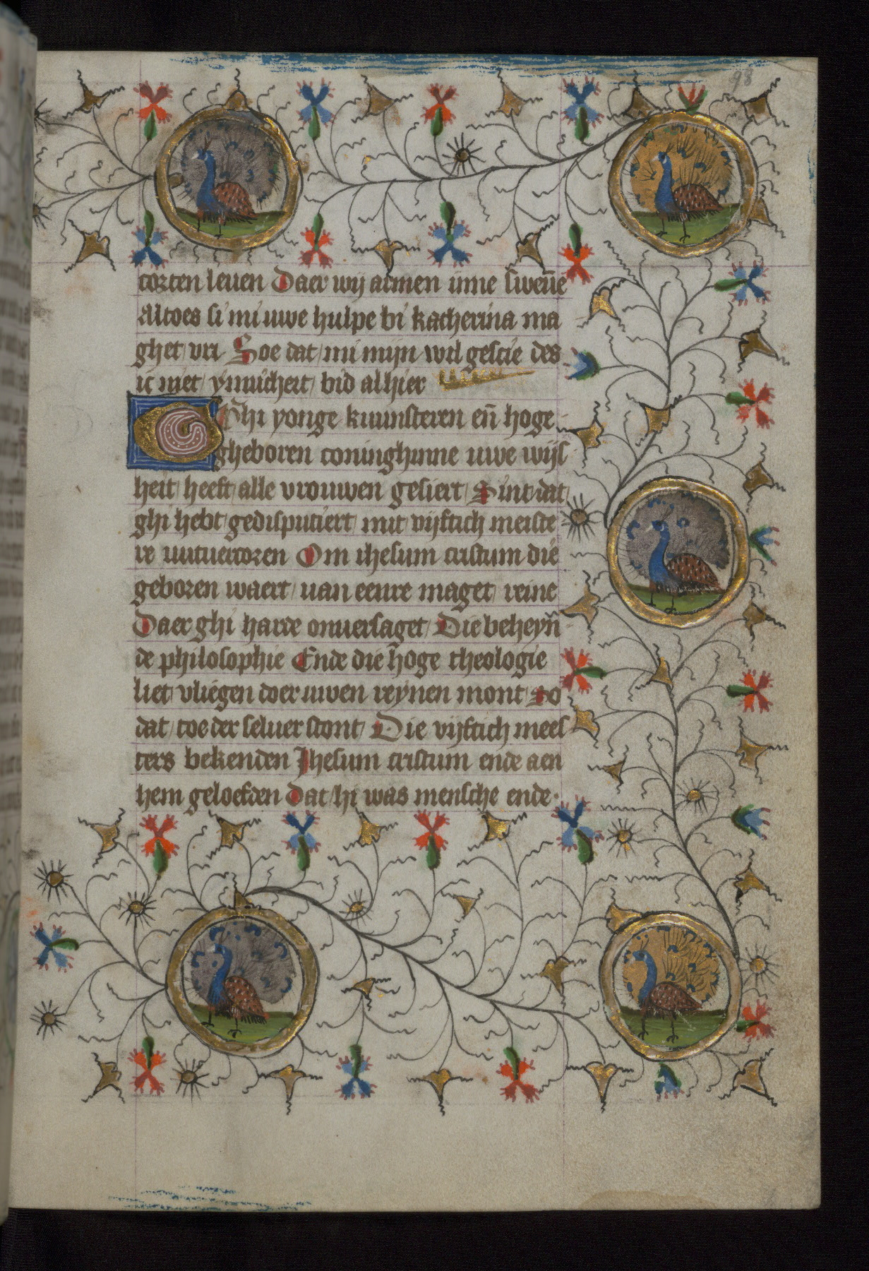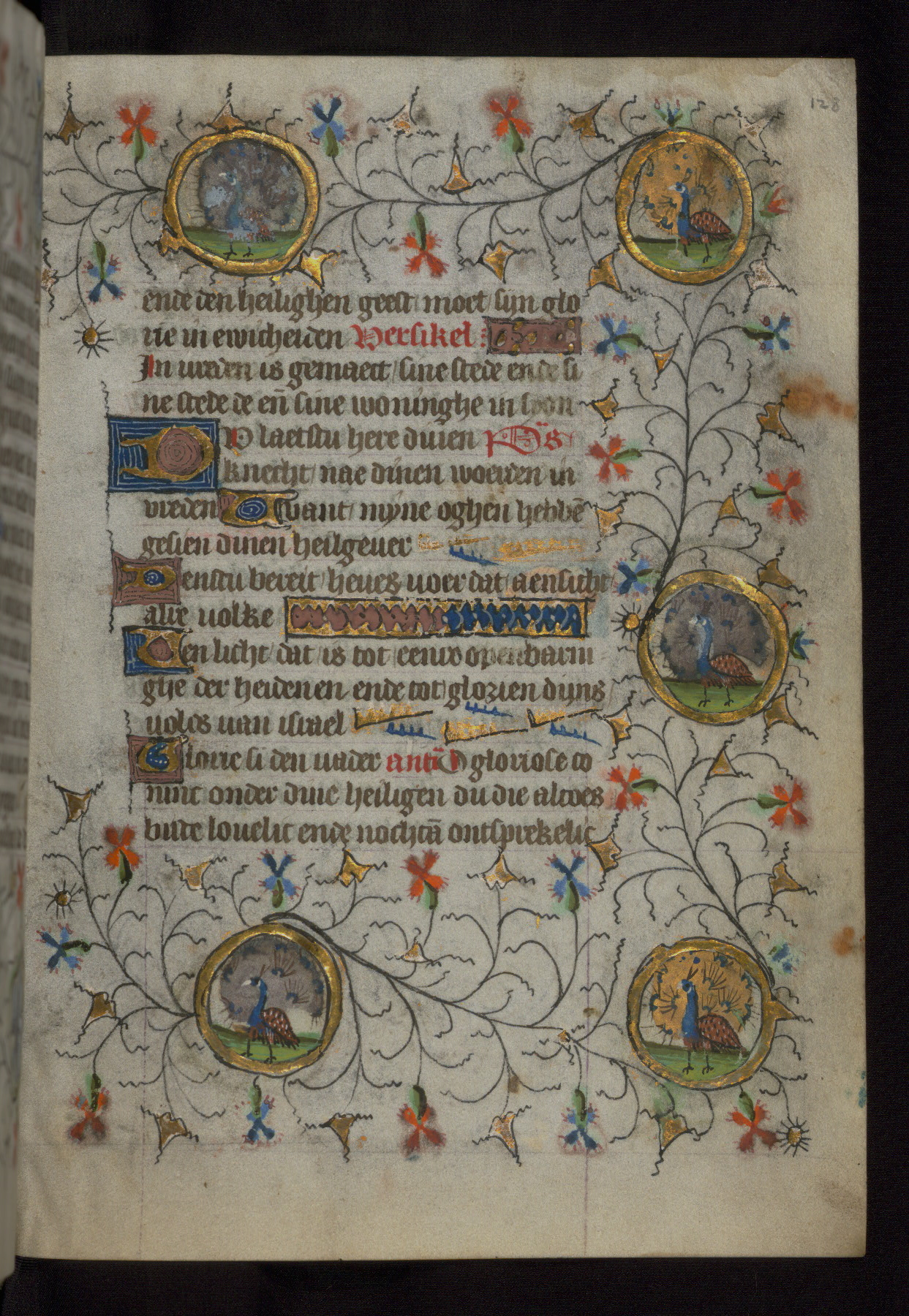 This book of hours was written in Dutch in the fifteenth century for the use of Utrecht. The Hours of the Virgin and of the Cross are accompanied here by the Dutch translation of Henry Suso's "Cursus aeternae sapientiae," a text that was particularly popular for private devotion in the Netherlands. Once owned by the English collector Lord Amherst, the manuscript is exceptional for its extensive illumination. Webs of foliage cover every margin, most sprouting medallions containing flora and fauna. The divisions in the text are marked by twenty richly painted full-page miniatures, often accompanied by related marginalia. Further illumination in the form of historiated and foliate initials marks minor breaks in the text, and the overall effect is a visual feast for the reader.