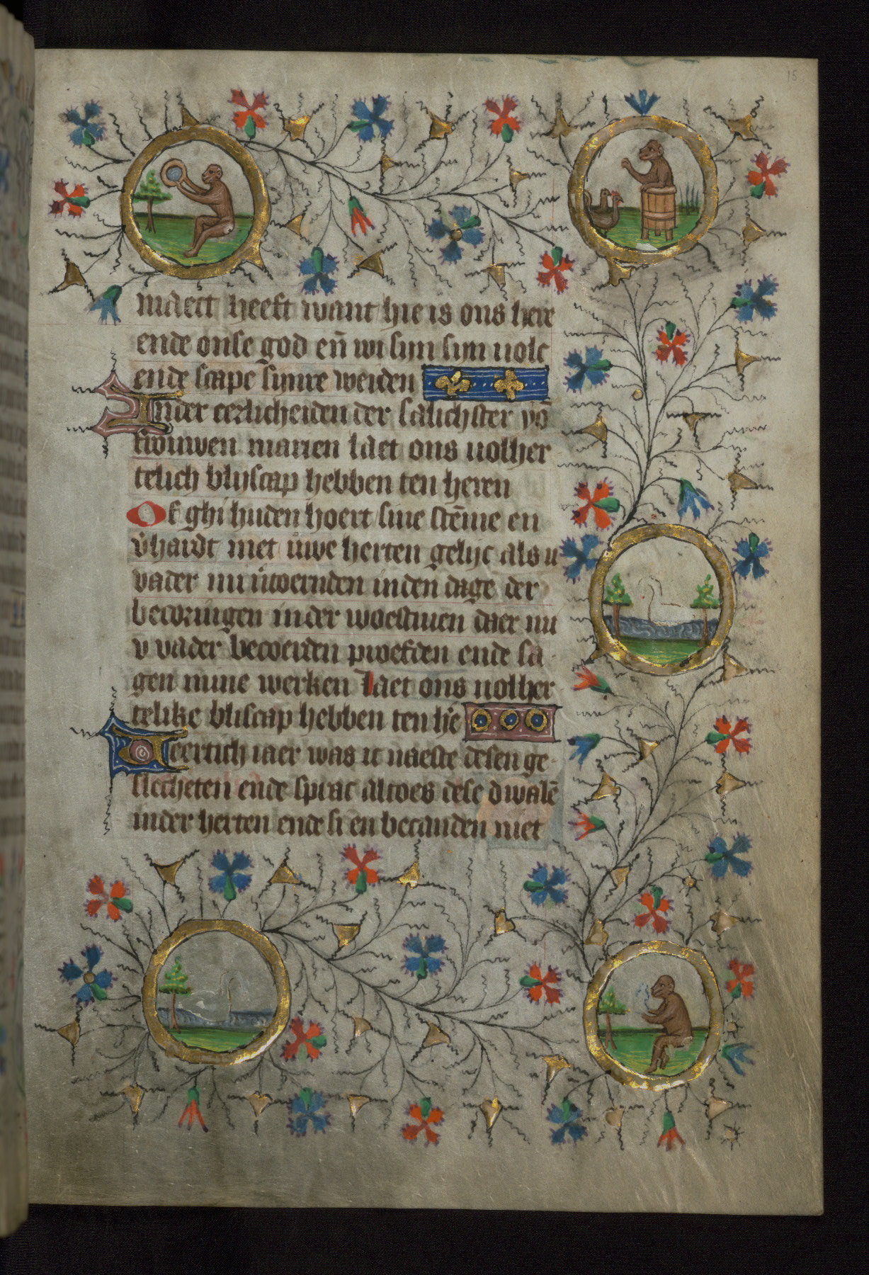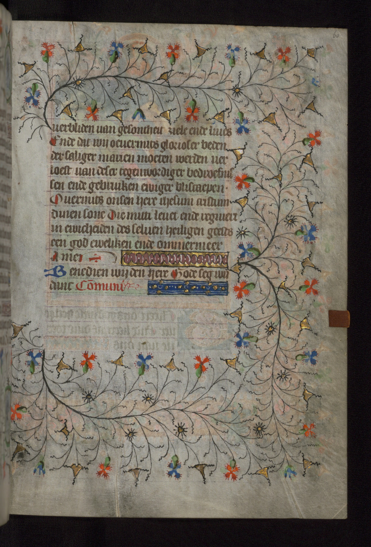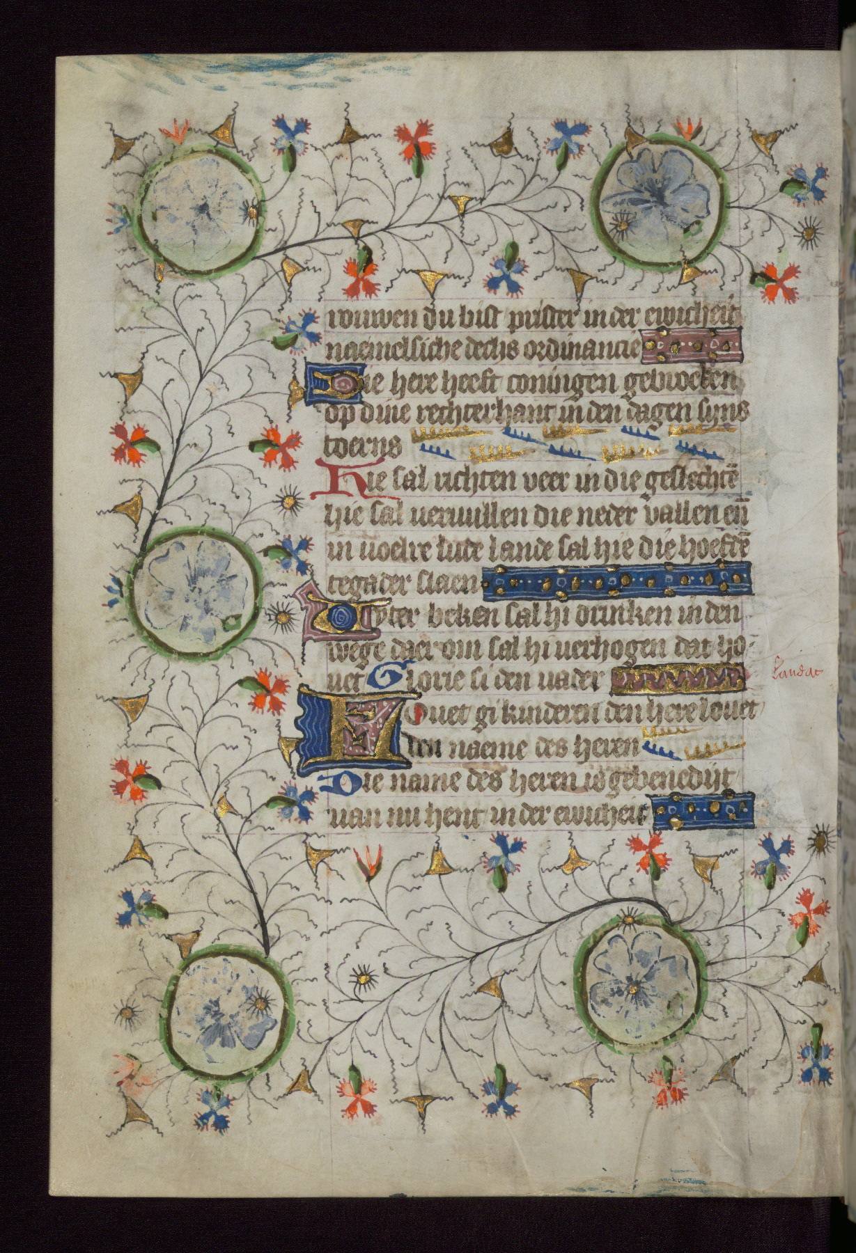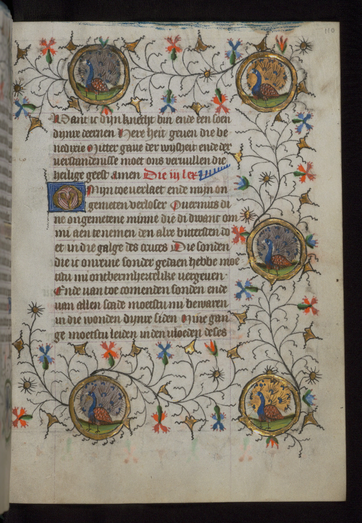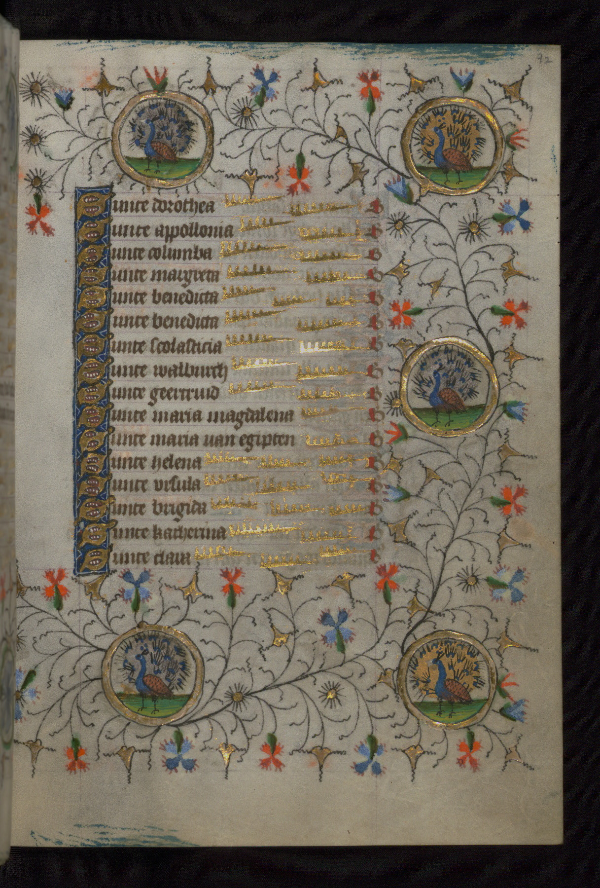 This book of hours was written in Dutch in the fifteenth century for the use of Utrecht. The Hours of the Virgin and of the Cross are accompanied here by the Dutch translation of Henry Suso's "Cursus aeternae sapientiae," a text that was particularly popular for private devotion in the Netherlands. Once owned by the English collector Lord Amherst, the manuscript is exceptional for its extensive illumination. Webs of foliage cover every margin, most sprouting medallions containing flora and fauna. The divisions in the text are marked by twenty richly painted full-page miniatures, often accompanied by related marginalia. Further illumination in the form of historiated and foliate initials marks minor breaks in the text, and the overall effect is a visual feast for the reader.