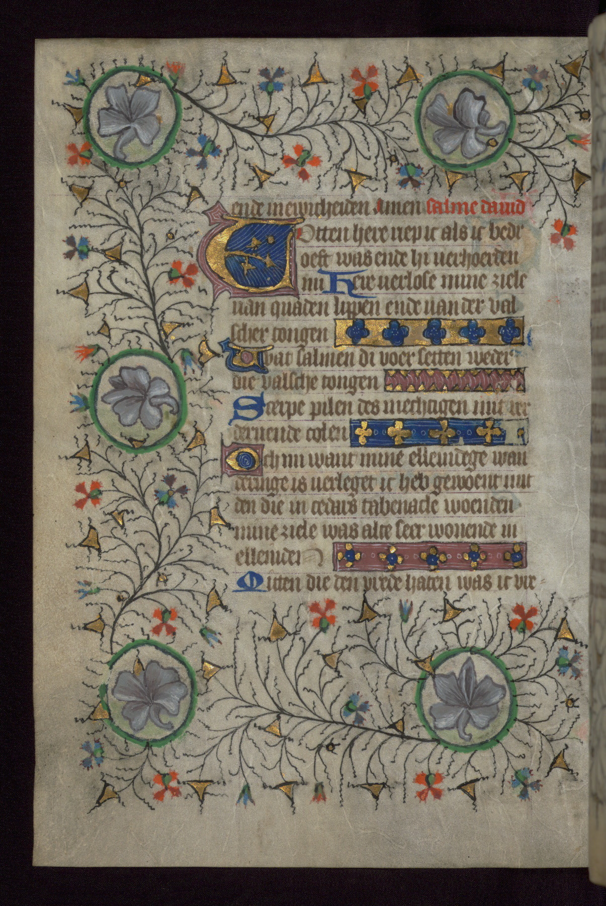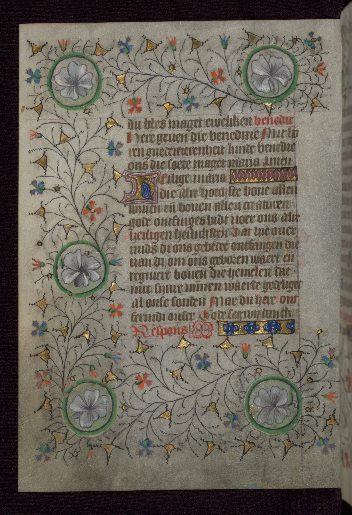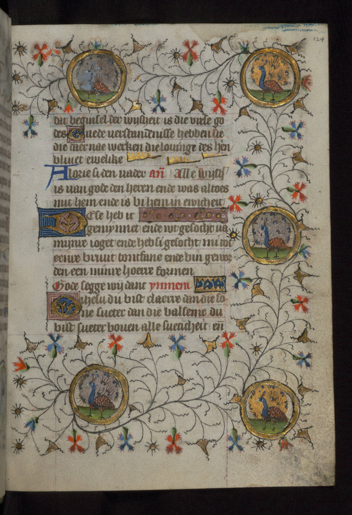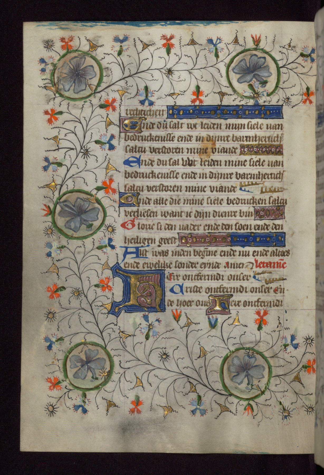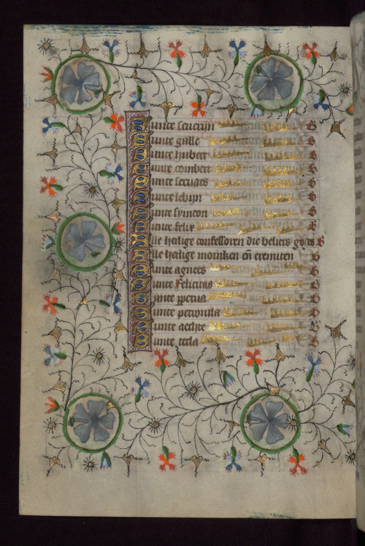 This book of hours was written in Dutch in the fifteenth century for the use of Utrecht. The Hours of the Virgin and of the Cross are accompanied here by the Dutch translation of Henry Suso's "Cursus aeternae sapientiae," a text that was particularly popular for private devotion in the Netherlands. Once owned by the English collector Lord Amherst, the manuscript is exceptional for its extensive illumination. Webs of foliage cover every margin, most sprouting medallions containing flora and fauna. The divisions in the text are marked by twenty richly painted full-page miniatures, often accompanied by related marginalia. Further illumination in the form of historiated and foliate initials marks minor breaks in the text, and the overall effect is a visual feast for the reader.
