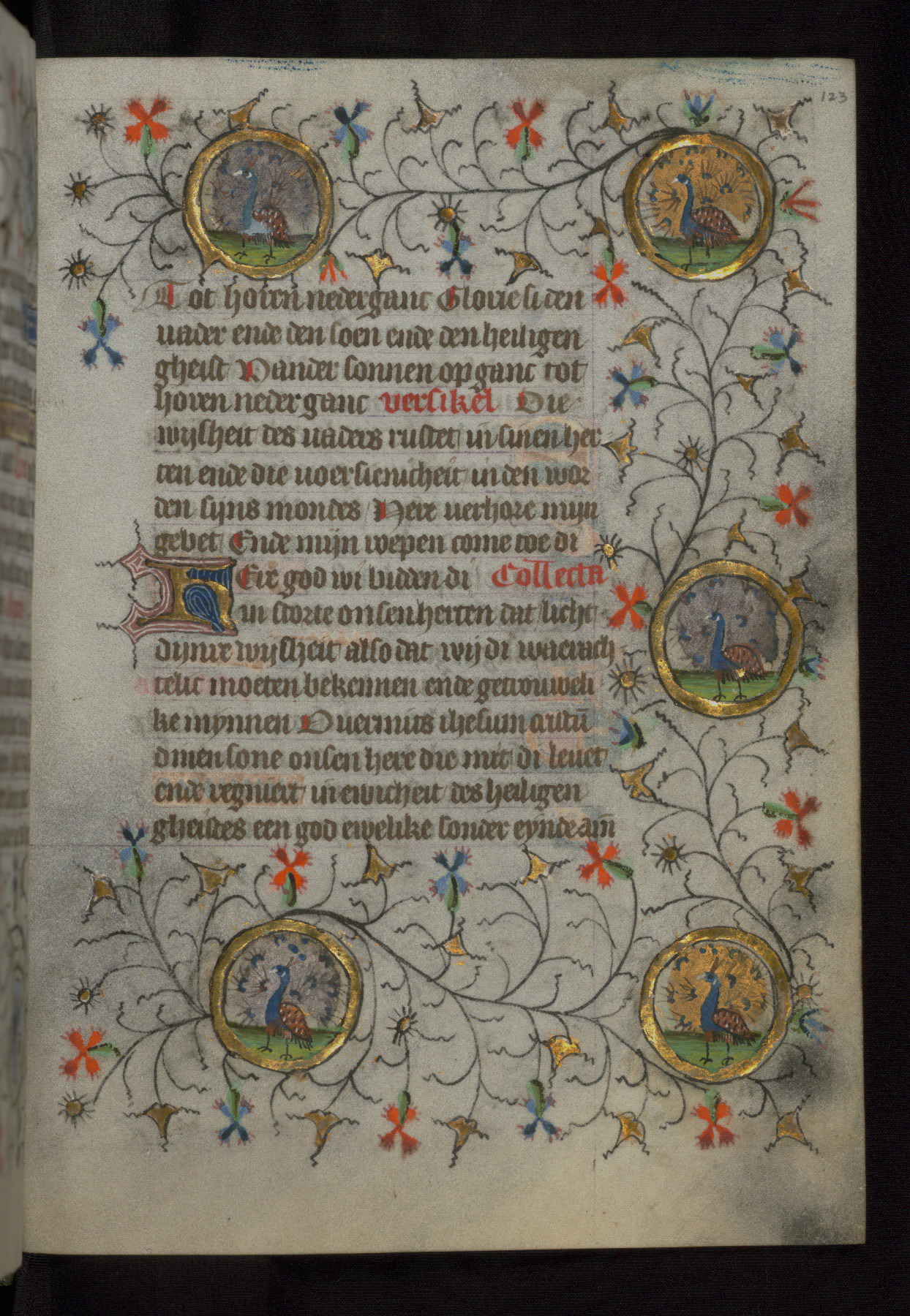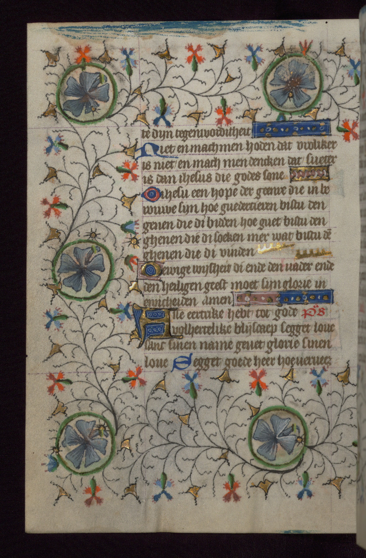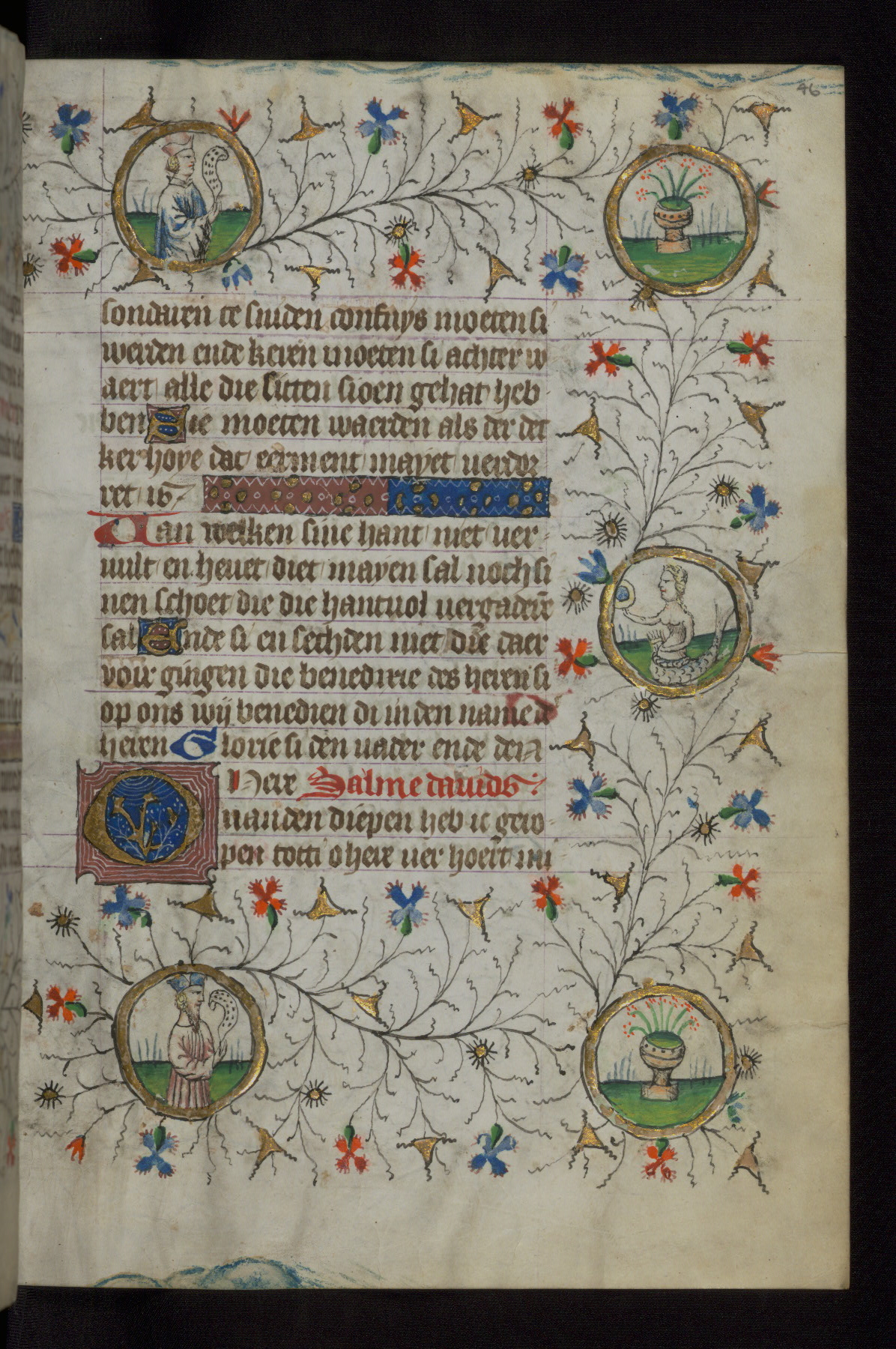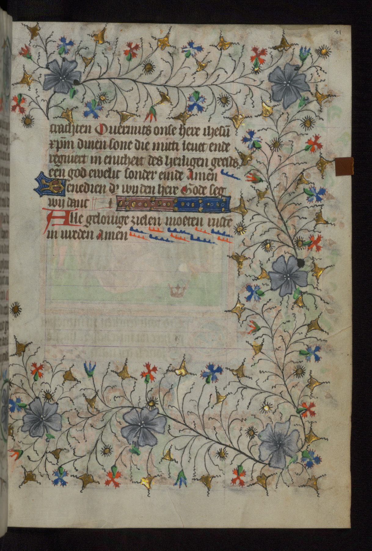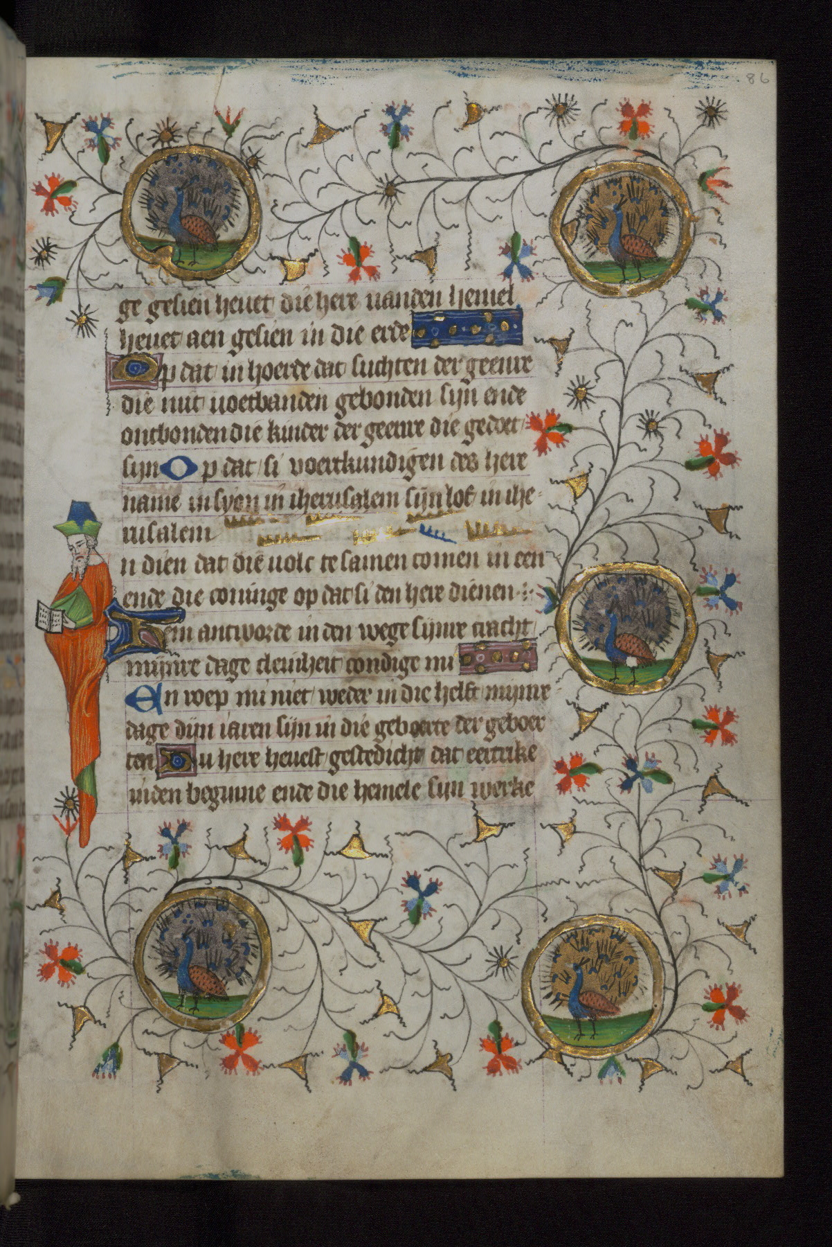 This book of hours was written in Dutch in the fifteenth century for the use of Utrecht. The Hours of the Virgin and of the Cross are accompanied here by the Dutch translation of Henry Suso's "Cursus aeternae sapientiae," a text that was particularly popular for private devotion in the Netherlands. Once owned by the English collector Lord Amherst, the manuscript is exceptional for its extensive illumination. Webs of foliage cover every margin, most sprouting medallions containing flora and fauna. The divisions in the text are marked by twenty richly painted full-page miniatures, often accompanied by related marginalia. Further illumination in the form of historiated and foliate initials marks minor breaks in the text, and the overall effect is a visual feast for the reader.