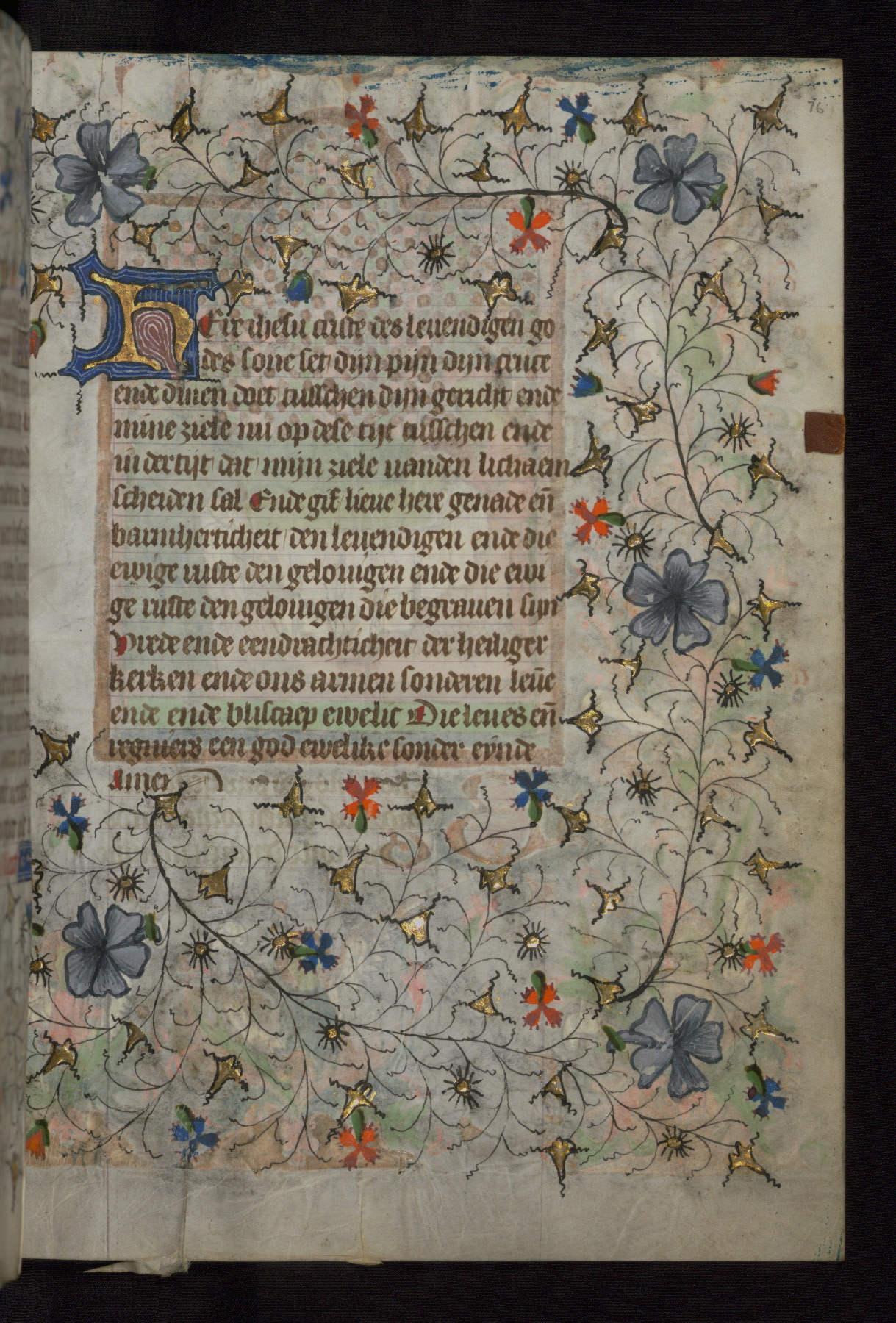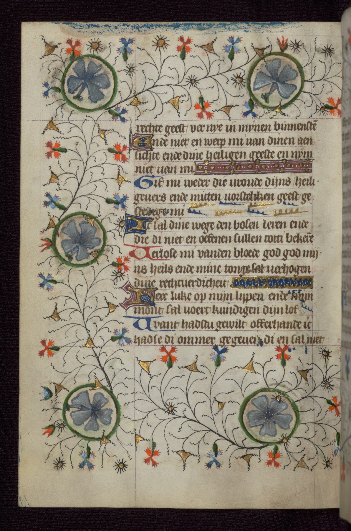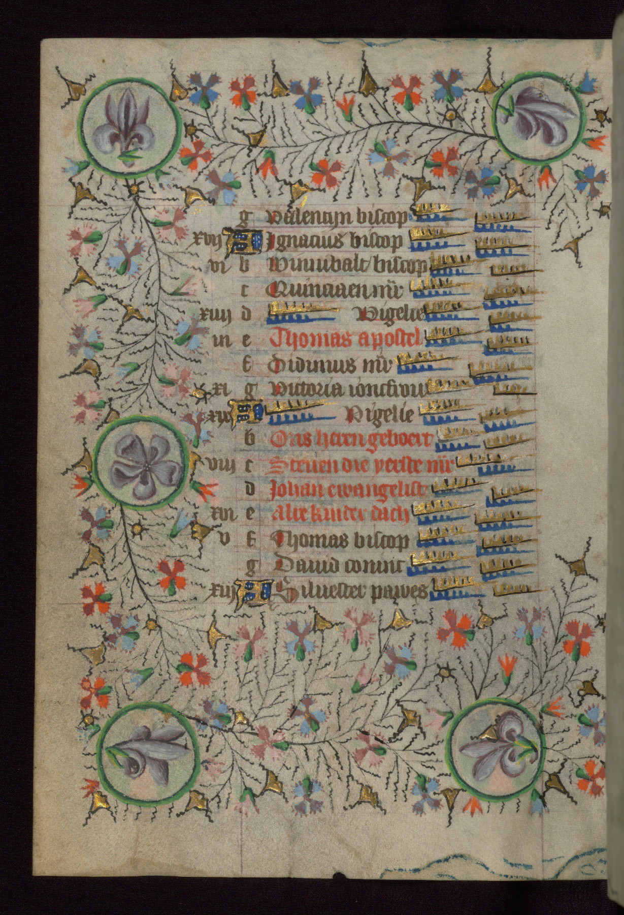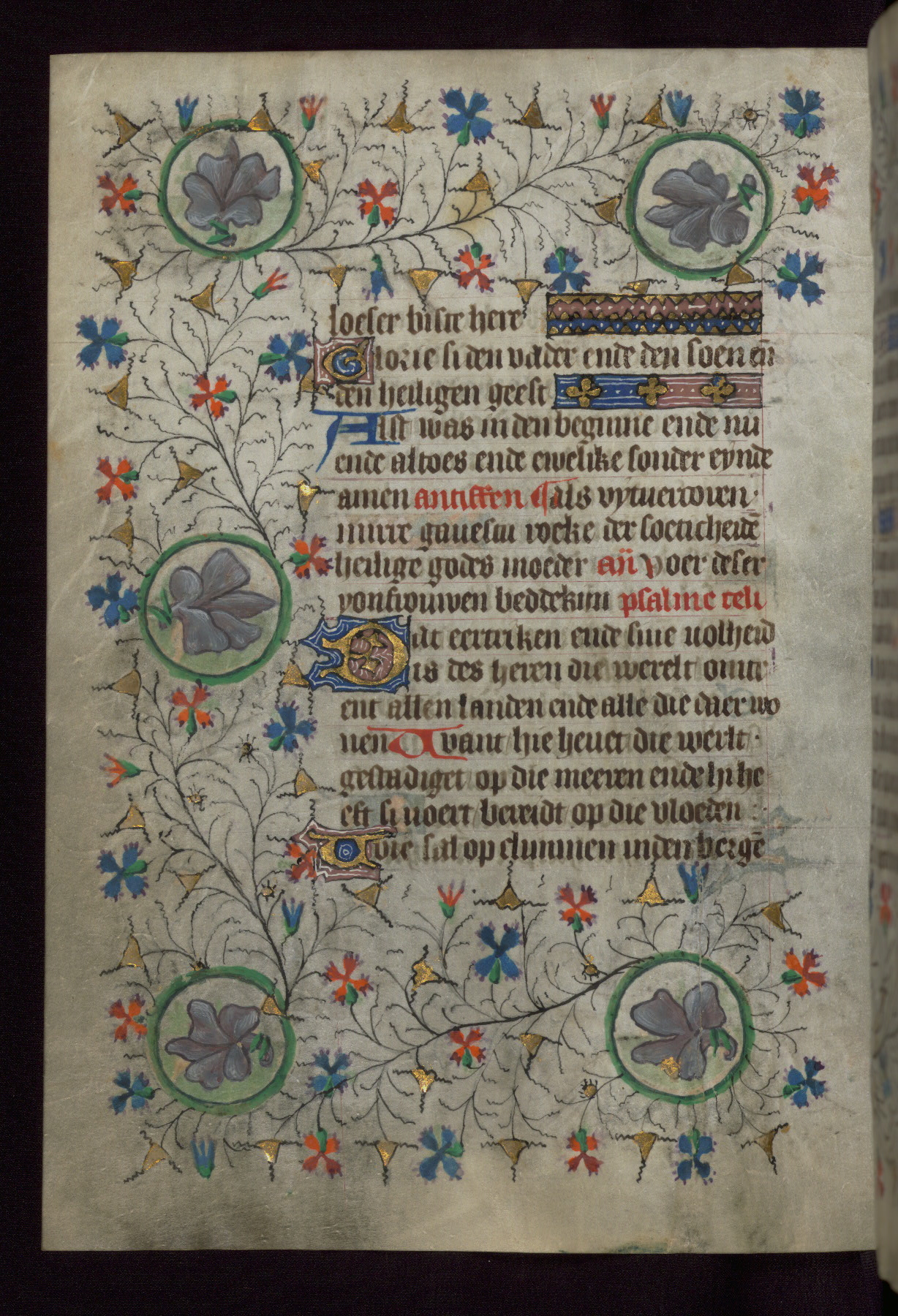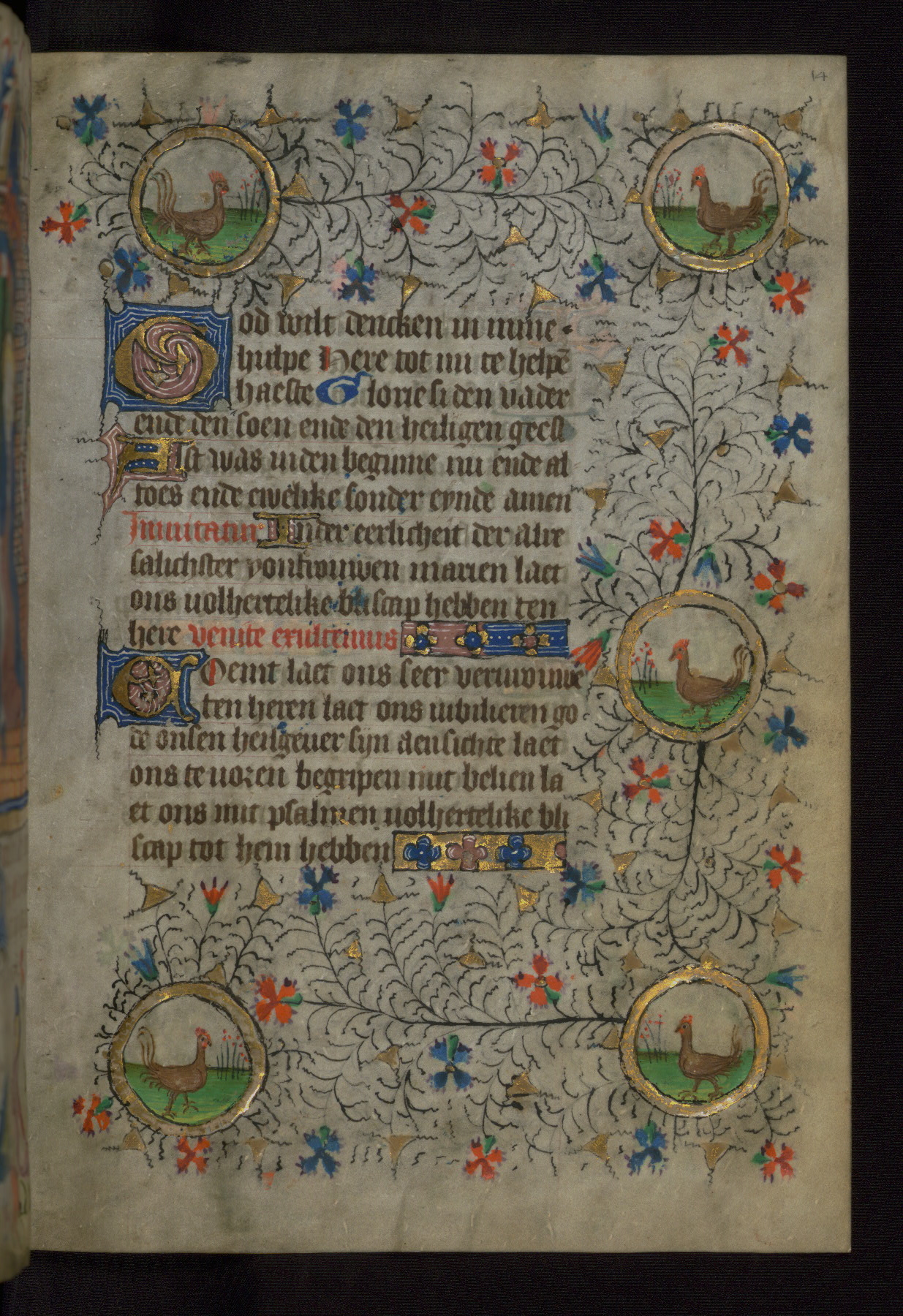 This book of hours was written in Dutch in the fifteenth century for the use of Utrecht. The Hours of the Virgin and of the Cross are accompanied here by the Dutch translation of Henry Suso's "Cursus aeternae sapientiae," a text that was particularly popular for private devotion in the Netherlands. Once owned by the English collector Lord Amherst, the manuscript is exceptional for its extensive illumination. Webs of foliage cover every margin, most sprouting medallions containing flora and fauna. The divisions in the text are marked by twenty richly painted full-page miniatures, often accompanied by related marginalia. Further illumination in the form of historiated and foliate initials marks minor breaks in the text, and the overall effect is a visual feast for the reader.