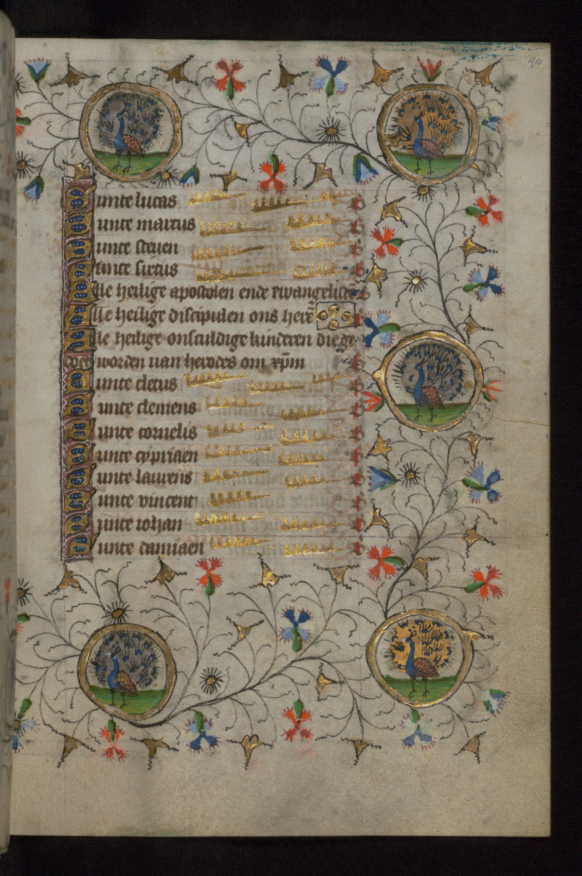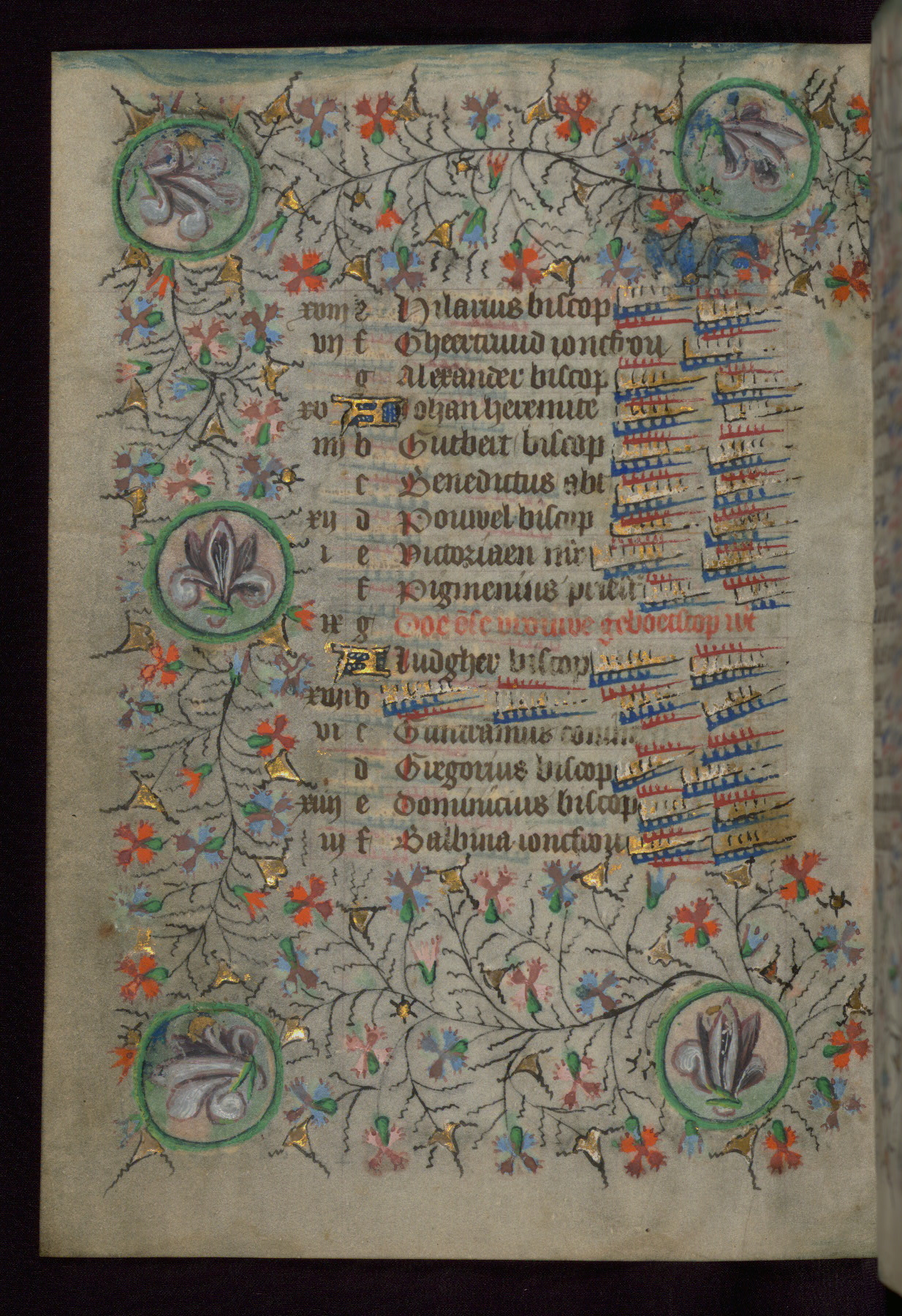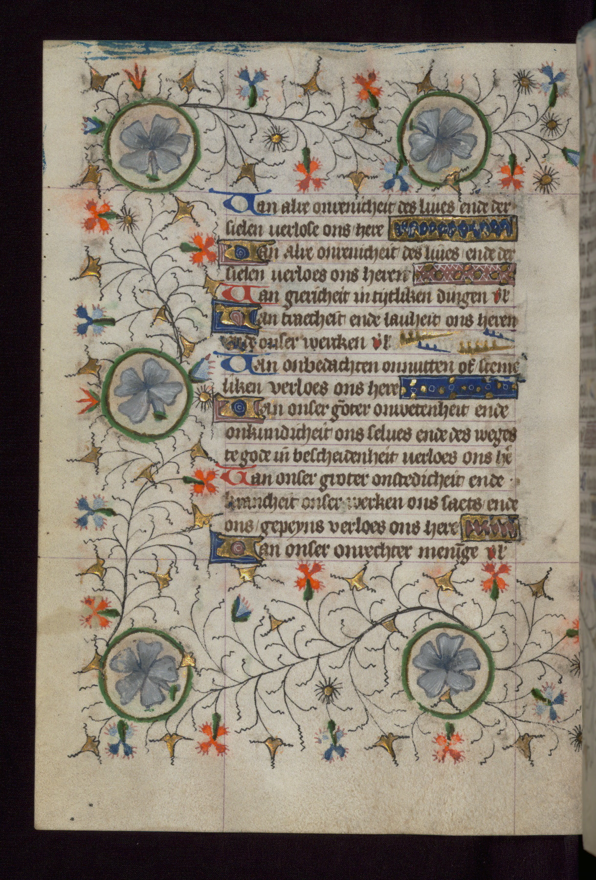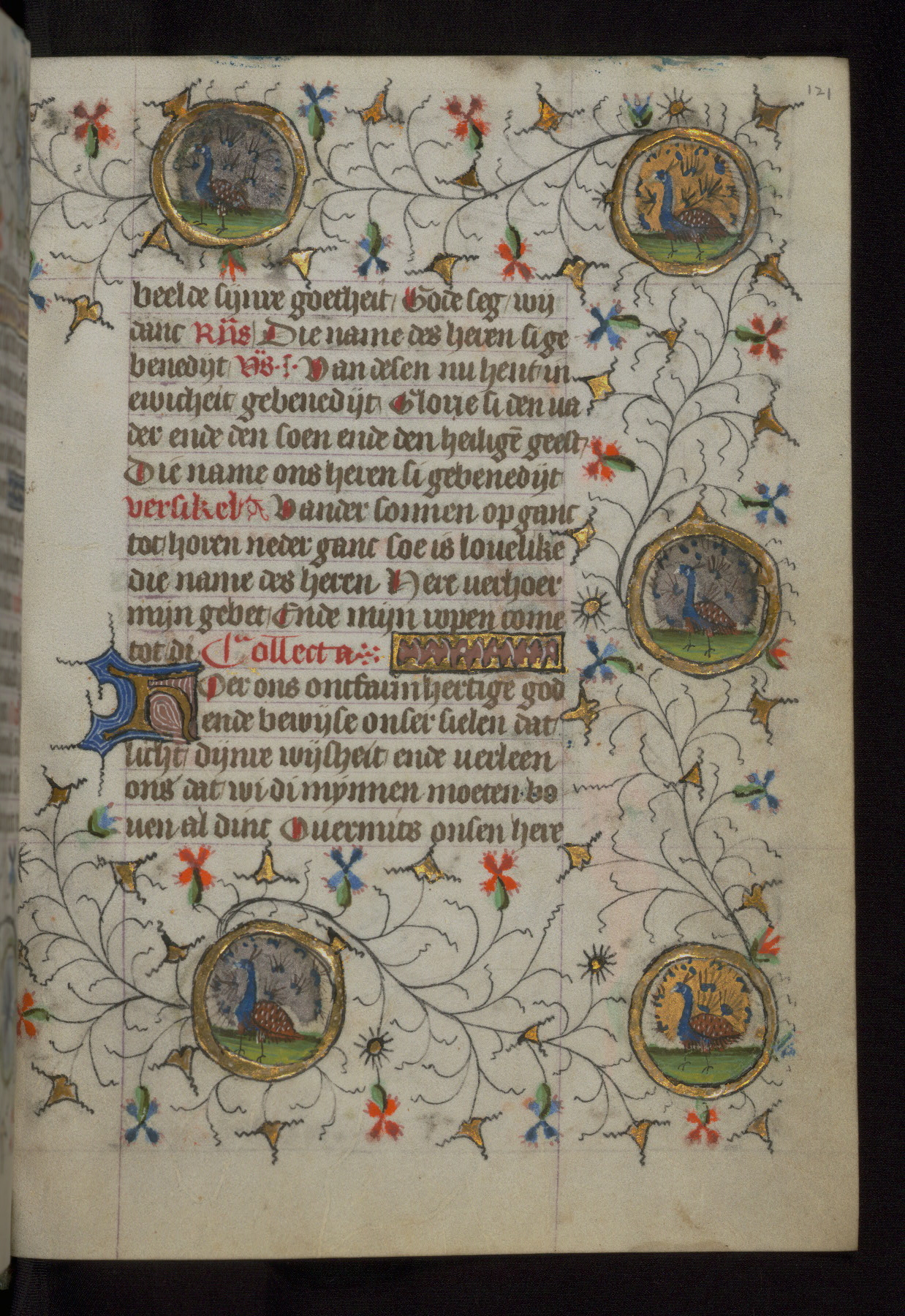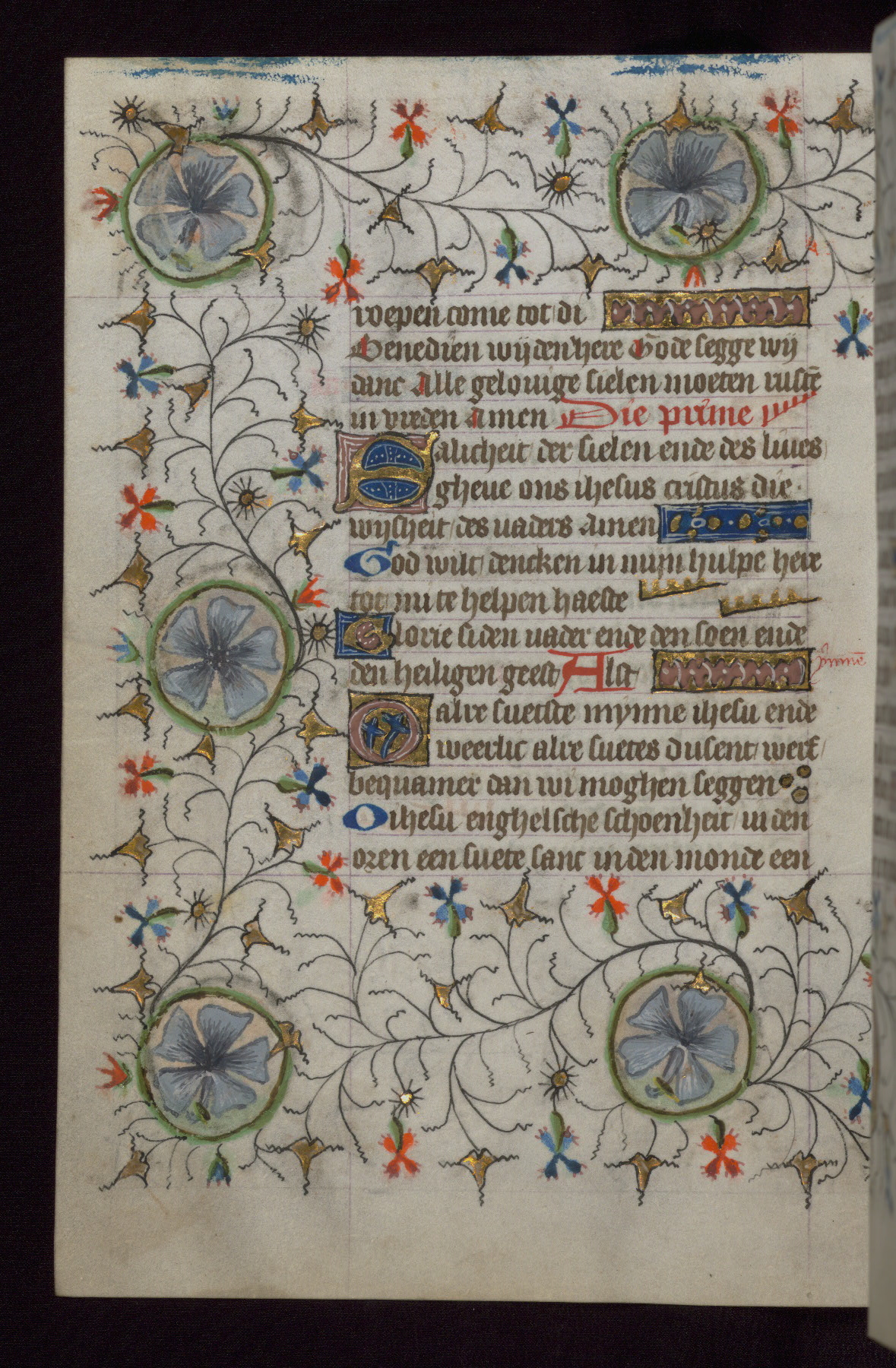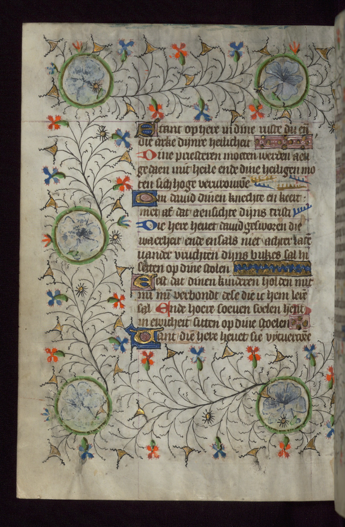 This book of hours was written in Dutch in the fifteenth century for the use of Utrecht. The Hours of the Virgin and of the Cross are accompanied here by the Dutch translation of Henry Suso's "Cursus aeternae sapientiae," a text that was particularly popular for private devotion in the Netherlands. Once owned by the English collector Lord Amherst, the manuscript is exceptional for its extensive illumination. Webs of foliage cover every margin, most sprouting medallions containing flora and fauna. The divisions in the text are marked by twenty richly painted full-page miniatures, often accompanied by related marginalia. Further illumination in the form of historiated and foliate initials marks minor breaks in the text, and the overall effect is a visual feast for the reader.