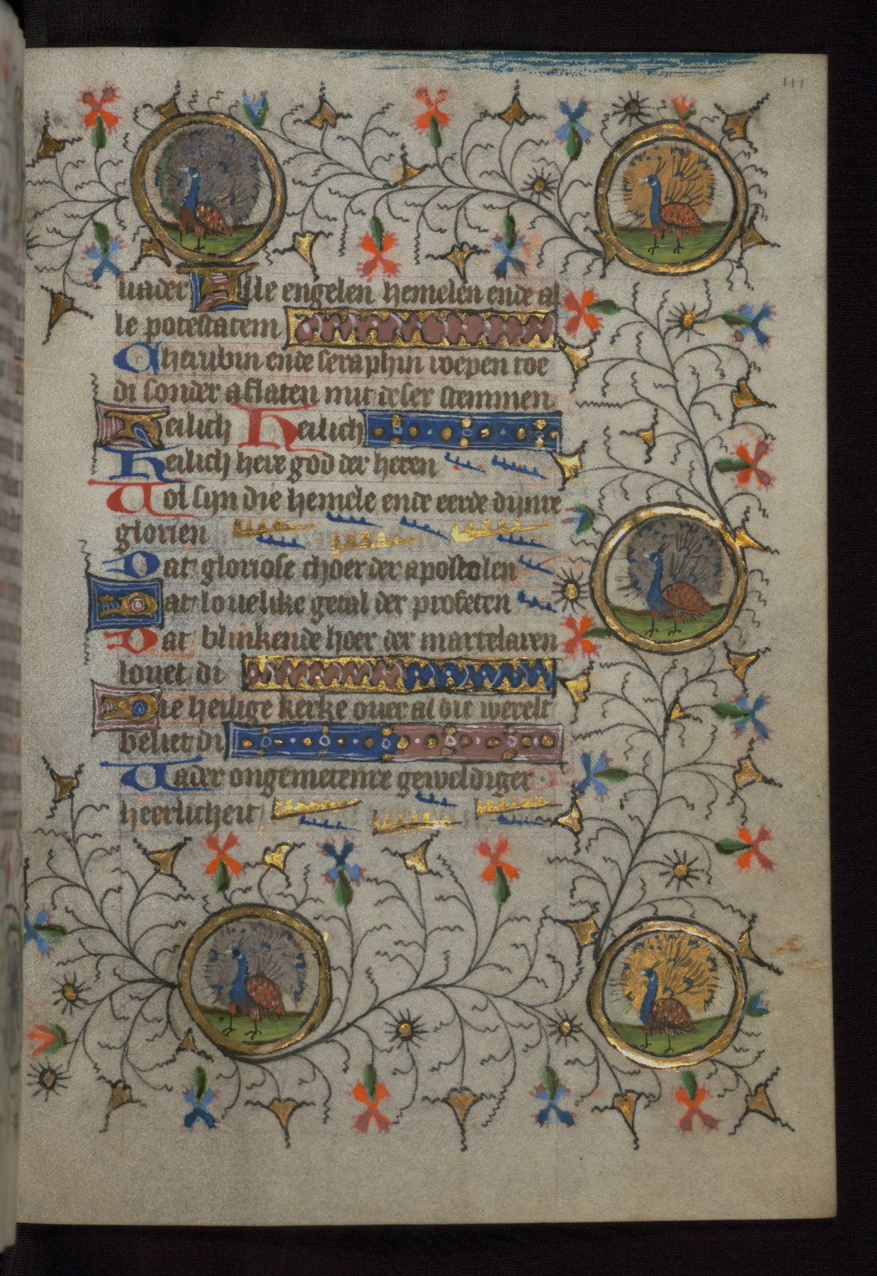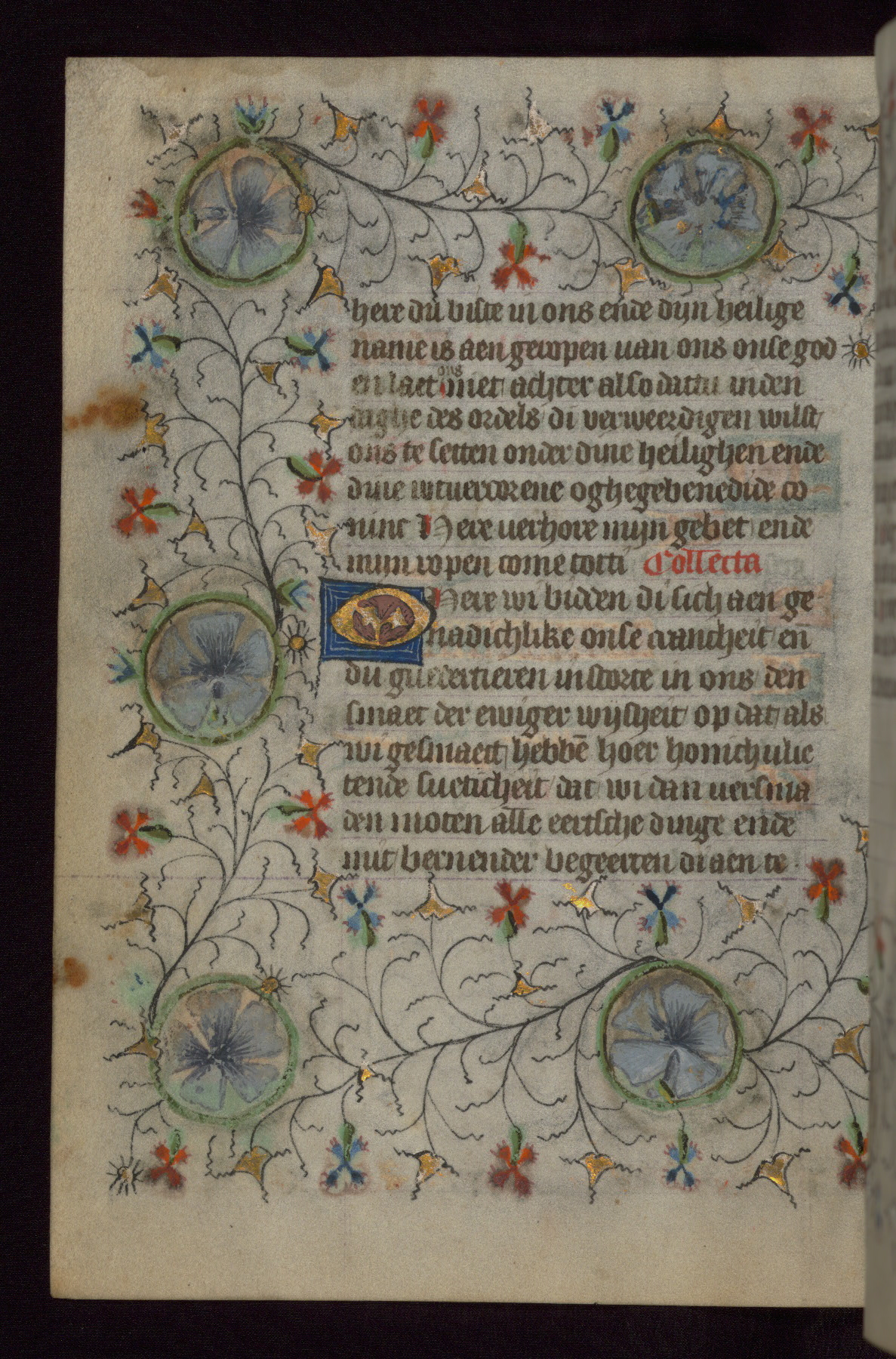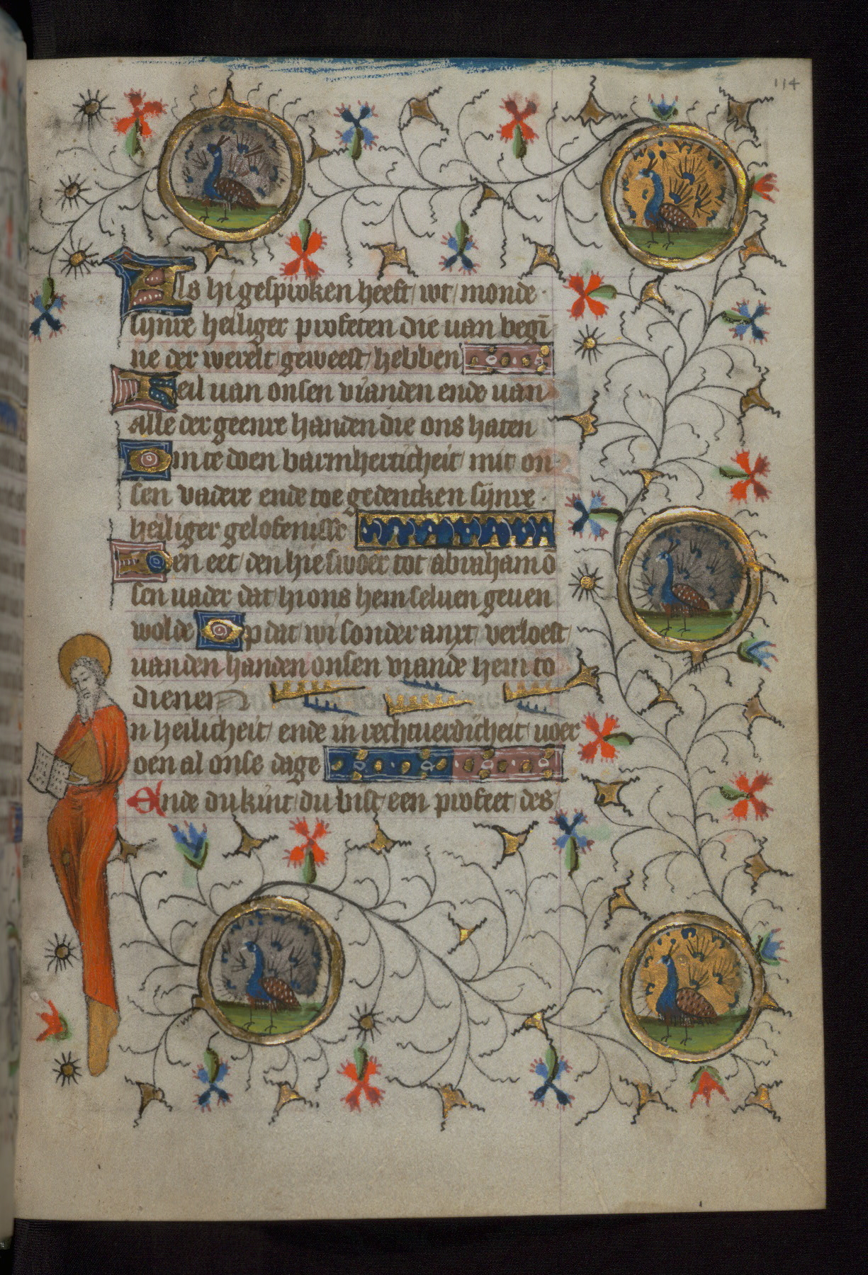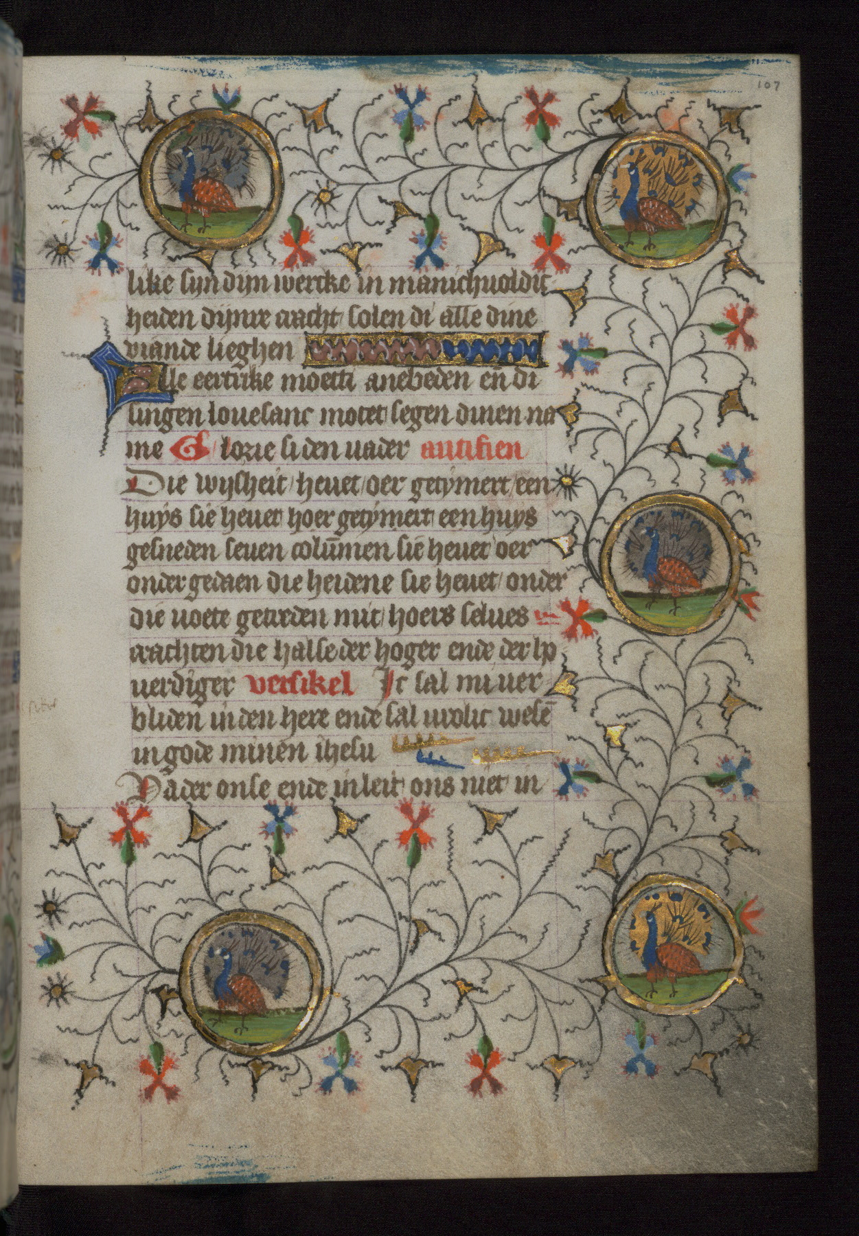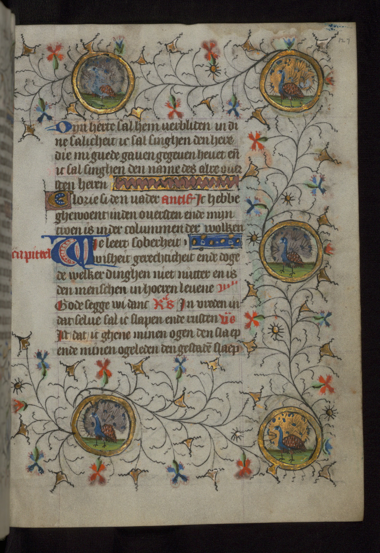 This book of hours was written in Dutch in the fifteenth century for the use of Utrecht. The Hours of the Virgin and of the Cross are accompanied here by the Dutch translation of Henry Suso's "Cursus aeternae sapientiae," a text that was particularly popular for private devotion in the Netherlands. Once owned by the English collector Lord Amherst, the manuscript is exceptional for its extensive illumination. Webs of foliage cover every margin, most sprouting medallions containing flora and fauna. The divisions in the text are marked by twenty richly painted full-page miniatures, often accompanied by related marginalia. Further illumination in the form of historiated and foliate initials marks minor breaks in the text, and the overall effect is a visual feast for the reader.