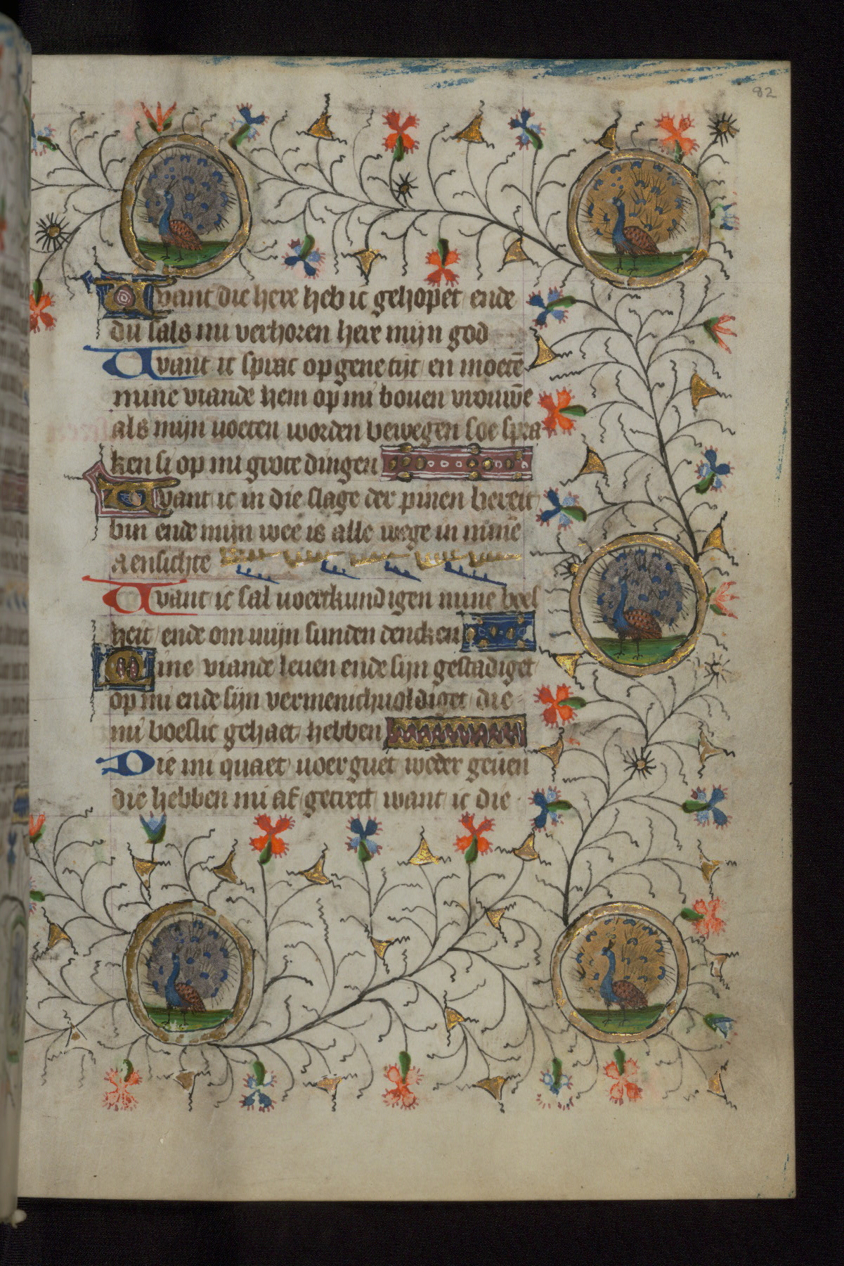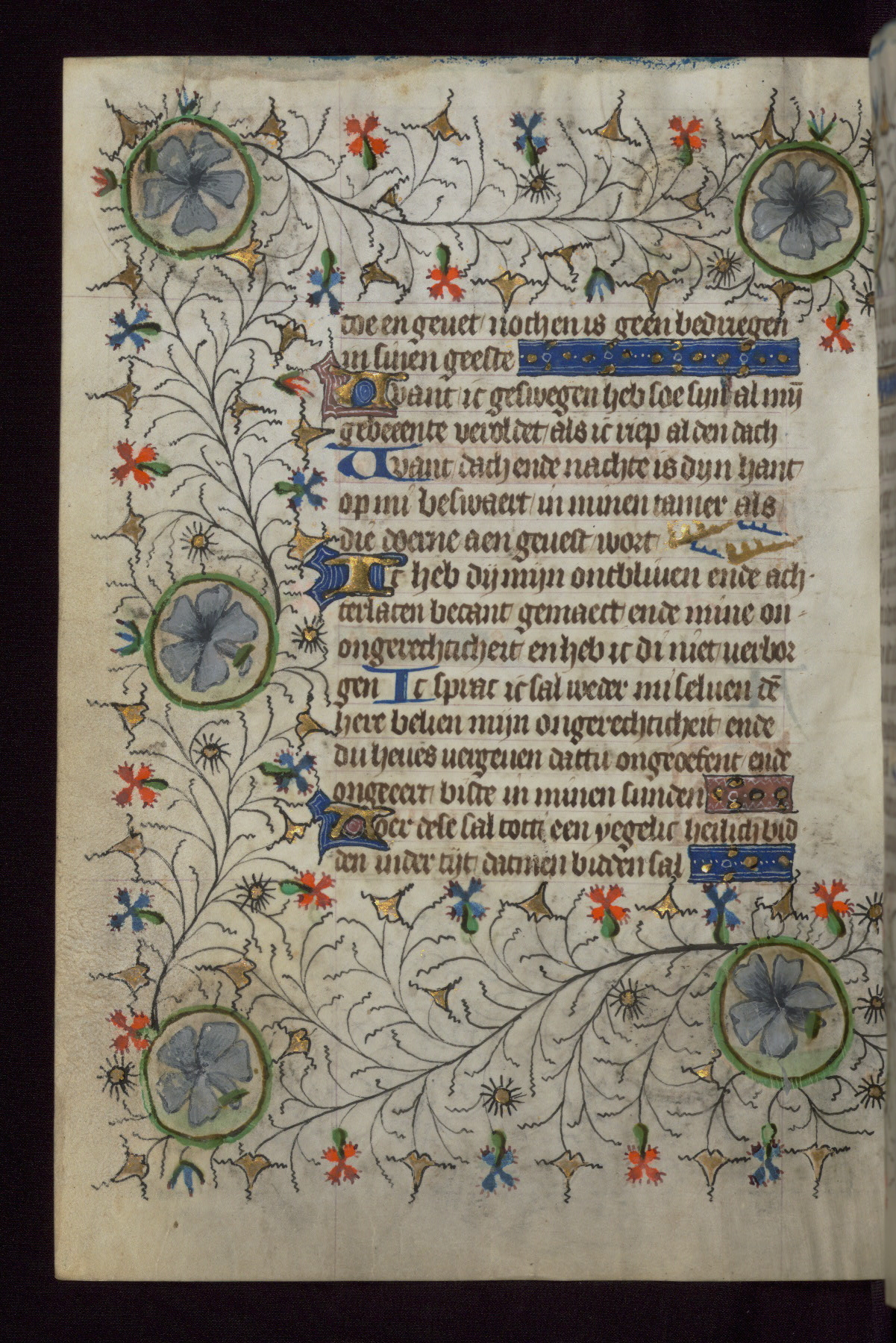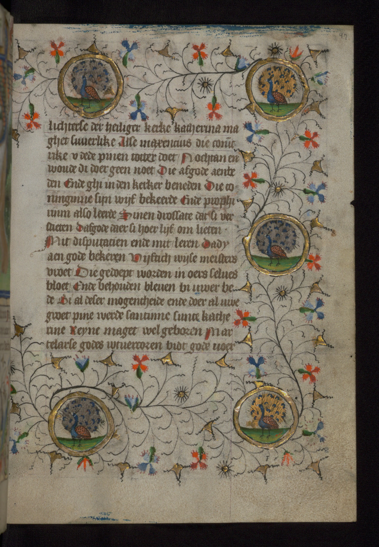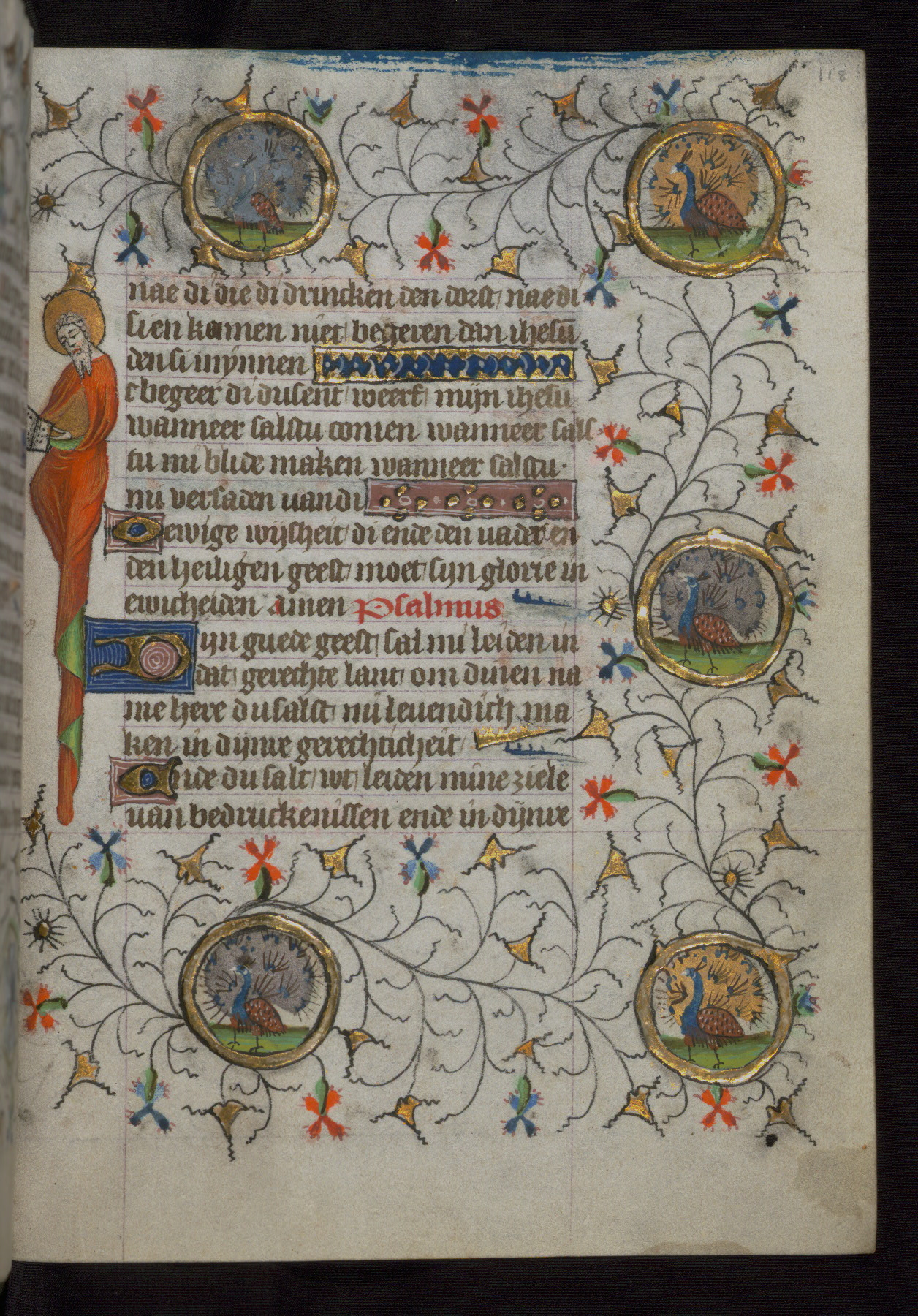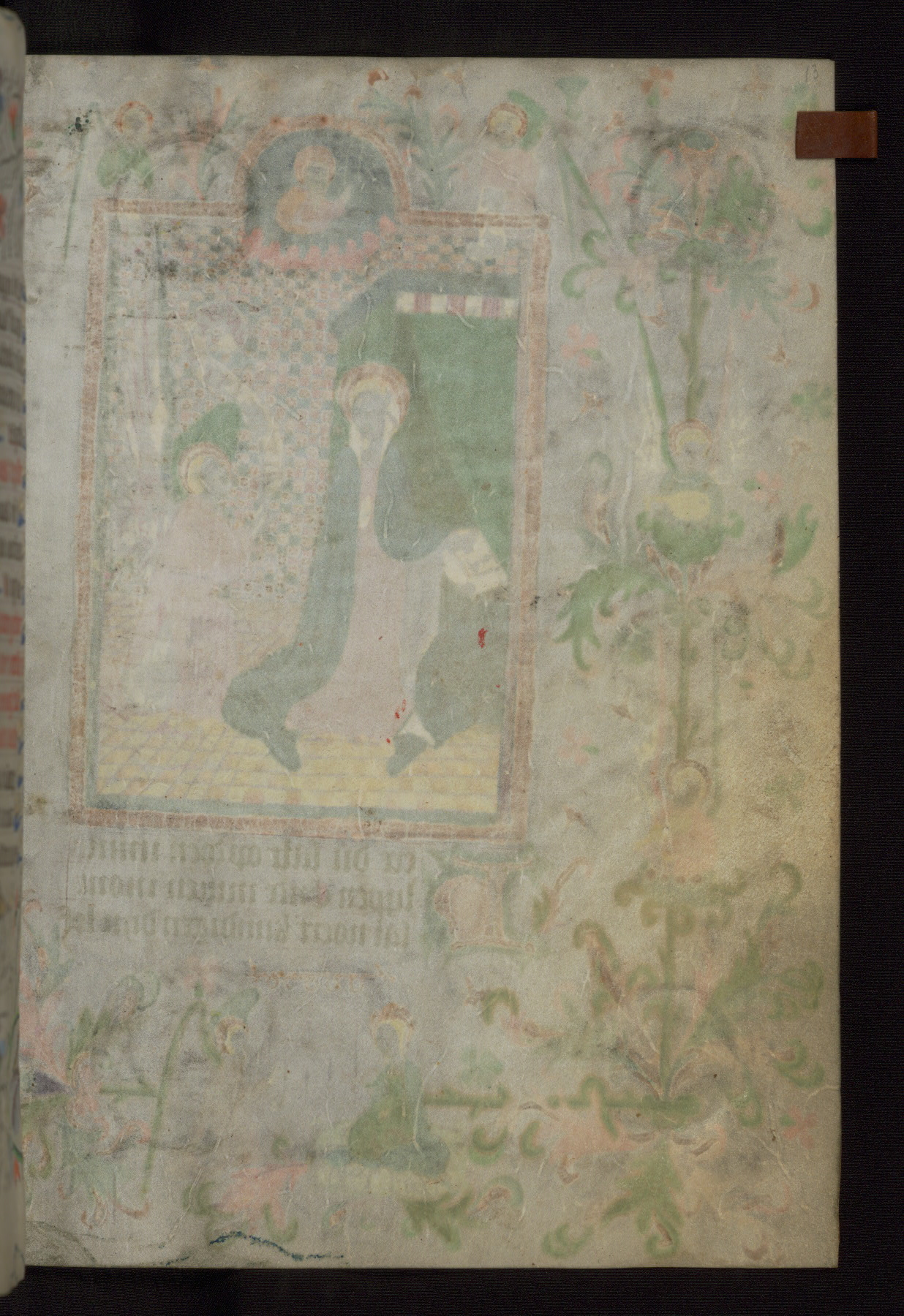 This book of hours was written in Dutch in the fifteenth century for the use of Utrecht. The Hours of the Virgin and of the Cross are accompanied here by the Dutch translation of Henry Suso's "Cursus aeternae sapientiae," a text that was particularly popular for private devotion in the Netherlands. Once owned by the English collector Lord Amherst, the manuscript is exceptional for its extensive illumination. Webs of foliage cover every margin, most sprouting medallions containing flora and fauna. The divisions in the text are marked by twenty richly painted full-page miniatures, often accompanied by related marginalia. Further illumination in the form of historiated and foliate initials marks minor breaks in the text, and the overall effect is a visual feast for the reader.