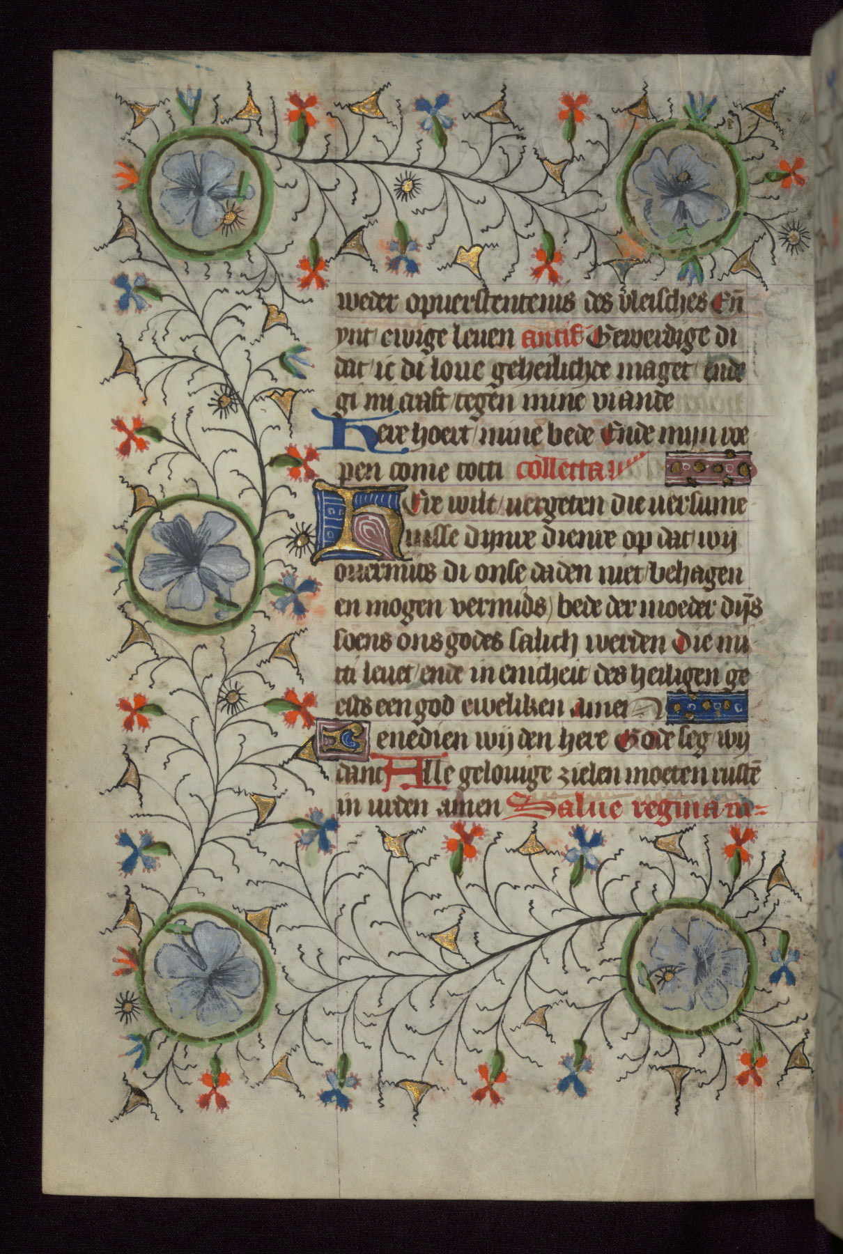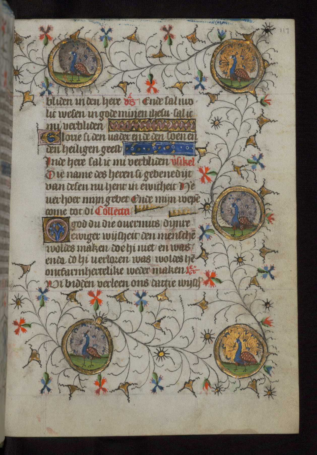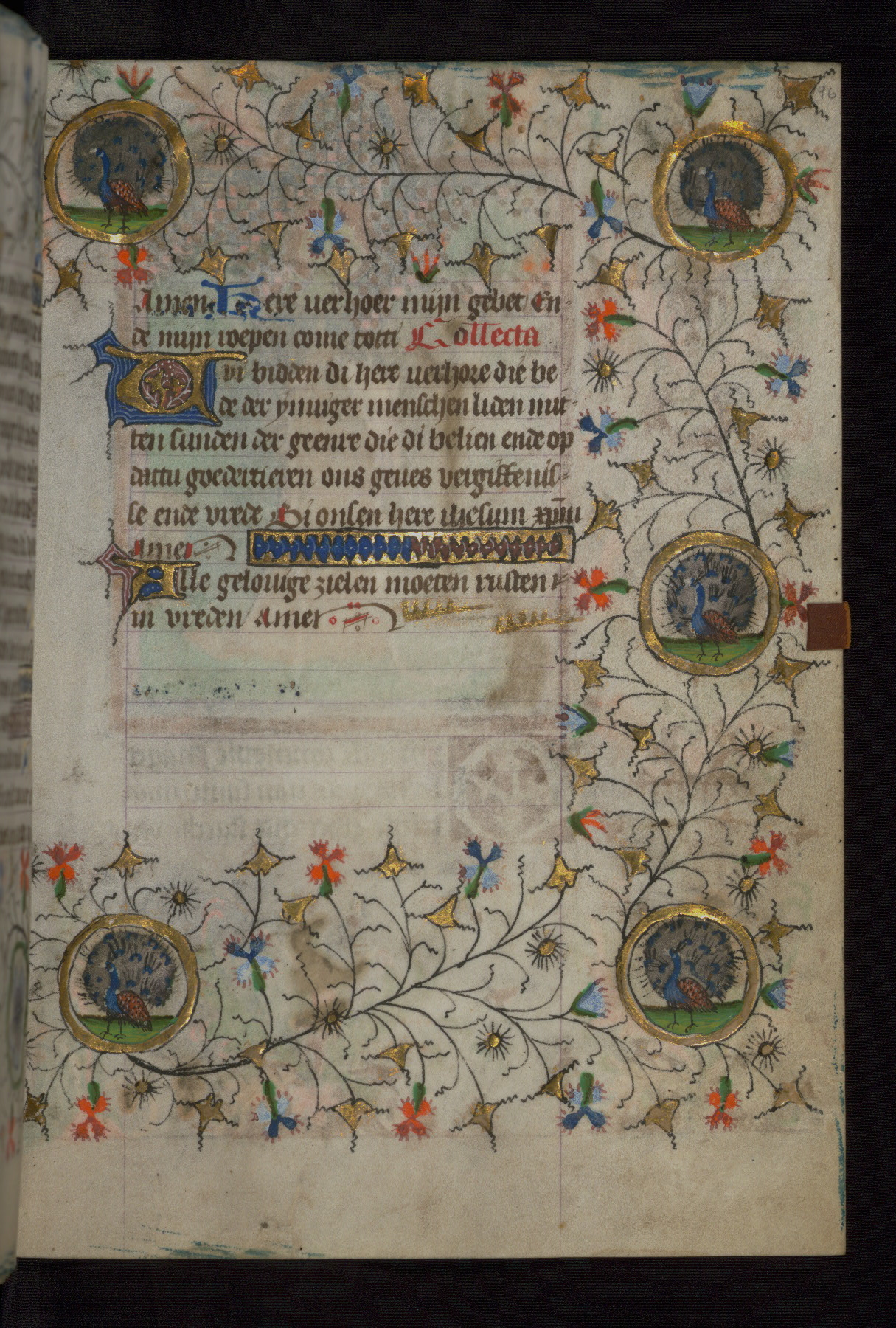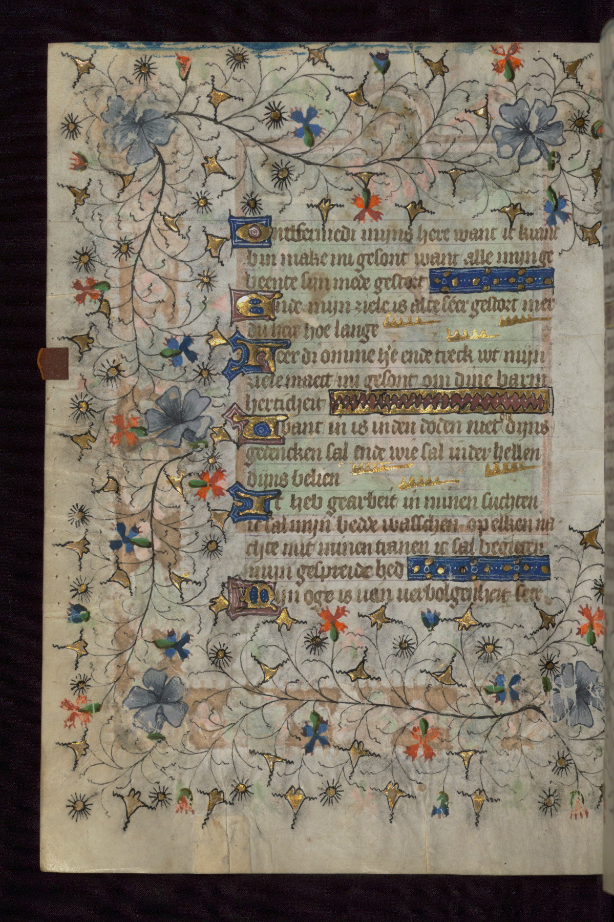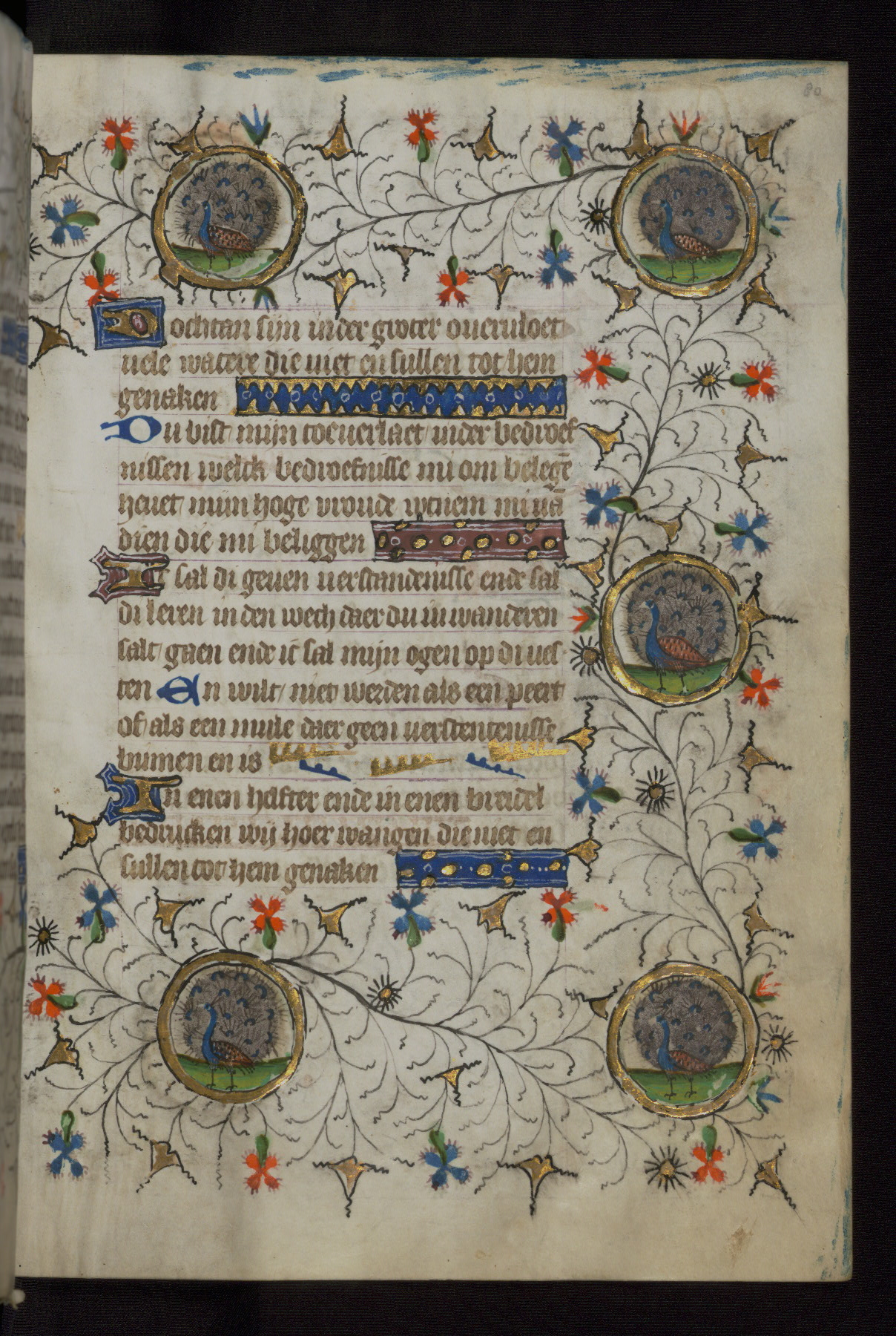 This book of hours was written in Dutch in the fifteenth century for the use of Utrecht. The Hours of the Virgin and of the Cross are accompanied here by the Dutch translation of Henry Suso's "Cursus aeternae sapientiae," a text that was particularly popular for private devotion in the Netherlands. Once owned by the English collector Lord Amherst, the manuscript is exceptional for its extensive illumination. Webs of foliage cover every margin, most sprouting medallions containing flora and fauna. The divisions in the text are marked by twenty richly painted full-page miniatures, often accompanied by related marginalia. Further illumination in the form of historiated and foliate initials marks minor breaks in the text, and the overall effect is a visual feast for the reader.