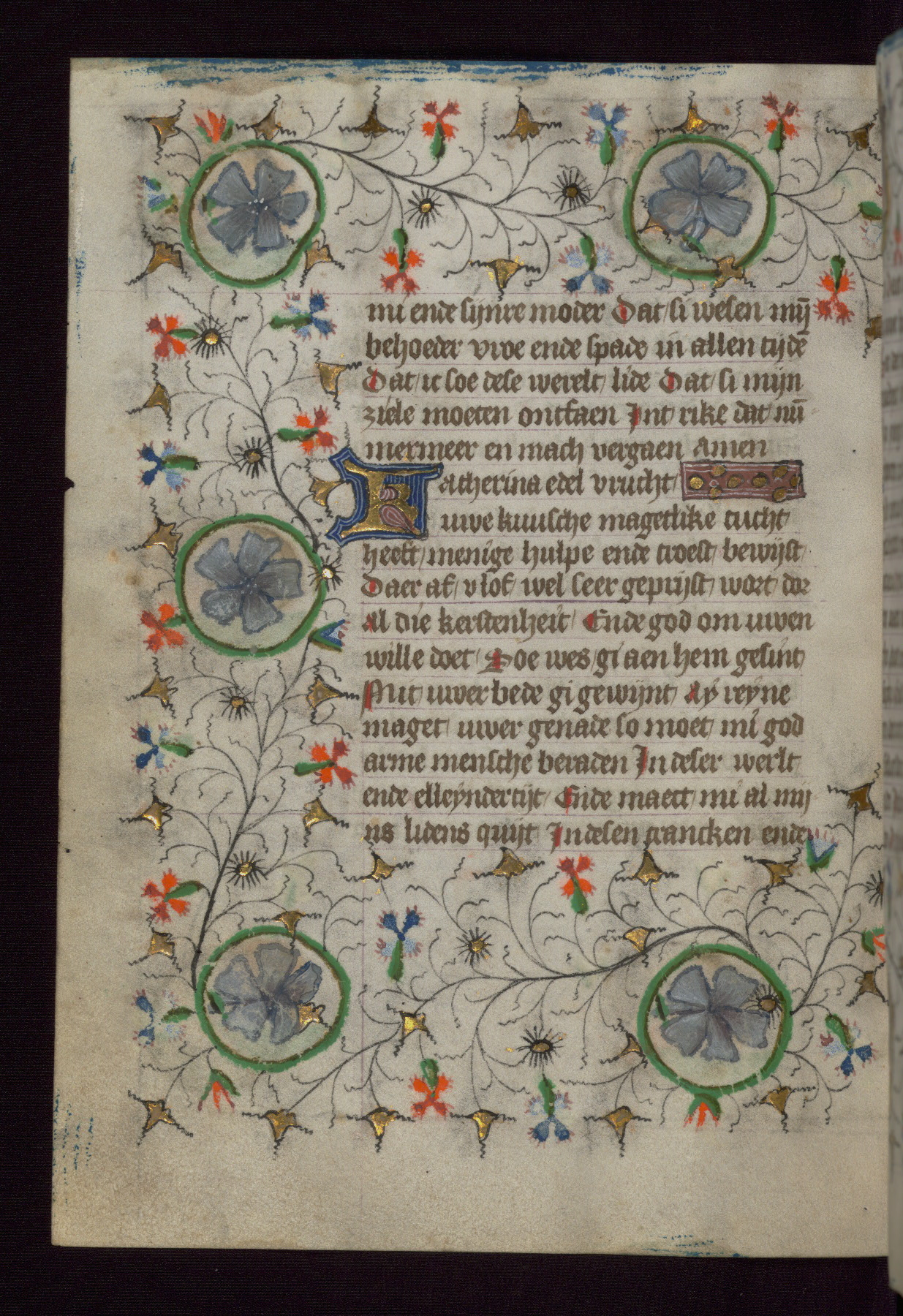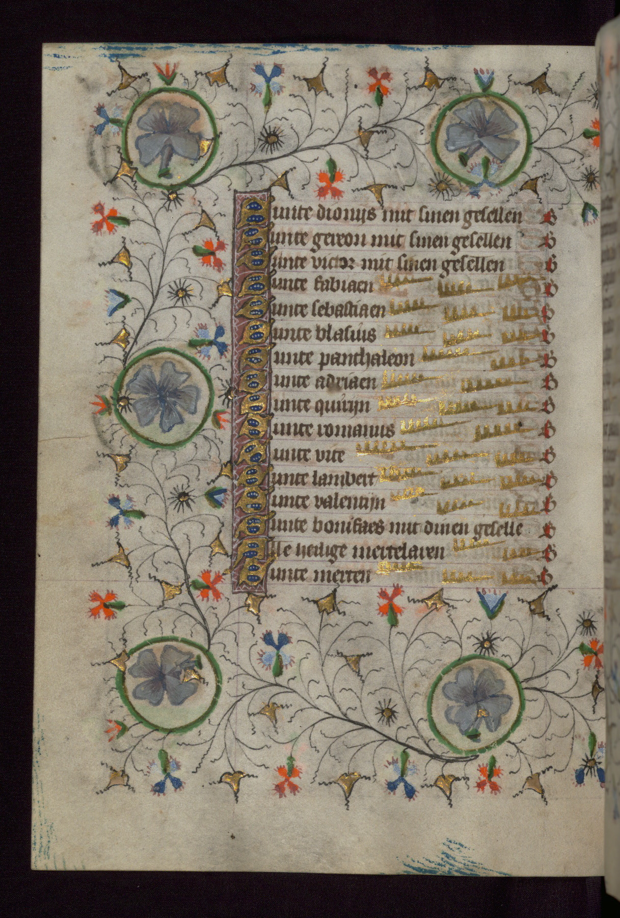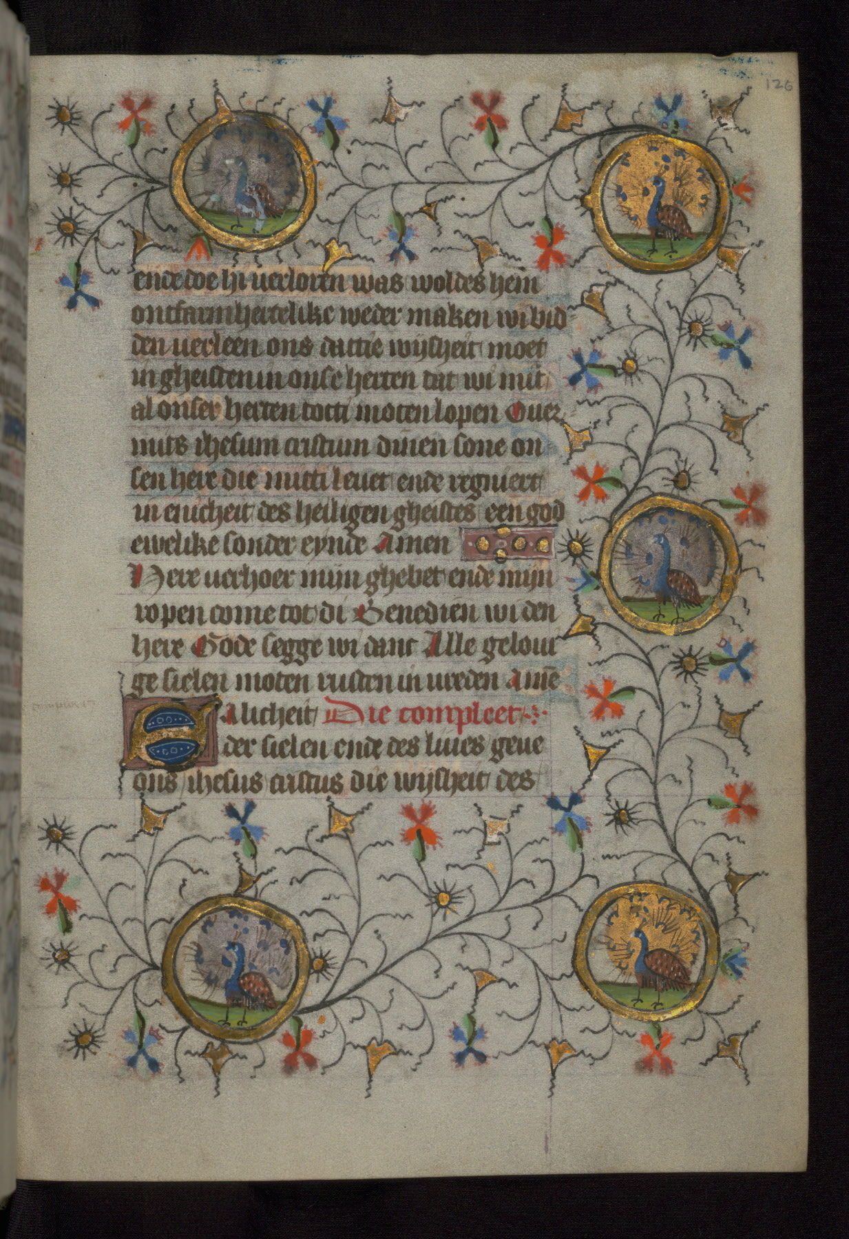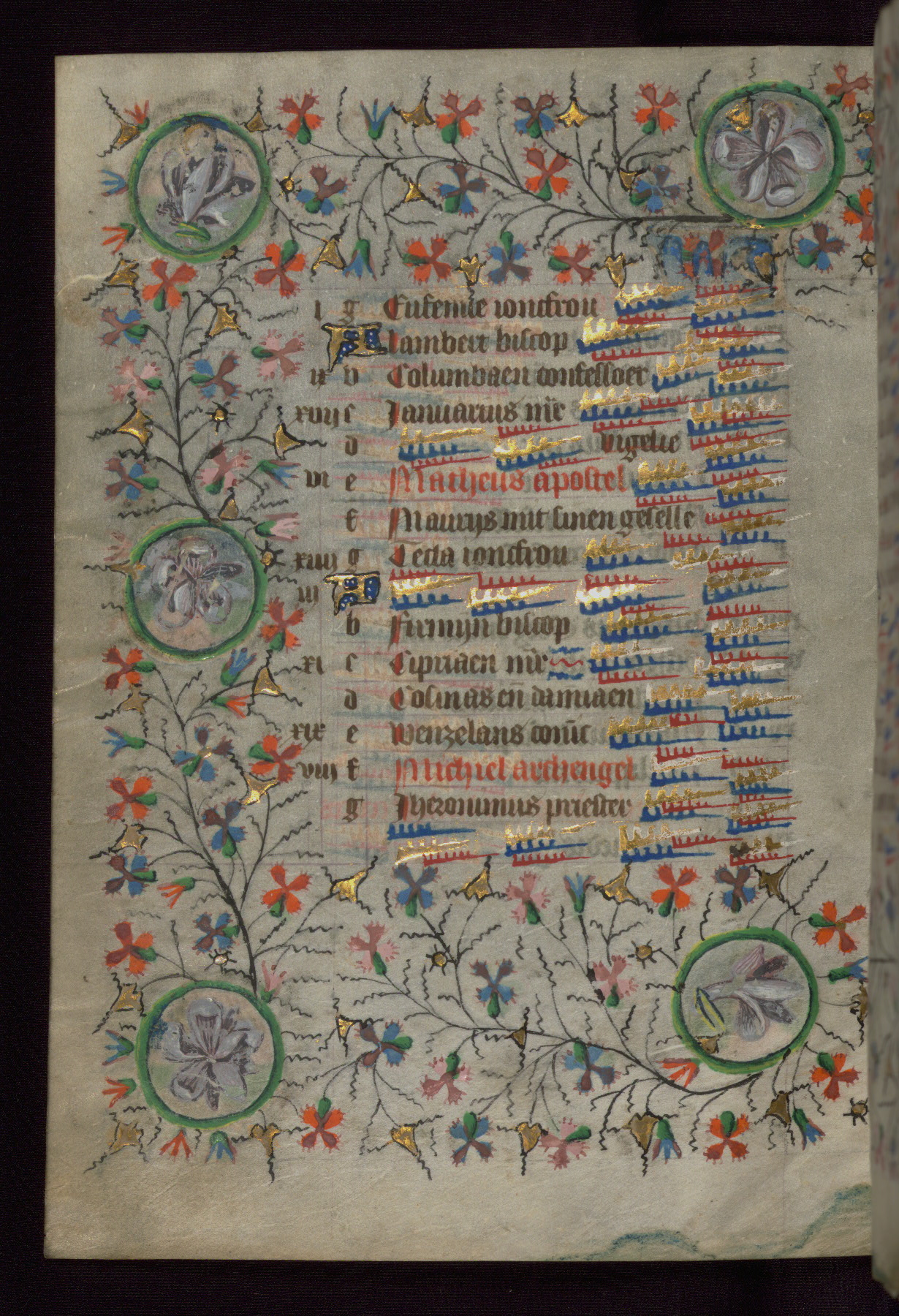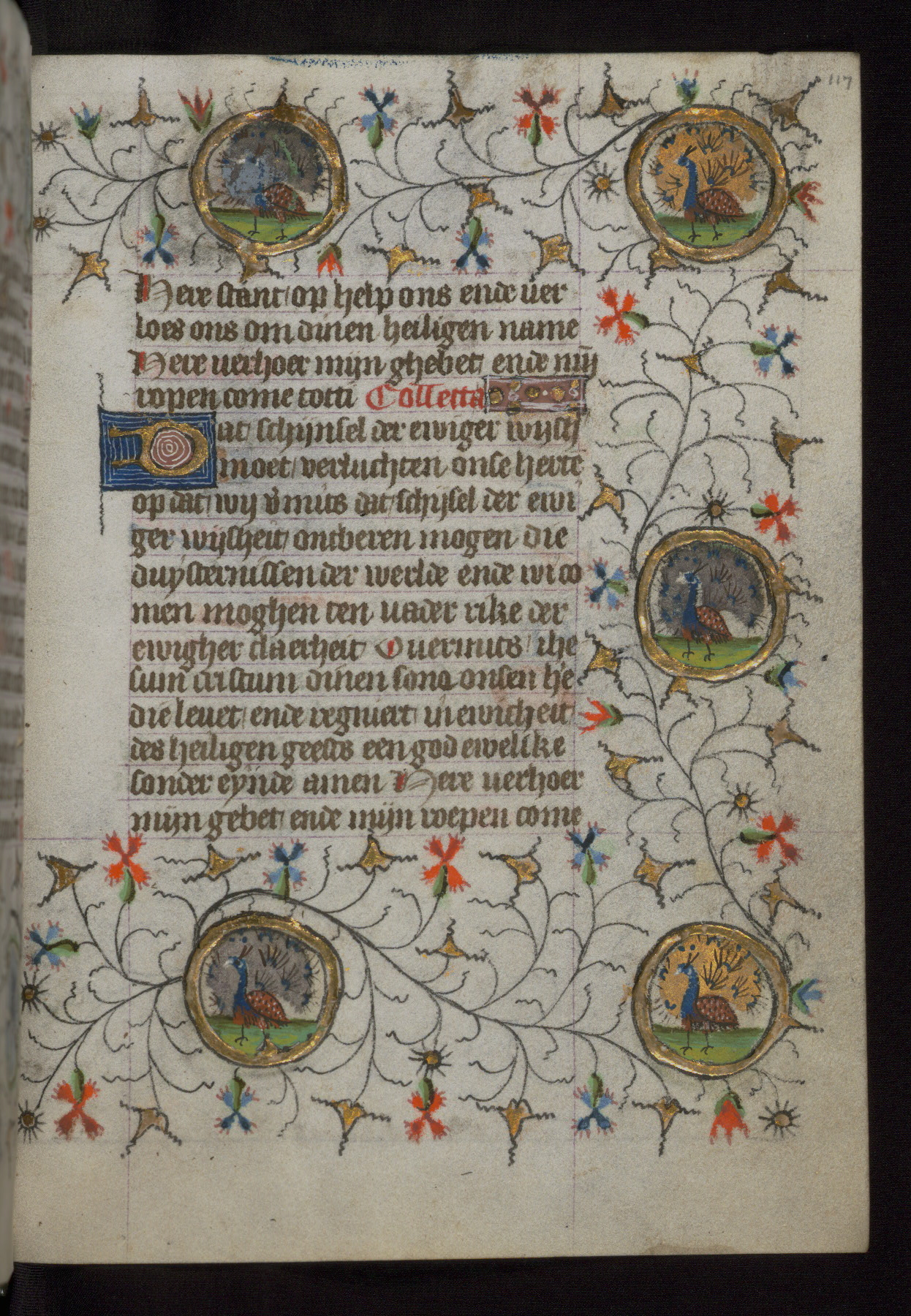 This book of hours was written in Dutch in the fifteenth century for the use of Utrecht. The Hours of the Virgin and of the Cross are accompanied here by the Dutch translation of Henry Suso's "Cursus aeternae sapientiae," a text that was particularly popular for private devotion in the Netherlands. Once owned by the English collector Lord Amherst, the manuscript is exceptional for its extensive illumination. Webs of foliage cover every margin, most sprouting medallions containing flora and fauna. The divisions in the text are marked by twenty richly painted full-page miniatures, often accompanied by related marginalia. Further illumination in the form of historiated and foliate initials marks minor breaks in the text, and the overall effect is a visual feast for the reader.