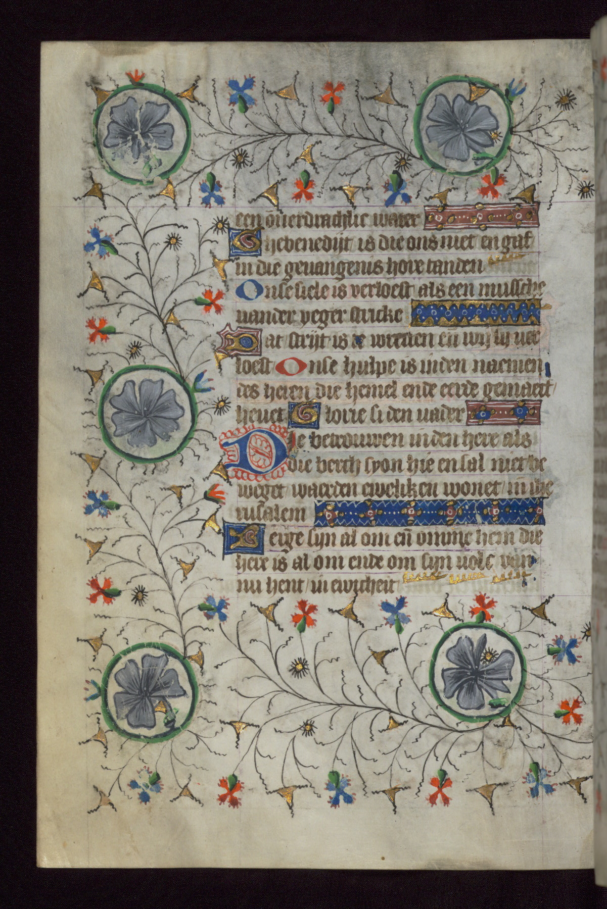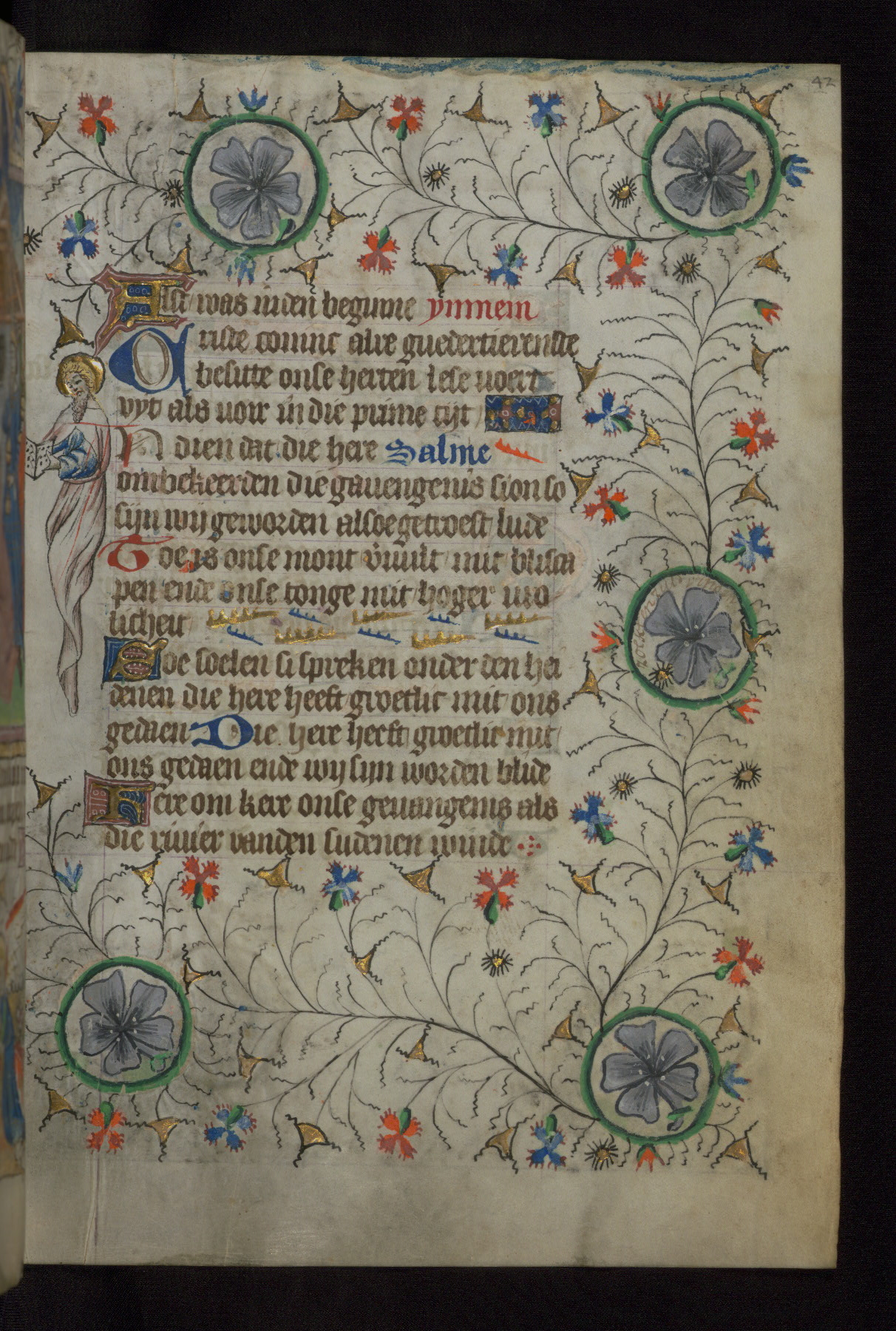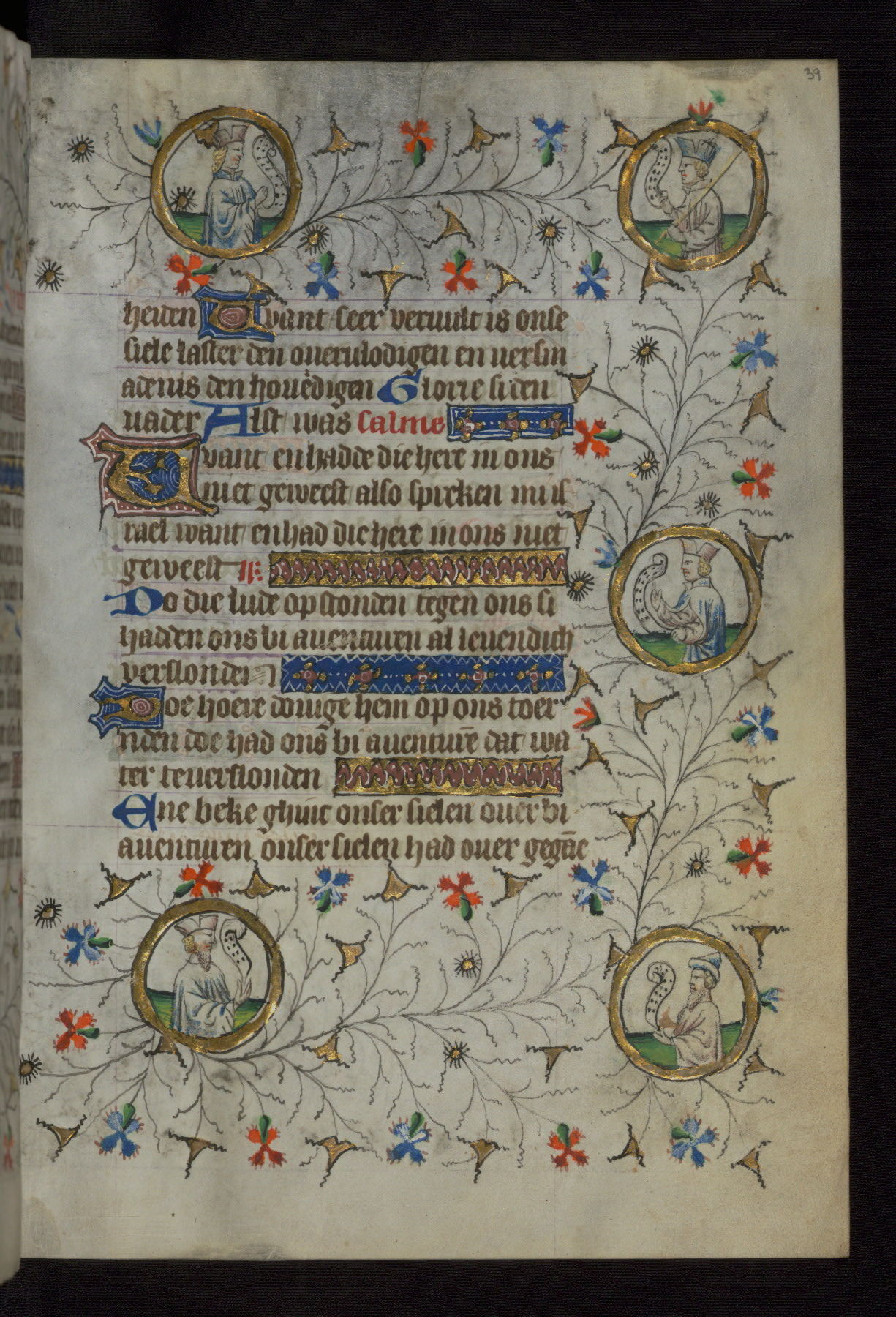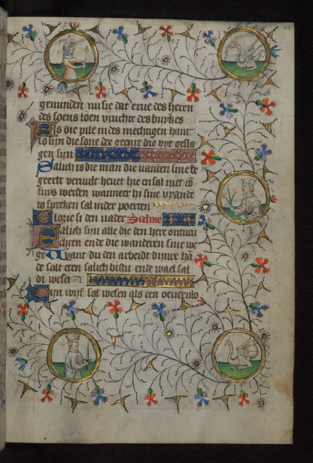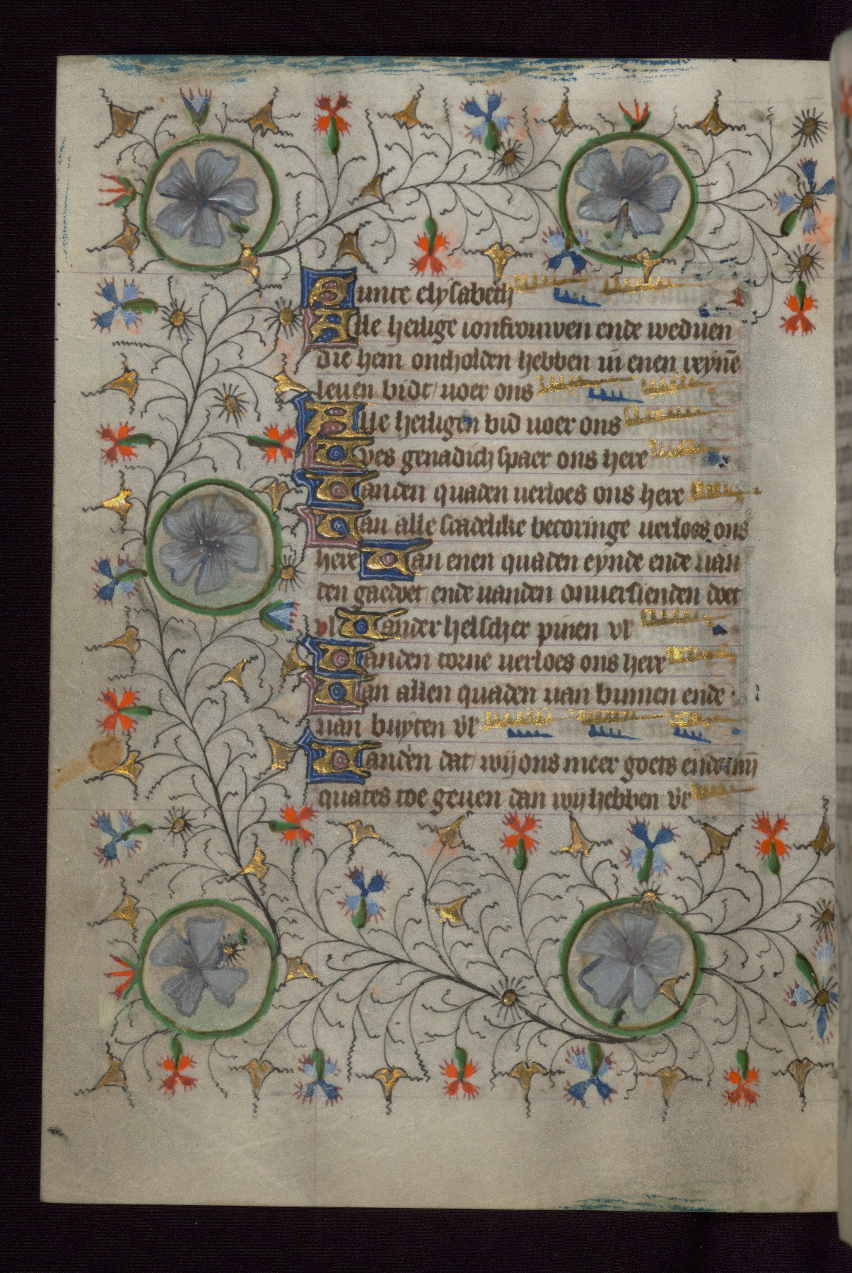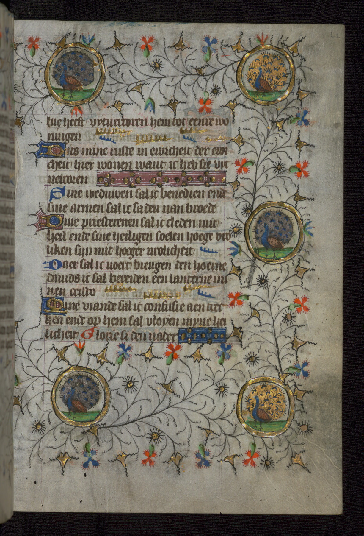 This book of hours was written in Dutch in the fifteenth century for the use of Utrecht. The Hours of the Virgin and of the Cross are accompanied here by the Dutch translation of Henry Suso's "Cursus aeternae sapientiae," a text that was particularly popular for private devotion in the Netherlands. Once owned by the English collector Lord Amherst, the manuscript is exceptional for its extensive illumination. Webs of foliage cover every margin, most sprouting medallions containing flora and fauna. The divisions in the text are marked by twenty richly painted full-page miniatures, often accompanied by related marginalia. Further illumination in the form of historiated and foliate initials marks minor breaks in the text, and the overall effect is a visual feast for the reader.