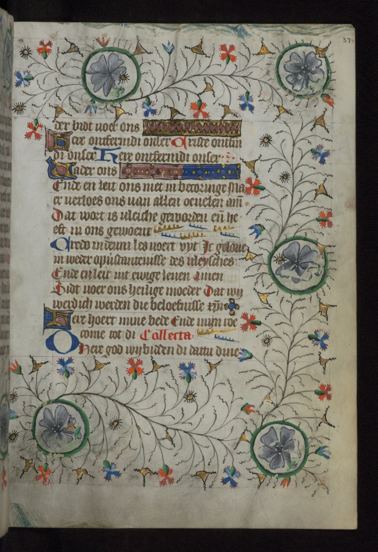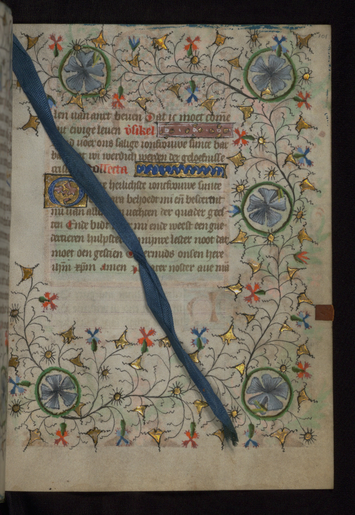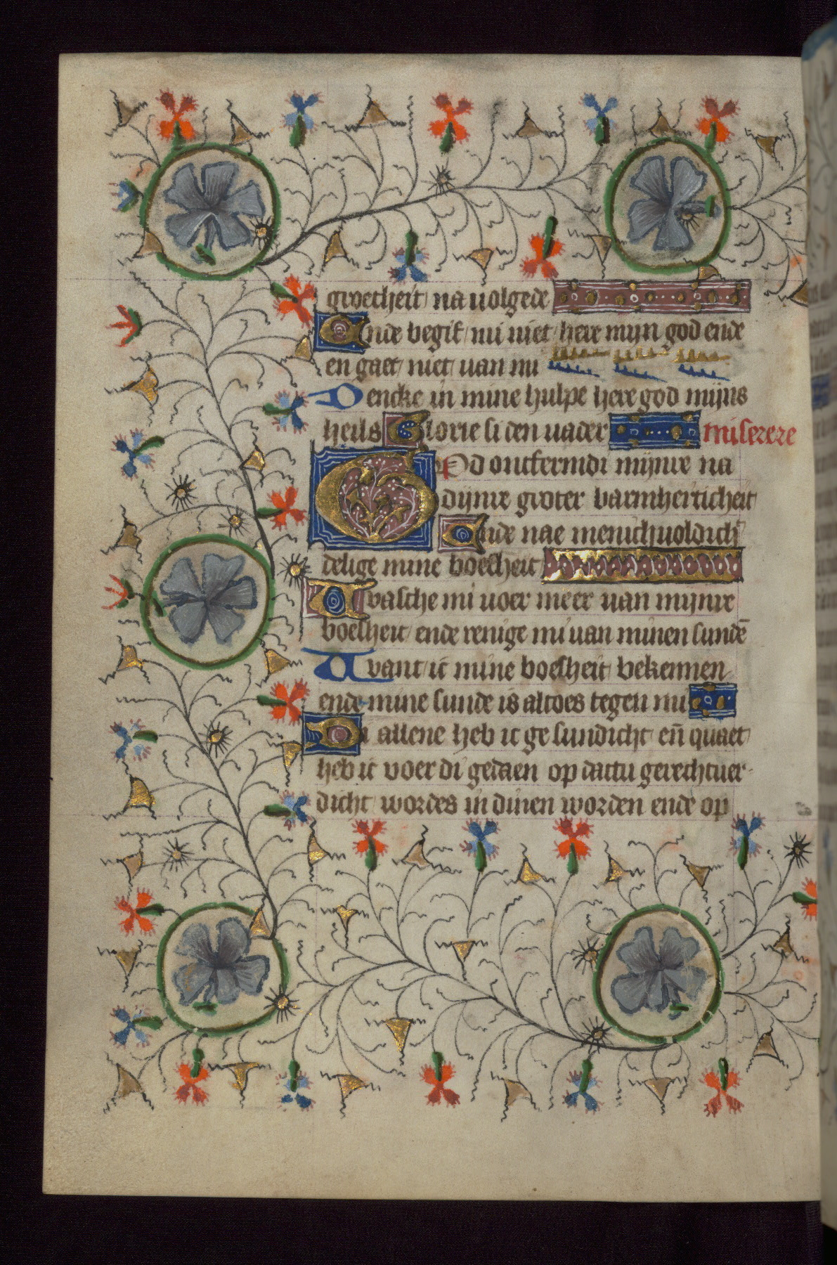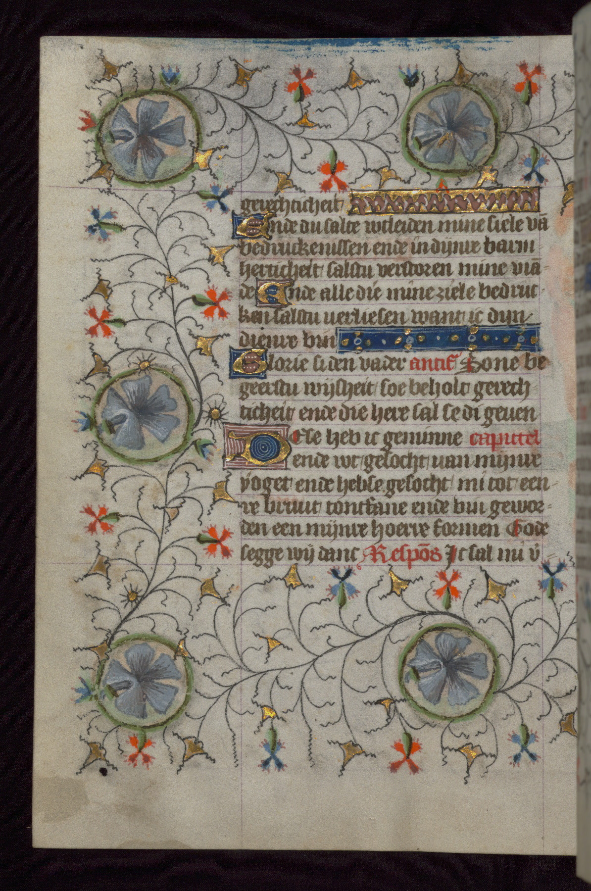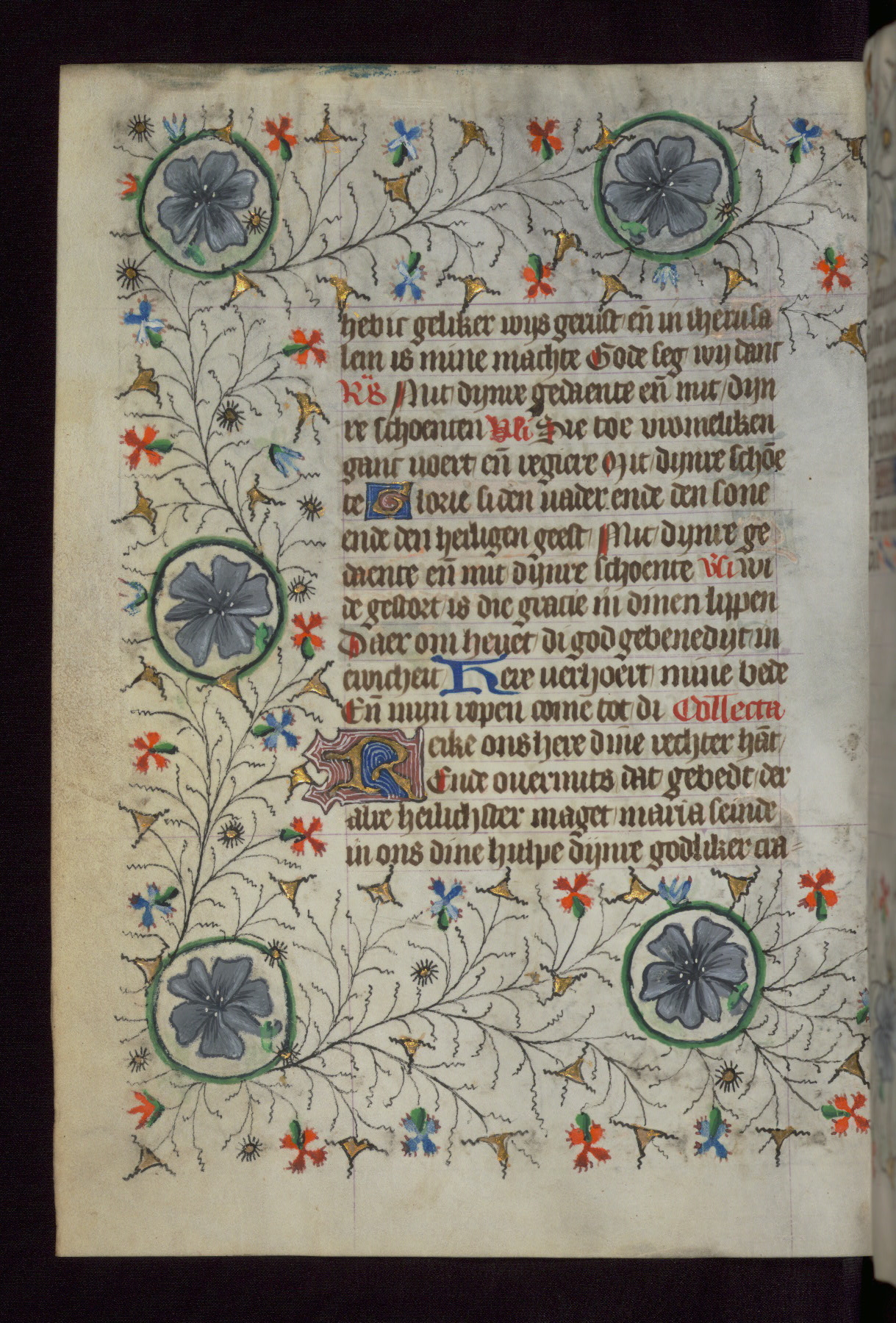 This book of hours was written in Dutch in the fifteenth century for the use of Utrecht. The Hours of the Virgin and of the Cross are accompanied here by the Dutch translation of Henry Suso's "Cursus aeternae sapientiae," a text that was particularly popular for private devotion in the Netherlands. Once owned by the English collector Lord Amherst, the manuscript is exceptional for its extensive illumination. Webs of foliage cover every margin, most sprouting medallions containing flora and fauna. The divisions in the text are marked by twenty richly painted full-page miniatures, often accompanied by related marginalia. Further illumination in the form of historiated and foliate initials marks minor breaks in the text, and the overall effect is a visual feast for the reader.