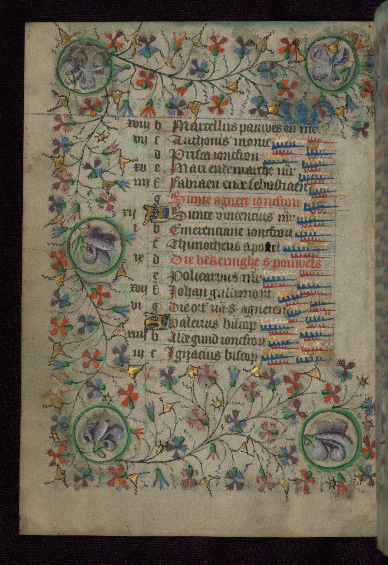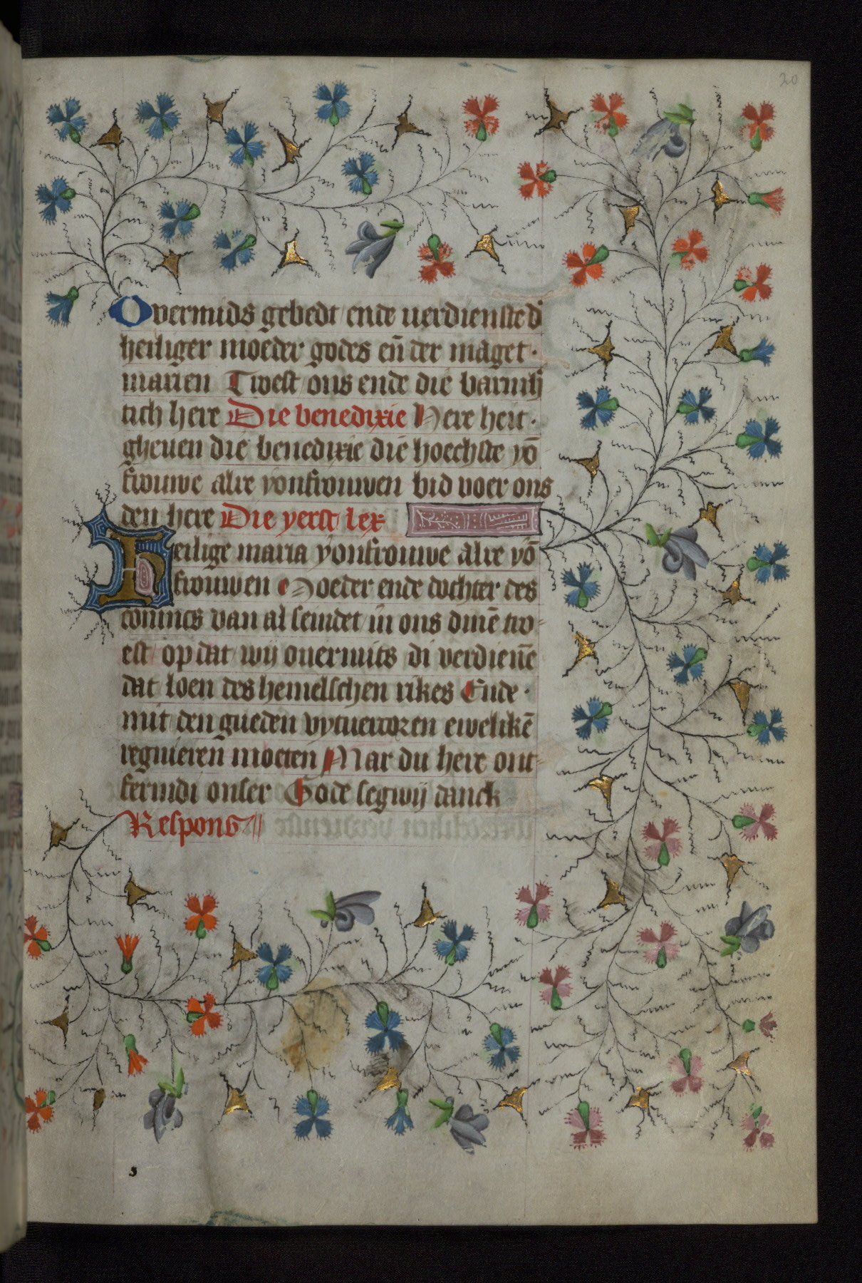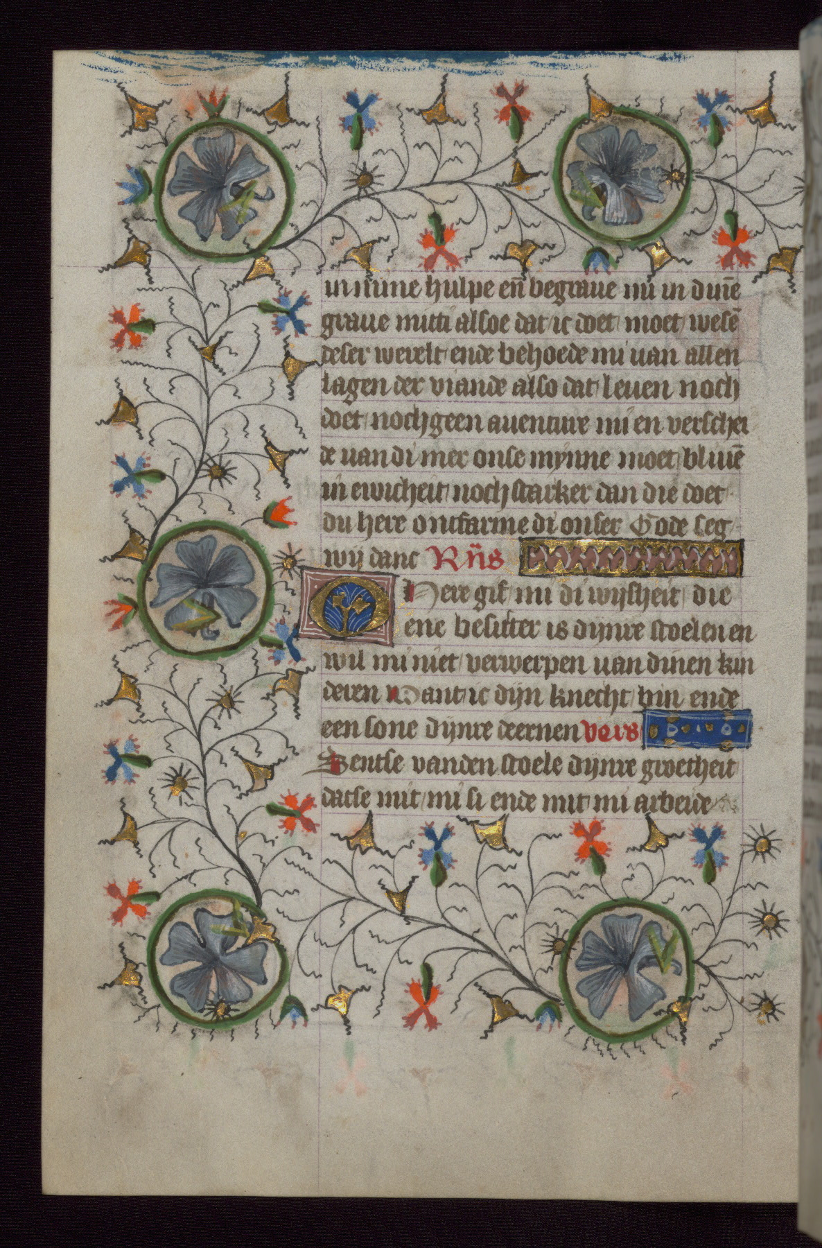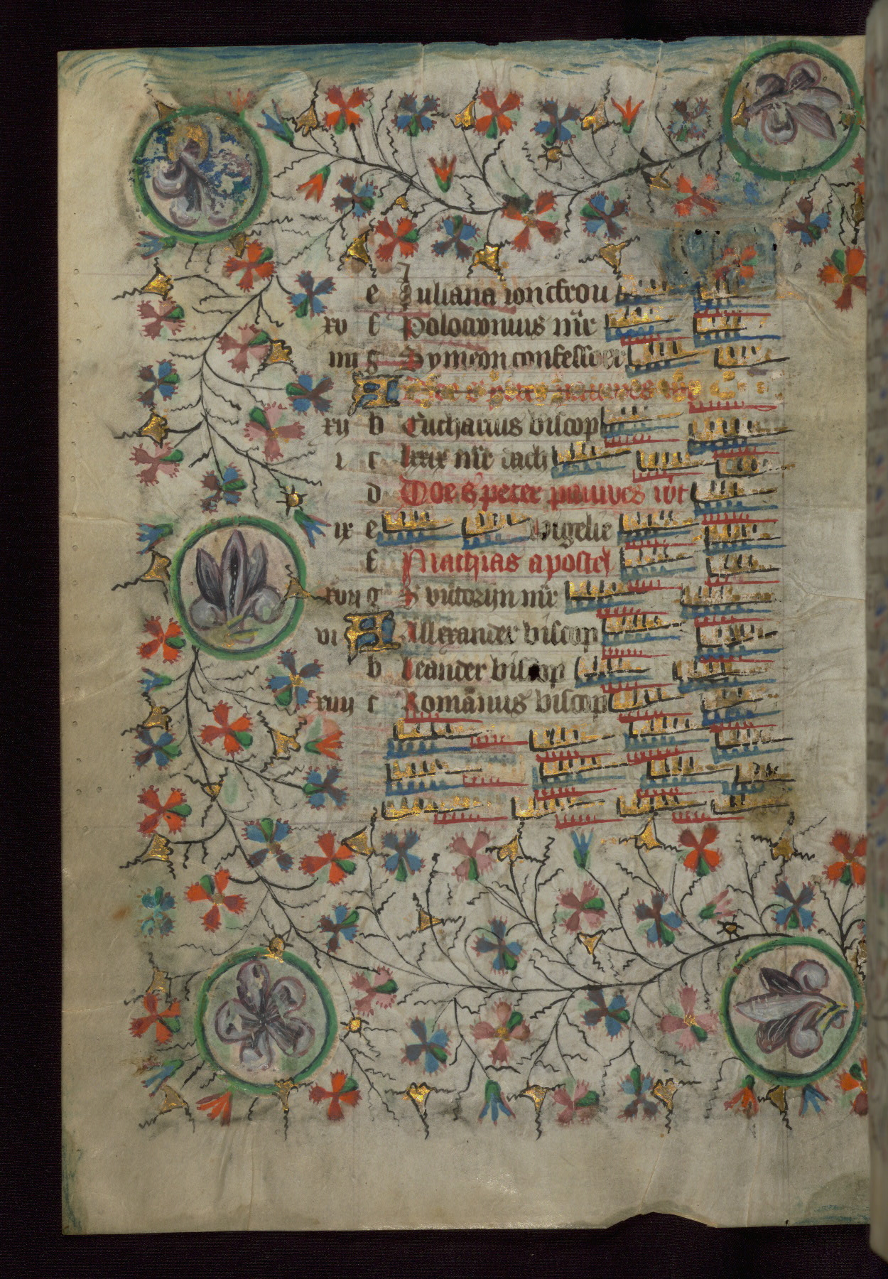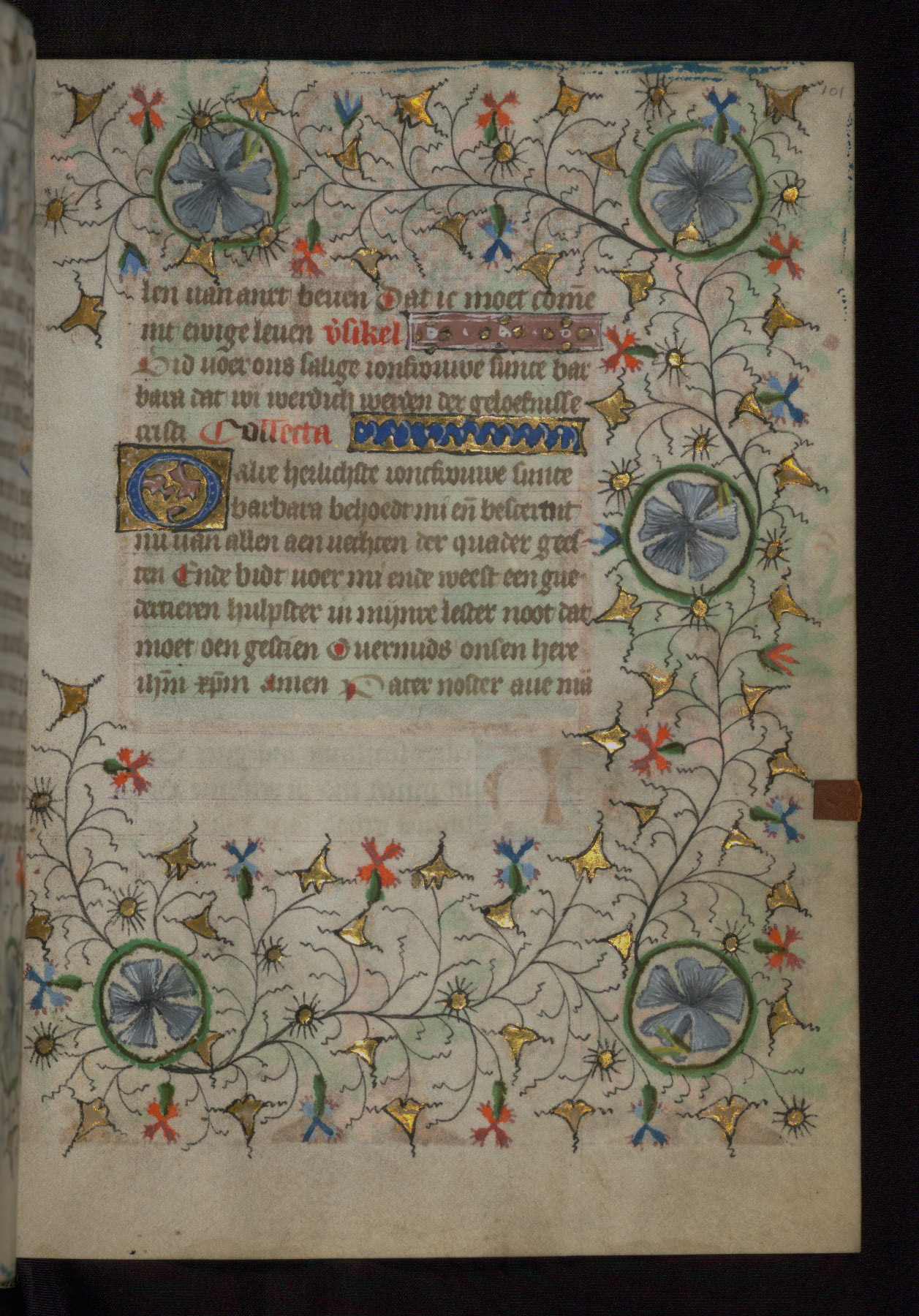 This book of hours was written in Dutch in the fifteenth century for the use of Utrecht. The Hours of the Virgin and of the Cross are accompanied here by the Dutch translation of Henry Suso's "Cursus aeternae sapientiae," a text that was particularly popular for private devotion in the Netherlands. Once owned by the English collector Lord Amherst, the manuscript is exceptional for its extensive illumination. Webs of foliage cover every margin, most sprouting medallions containing flora and fauna. The divisions in the text are marked by twenty richly painted full-page miniatures, often accompanied by related marginalia. Further illumination in the form of historiated and foliate initials marks minor breaks in the text, and the overall effect is a visual feast for the reader.