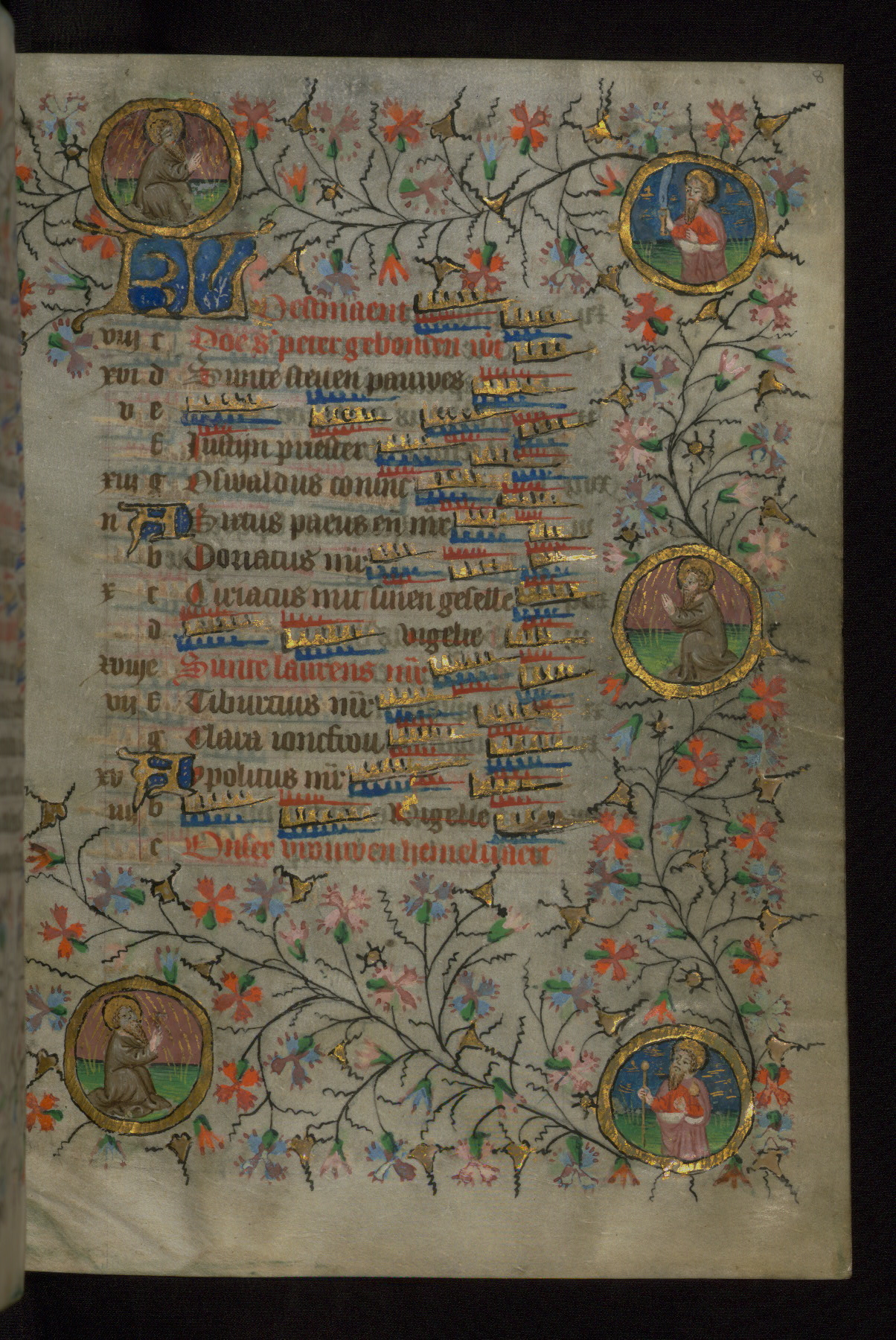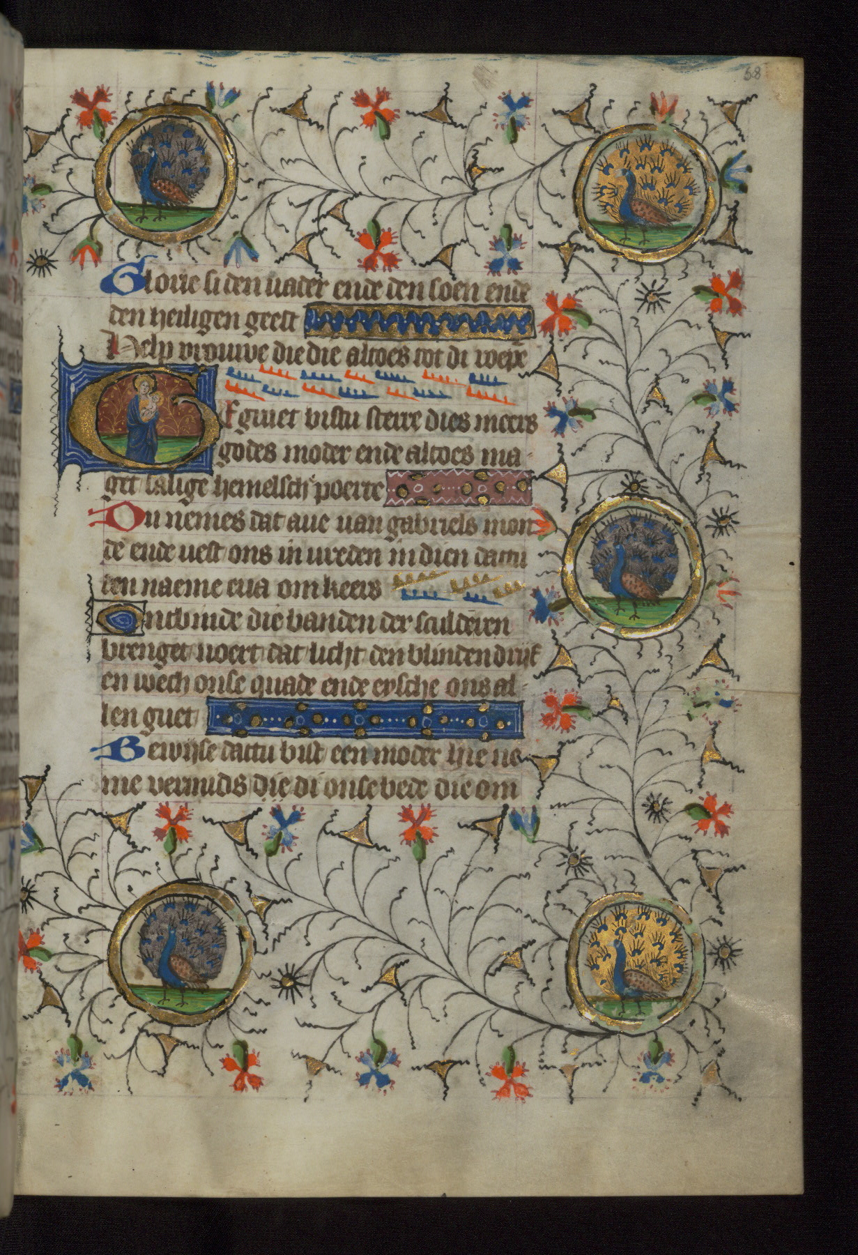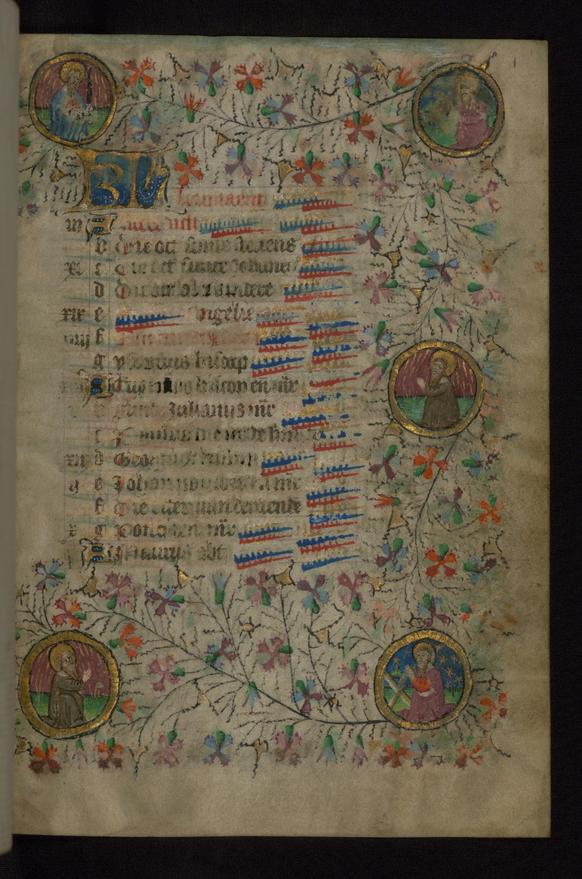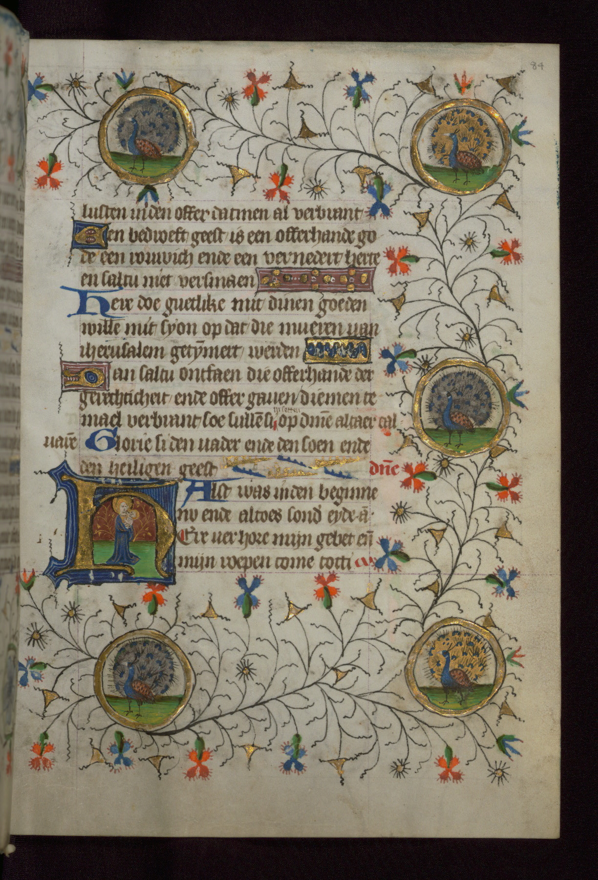 - Decoration note: Twenty full-page miniatures, one large historiated initial (7 lines), three small historiated initials (3-5 lines), one large decorated initial (9 lines); foliate margins with five medallions per page (3-4 lines) containing saints, grotesques, flowers and peacocks (true of almost entire manuscript, with main exception being margins around full-page miniatures); small decorated initials (1-3 lines) and geometric line fillers throughout in gold, blue and pink with white accents; rubrics in red, text in brown ink