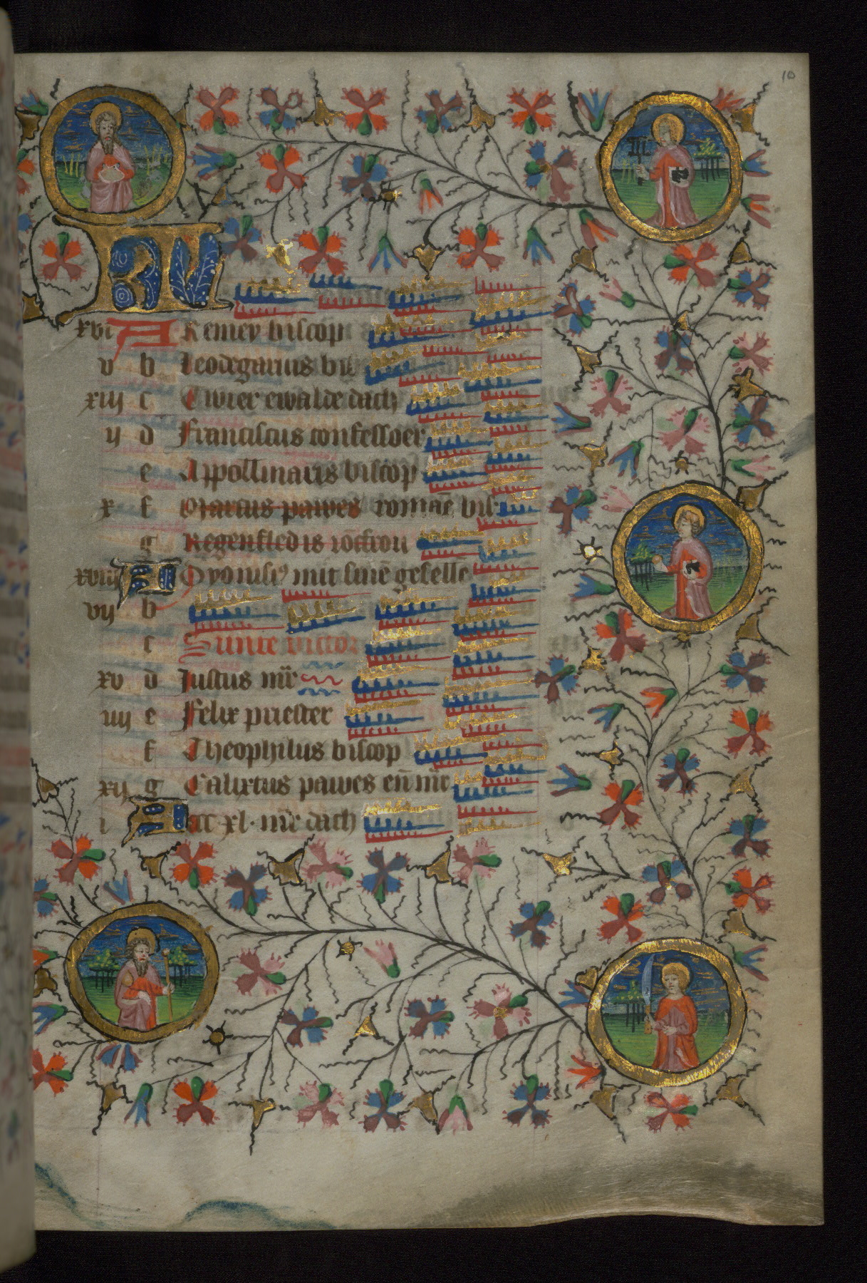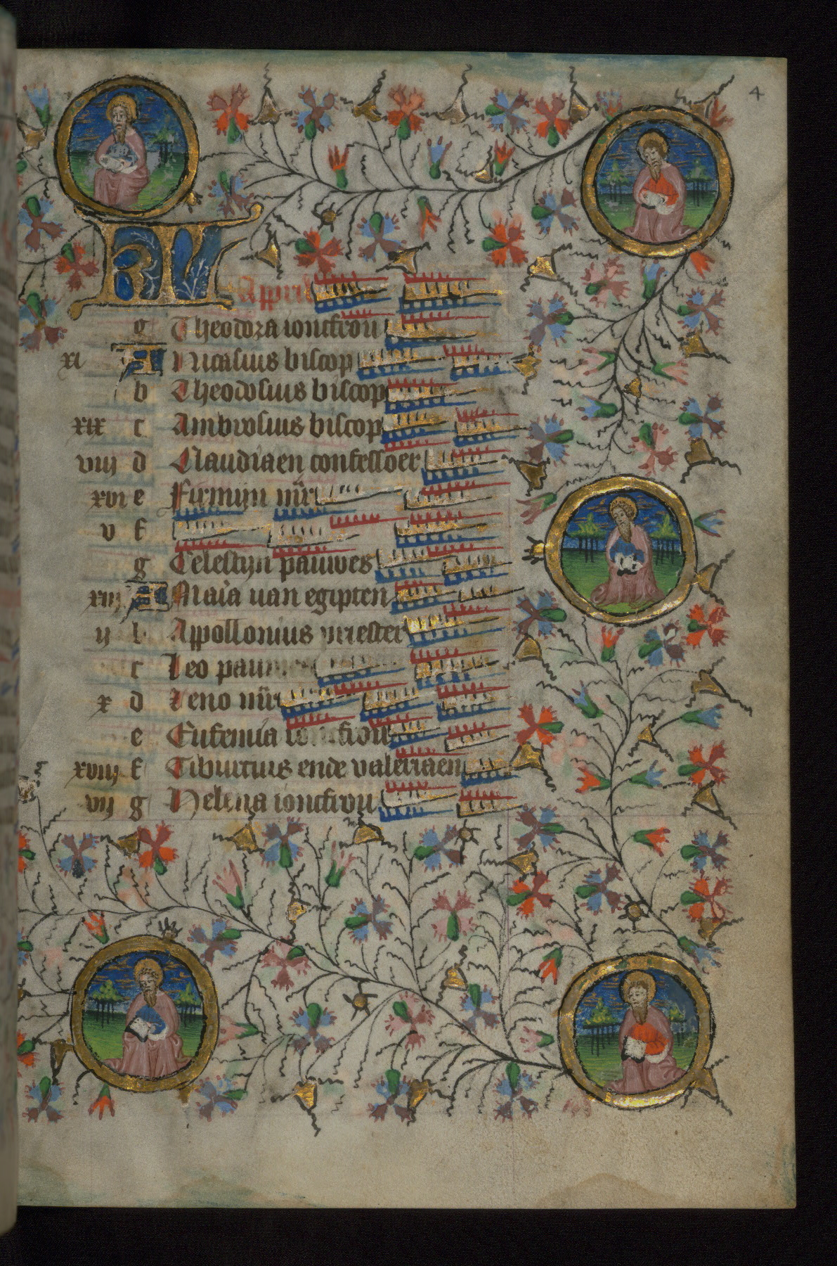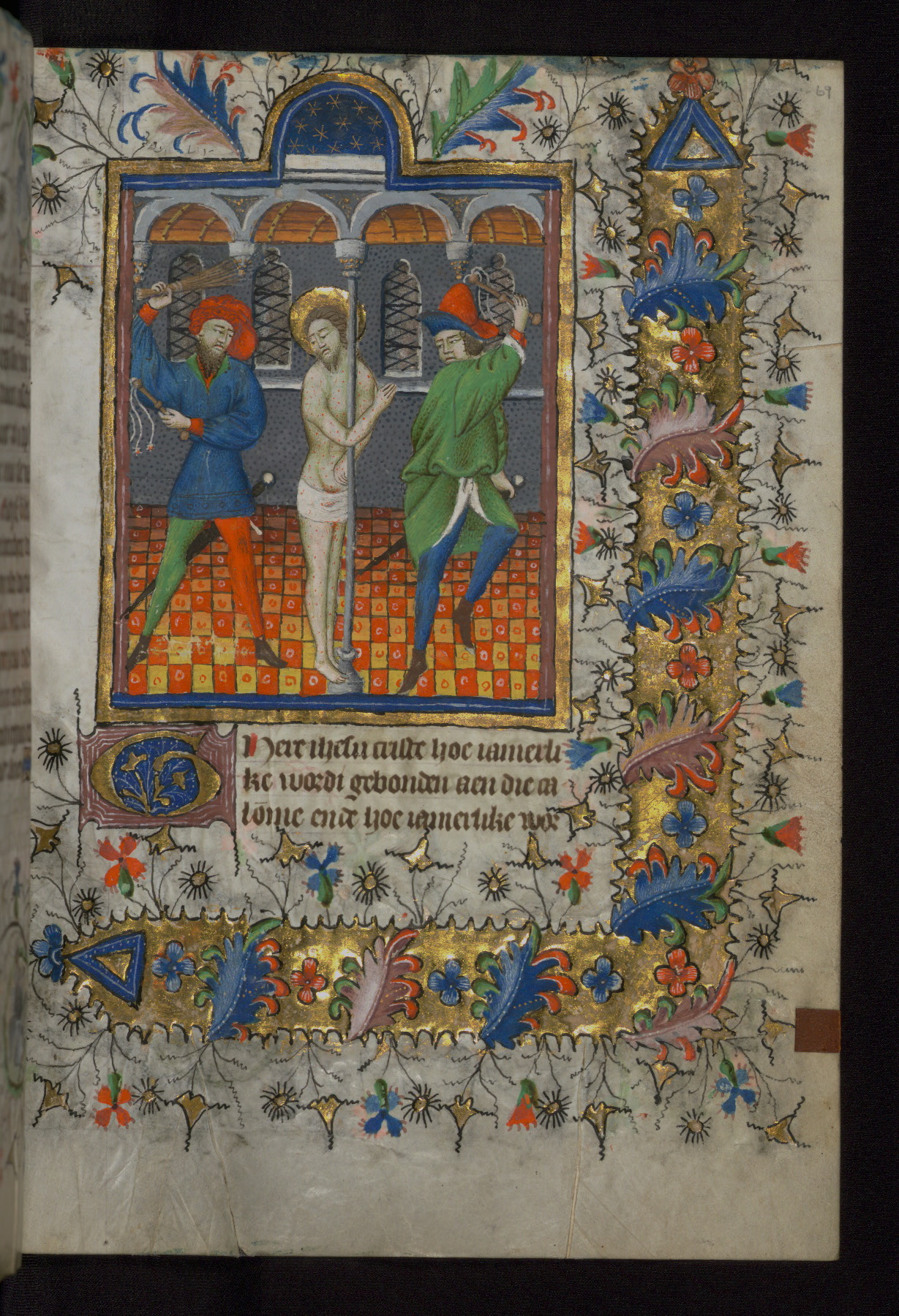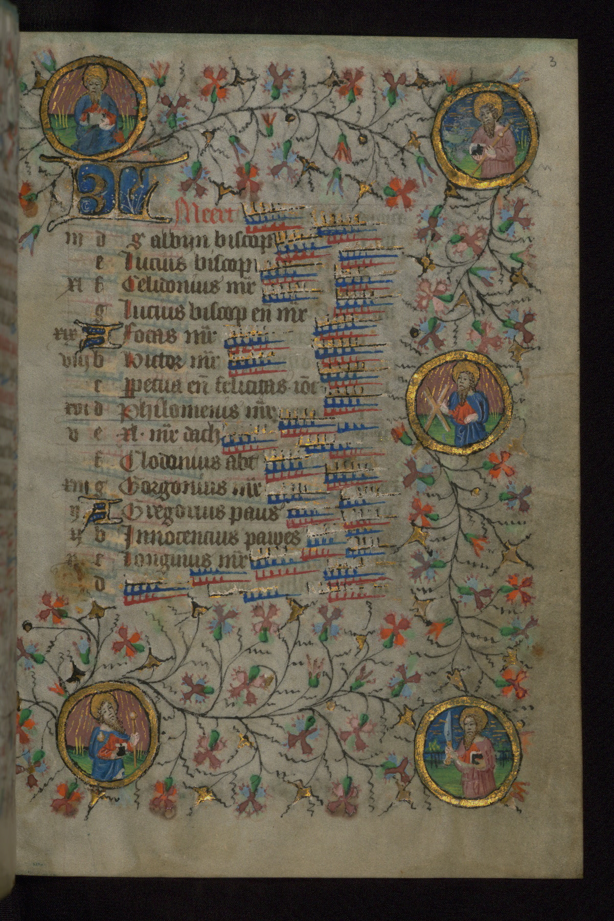 - Decoration note: Twenty full-page miniatures, one large historiated initial (7 lines), three small historiated initials (3-5 lines), one large decorated initial (9 lines); foliate margins with five medallions per page (3-4 lines) containing saints, grotesques, flowers and peacocks (true of almost entire manuscript, with main exception being margins around full-page miniatures); small decorated initials (1-3 lines) and geometric line fillers throughout in gold, blue and pink with white accents; rubrics in red, text in brown ink