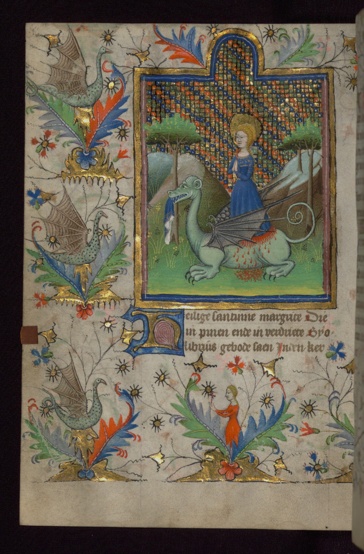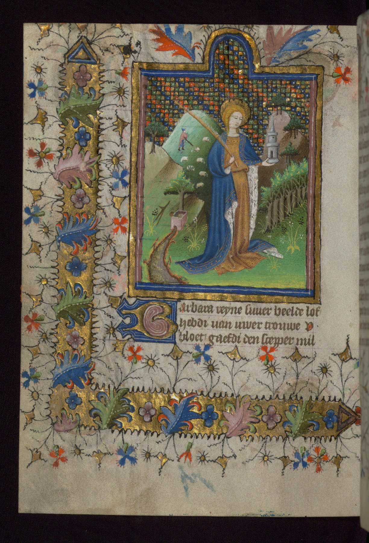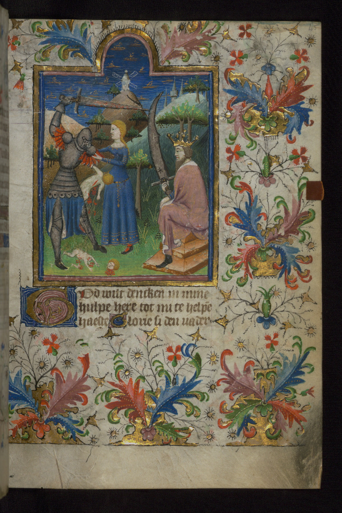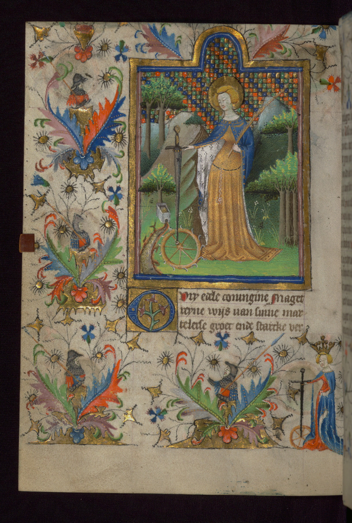 - Decoration note: Twenty full-page miniatures, one large historiated initial (7 lines), three small historiated initials (3-5 lines), one large decorated initial (9 lines); foliate margins with five medallions per page (3-4 lines) containing saints, grotesques, flowers and peacocks (true of almost entire manuscript, with main exception being margins around full-page miniatures); small decorated initials (1-3 lines) and geometric line fillers throughout in gold, blue and pink with white accents; rubrics in red, text in brown ink