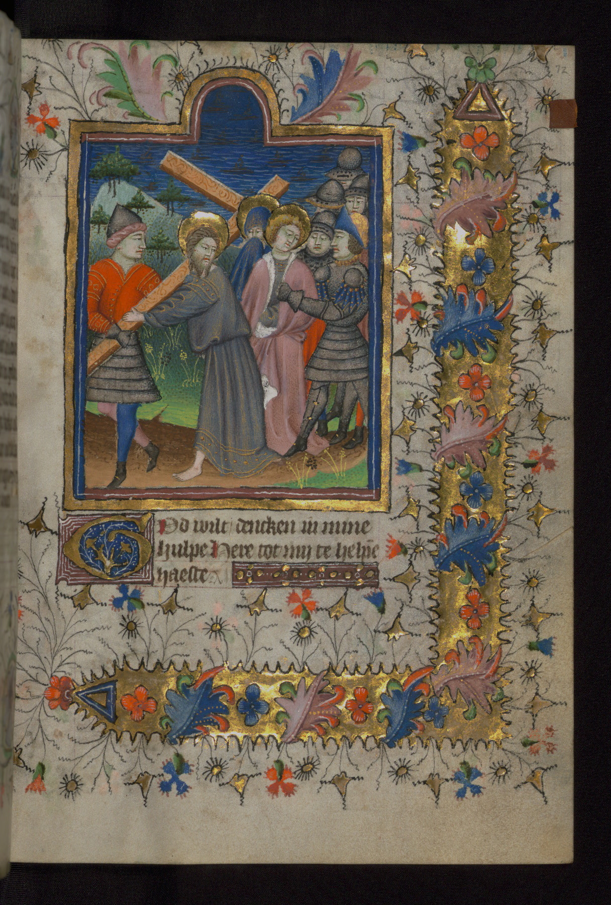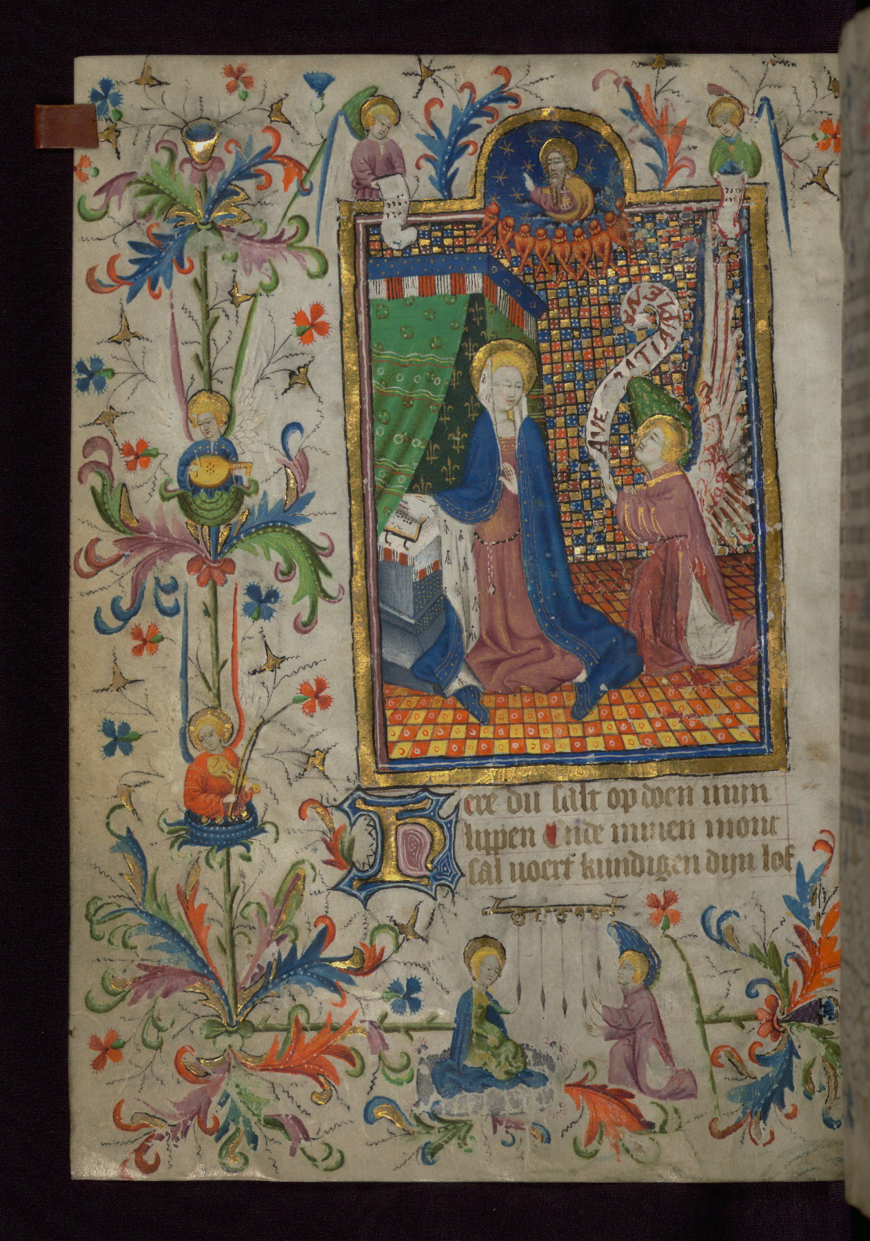 This book of hours was written in Dutch in the fifteenth century for the use of Utrecht. The Hours of the Virgin and of the Cross are accompanied here by the Dutch translation of Henry Suso's "Cursus aeternae sapientiae," a text that was particularly popular for private devotion in the Netherlands. Once owned by the English collector Lord Amherst, the manuscript is exceptional for its extensive illumination. Webs of foliage cover every margin, most sprouting medallions containing flora and fauna. The divisions in the text are marked by twenty richly painted full-page miniatures, often accompanied by related marginalia. Further illumination in the form of historiated and foliate initials marks minor breaks in the text, and the overall effect is a visual feast for the reader.