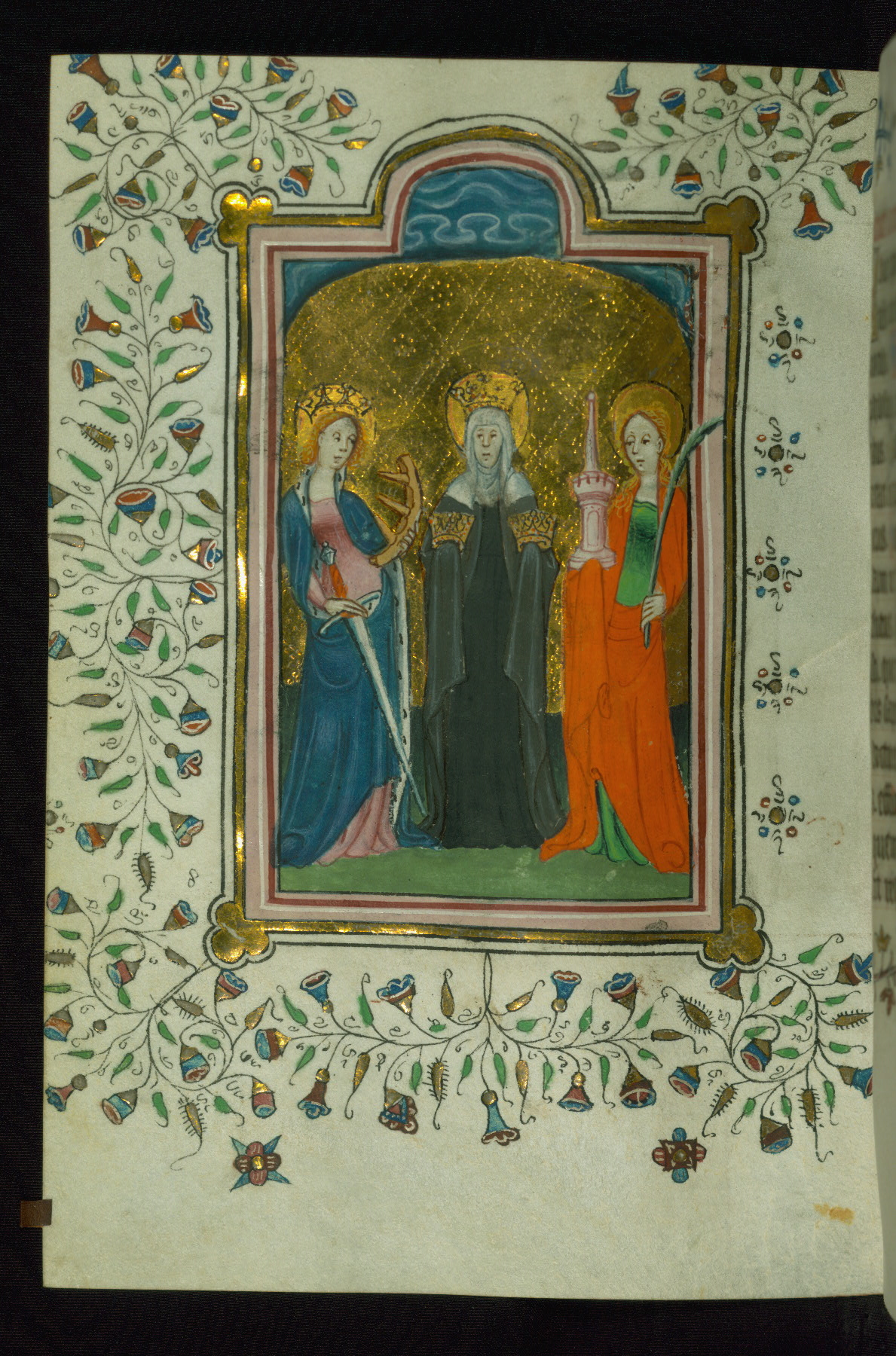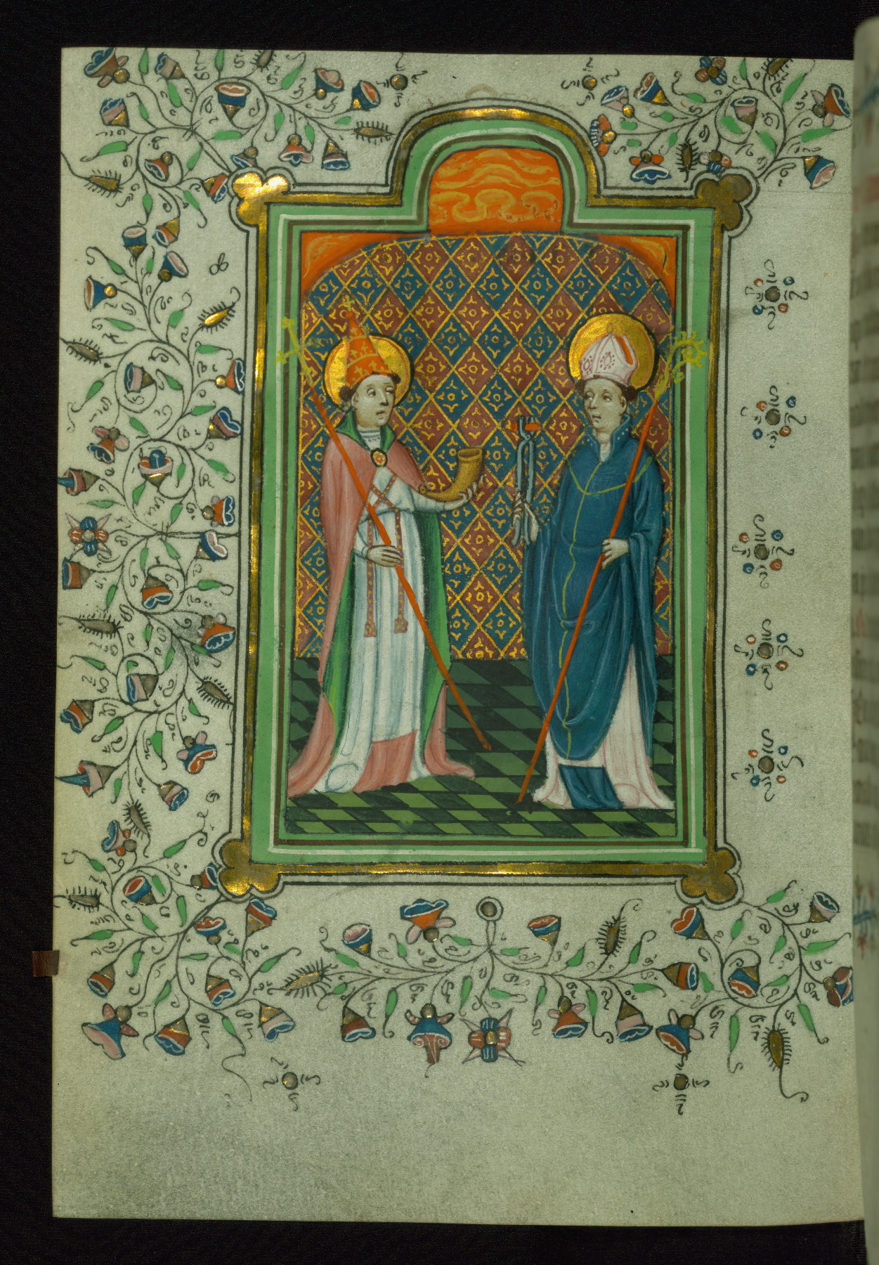 - Contents: Notable saints in litany, fols. 99v-102r, include: John the Baptist as patriarch and prophet; sixteen apostles, Peter through Barnabas; fourteen martyrs, including Stephen, Linus, Cletus, Clement, Sixtus, Cornelius, Cyprian, Lawrence, Vincent, John, Paul, Cosmas, Damian, and Lambert; fifteen confessors include Autbert, Anthony, Benedict, Bernard, Germanus, Rumold, Eligius, and Aegyndius; ten virgins or widows, including Mary Magdalene, Felicitas, Perpetua, Agatha, Agnes, Cecilia, Gudula, Margaret, Catherine, Anne; fols. 102r-103v: petitions and invocations; fols. 103v-104r: two collects