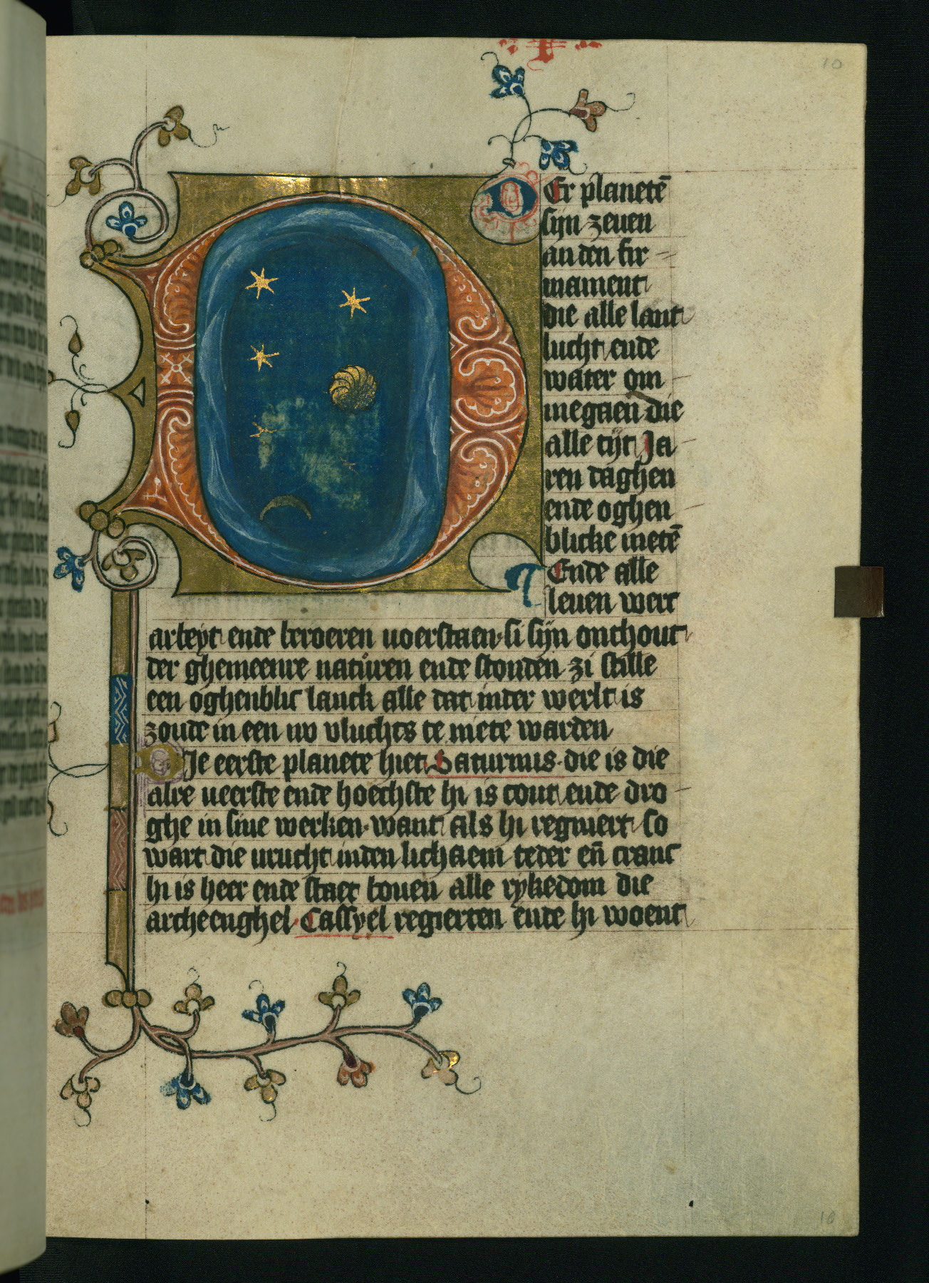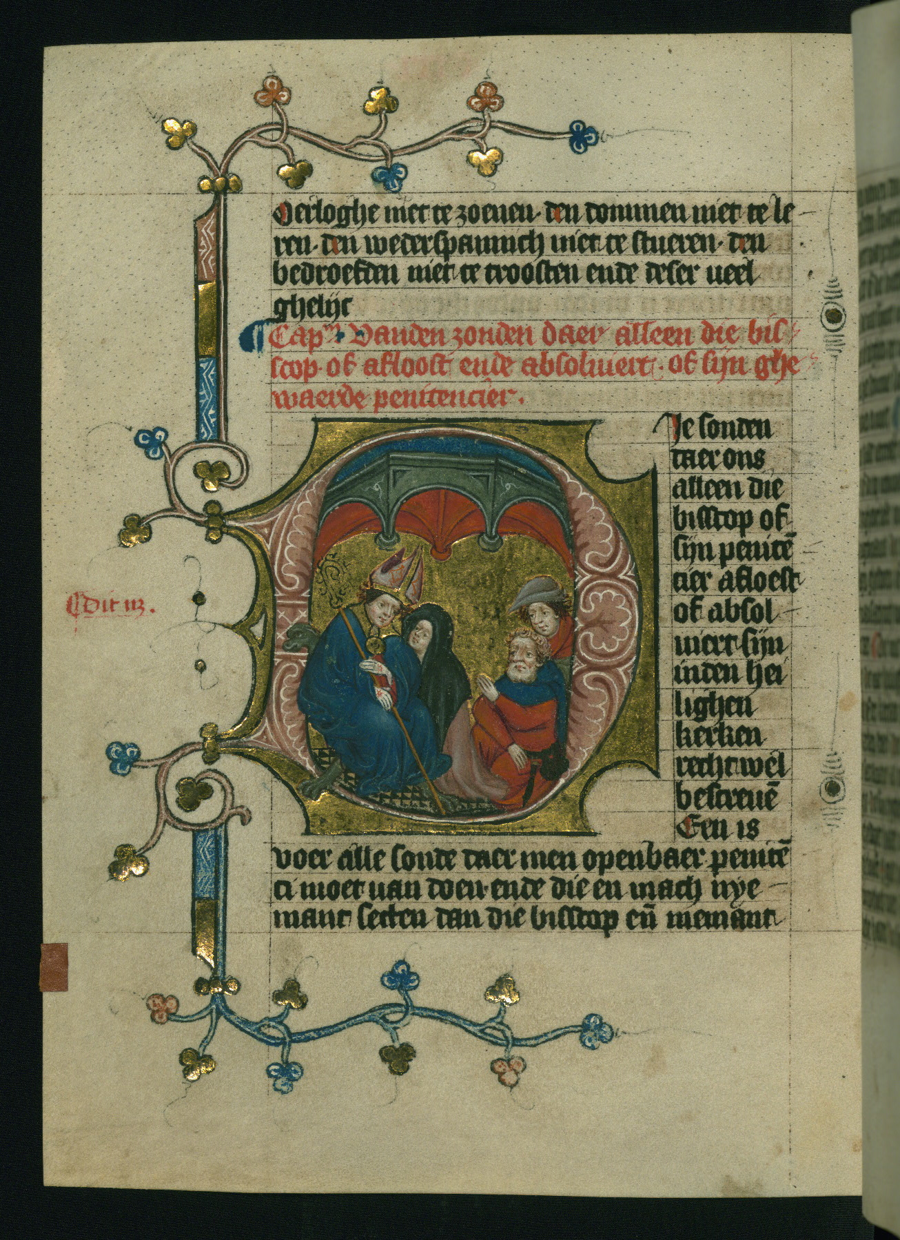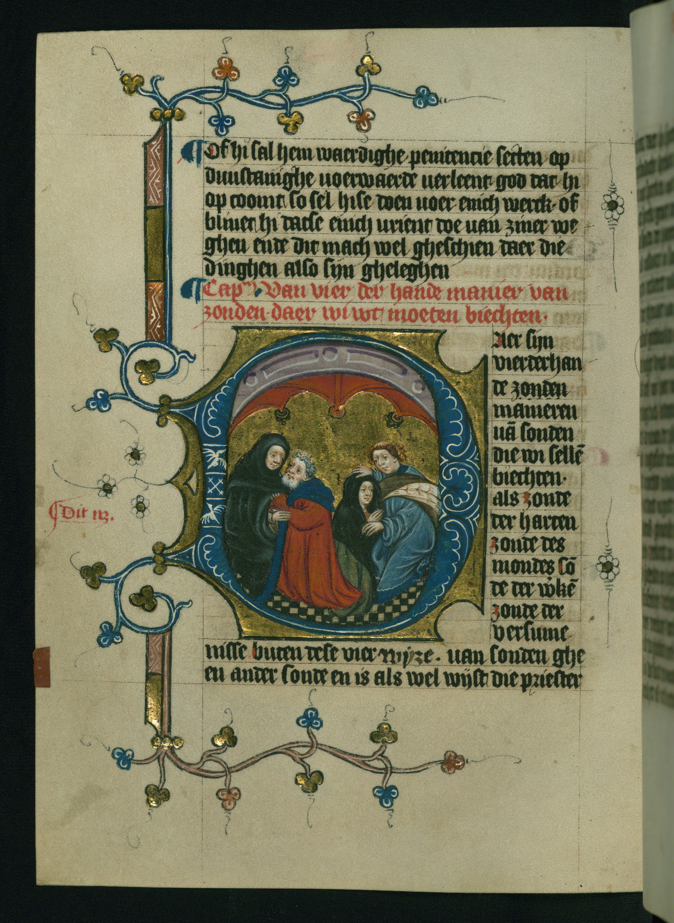 This illuminated manuscript is a document of the first importance in the history of Dutch manuscript illumination and contains an important medieval Dutch devotional text. The Tafel van den Kersten ghelove is a compendium of Christian knowledge written by a learned Dominican, Dirc van Delf. The text is in two parts, one for winter, one for summer. This manuscript is of the winter part and is incomplete, omitting the prologue and chapters 13, 14, and 35-57. The arms of the Bavarian counts of Holland and the kneeling owner on fol. 1r indicate that this manuscript was the actual copy prepared for the dedicatee of the text, Albrecht of Bavaria, Count of Holland, from the original text of his chaplain, and is therefore to be dated to 1404 at the latest, when Albrecht died. The manuscript contains 165 folios and thirty-five historiated initials.