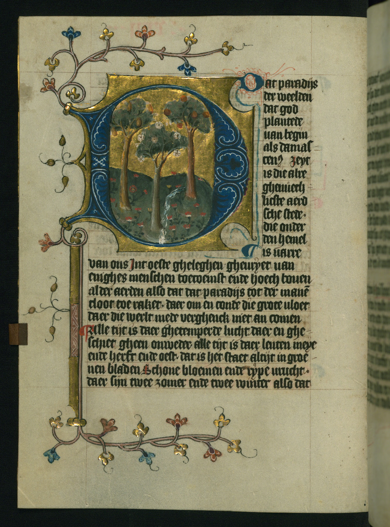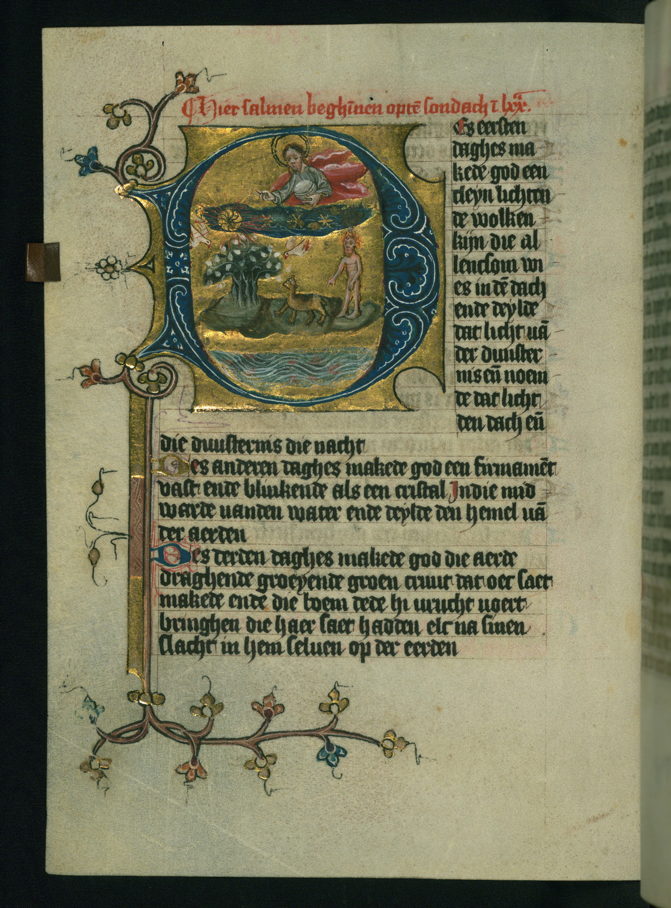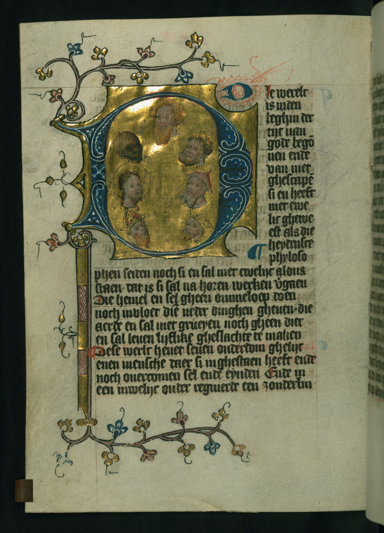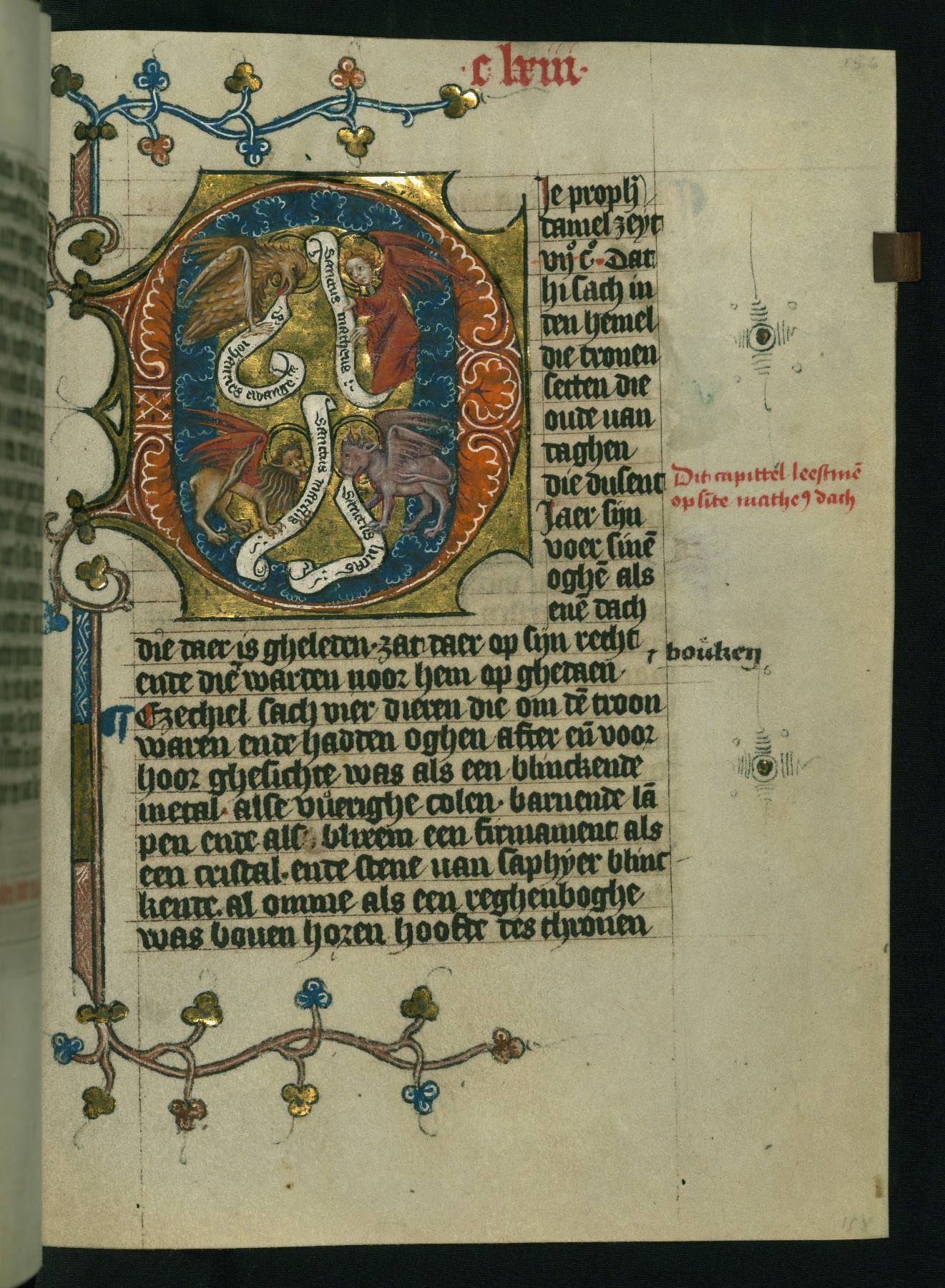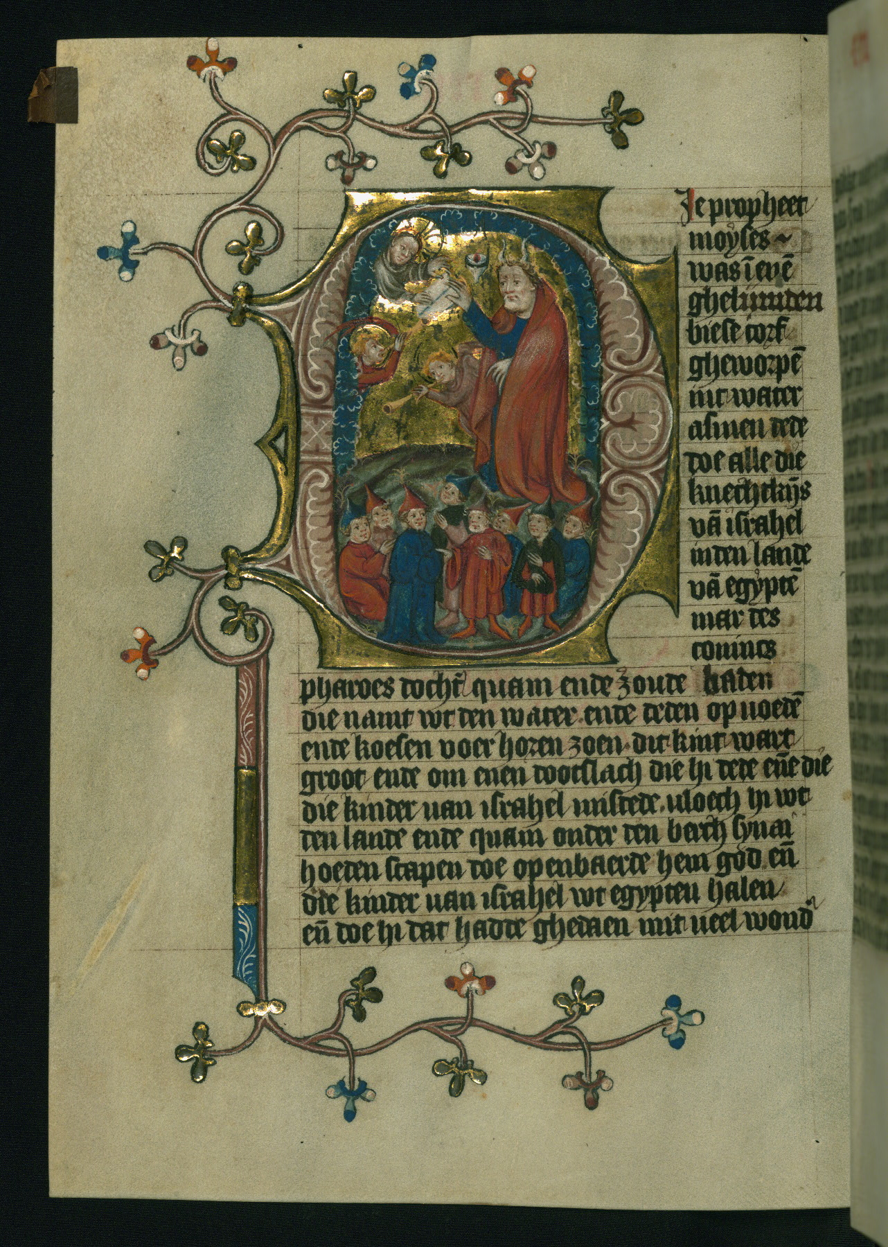 - Decoration note: Miniatures by two painters: artist A (fols. 1r-110r) with soft and painterly style, depending very little on outlines and artist B (fols. 112v-156r) using stronger, brighter colors (artist A also illuminated an initial in the four-volume Bible for the Carthusians of Utrecht [Brussels, Bibl. Roy. Mss. 106, 107, 204, and 205]); historiated initials at the opening of each chapter (four for Daniels' chapter 1) (10-15 lines); thirty-five further large historiated initials; smaller initials in gold or blue with violet or red marginal penwork; bar borders with trefoil foliage of red, blue, and gold springing from the initials into the entire left margin, the vine turning into the top and bottom margins; chapter captions in red; Latin words in text underlined in red; paragraph marks in red or blue; capital letters within the text picked out with red strokes; instructions for rubrics visible in the gutter of the binding in very small lettering; instructions to the illuminator in Dutch in another hand visible at lower margins on fols. 105r and 110r