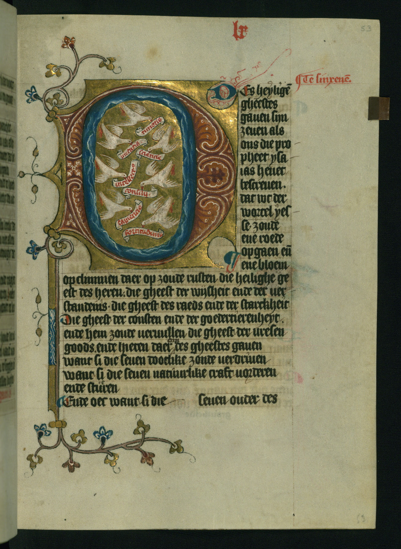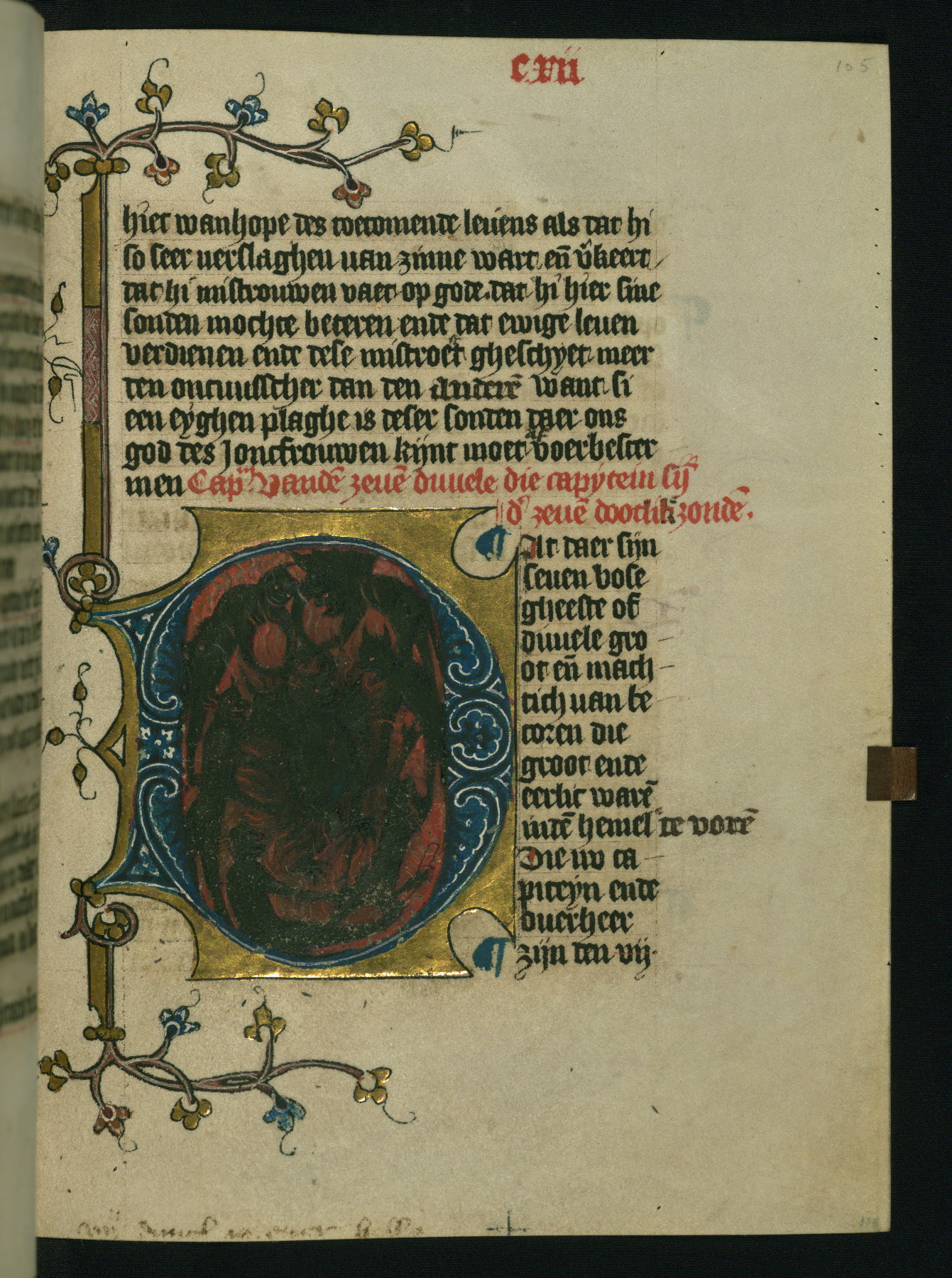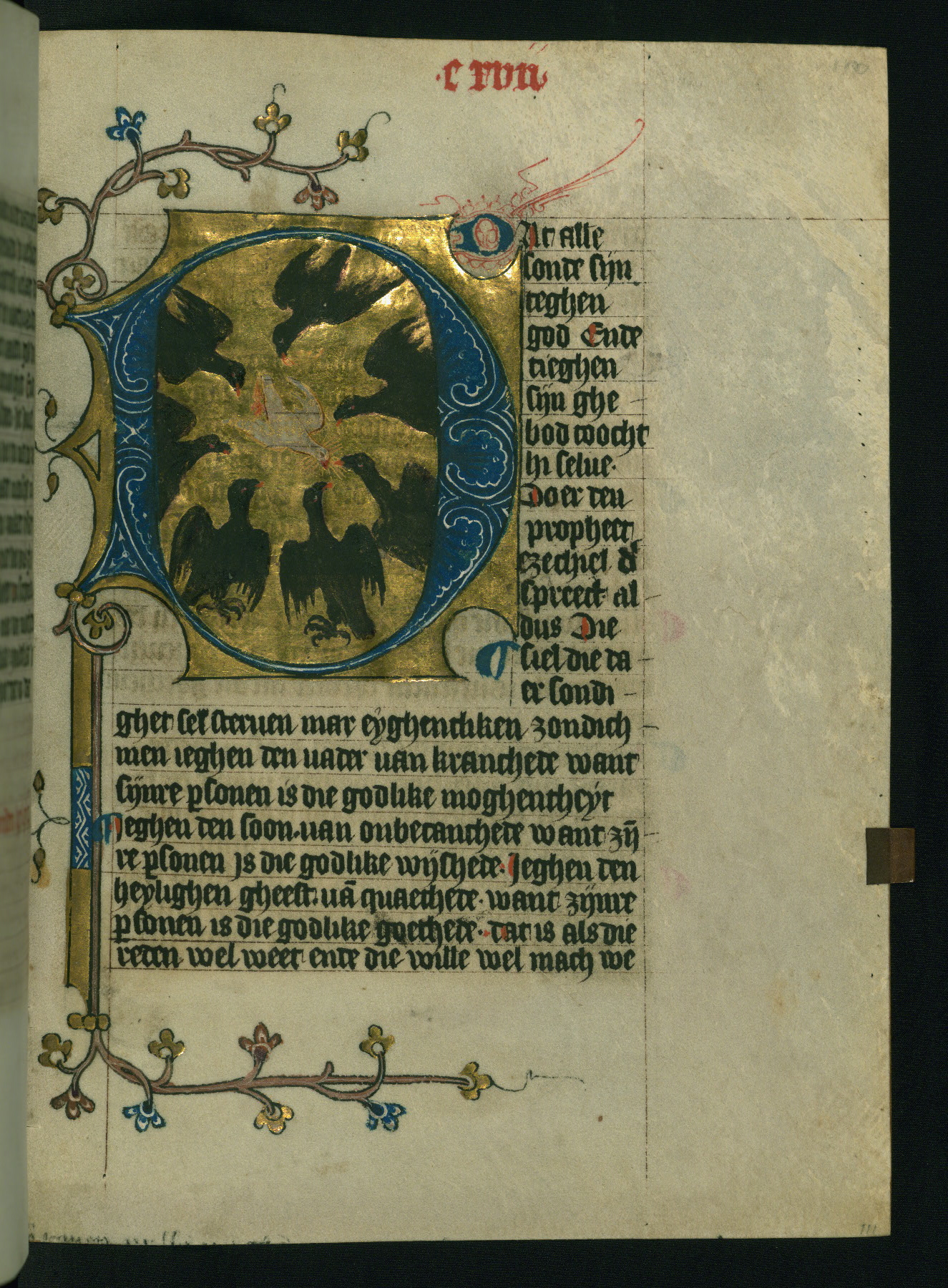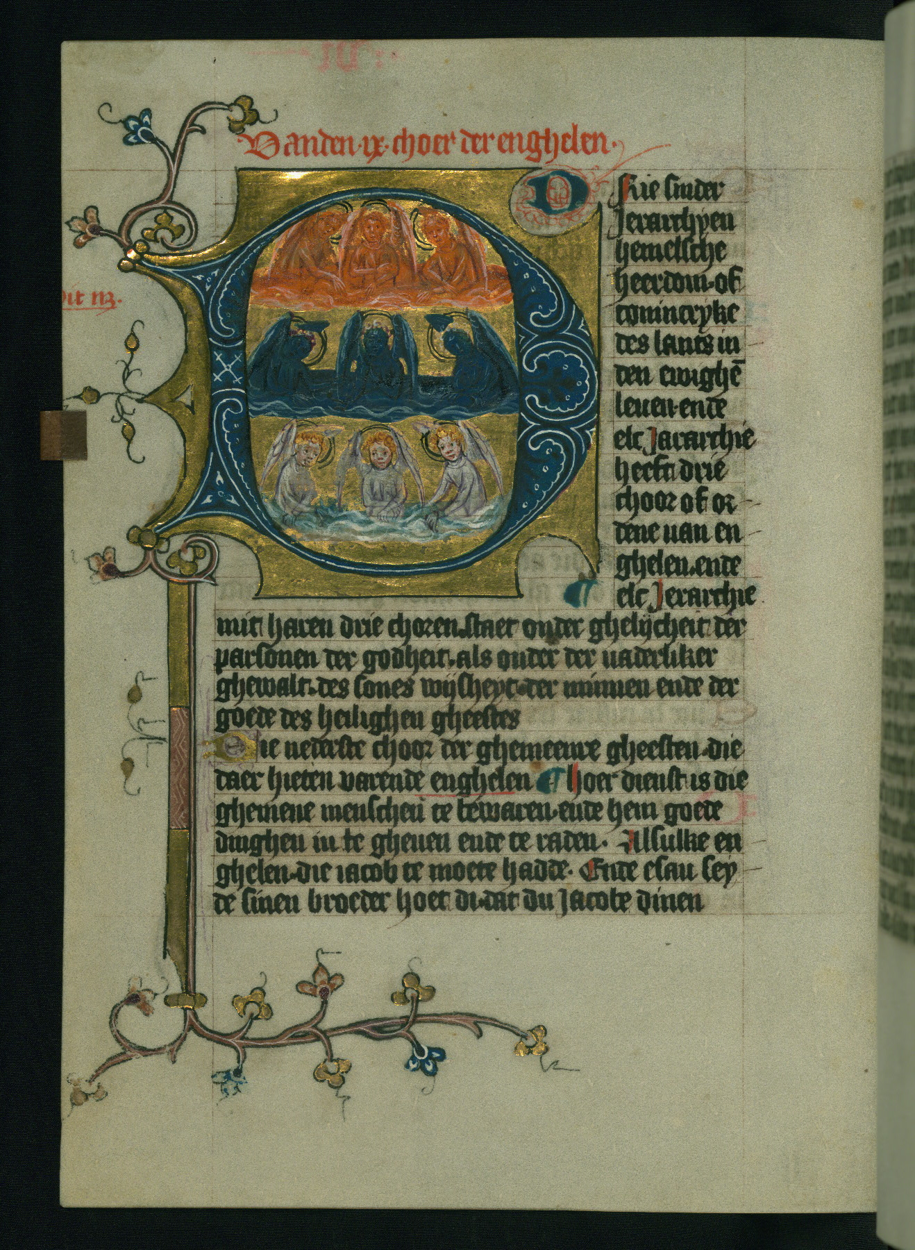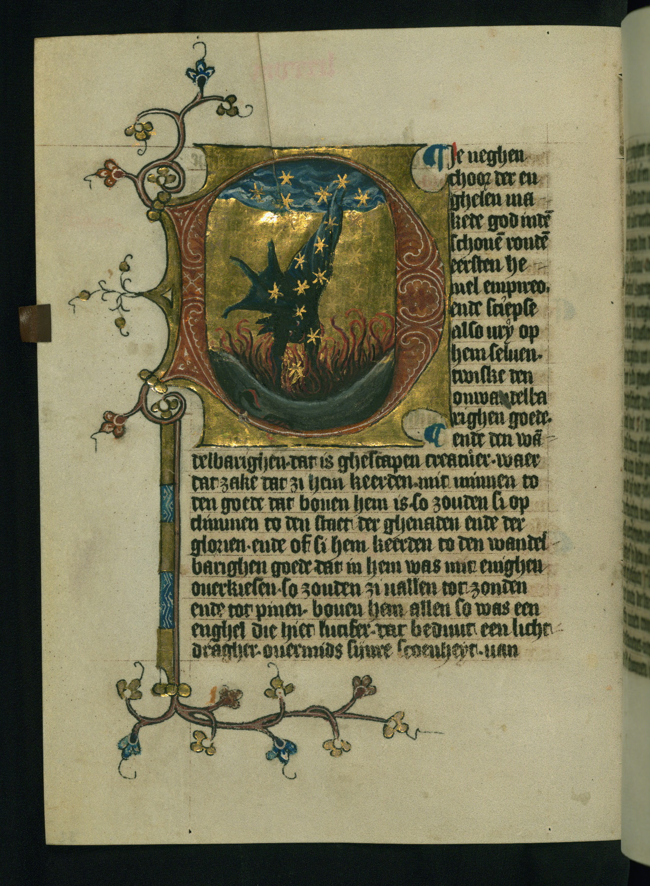- Decoration note: Miniatures by two painters: artist A (fols. 1r-110r) with soft and painterly style, depending very little on outlines and artist B (fols. 112v-156r) using stronger, brighter colors (artist A also illuminated an initial in the four-volume Bible for the Carthusians of Utrecht [Brussels, Bibl. Roy. Mss. 106, 107, 204, and 205]); historiated initials at the opening of each chapter (four for Daniels' chapter 1) (10-15 lines); thirty-five further large historiated initials; smaller initials in gold or blue with violet or red marginal penwork; bar borders with trefoil foliage of red, blue, and gold springing from the initials into the entire left margin, the vine turning into the top and bottom margins; chapter captions in red; Latin words in text underlined in red; paragraph marks in red or blue; capital letters within the text picked out with red strokes; instructions for rubrics visible in the gutter of the binding in very small lettering; instructions to the illuminator in Dutch in another hand visible at lower margins on fols. 105r and 110r
