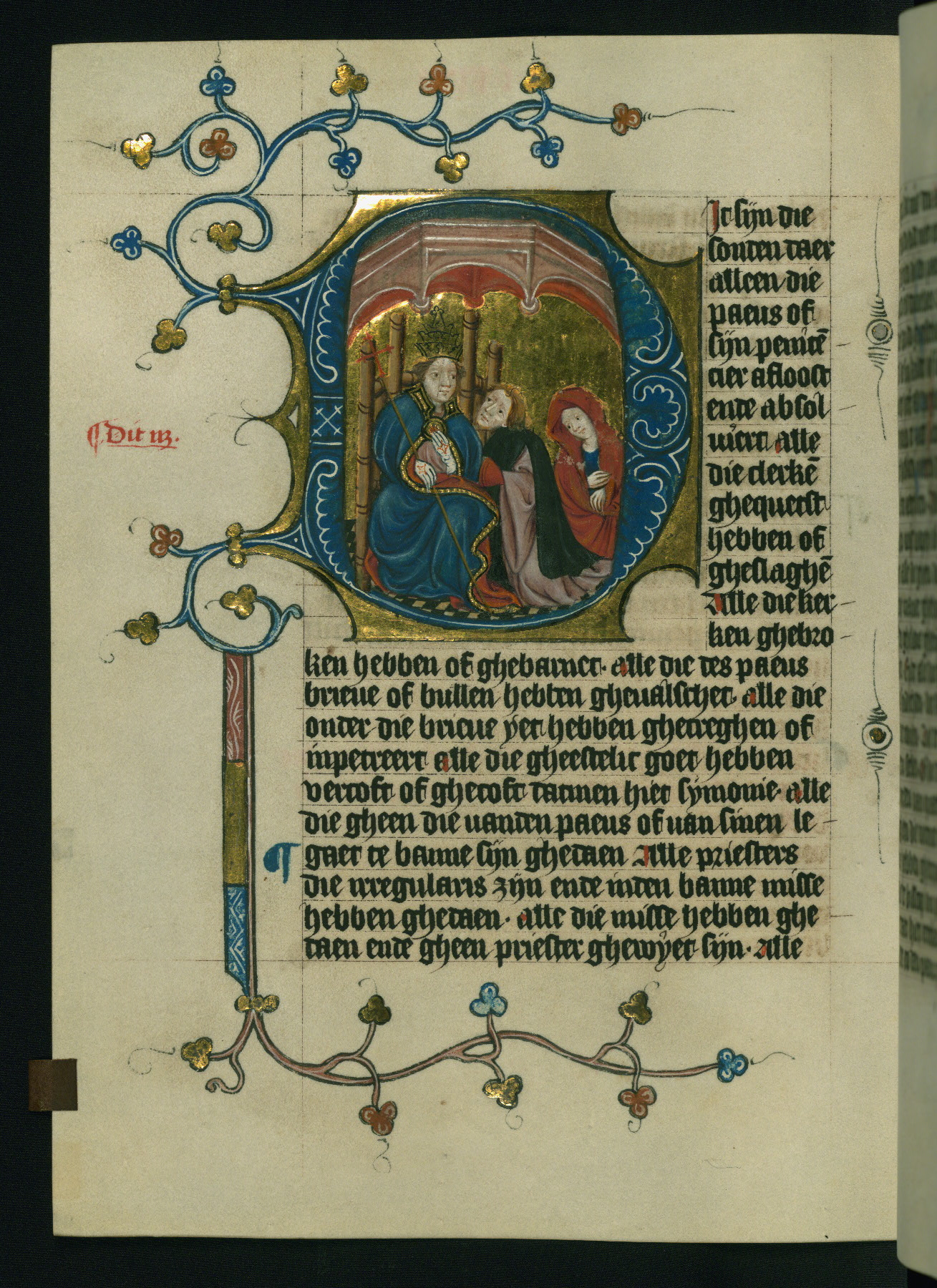 - Form: Historiated initial "D," 14 lines, with marginal illustrations