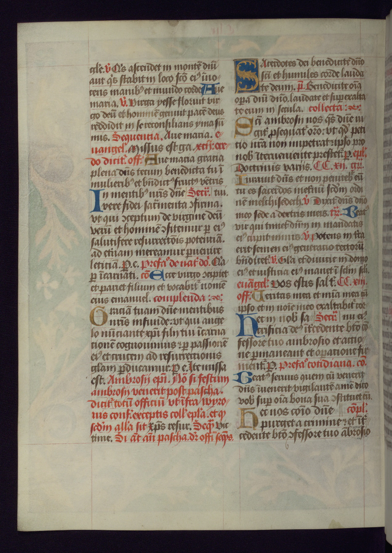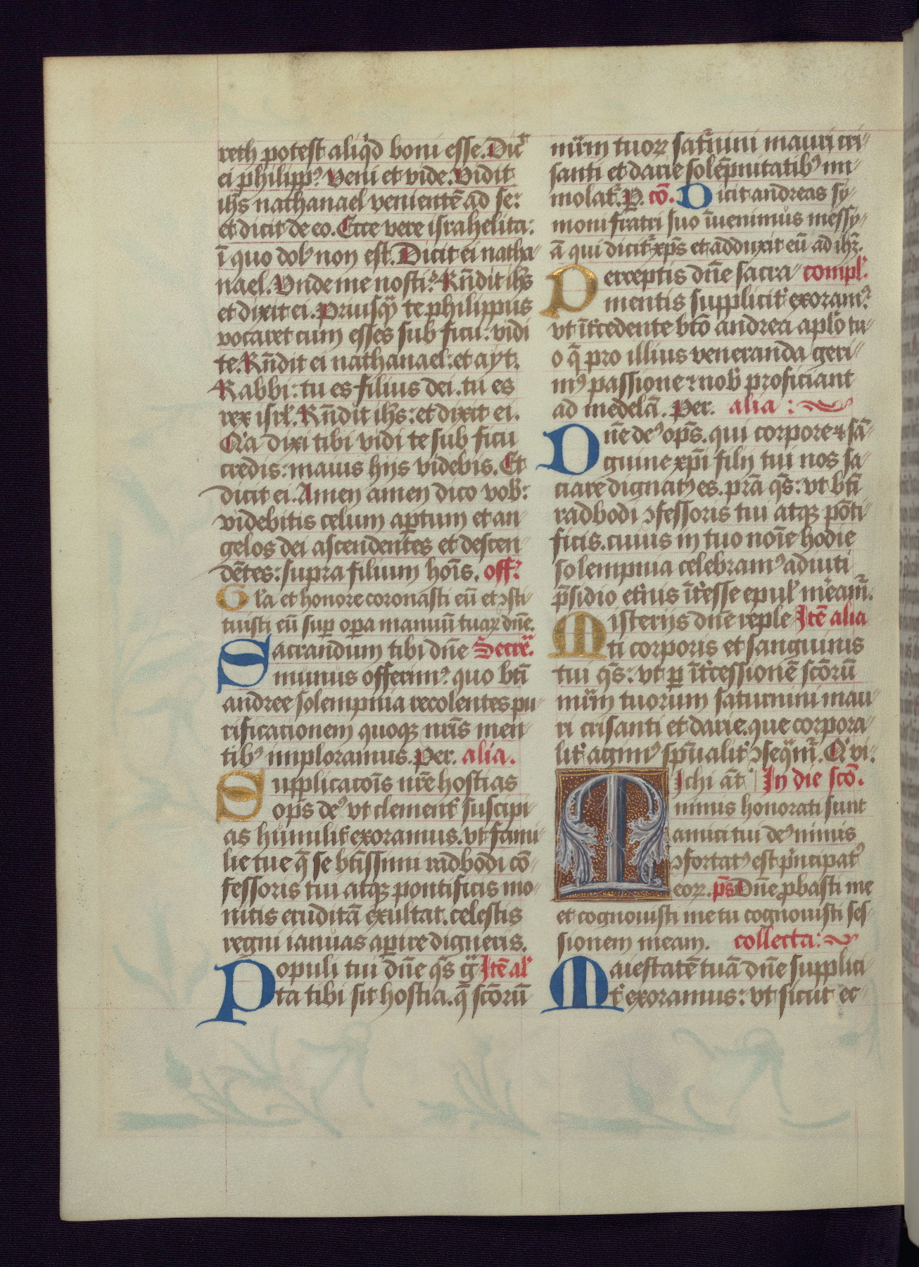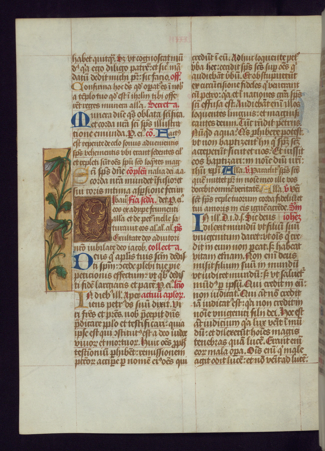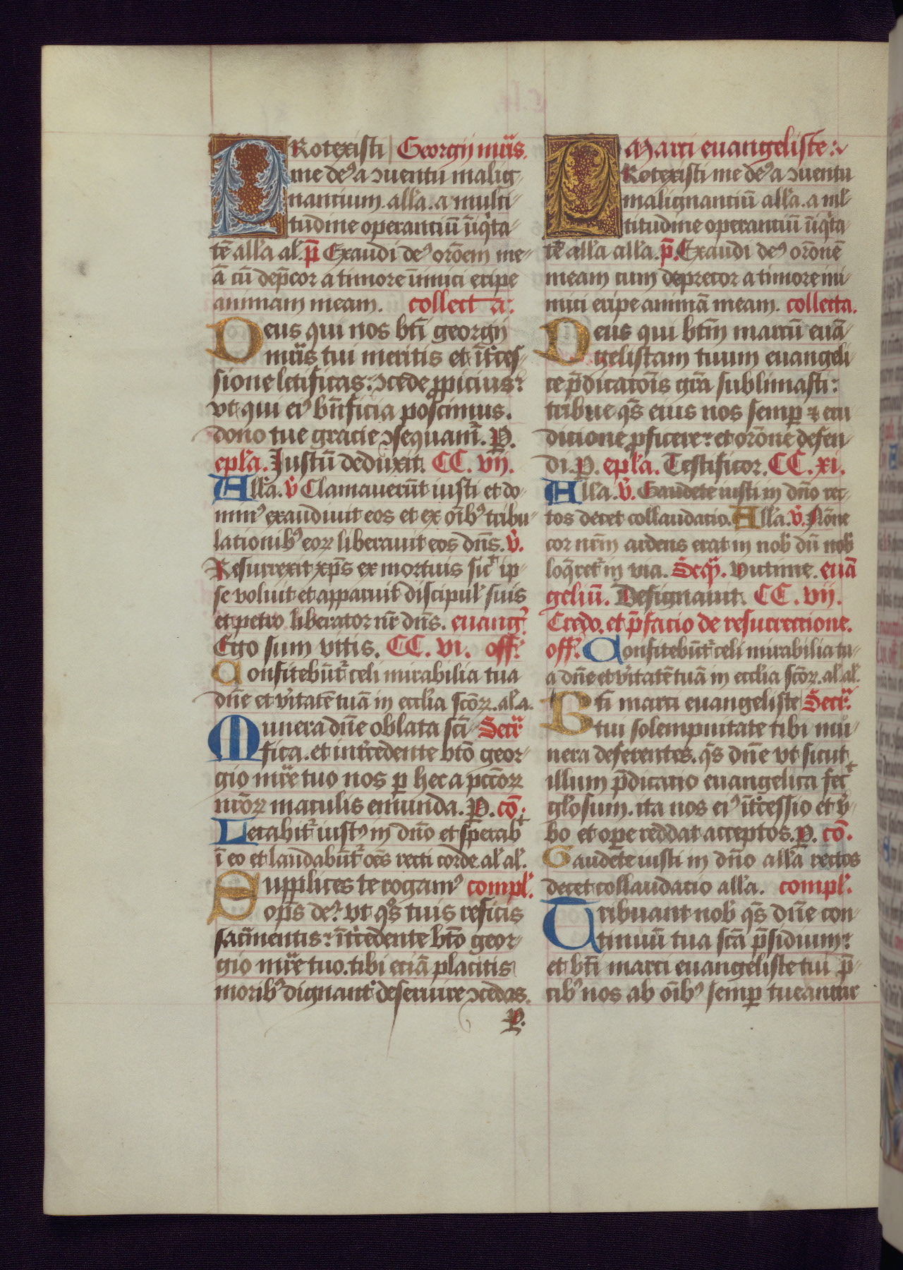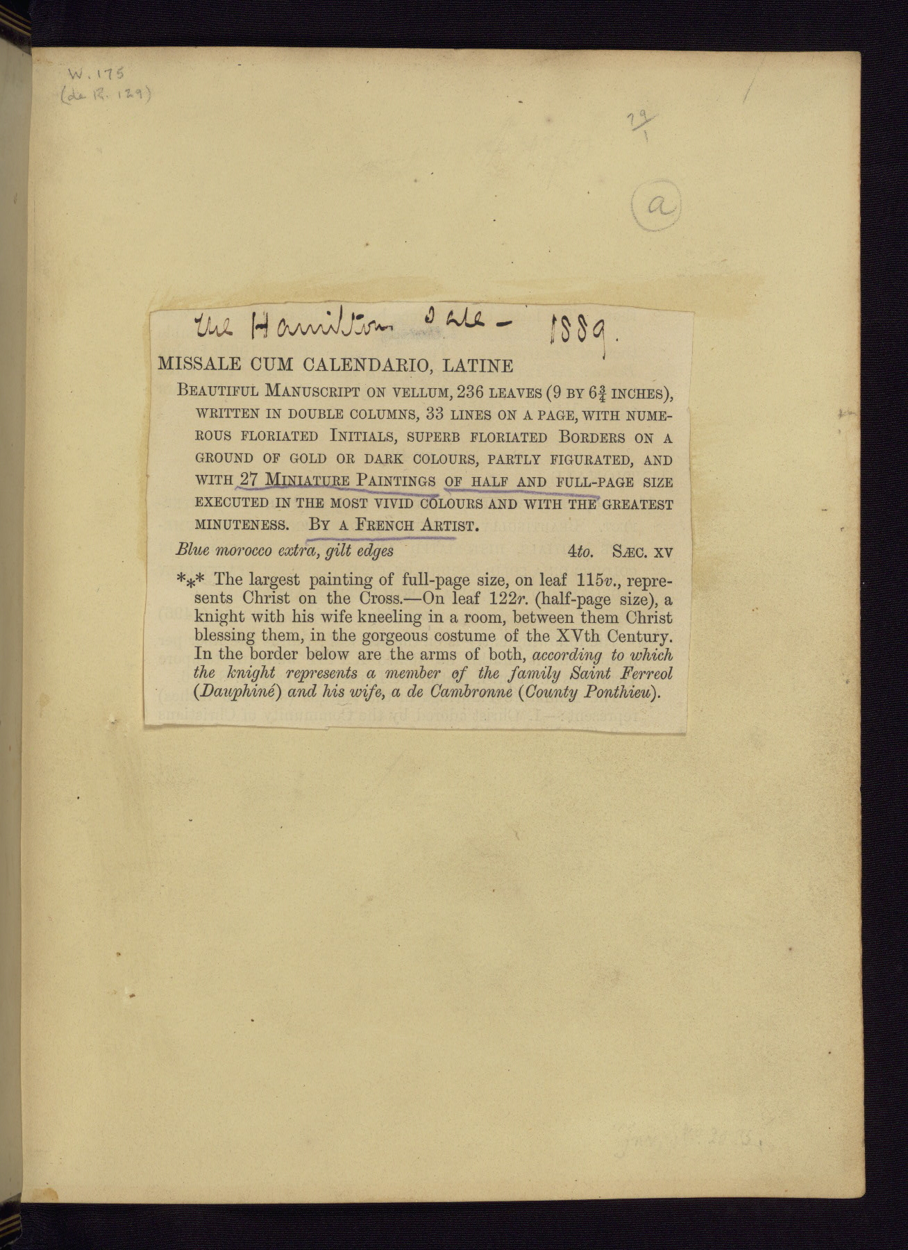 This Latin Missal was written in Utrecht, Netherlands, ca. 1500. Portraits of the original owners, whose names are not recorded, are accompanied by heraldry indicating that the husband was of the family of St. Férréol of Dauphiné; the wife was of the Cambronne of Ponthieu family. The manuscript is heavily illuminated with more than fifty historiated initials and miniatures by a group of artists known in scholarship as the "Masters of the Dark Eyes." The marginal decoration is also notable, for along with naturalistic flowers, insects, and jewels, there are several instances where the margin itself is historiated. This Missal provides an excellent example of the "Masters of the Dark Eyes" style, and there are a number of related manuscripts that have been identified by these same artists, including two at The Hague: KB, 76 G 9, and KB, 135 E 19.