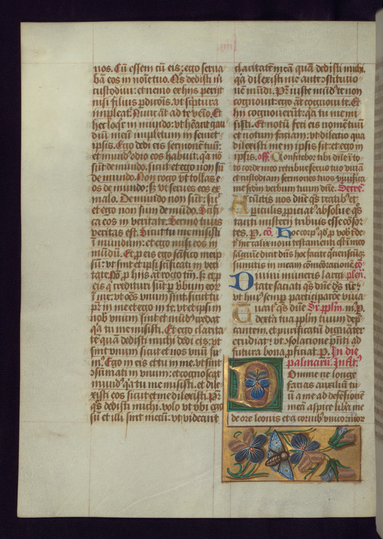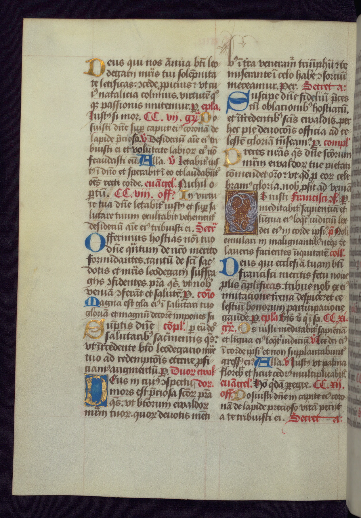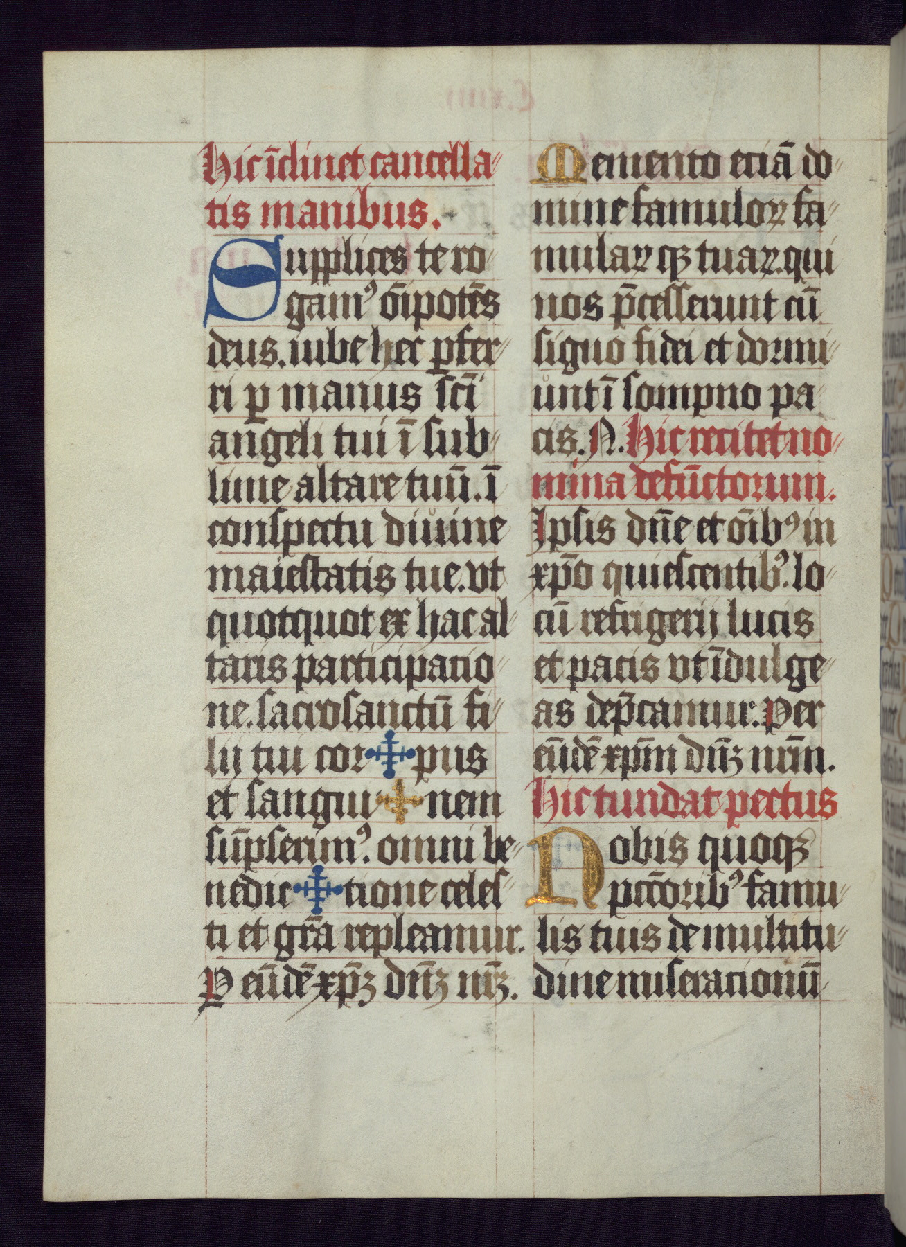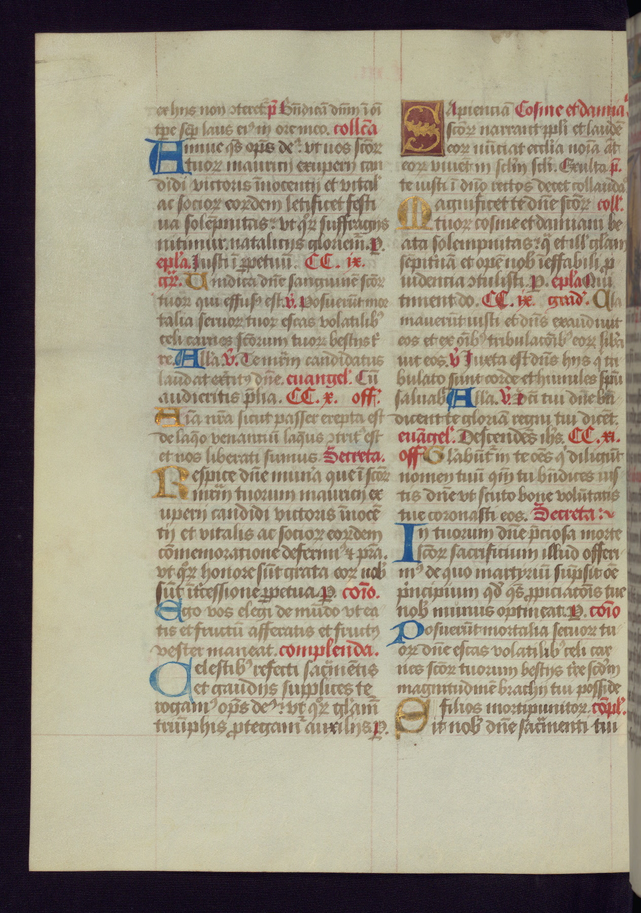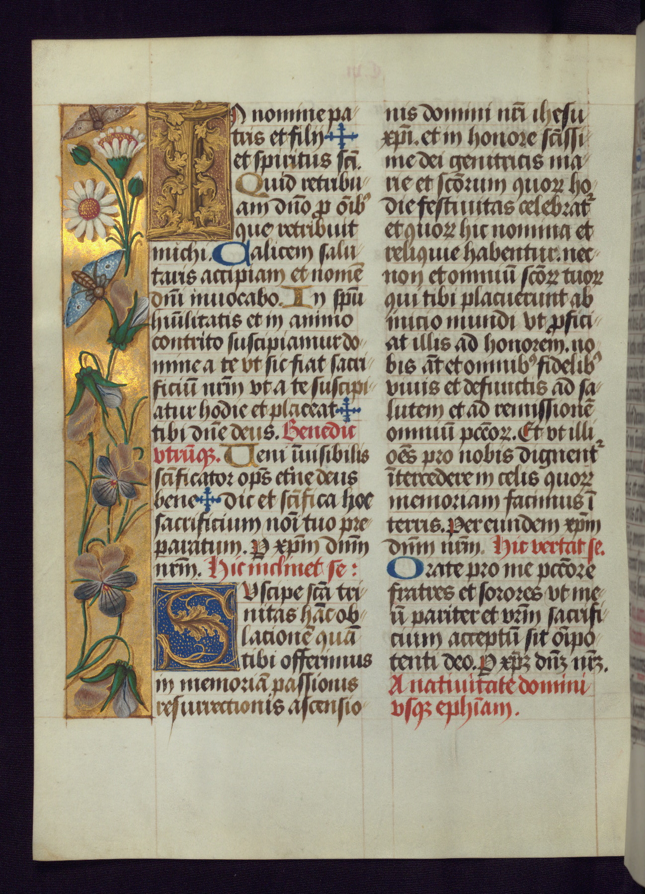 This Latin Missal was written in Utrecht, Netherlands, ca. 1500. Portraits of the original owners, whose names are not recorded, are accompanied by heraldry indicating that the husband was of the family of St. Férréol of Dauphiné; the wife was of the Cambronne of Ponthieu family. The manuscript is heavily illuminated with more than fifty historiated initials and miniatures by a group of artists known in scholarship as the "Masters of the Dark Eyes." The marginal decoration is also notable, for along with naturalistic flowers, insects, and jewels, there are several instances where the margin itself is historiated. This Missal provides an excellent example of the "Masters of the Dark Eyes" style, and there are a number of related manuscripts that have been identified by these same artists, including two at The Hague: KB, 76 G 9, and KB, 135 E 19.