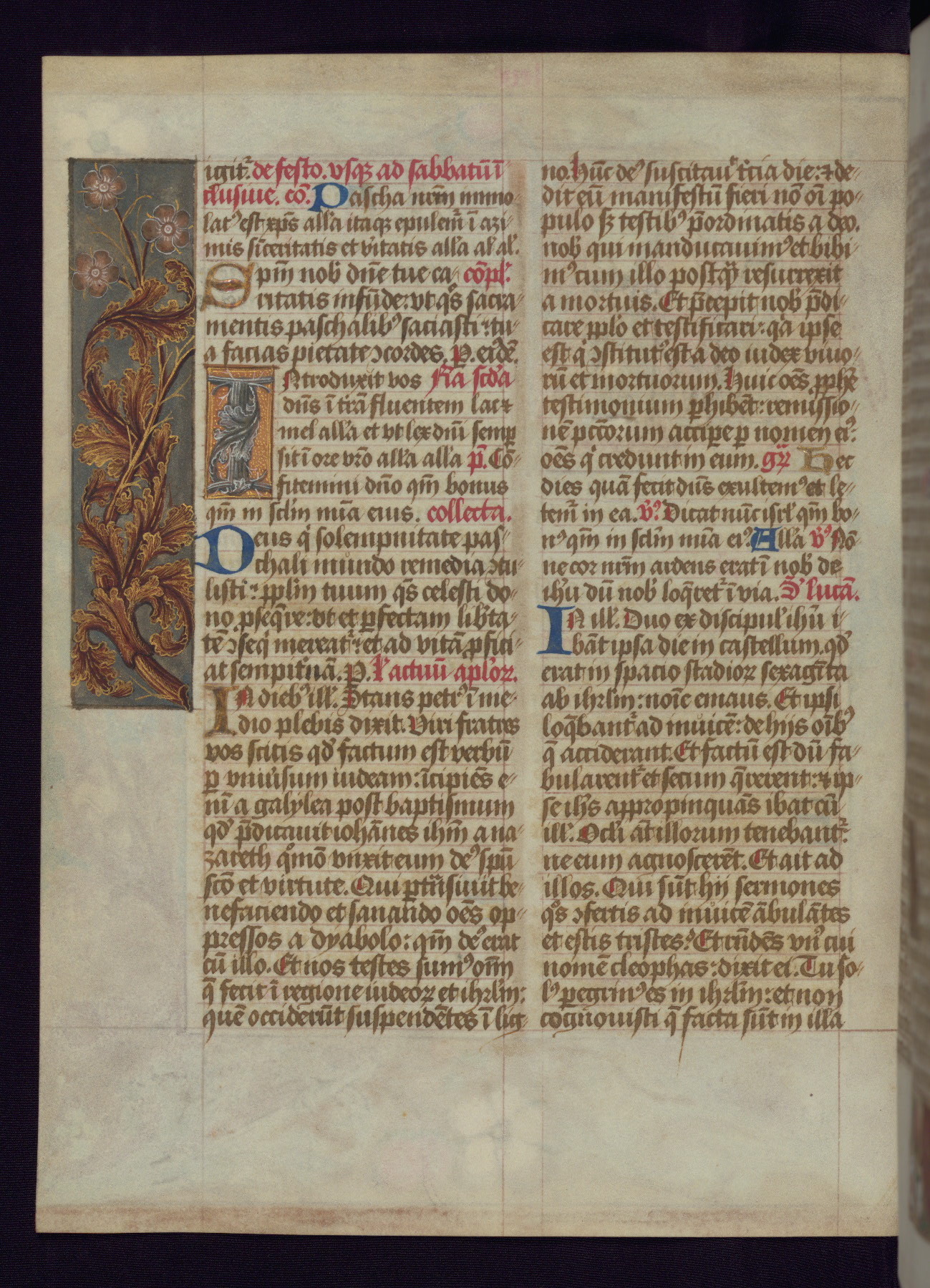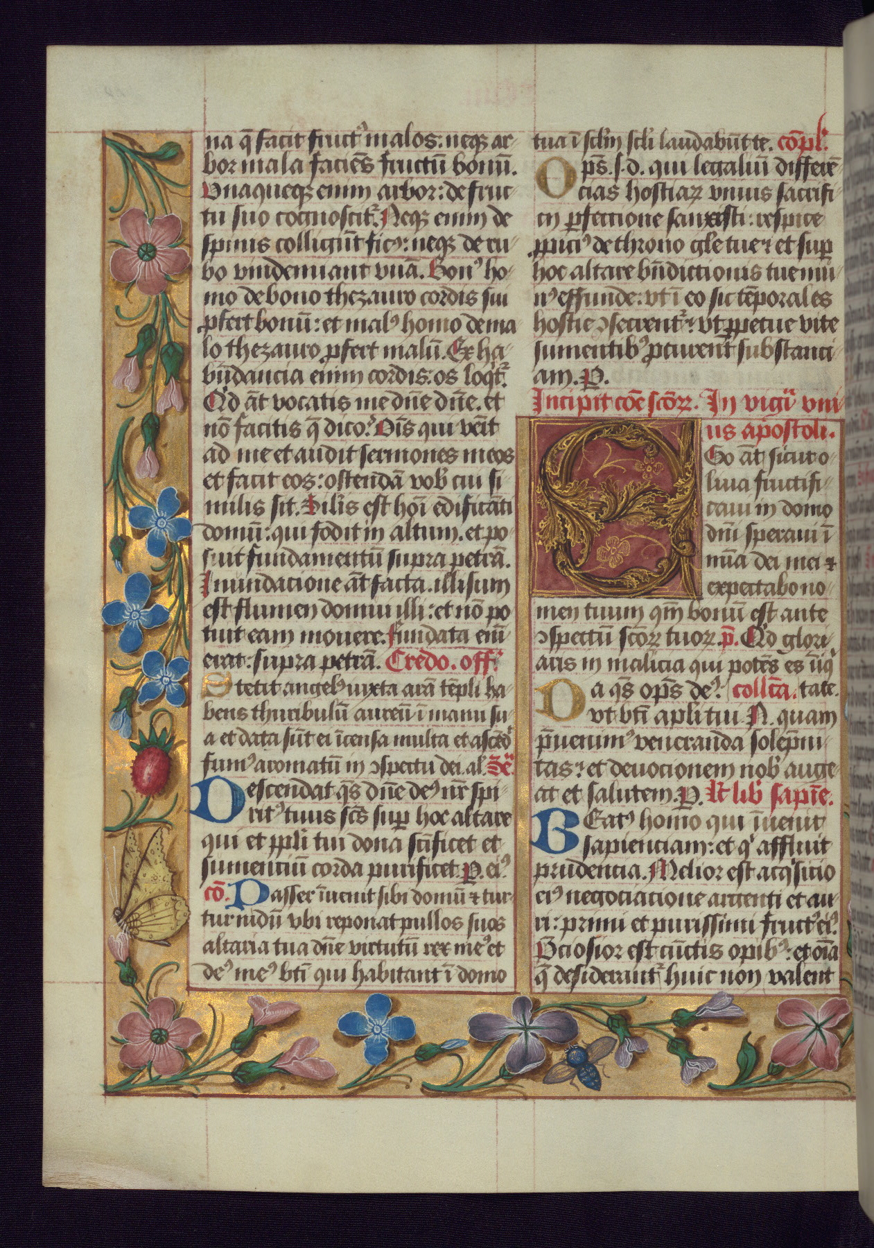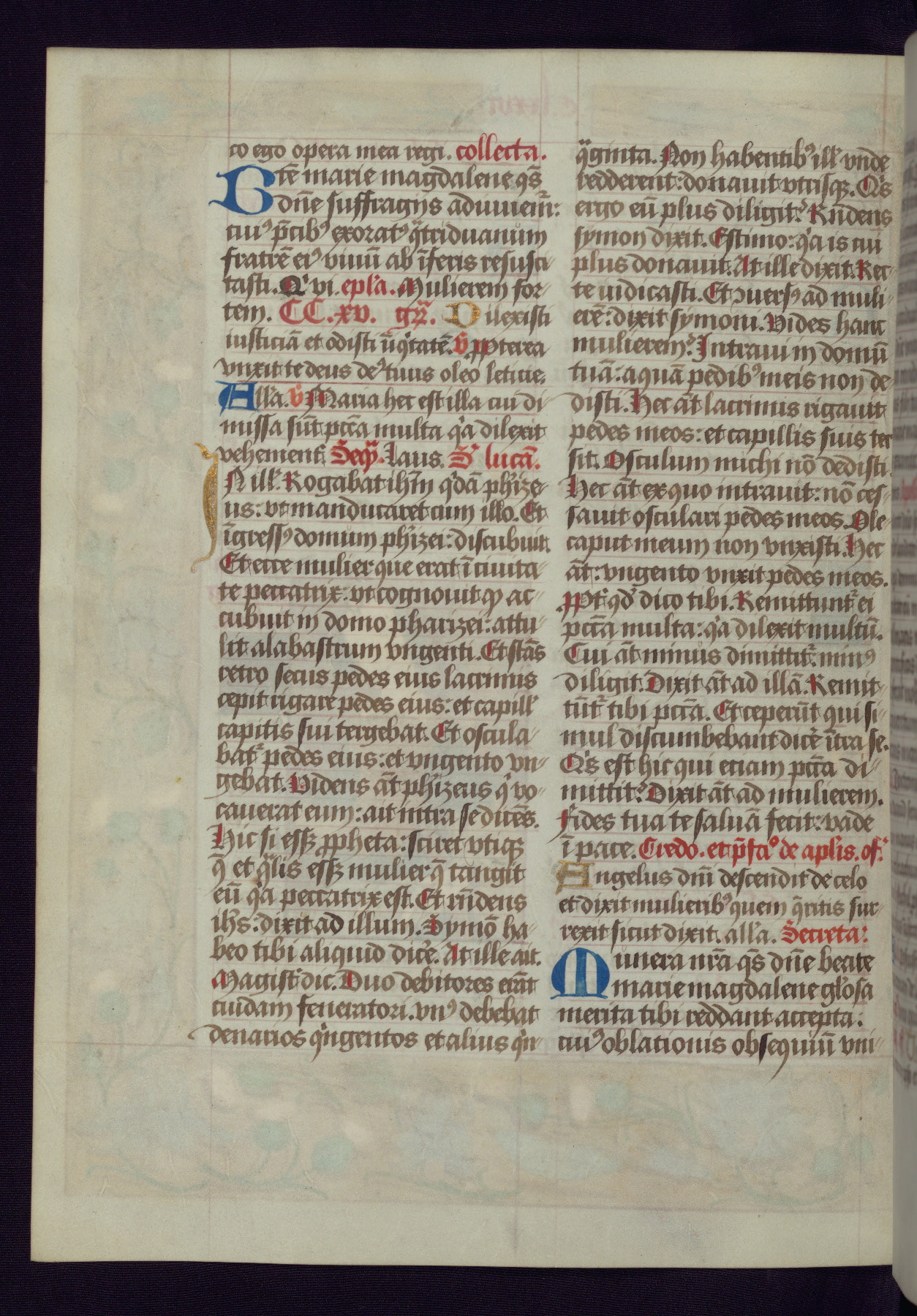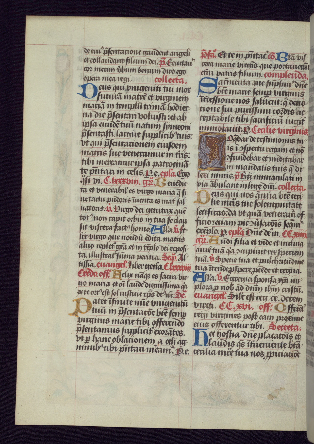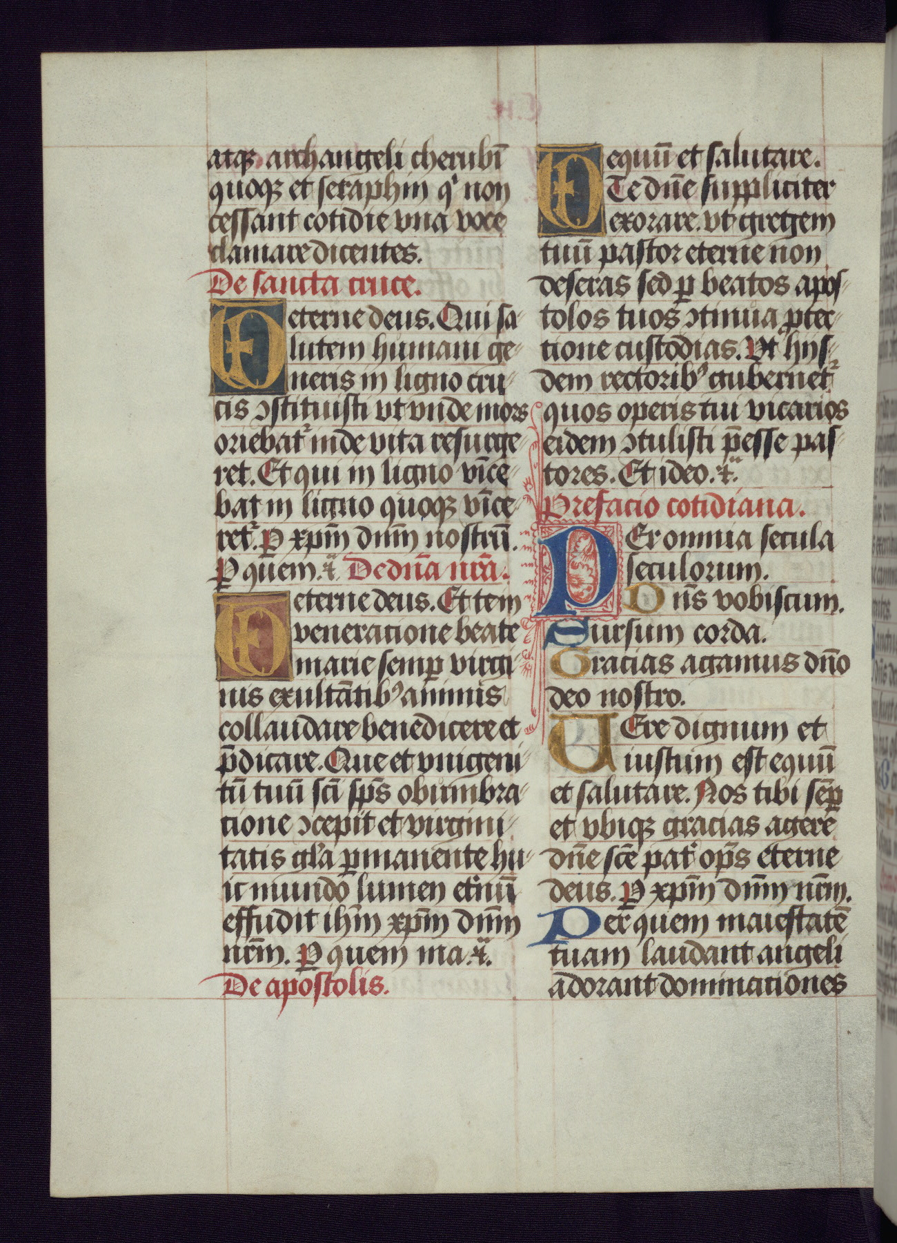 This Latin Missal was written in Utrecht, Netherlands, ca. 1500. Portraits of the original owners, whose names are not recorded, are accompanied by heraldry indicating that the husband was of the family of St. Férréol of Dauphiné; the wife was of the Cambronne of Ponthieu family. The manuscript is heavily illuminated with more than fifty historiated initials and miniatures by a group of artists known in scholarship as the "Masters of the Dark Eyes." The marginal decoration is also notable, for along with naturalistic flowers, insects, and jewels, there are several instances where the margin itself is historiated. This Missal provides an excellent example of the "Masters of the Dark Eyes" style, and there are a number of related manuscripts that have been identified by these same artists, including two at The Hague: KB, 76 G 9, and KB, 135 E 19.
