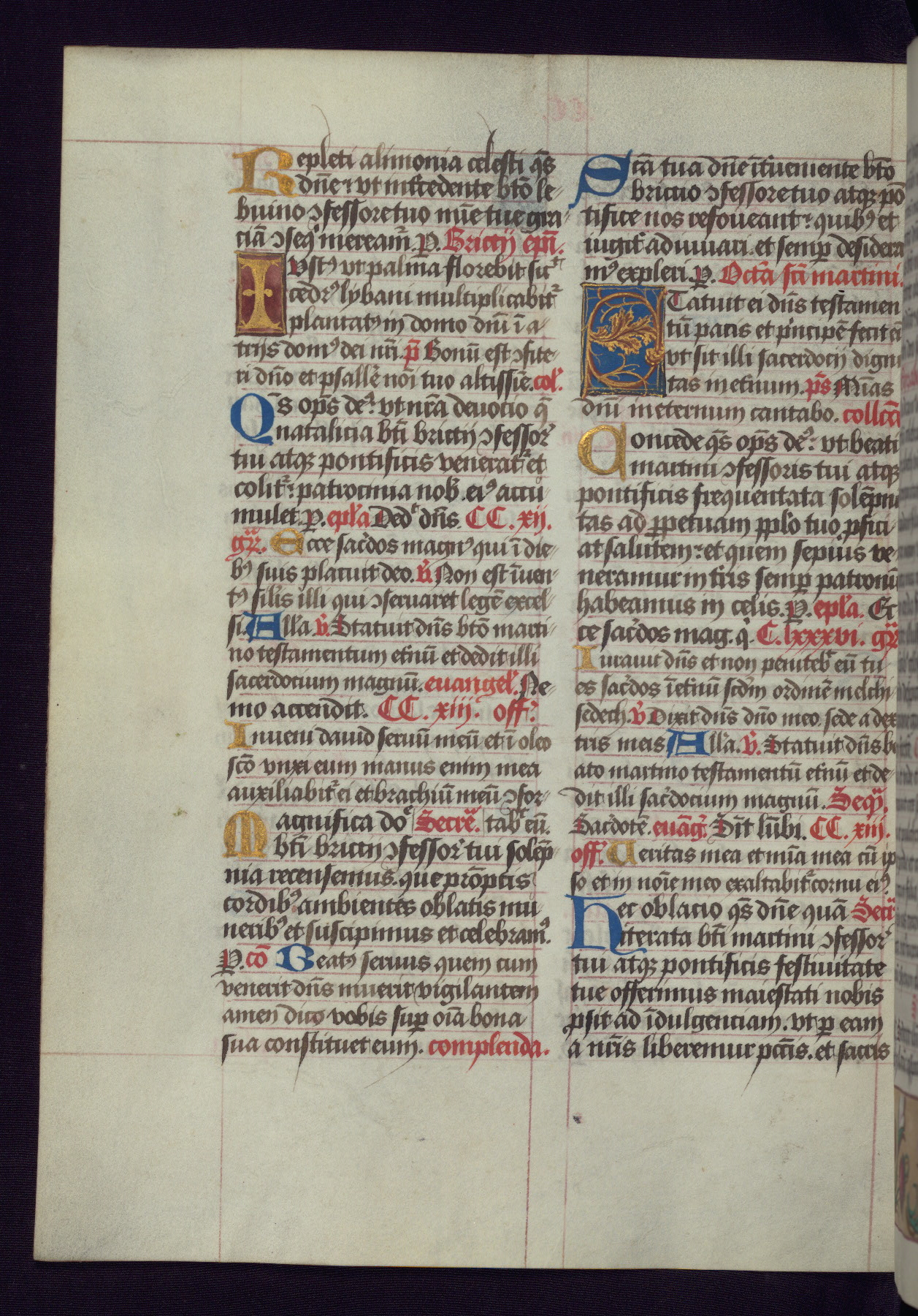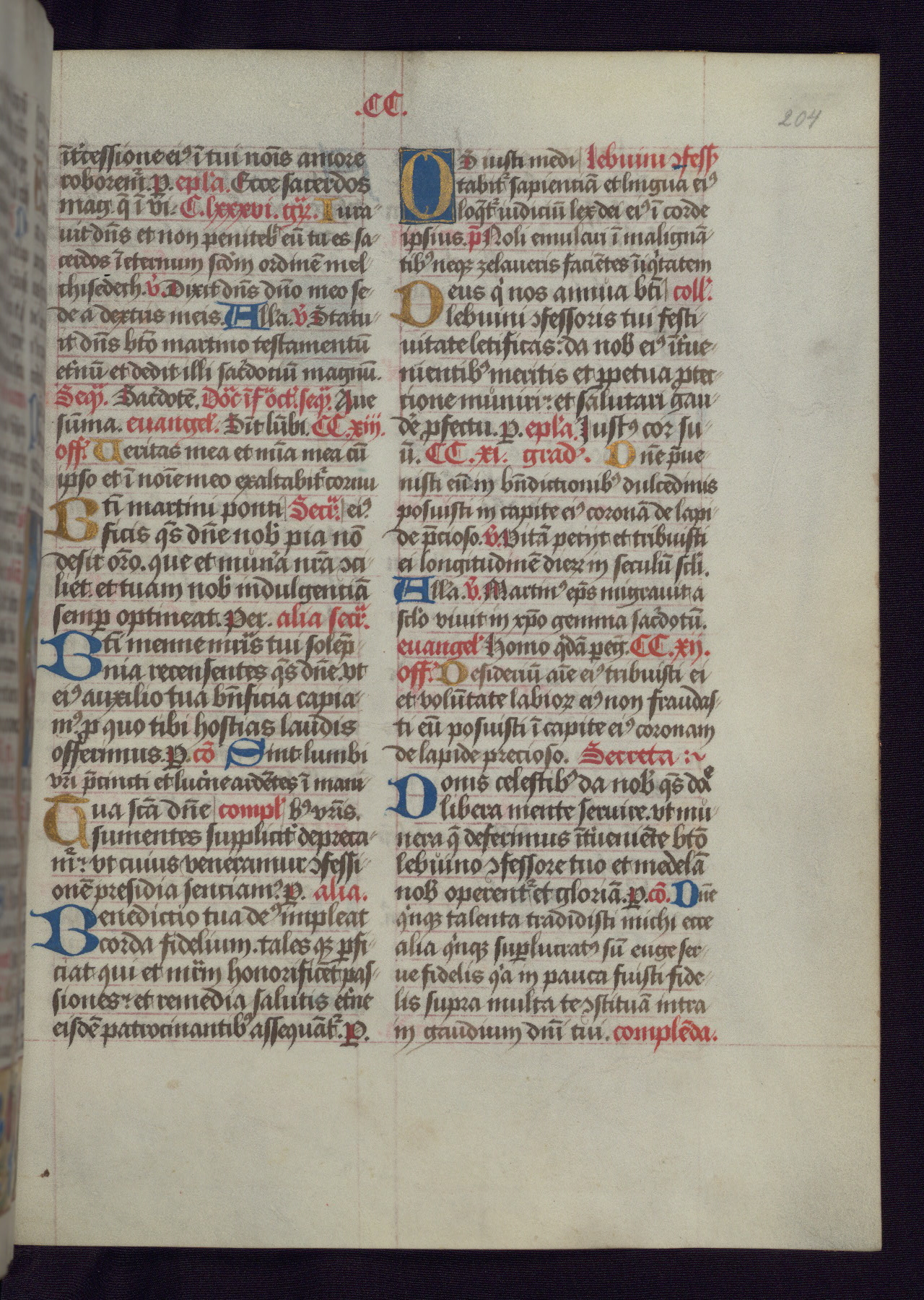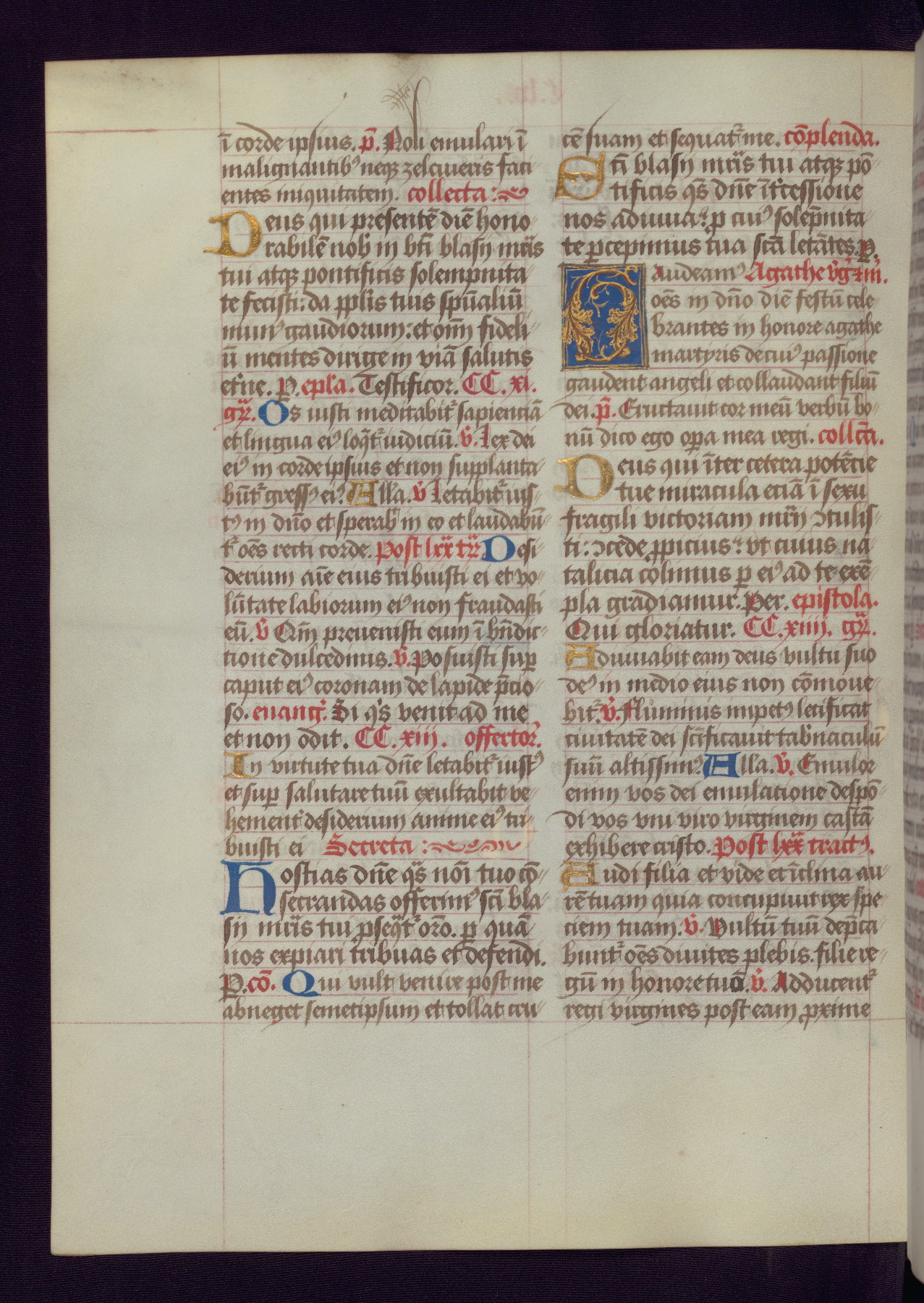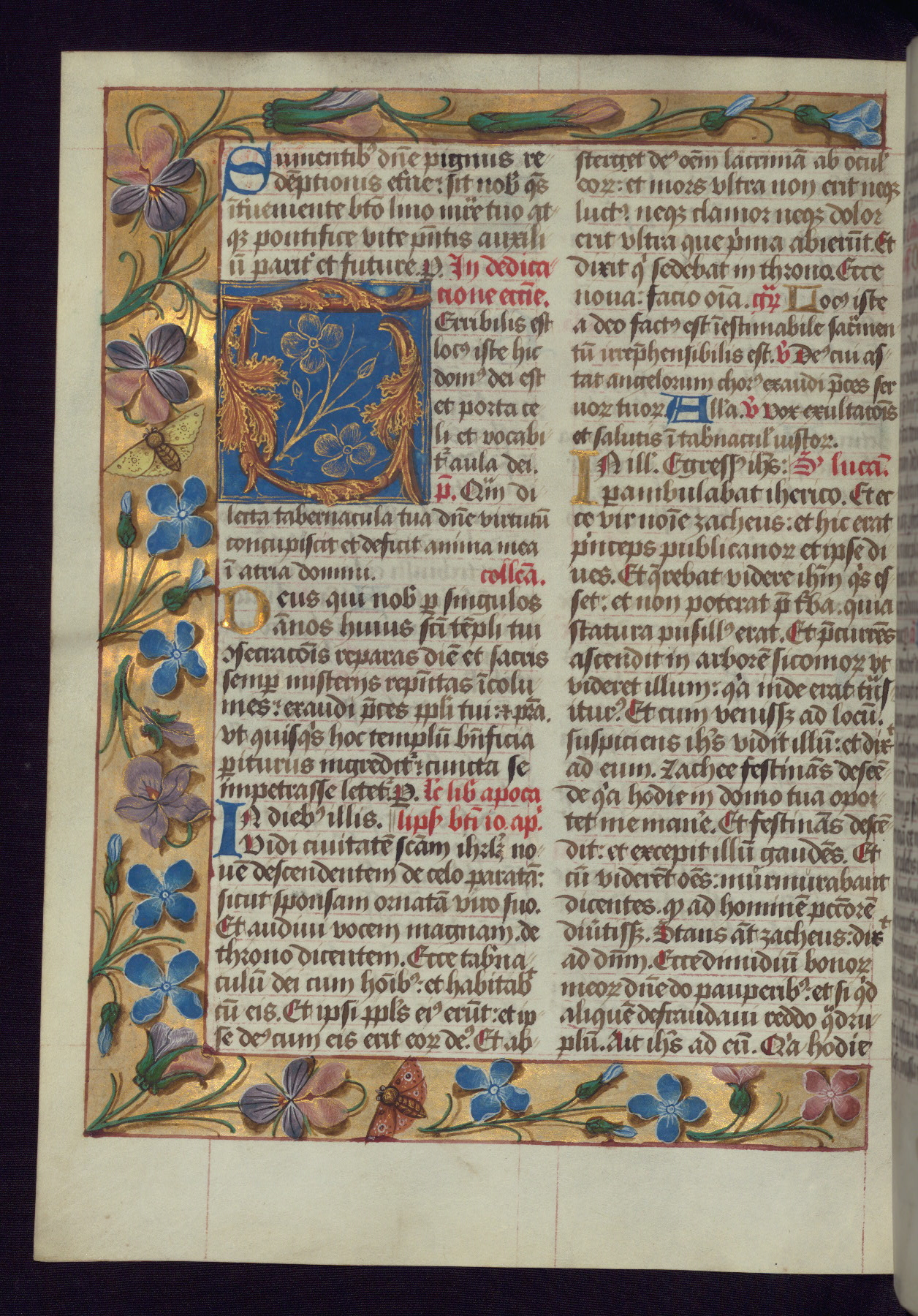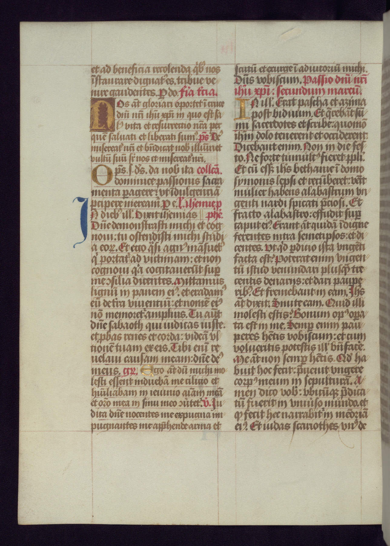 This Latin Missal was written in Utrecht, Netherlands, ca. 1500. Portraits of the original owners, whose names are not recorded, are accompanied by heraldry indicating that the husband was of the family of St. Férréol of Dauphiné; the wife was of the Cambronne of Ponthieu family. The manuscript is heavily illuminated with more than fifty historiated initials and miniatures by a group of artists known in scholarship as the "Masters of the Dark Eyes." The marginal decoration is also notable, for along with naturalistic flowers, insects, and jewels, there are several instances where the margin itself is historiated. This Missal provides an excellent example of the "Masters of the Dark Eyes" style, and there are a number of related manuscripts that have been identified by these same artists, including two at The Hague: KB, 76 G 9, and KB, 135 E 19.
