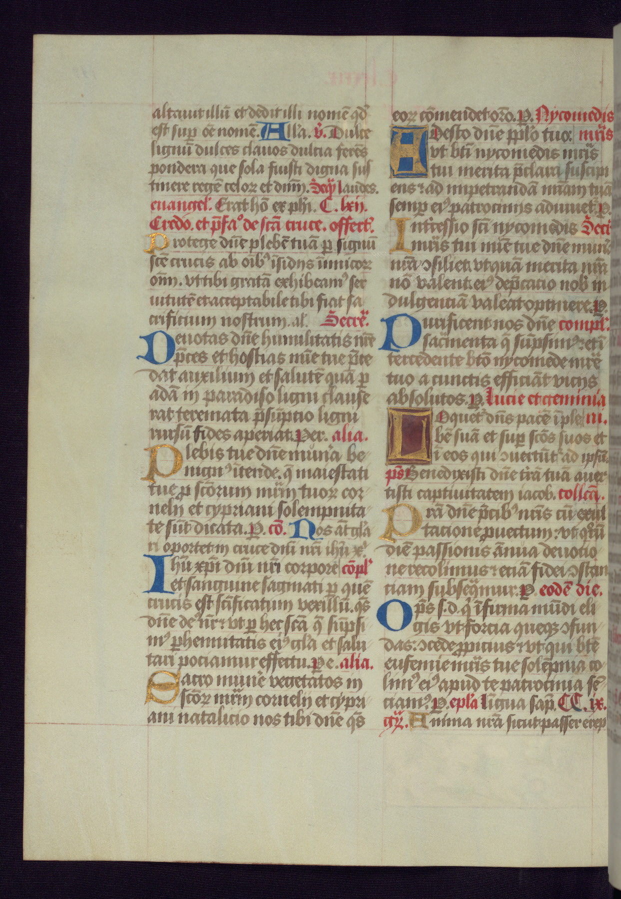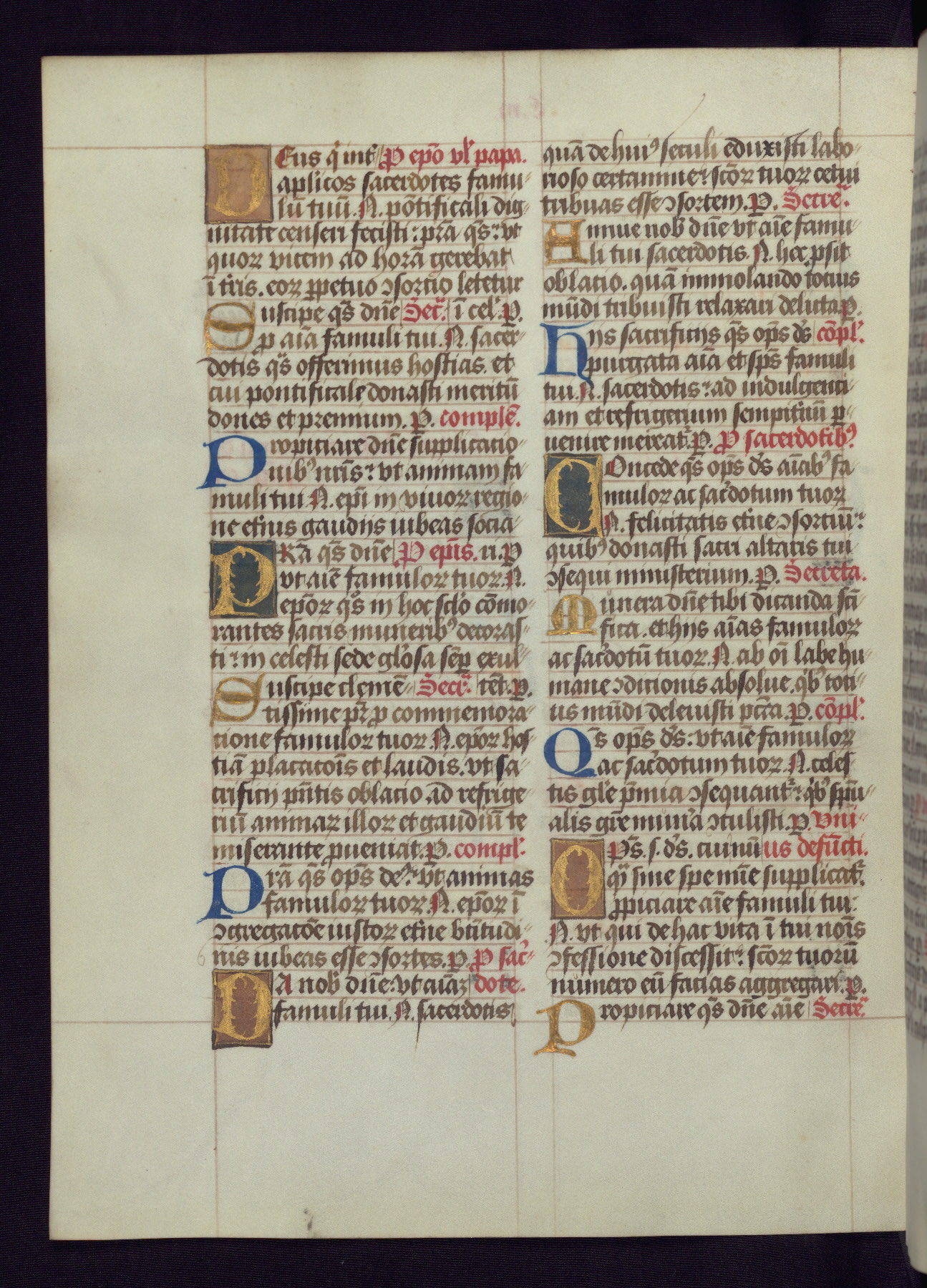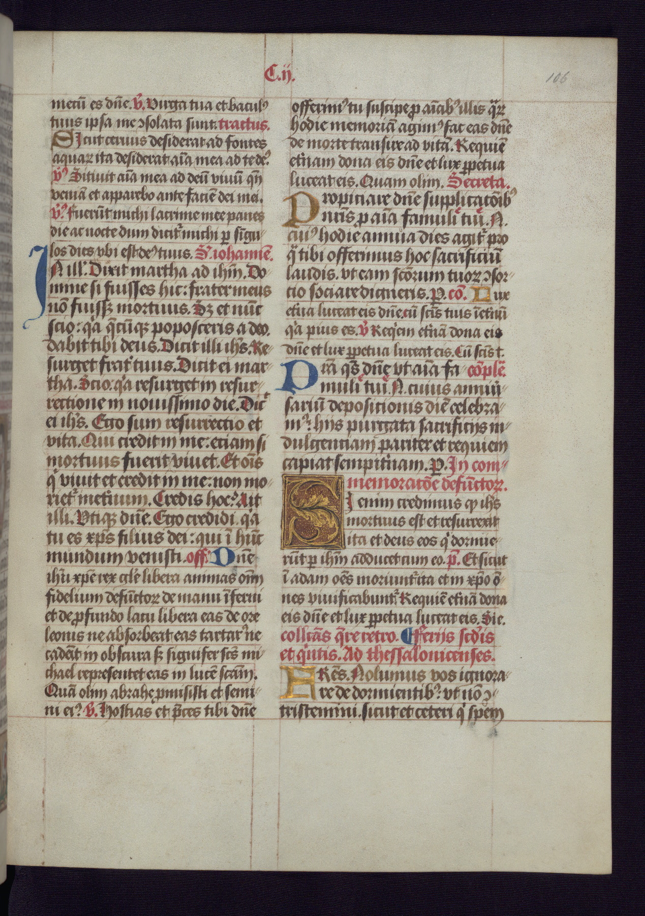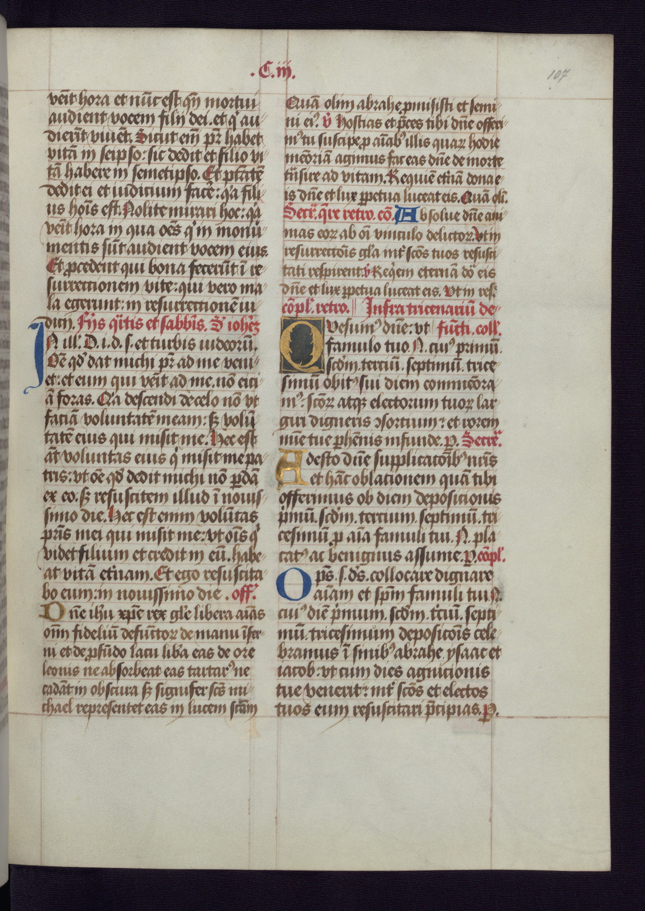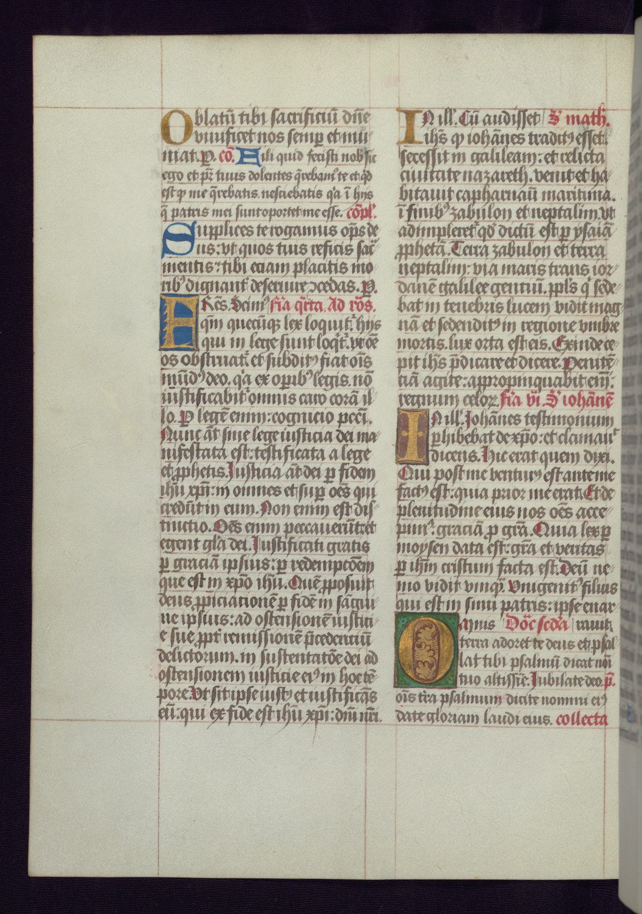 This Latin Missal was written in Utrecht, Netherlands, ca. 1500. Portraits of the original owners, whose names are not recorded, are accompanied by heraldry indicating that the husband was of the family of St. Férréol of Dauphiné; the wife was of the Cambronne of Ponthieu family. The manuscript is heavily illuminated with more than fifty historiated initials and miniatures by a group of artists known in scholarship as the "Masters of the Dark Eyes." The marginal decoration is also notable, for along with naturalistic flowers, insects, and jewels, there are several instances where the margin itself is historiated. This Missal provides an excellent example of the "Masters of the Dark Eyes" style, and there are a number of related manuscripts that have been identified by these same artists, including two at The Hague: KB, 76 G 9, and KB, 135 E 19.